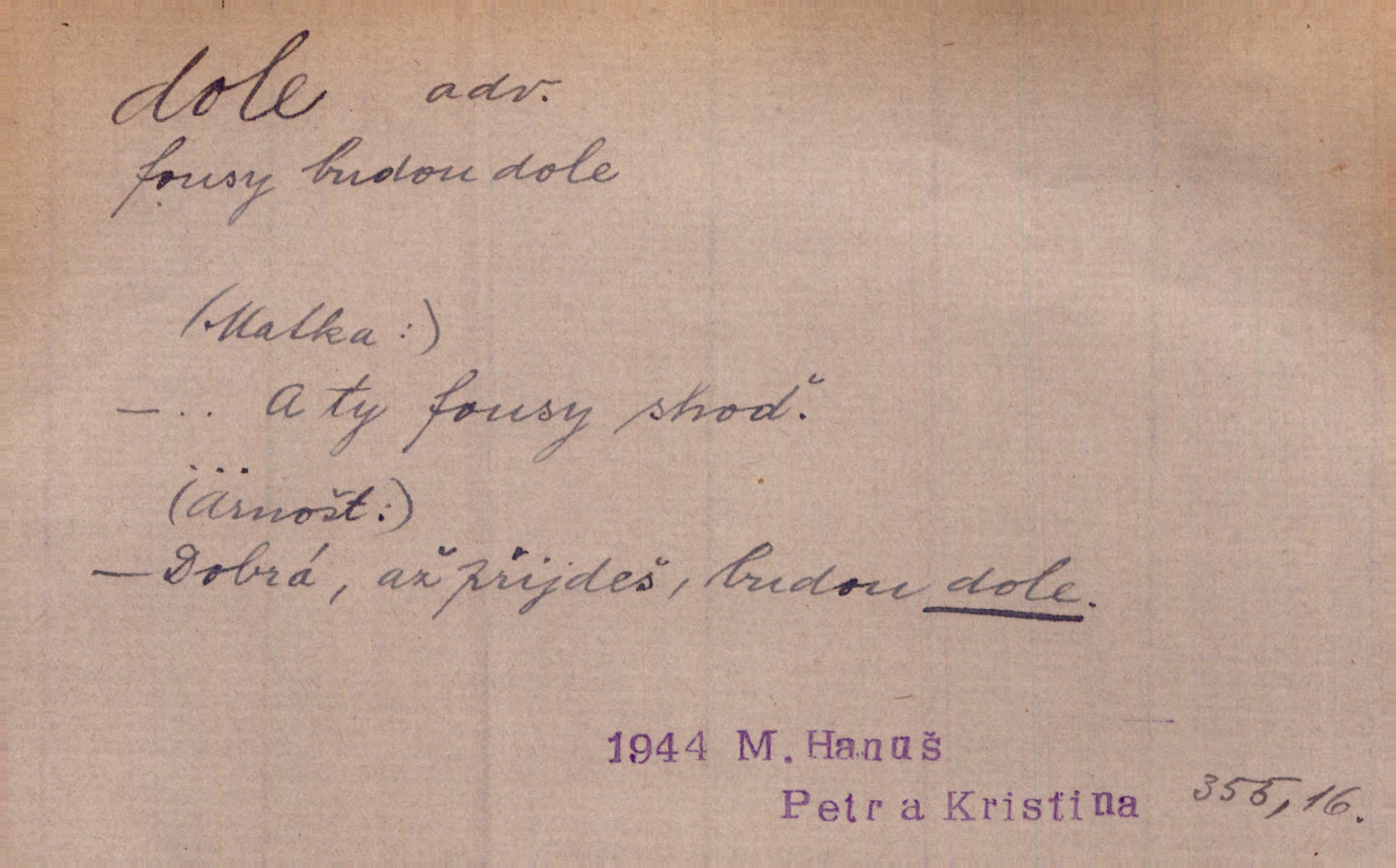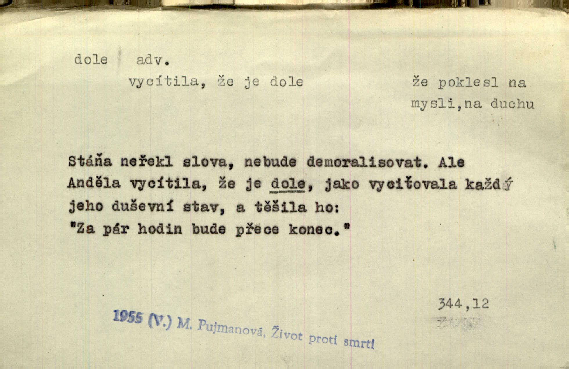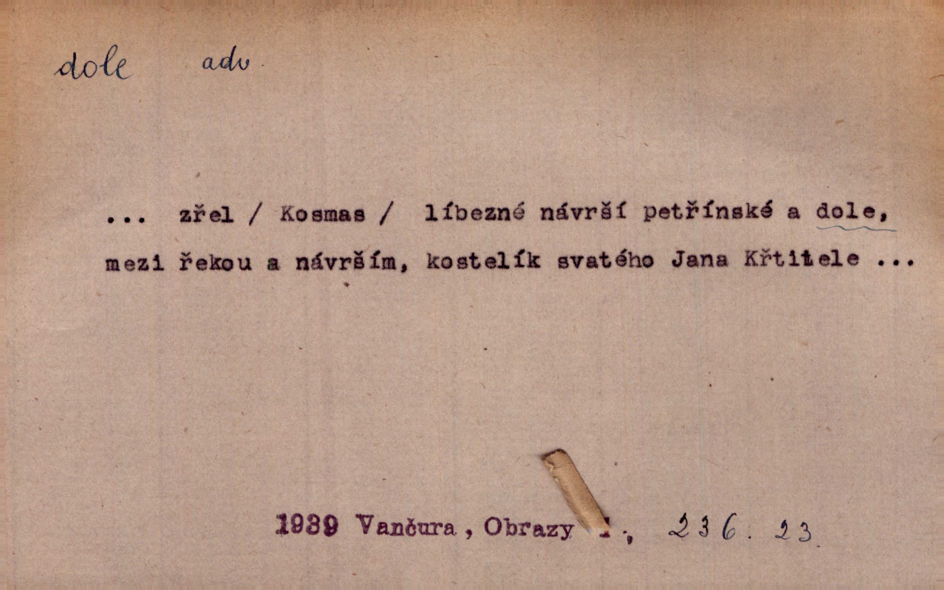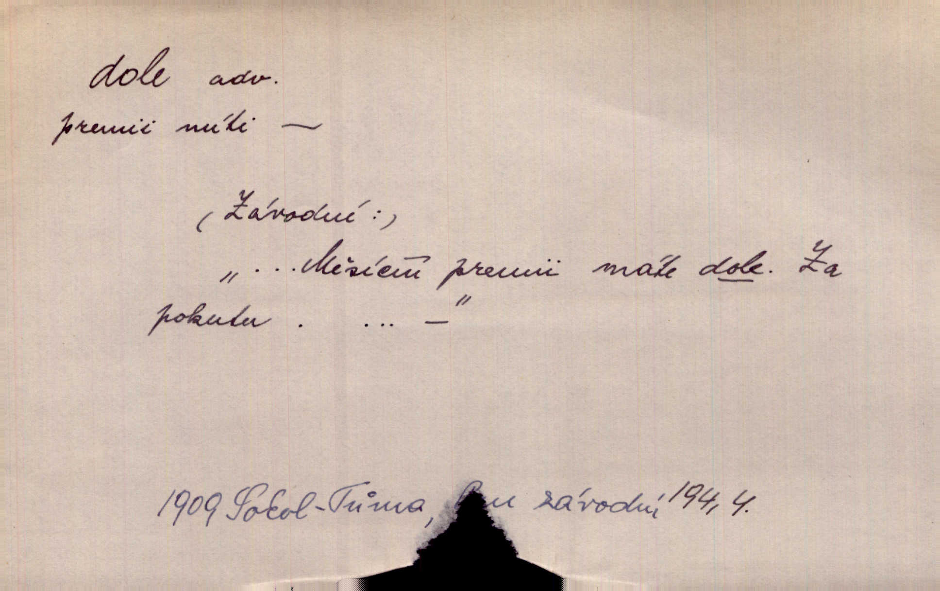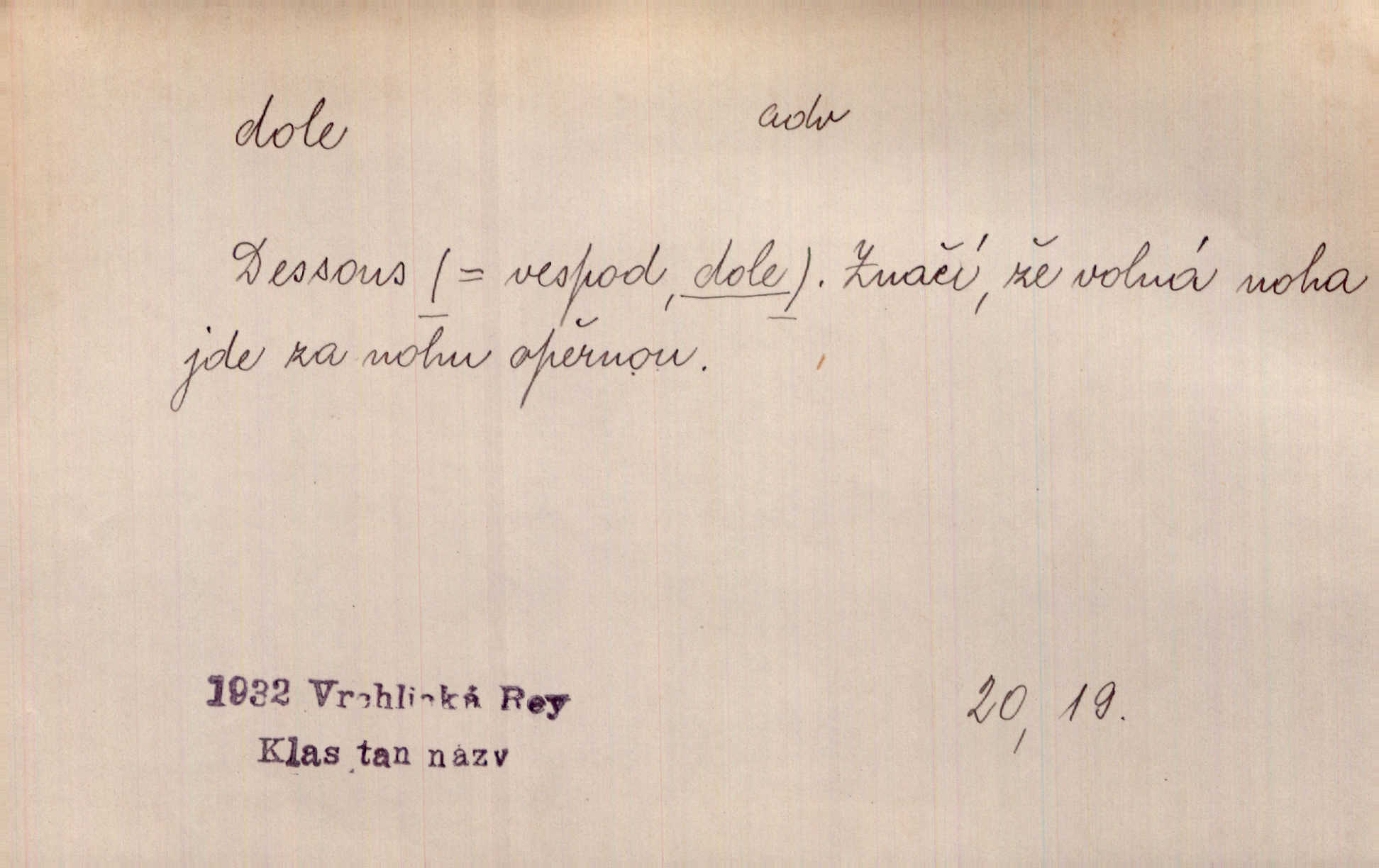 - dole adv. (komp. doleji) na nízkém (nižším) místě, nízko (op. nahoře, navrchu). Těžká sukovitá hůl, dole železem kovaná. Jan. Dole v truhle leželo babiččino prádlo a šatstvo vespod, naspodu. Něm. Dole je krám pod námi. Bydlíte dole v přízemí, v nižším patře. Toužil po smrti a žádal si klidu tam dole ve věčném šeru v hrobě. Zey. Vám, myslivci, tu dole je hej v údolí, v rovině (op. v horách). Něm. Vážnější dvořané soudili o záletnosti biskupově vytýkajíce, jak že má pak dole jasno býti, když s temene nesvítí světlo dobrých příkladů v nižších vrstvách kněžských i laických. Jir. Dole u stolu na „dolním“ konci, na místě nejméně význačném. D býti dole s vedl. význ. býti pryč a p. [Listy akátové] s prvním větrem jsou dole! Mach. Já mám boty do roboty přes brázdy a pole — zvednu jednu, zvednu druhou, a jsou s nohou dole. F. S. Proch. Pozdě z jara, když už všechen sníh byl dole. Rais. Dům starý bourají; už místy je střecha dole. Vrch. D býti dole býti zničen. Chvast nám jazyk skálel, podvod oře pole, a krb Bída strhla. Všecko, vše je dole. Heyd. Je tak dole, že mu už níž nelze, než s mostu do řeky. Čap. Ch. D Lid. Už jsou dole s kazatelny mají po ohláškách. Slang. To je „dole“, aby někdo dostával peníze za to, že nic nedělá to je proti tradici, to není spravedlivé. Přít. D v jižní krajině, na jihu. Zanotoval píseň, jak ji slýchal tam dole ve Veroně. Jir. Jedu za obchodem; mám něco dole, na jihu, nějaký průmysl. K. Čap. D Lit. pod čarou. O tom viz dole. Ostatek následuje doleji dále.