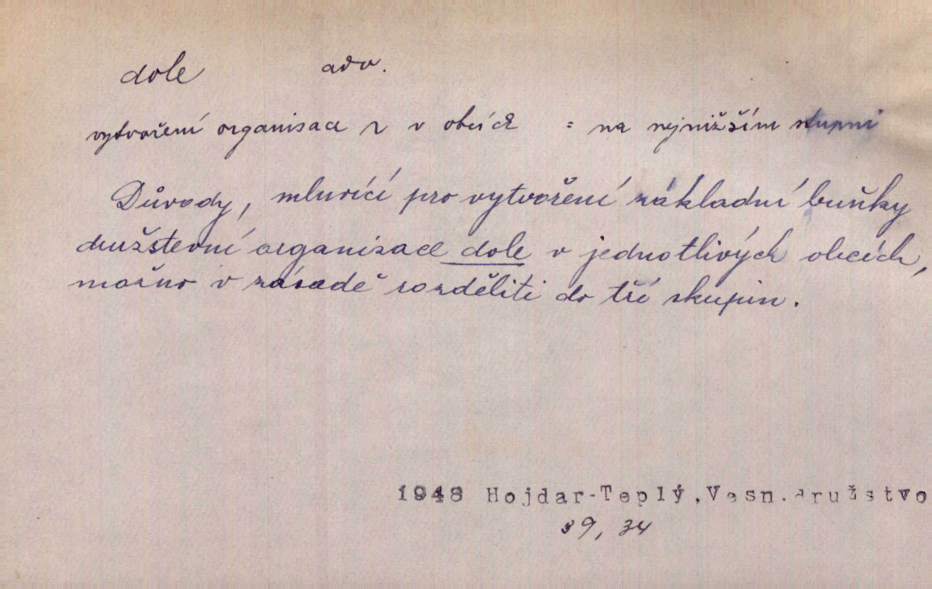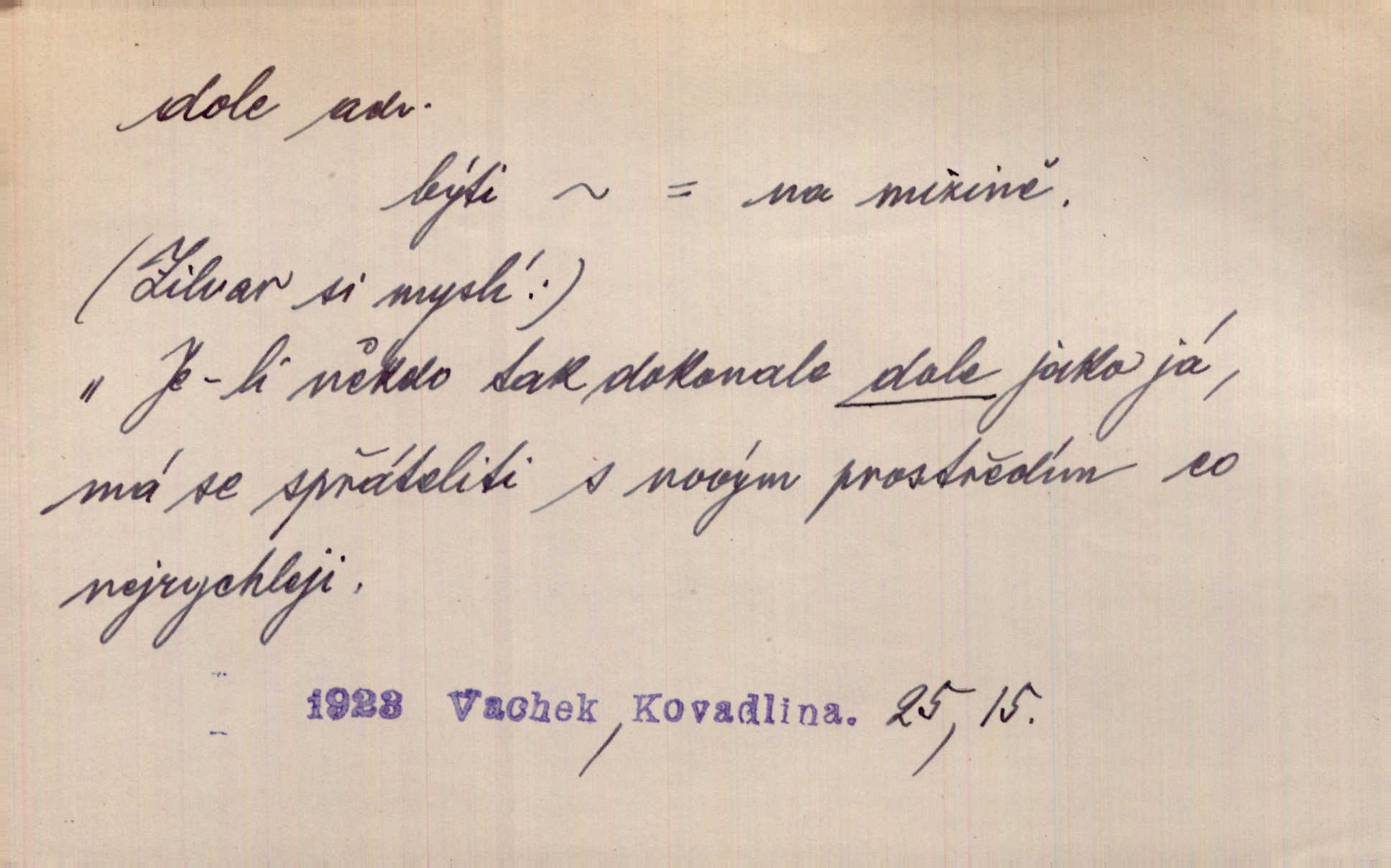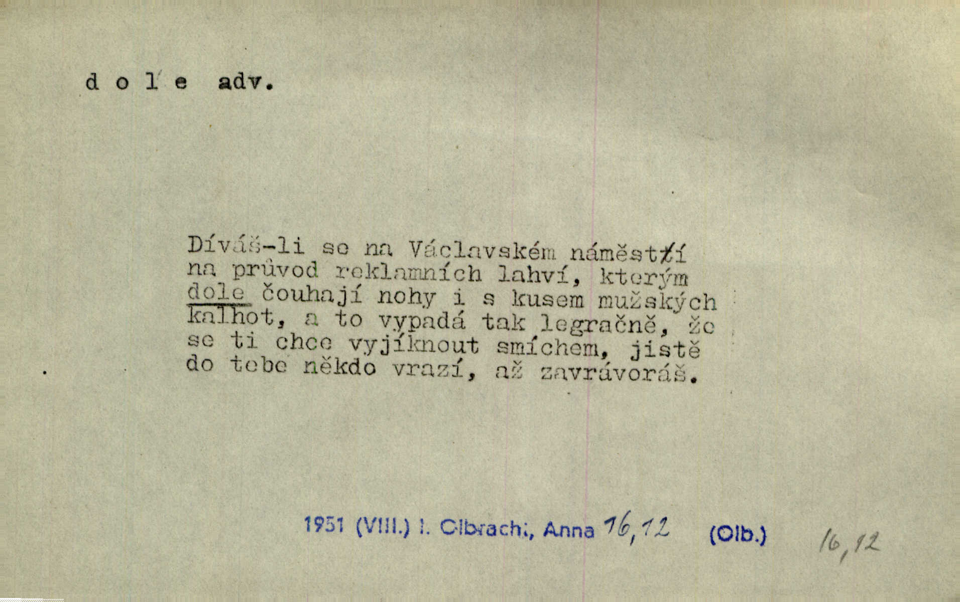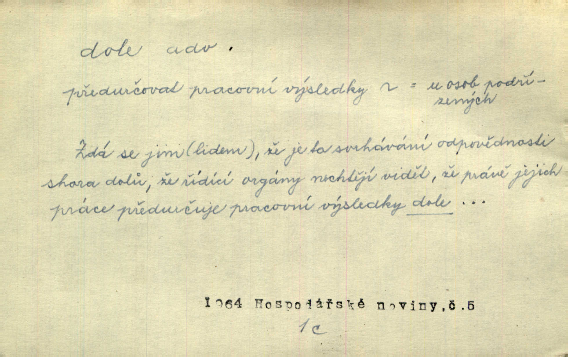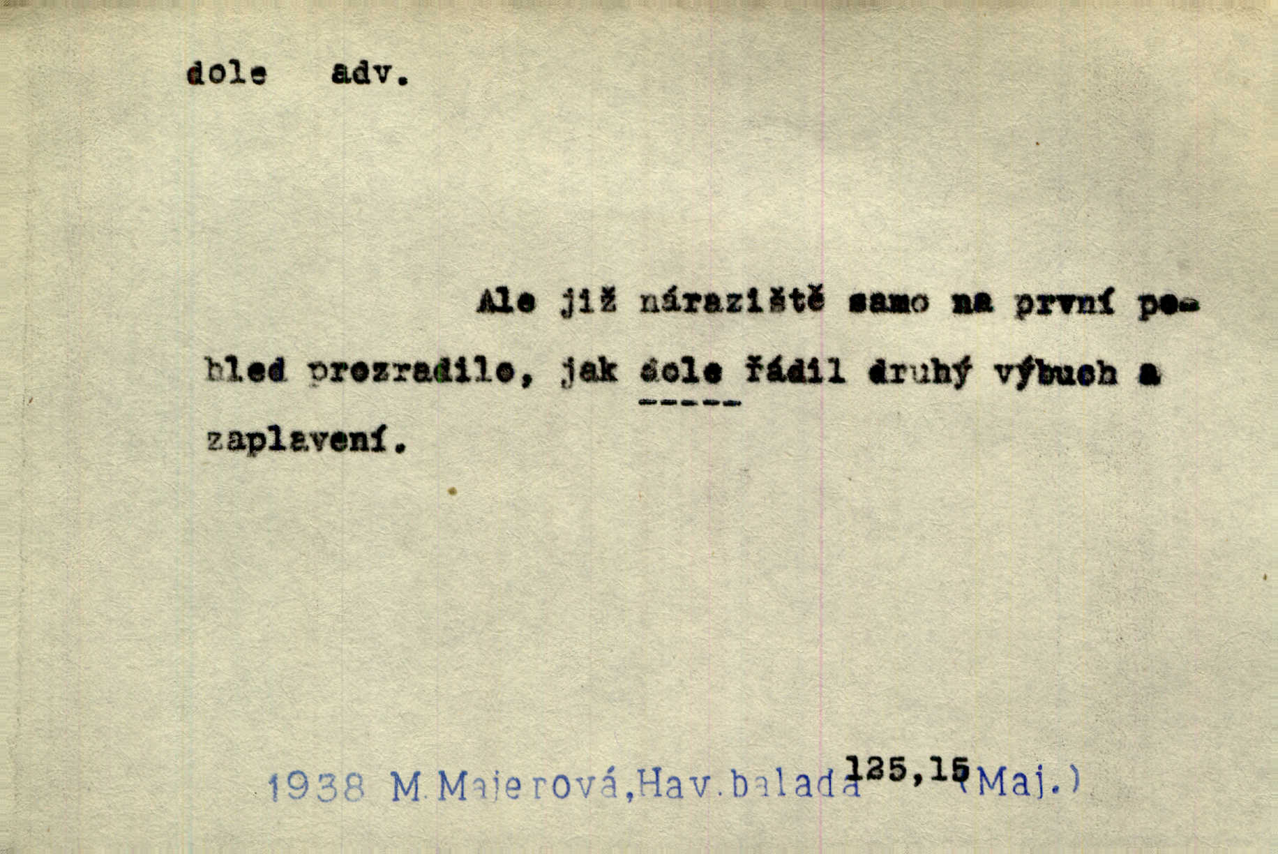 - dole adv. (komp. doleji) na nízkém (nižším) místě, nízko (op. nahoře, navrchu). Těžká sukovitá hůl, dole železem kovaná. Jan. Dole v truhle leželo babiččino prádlo a šatstvo vespod, naspodu. Něm. Dole je krám pod námi. Bydlíte dole v přízemí, v nižším patře. Toužil po smrti a žádal si klidu tam dole ve věčném šeru v hrobě. Zey. Vám, myslivci, tu dole je hej v údolí, v rovině (op. v horách). Něm. Vážnější dvořané soudili o záletnosti biskupově vytýkajíce, jak že má pak dole jasno býti, když s temene nesvítí světlo dobrých příkladů v nižších vrstvách kněžských i laických. Jir. Dole u stolu na „dolním“ konci, na místě nejméně význačném. D býti dole s vedl. význ. býti pryč a p. [Listy akátové] s prvním větrem jsou dole! Mach. Já mám boty do roboty přes brázdy a pole — zvednu jednu, zvednu druhou, a jsou s nohou dole. F. S. Proch. Pozdě z jara, když už všechen sníh byl dole. Rais. Dům starý bourají; už místy je střecha dole. Vrch. D býti dole býti zničen. Chvast nám jazyk skálel, podvod oře pole, a krb Bída strhla. Všecko, vše je dole. Heyd. Je tak dole, že mu už níž nelze, než s mostu do řeky. Čap. Ch. D Lid. Už jsou dole s kazatelny mají po ohláškách. Slang. To je „dole“, aby někdo dostával peníze za to, že nic nedělá to je proti tradici, to není spravedlivé. Přít. D v jižní krajině, na jihu. Zanotoval píseň, jak ji slýchal tam dole ve Veroně. Jir. Jedu za obchodem; mám něco dole, na jihu, nějaký průmysl. K. Čap. D Lit. pod čarou. O tom viz dole. Ostatek následuje doleji dále.