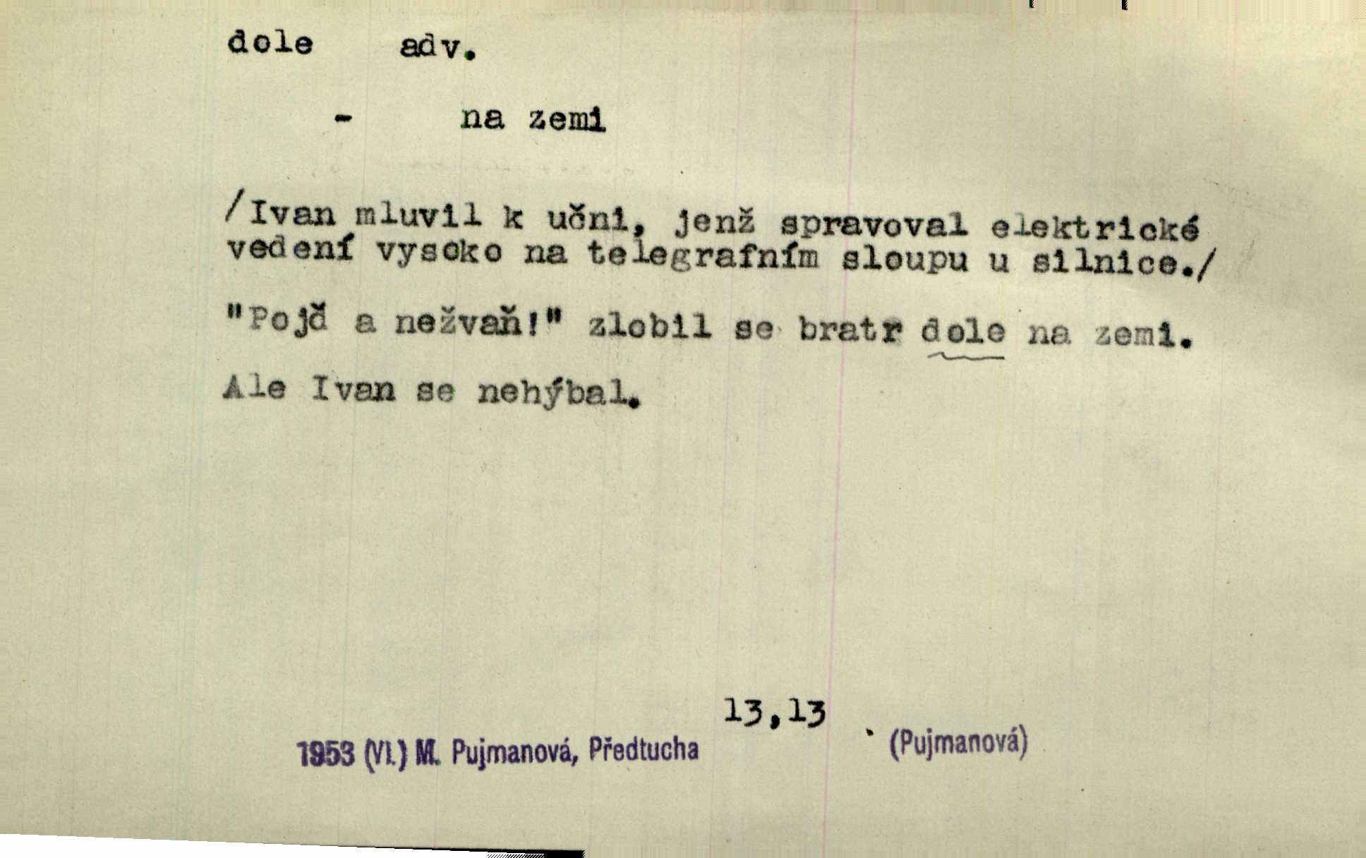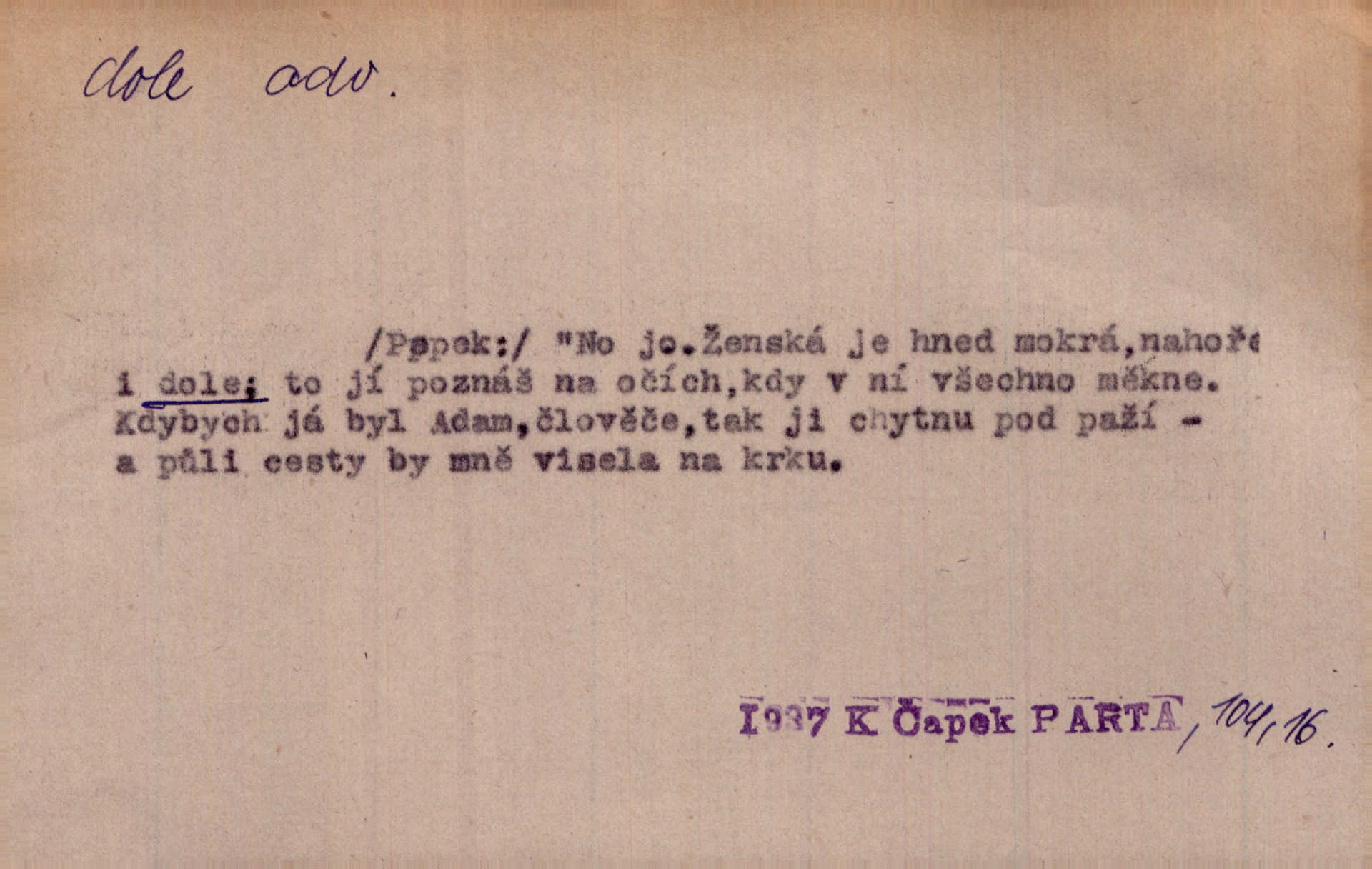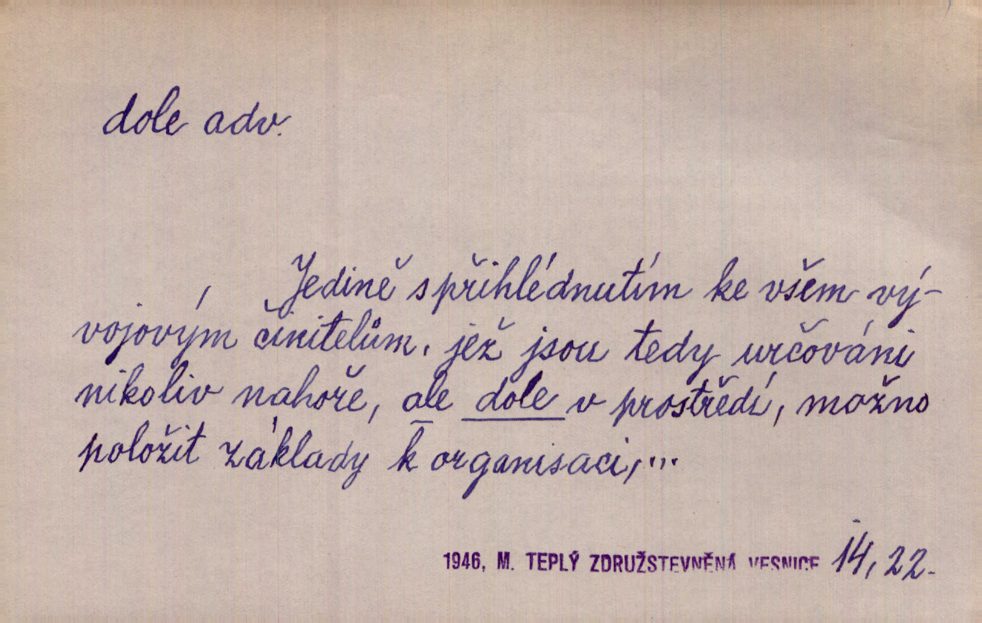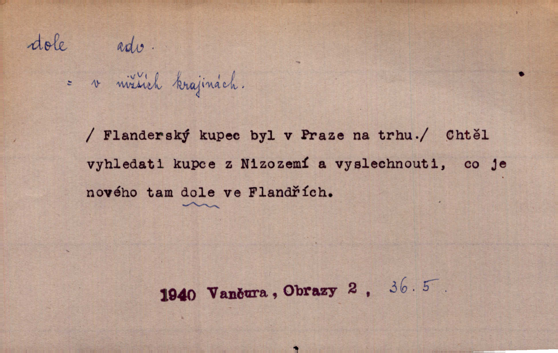 - dole adv. (komp. doleji) na nízkém (nižším) místě, nízko (op. nahoře, navrchu). Těžká sukovitá hůl, dole železem kovaná. Jan. Dole v truhle leželo babiččino prádlo a šatstvo vespod, naspodu. Něm. Dole je krám pod námi. Bydlíte dole v přízemí, v nižším patře. Toužil po smrti a žádal si klidu tam dole ve věčném šeru v hrobě. Zey. Vám, myslivci, tu dole je hej v údolí, v rovině (op. v horách). Něm. Vážnější dvořané soudili o záletnosti biskupově vytýkajíce, jak že má pak dole jasno býti, když s temene nesvítí světlo dobrých příkladů v nižších vrstvách kněžských i laických. Jir. Dole u stolu na „dolním“ konci, na místě nejméně význačném. D býti dole s vedl. význ. býti pryč a p. [Listy akátové] s prvním větrem jsou dole! Mach. Já mám boty do roboty přes brázdy a pole — zvednu jednu, zvednu druhou, a jsou s nohou dole. F. S. Proch. Pozdě z jara, když už všechen sníh byl dole. Rais. Dům starý bourají; už místy je střecha dole. Vrch. D býti dole býti zničen. Chvast nám jazyk skálel, podvod oře pole, a krb Bída strhla. Všecko, vše je dole. Heyd. Je tak dole, že mu už níž nelze, než s mostu do řeky. Čap. Ch. D Lid. Už jsou dole s kazatelny mají po ohláškách. Slang. To je „dole“, aby někdo dostával peníze za to, že nic nedělá to je proti tradici, to není spravedlivé. Přít. D v jižní krajině, na jihu. Zanotoval píseň, jak ji slýchal tam dole ve Veroně. Jir. Jedu za obchodem; mám něco dole, na jihu, nějaký průmysl. K. Čap. D Lit. pod čarou. O tom viz dole. Ostatek následuje doleji dále.
