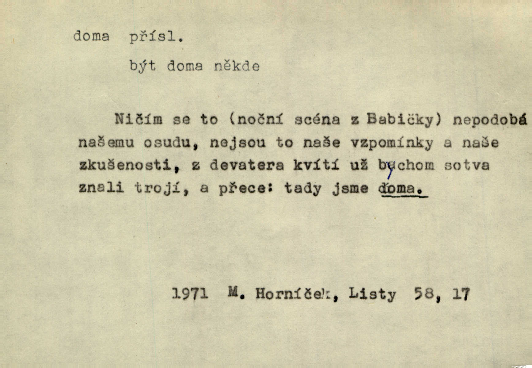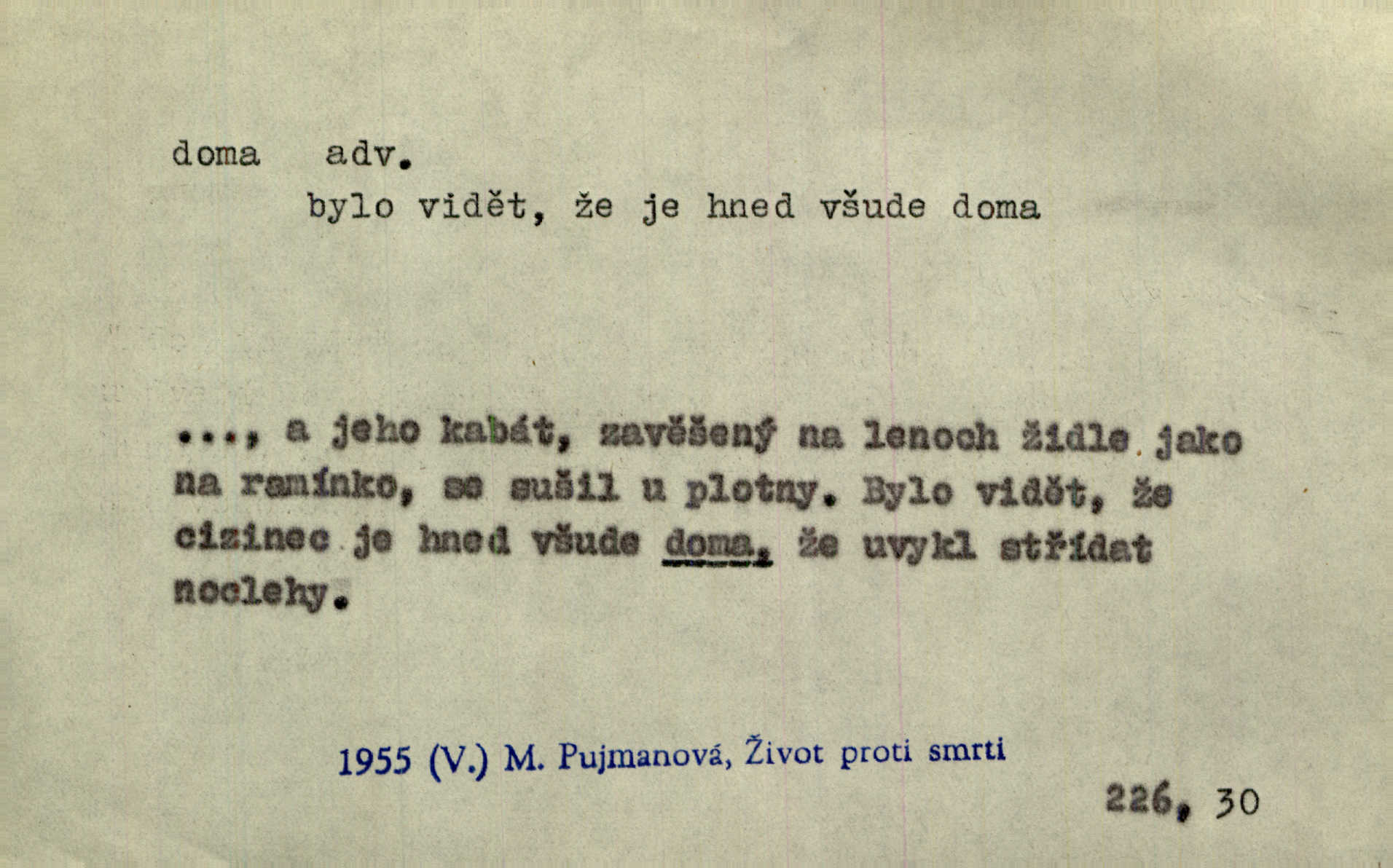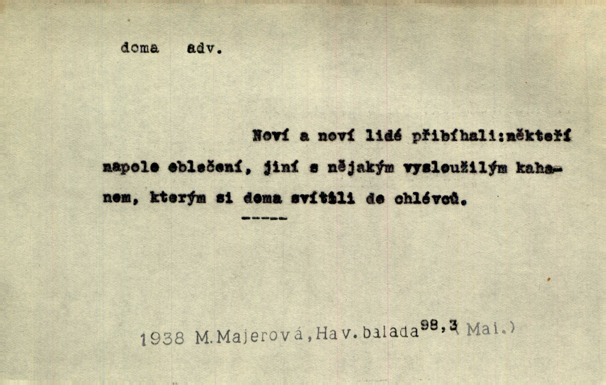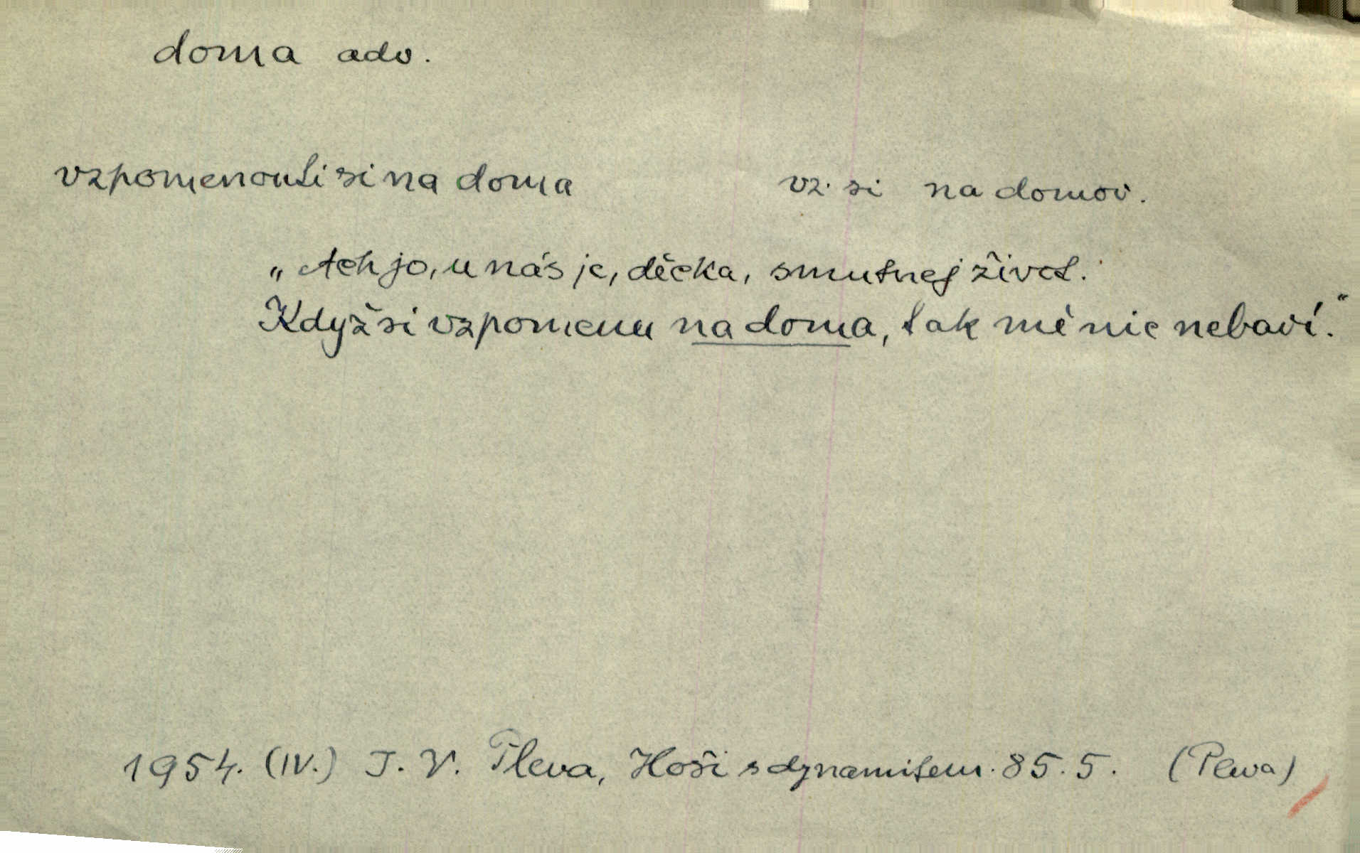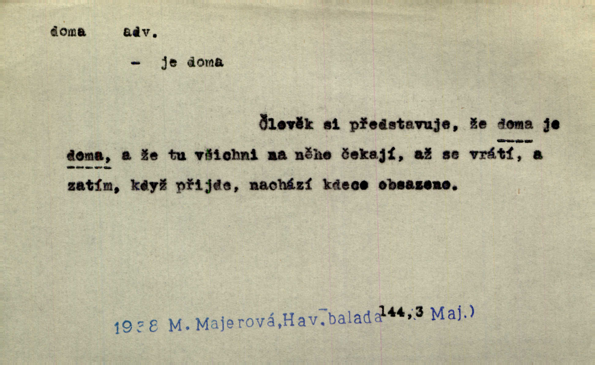 - doma adv. v místě svého trvalého pobytu (v svém bytě, domě, domácnosti, v obci pobytu a p.). Dříve se zpívalo doma i na polích. Jir. V té krajině byla již jako doma, to všechno znala. Jir. Jez doma, co máš, u lidí, co ti dají. Čel. Všude dobře, doma nejlépe. Přísl. [Zloděj] u Lišáků je jako doma často tam dochází. Jir. Každý mleč cítil se ve mlýně doma. Baar. Přen. Kde zněla harfa, doma byla ctnost, tál něhou drsný, bojechtivý jun vládla, sídlila. Vrch. D v své vlasti, v svém státě. Ještě bych nic neříkal, kdyby zůstal zde doma v Čechách; ale musit takhle hned zítra do Netálie! Pfleg. Ze skvostů našich bohatne jen cizina a doma zchudl i svou krví lid. Vlč. D býti doma v něčem vyznati se, rozuměti, pochopiti. Jak slyšela hostův hlas, byla doma. Her. Staruška cítila se jen tehdy doma v rozprávce, když mohla vykládat o lidech s korunkami ve znaku. Preis. I pramilione, vždyť je to Toník, no, nejsem já hned v hlavě doma? Rais. To měla hned na první pohled zjištěno, už věděla, „kde je doma“ na čem je. Hál. D doma neskl. subst. lid. (vlastní) byt, (vlastní) domácnost, domov. Tak, tady budeš teď mít doma! Rais. My tady dnes, tatínku, u vás zůstanem, o doma starost mít nemusíme. Rais. Šaty na doma pro domácí potřebu.