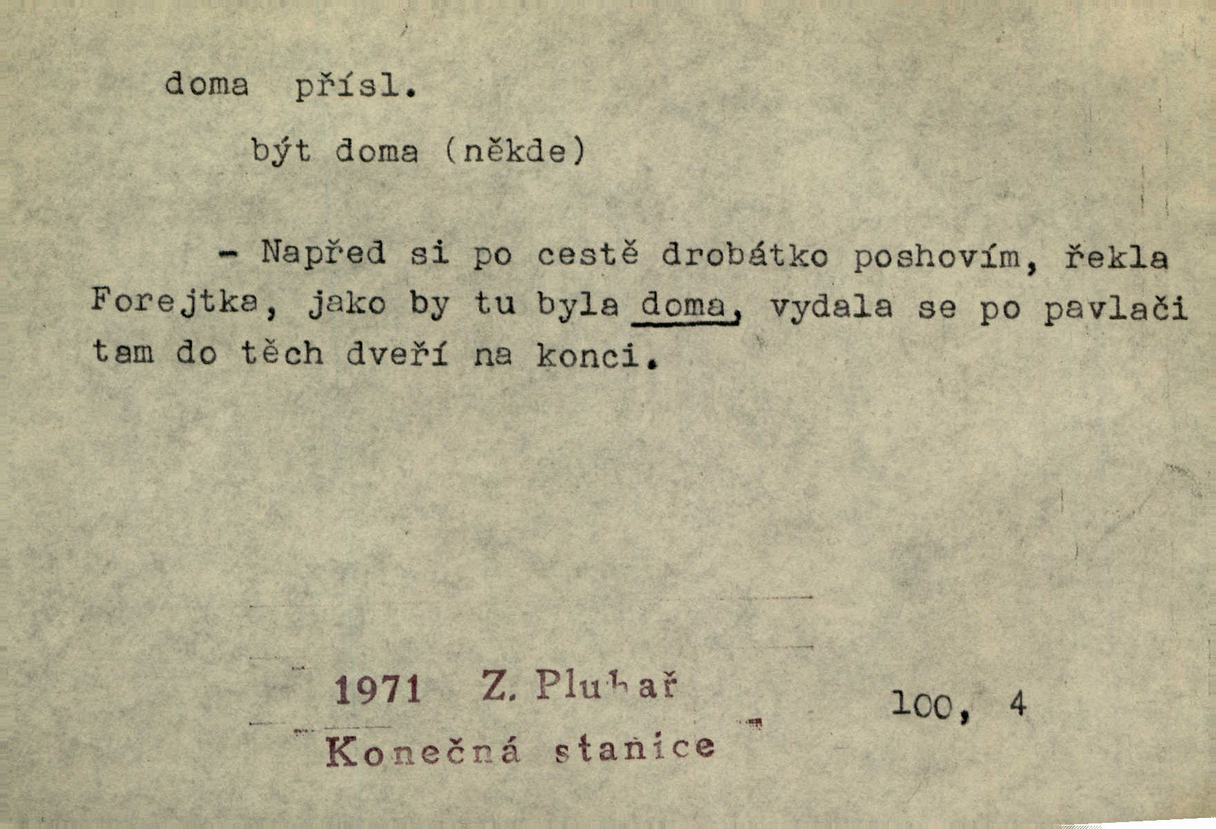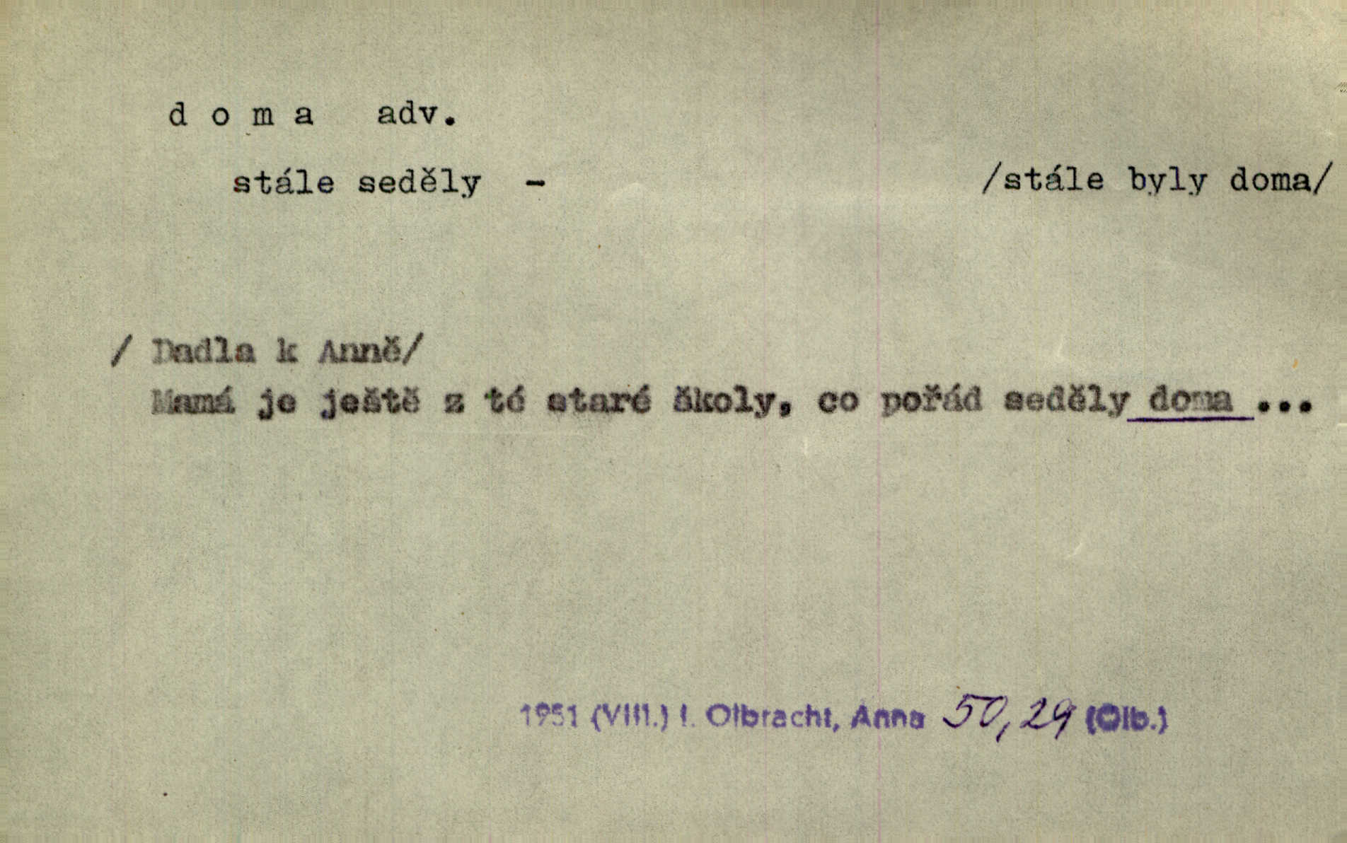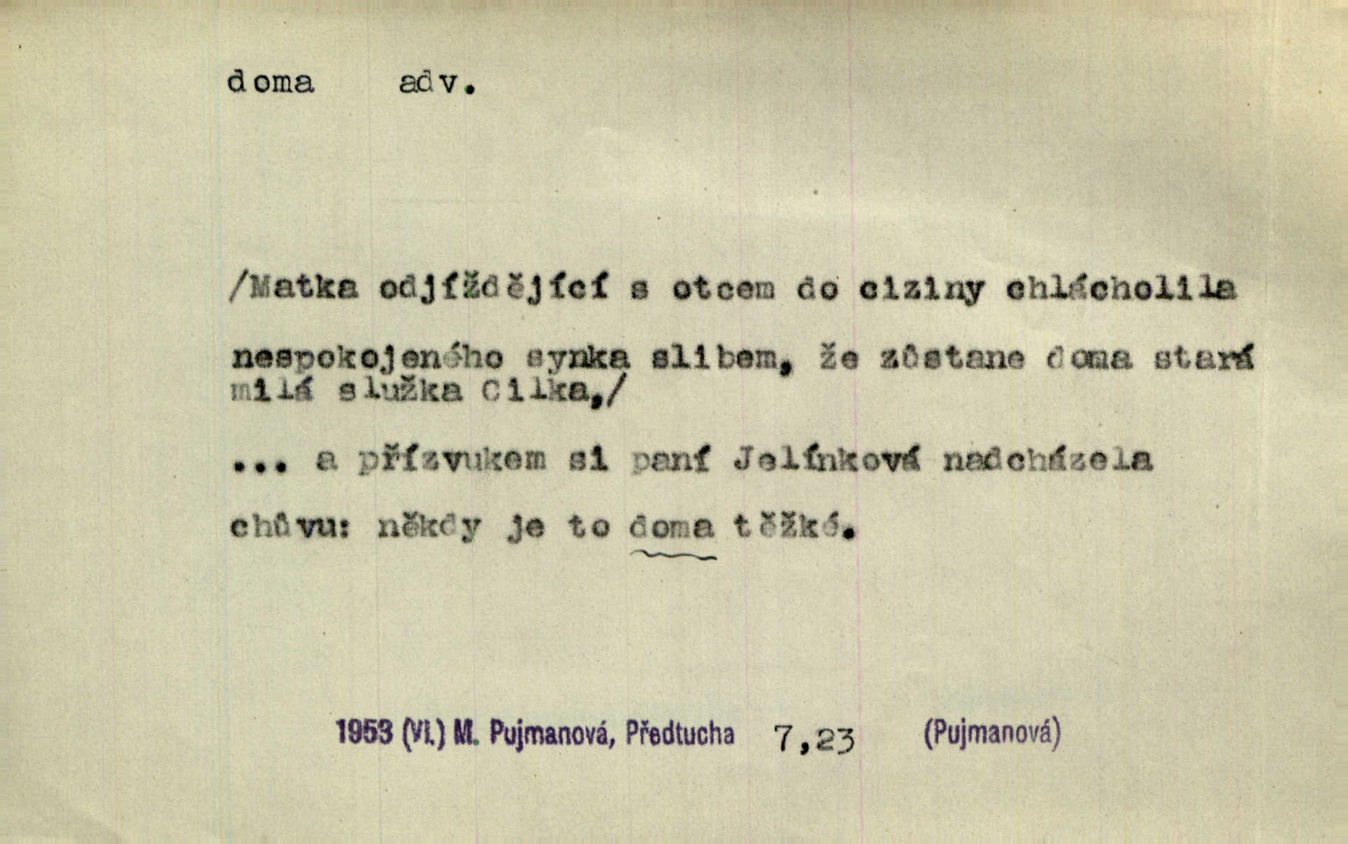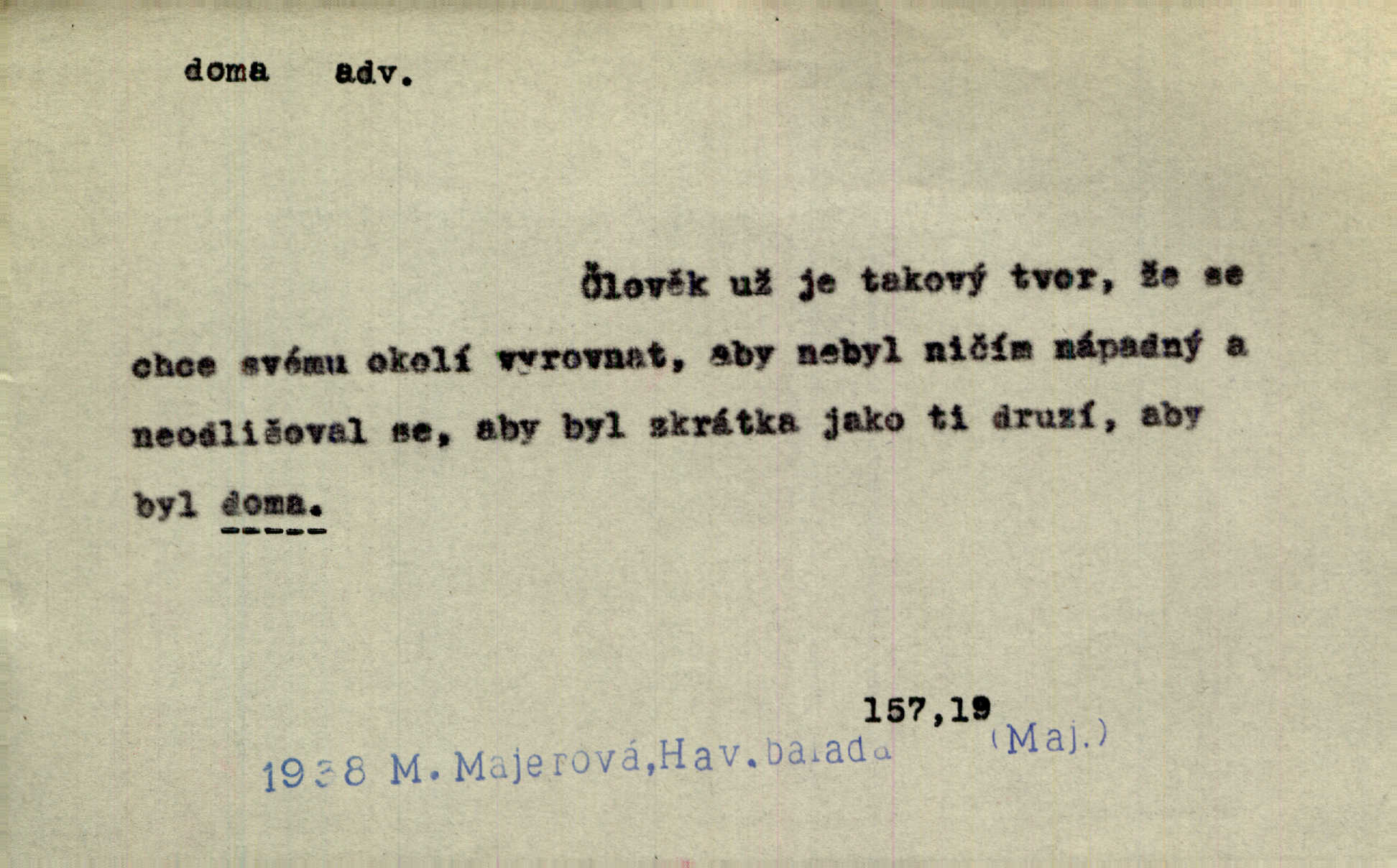 - doma adv. v místě svého trvalého pobytu (v svém bytě, domě, domácnosti, v obci pobytu a p.). Dříve se zpívalo doma i na polích. Jir. V té krajině byla již jako doma, to všechno znala. Jir. Jez doma, co máš, u lidí, co ti dají. Čel. Všude dobře, doma nejlépe. Přísl. [Zloděj] u Lišáků je jako doma často tam dochází. Jir. Každý mleč cítil se ve mlýně doma. Baar. Přen. Kde zněla harfa, doma byla ctnost, tál něhou drsný, bojechtivý jun vládla, sídlila. Vrch. D v své vlasti, v svém státě. Ještě bych nic neříkal, kdyby zůstal zde doma v Čechách; ale musit takhle hned zítra do Netálie! Pfleg. Ze skvostů našich bohatne jen cizina a doma zchudl i svou krví lid. Vlč. D býti doma v něčem vyznati se, rozuměti, pochopiti. Jak slyšela hostův hlas, byla doma. Her. Staruška cítila se jen tehdy doma v rozprávce, když mohla vykládat o lidech s korunkami ve znaku. Preis. I pramilione, vždyť je to Toník, no, nejsem já hned v hlavě doma? Rais. To měla hned na první pohled zjištěno, už věděla, „kde je doma“ na čem je. Hál. D doma neskl. subst. lid. (vlastní) byt, (vlastní) domácnost, domov. Tak, tady budeš teď mít doma! Rais. My tady dnes, tatínku, u vás zůstanem, o doma starost mít nemusíme. Rais. Šaty na doma pro domácí potřebu.