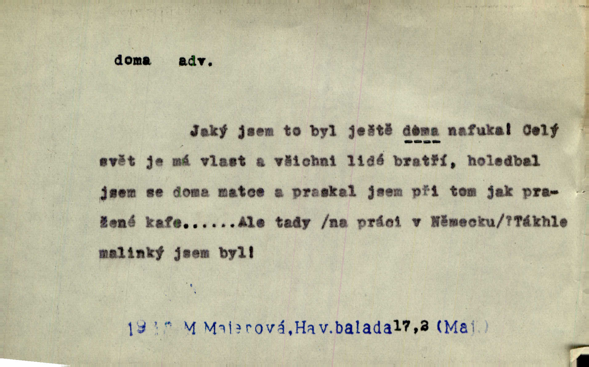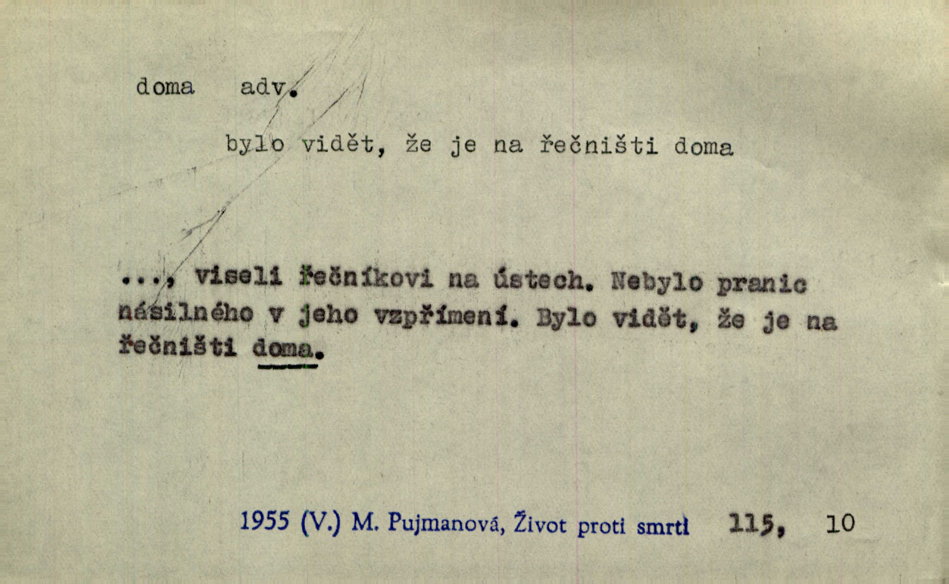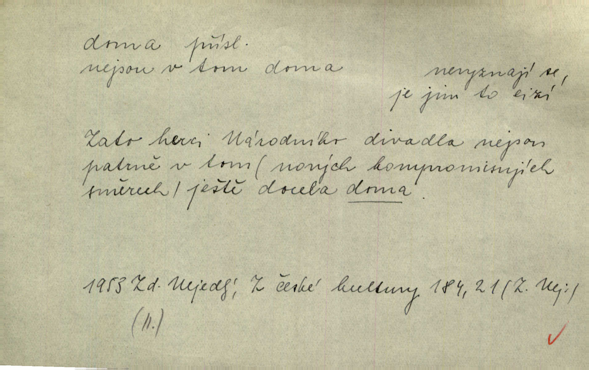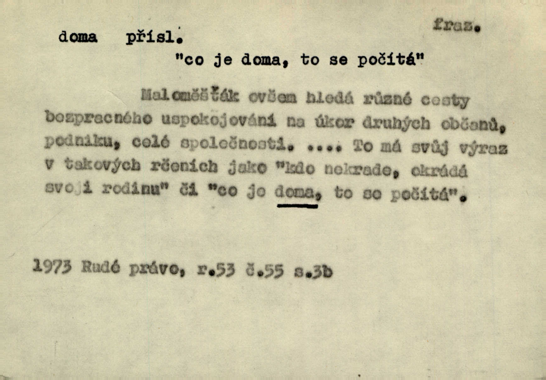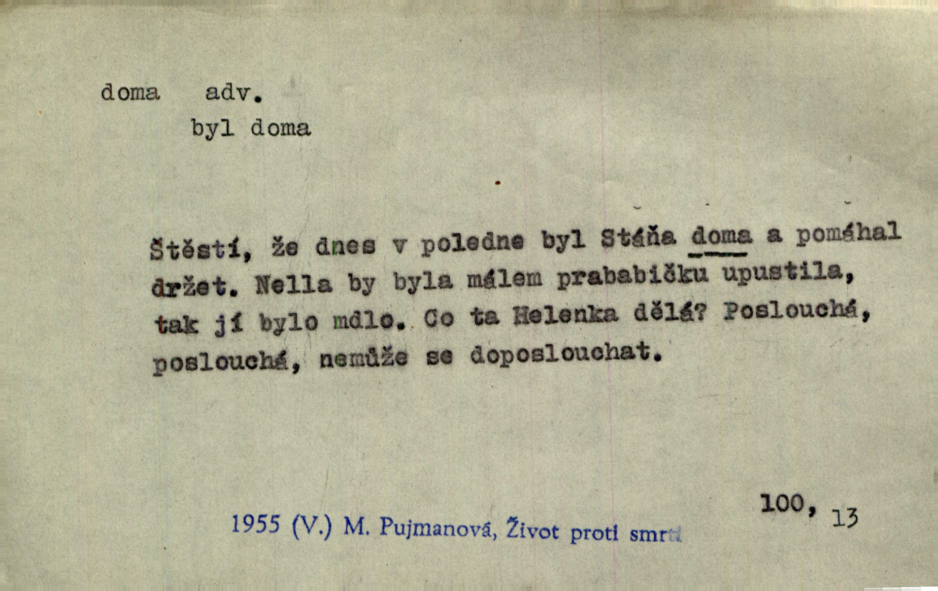 - doma adv. v místě svého trvalého pobytu (v svém bytě, domě, domácnosti, v obci pobytu a p.). Dříve se zpívalo doma i na polích. Jir. V té krajině byla již jako doma, to všechno znala. Jir. Jez doma, co máš, u lidí, co ti dají. Čel. Všude dobře, doma nejlépe. Přísl. [Zloděj] u Lišáků je jako doma často tam dochází. Jir. Každý mleč cítil se ve mlýně doma. Baar. Přen. Kde zněla harfa, doma byla ctnost, tál něhou drsný, bojechtivý jun vládla, sídlila. Vrch. D v své vlasti, v svém státě. Ještě bych nic neříkal, kdyby zůstal zde doma v Čechách; ale musit takhle hned zítra do Netálie! Pfleg. Ze skvostů našich bohatne jen cizina a doma zchudl i svou krví lid. Vlč. D býti doma v něčem vyznati se, rozuměti, pochopiti. Jak slyšela hostův hlas, byla doma. Her. Staruška cítila se jen tehdy doma v rozprávce, když mohla vykládat o lidech s korunkami ve znaku. Preis. I pramilione, vždyť je to Toník, no, nejsem já hned v hlavě doma? Rais. To měla hned na první pohled zjištěno, už věděla, „kde je doma“ na čem je. Hál. D doma neskl. subst. lid. (vlastní) byt, (vlastní) domácnost, domov. Tak, tady budeš teď mít doma! Rais. My tady dnes, tatínku, u vás zůstanem, o doma starost mít nemusíme. Rais. Šaty na doma pro domácí potřebu.