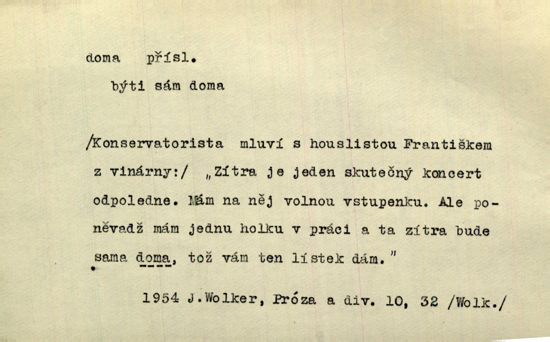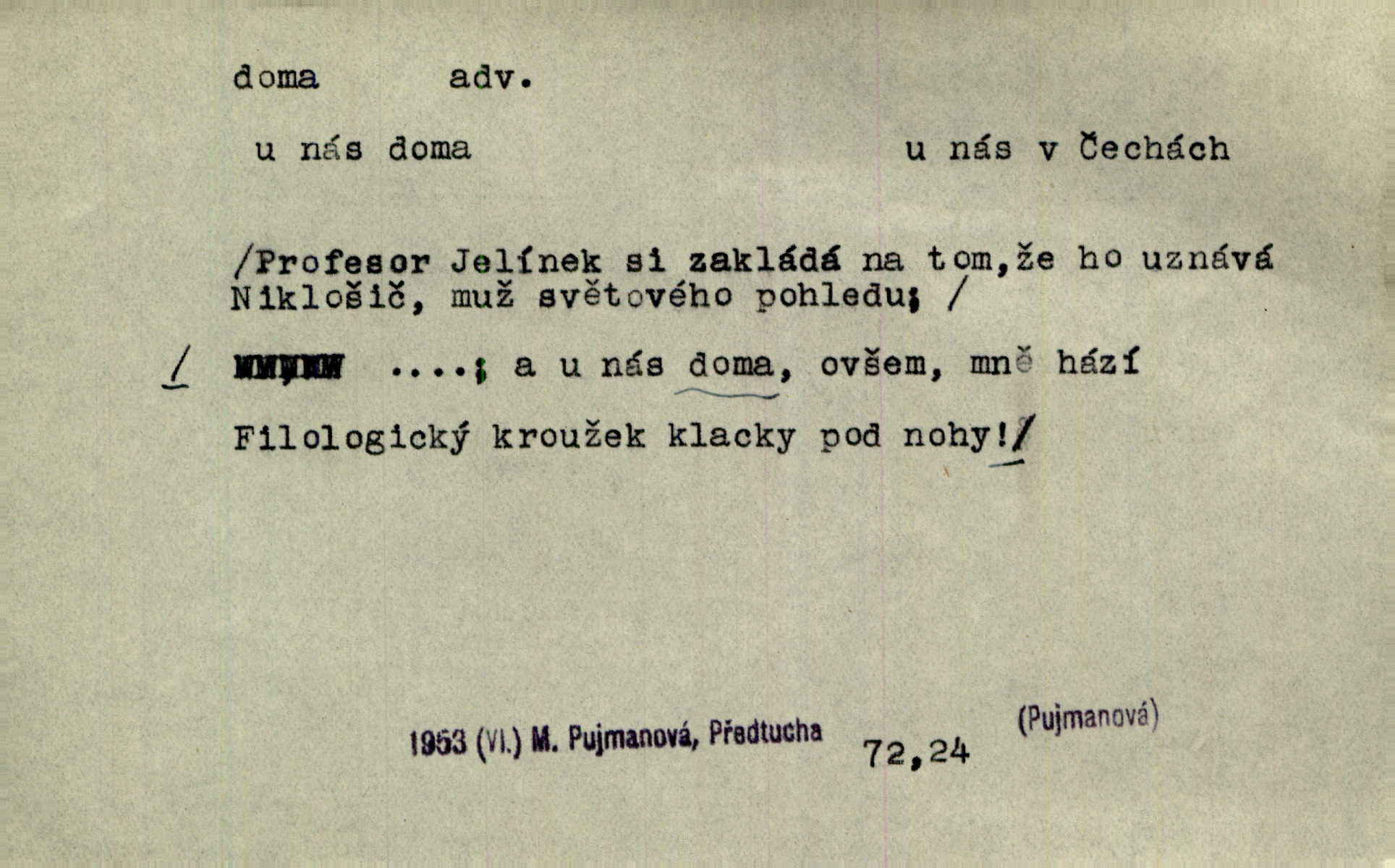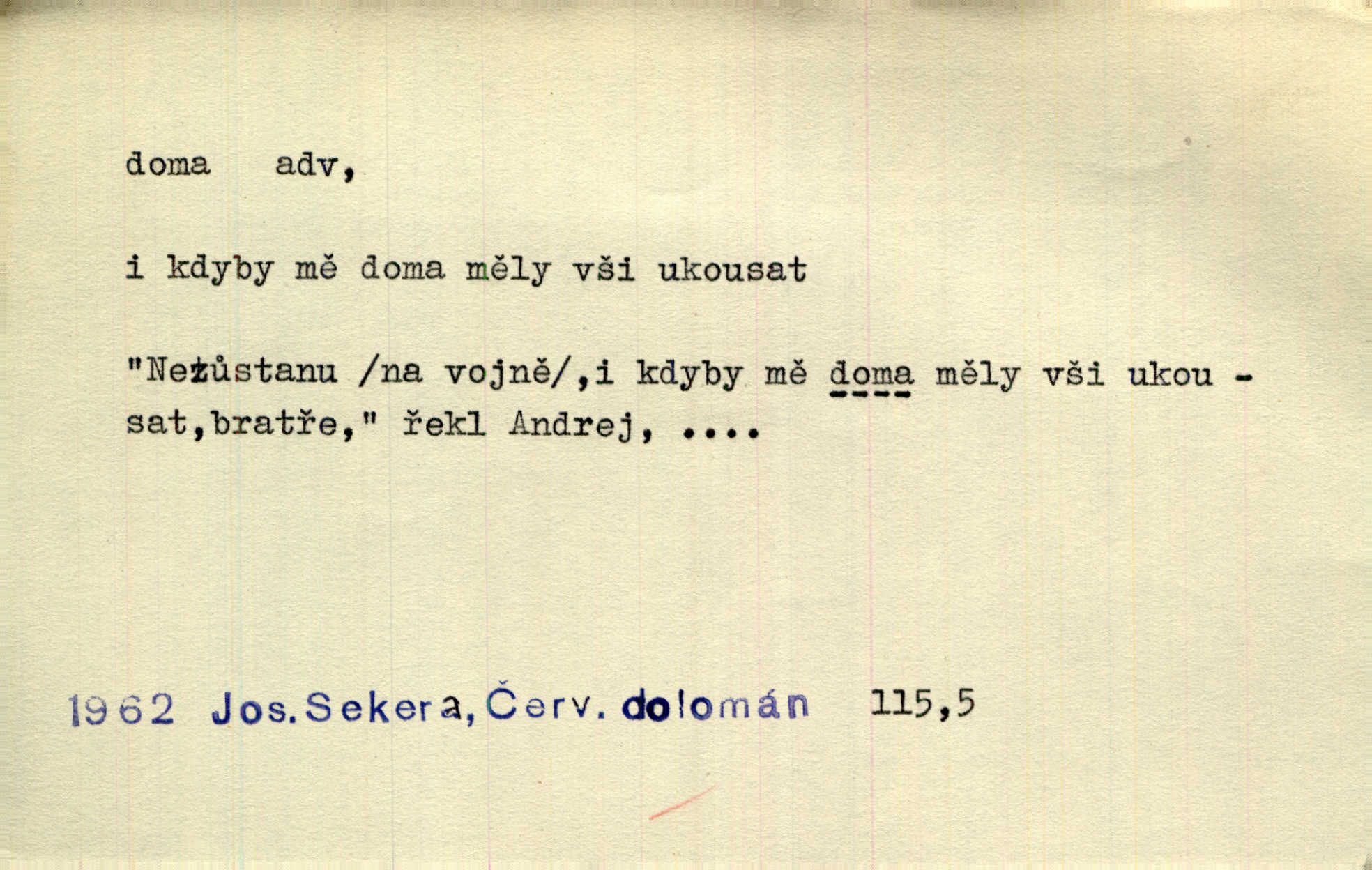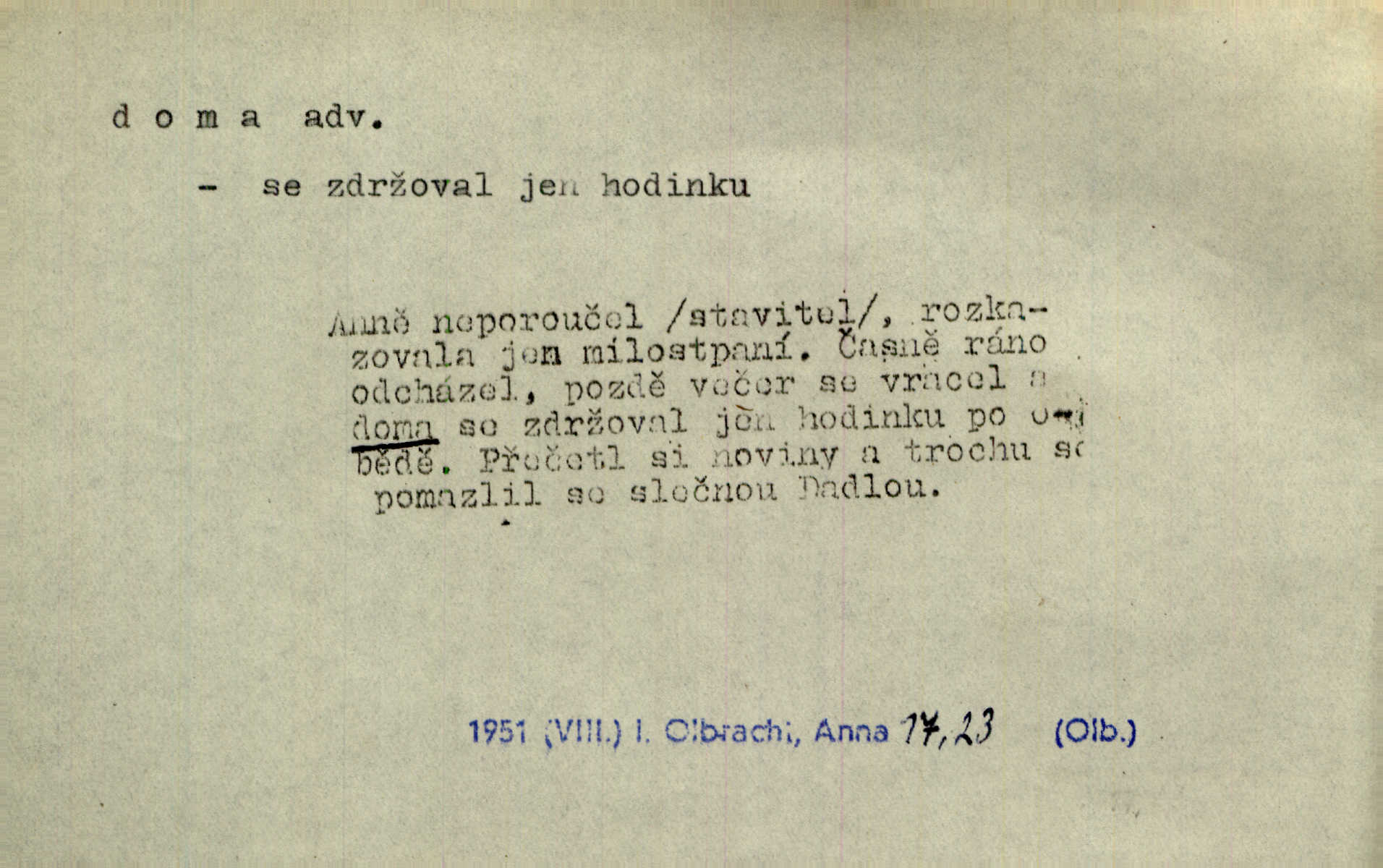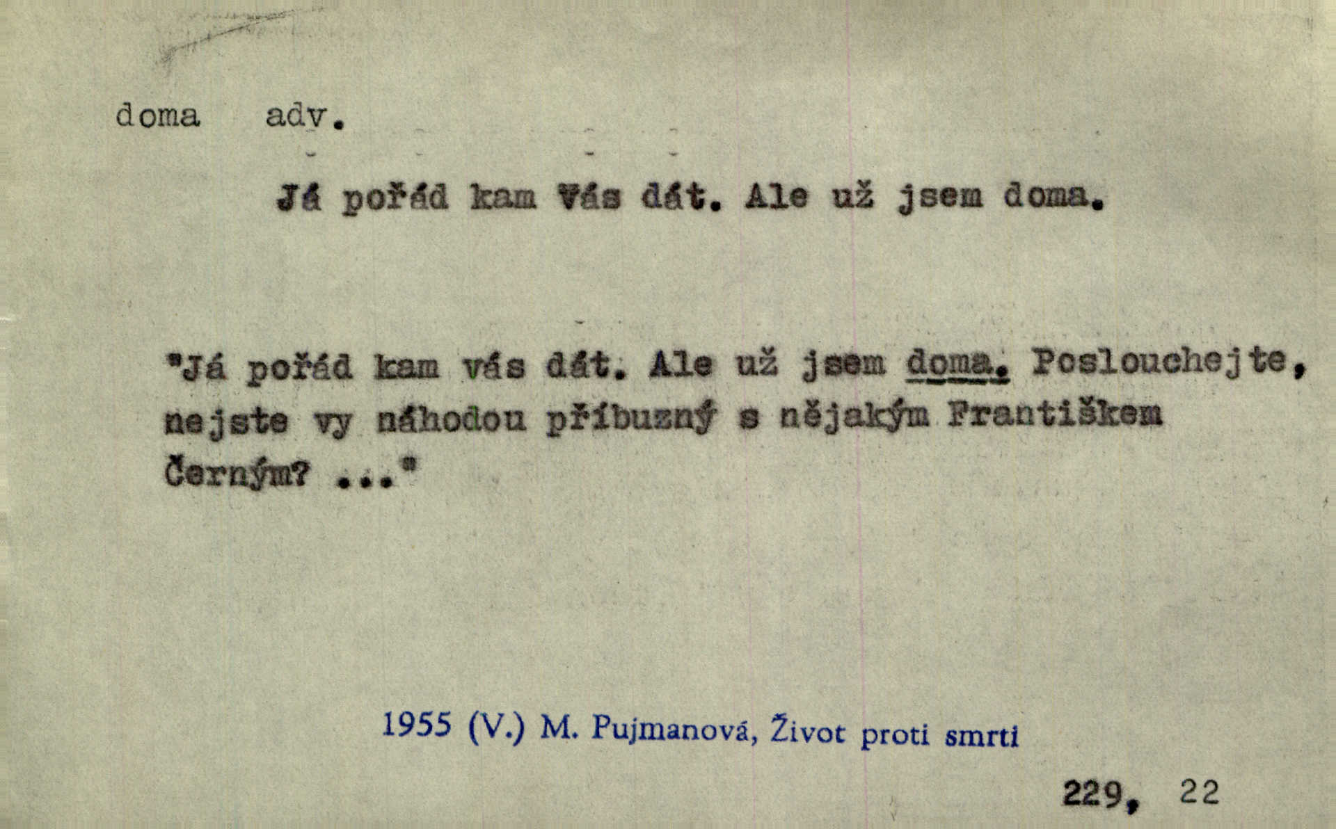 - doma adv. v místě svého trvalého pobytu (v svém bytě, domě, domácnosti, v obci pobytu a p.). Dříve se zpívalo doma i na polích. Jir. V té krajině byla již jako doma, to všechno znala. Jir. Jez doma, co máš, u lidí, co ti dají. Čel. Všude dobře, doma nejlépe. Přísl. [Zloděj] u Lišáků je jako doma často tam dochází. Jir. Každý mleč cítil se ve mlýně doma. Baar. Přen. Kde zněla harfa, doma byla ctnost, tál něhou drsný, bojechtivý jun vládla, sídlila. Vrch. D v své vlasti, v svém státě. Ještě bych nic neříkal, kdyby zůstal zde doma v Čechách; ale musit takhle hned zítra do Netálie! Pfleg. Ze skvostů našich bohatne jen cizina a doma zchudl i svou krví lid. Vlč. D býti doma v něčem vyznati se, rozuměti, pochopiti. Jak slyšela hostův hlas, byla doma. Her. Staruška cítila se jen tehdy doma v rozprávce, když mohla vykládat o lidech s korunkami ve znaku. Preis. I pramilione, vždyť je to Toník, no, nejsem já hned v hlavě doma? Rais. To měla hned na první pohled zjištěno, už věděla, „kde je doma“ na čem je. Hál. D doma neskl. subst. lid. (vlastní) byt, (vlastní) domácnost, domov. Tak, tady budeš teď mít doma! Rais. My tady dnes, tatínku, u vás zůstanem, o doma starost mít nemusíme. Rais. Šaty na doma pro domácí potřebu.