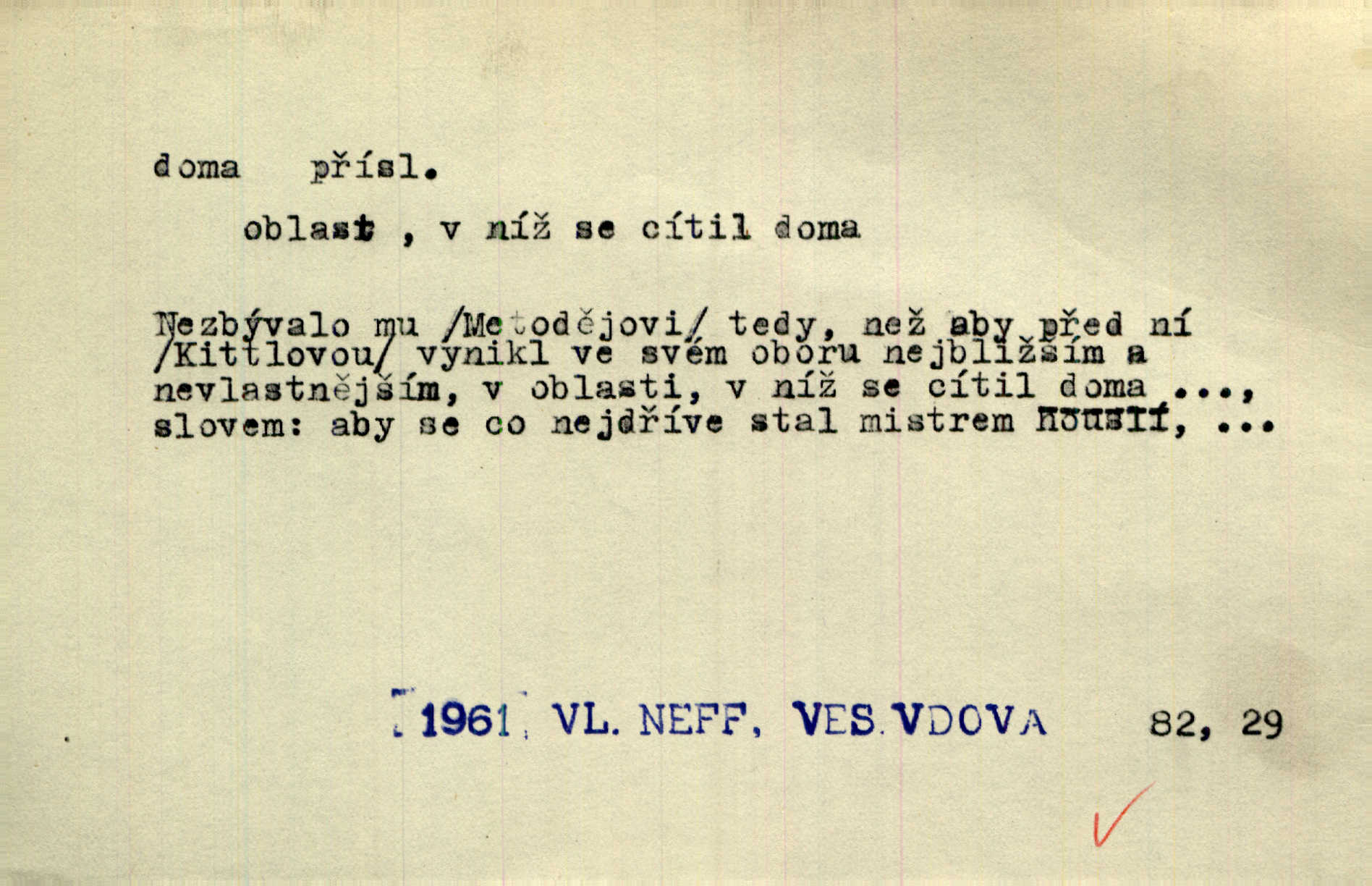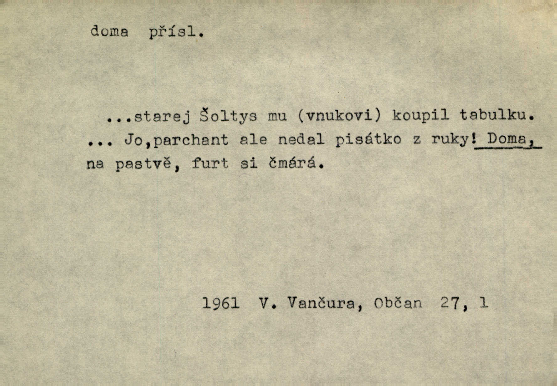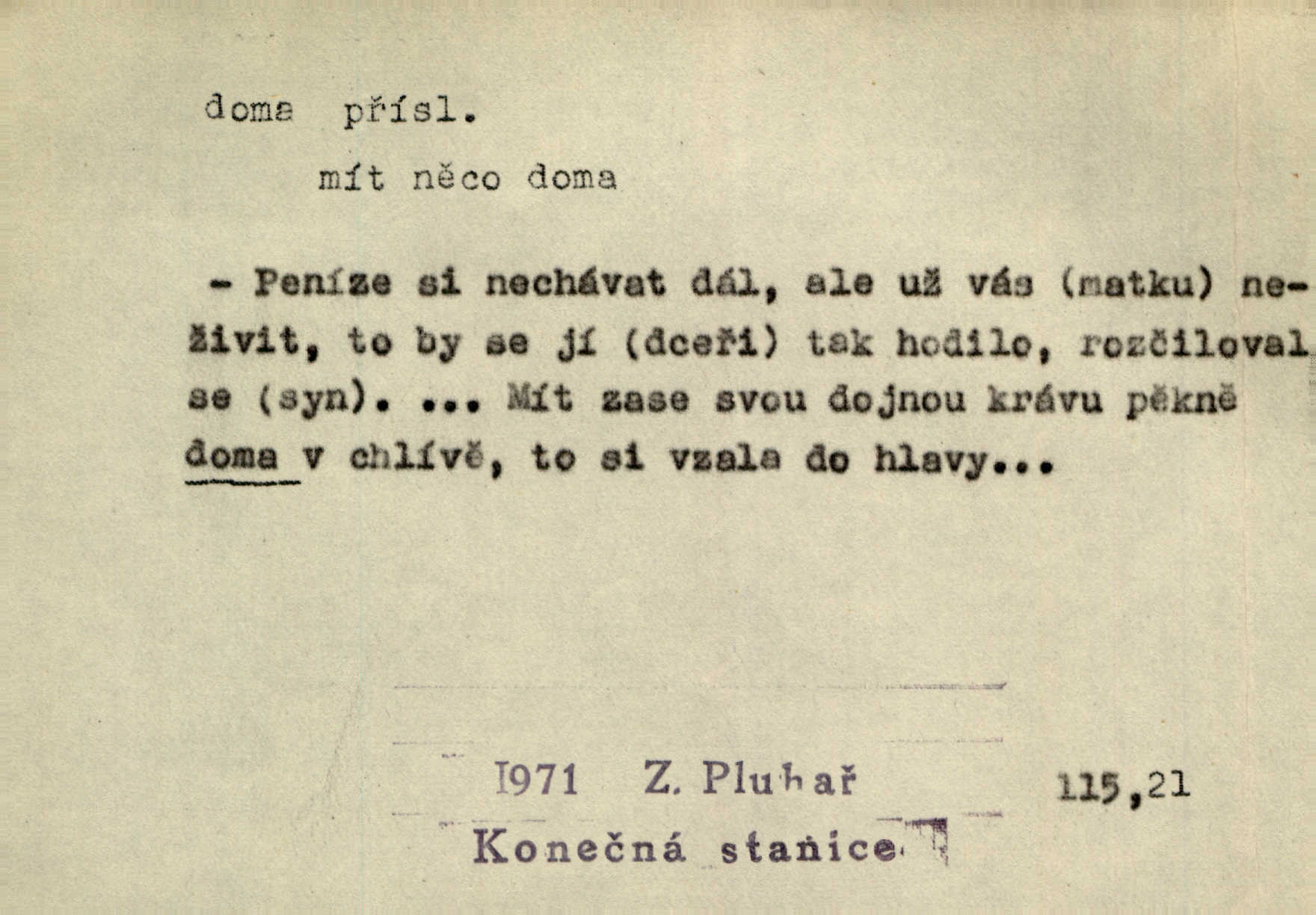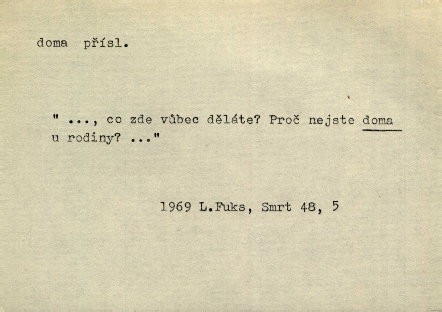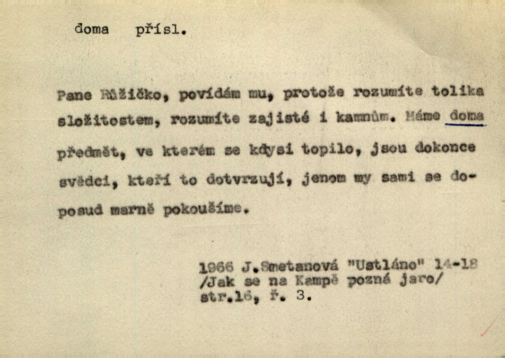 - doma adv. v místě svého trvalého pobytu (v svém bytě, domě, domácnosti, v obci pobytu a p.). Dříve se zpívalo doma i na polích. Jir. V té krajině byla již jako doma, to všechno znala. Jir. Jez doma, co máš, u lidí, co ti dají. Čel. Všude dobře, doma nejlépe. Přísl. [Zloděj] u Lišáků je jako doma často tam dochází. Jir. Každý mleč cítil se ve mlýně doma. Baar. Přen. Kde zněla harfa, doma byla ctnost, tál něhou drsný, bojechtivý jun vládla, sídlila. Vrch. D v své vlasti, v svém státě. Ještě bych nic neříkal, kdyby zůstal zde doma v Čechách; ale musit takhle hned zítra do Netálie! Pfleg. Ze skvostů našich bohatne jen cizina a doma zchudl i svou krví lid. Vlč. D býti doma v něčem vyznati se, rozuměti, pochopiti. Jak slyšela hostův hlas, byla doma. Her. Staruška cítila se jen tehdy doma v rozprávce, když mohla vykládat o lidech s korunkami ve znaku. Preis. I pramilione, vždyť je to Toník, no, nejsem já hned v hlavě doma? Rais. To měla hned na první pohled zjištěno, už věděla, „kde je doma“ na čem je. Hál. D doma neskl. subst. lid. (vlastní) byt, (vlastní) domácnost, domov. Tak, tady budeš teď mít doma! Rais. My tady dnes, tatínku, u vás zůstanem, o doma starost mít nemusíme. Rais. Šaty na doma pro domácí potřebu.