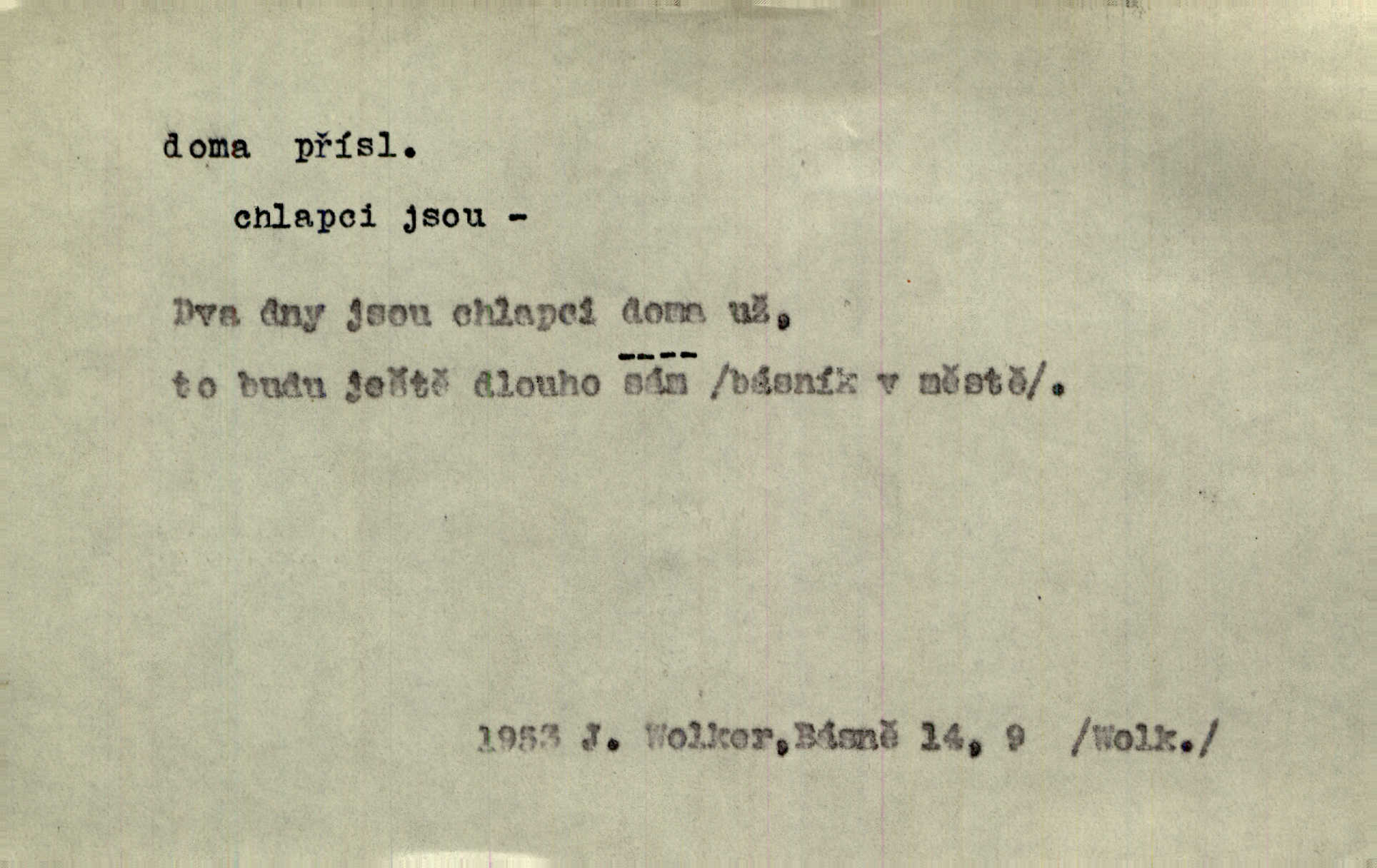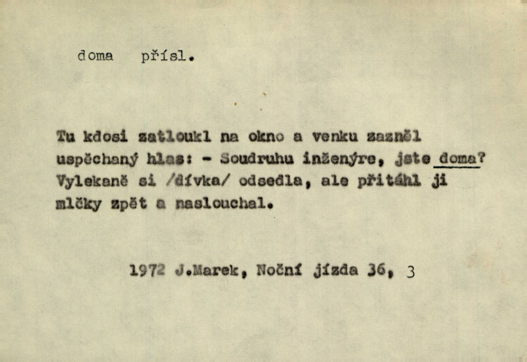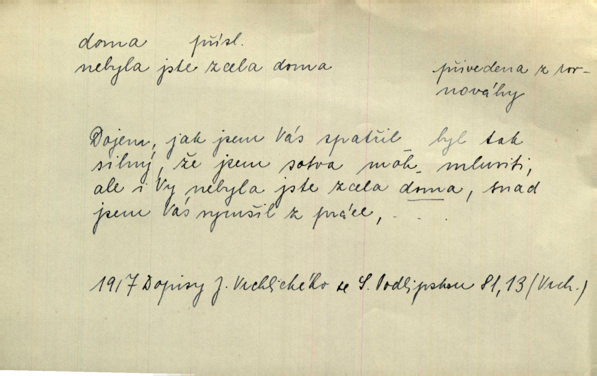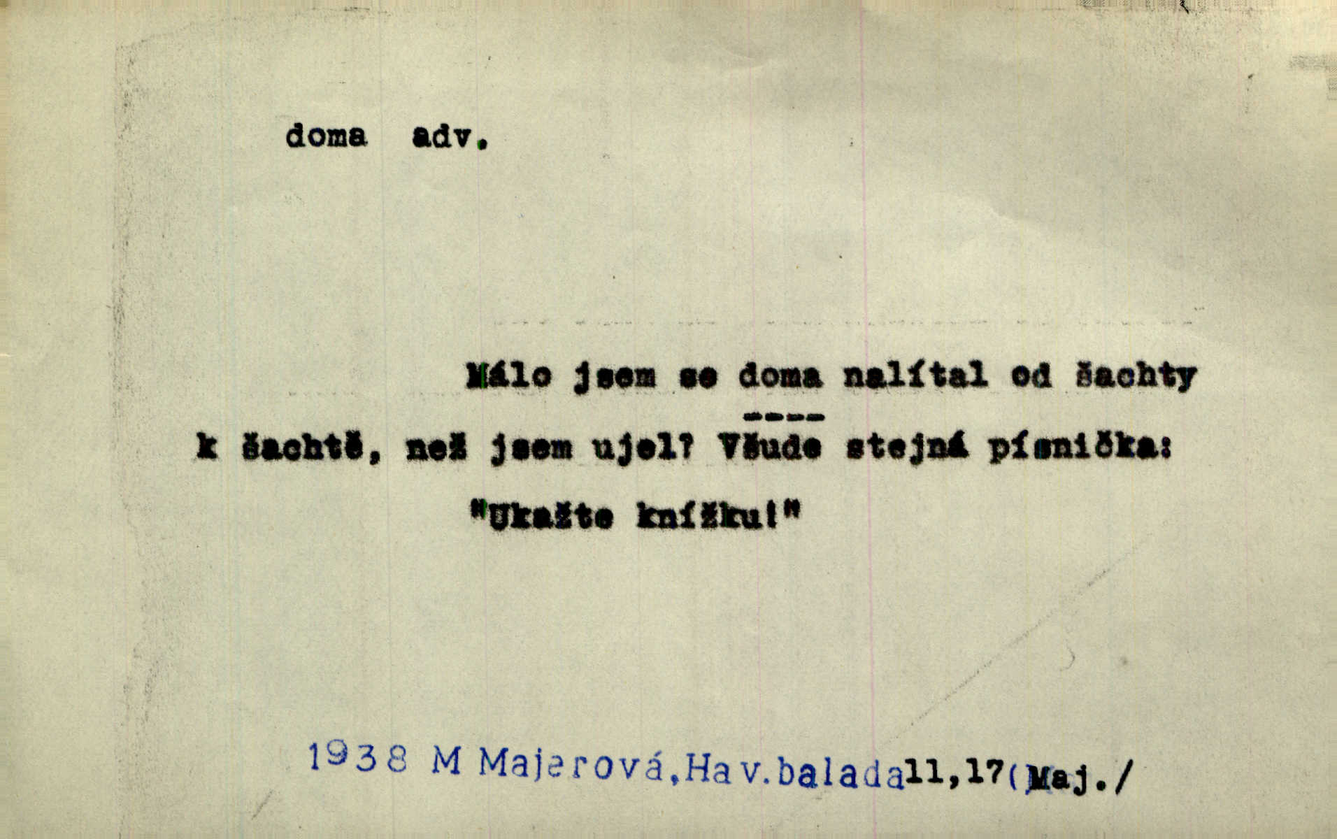 - doma adv. v místě svého trvalého pobytu (v svém bytě, domě, domácnosti, v obci pobytu a p.). Dříve se zpívalo doma i na polích. Jir. V té krajině byla již jako doma, to všechno znala. Jir. Jez doma, co máš, u lidí, co ti dají. Čel. Všude dobře, doma nejlépe. Přísl. [Zloděj] u Lišáků je jako doma často tam dochází. Jir. Každý mleč cítil se ve mlýně doma. Baar. Přen. Kde zněla harfa, doma byla ctnost, tál něhou drsný, bojechtivý jun vládla, sídlila. Vrch. D v své vlasti, v svém státě. Ještě bych nic neříkal, kdyby zůstal zde doma v Čechách; ale musit takhle hned zítra do Netálie! Pfleg. Ze skvostů našich bohatne jen cizina a doma zchudl i svou krví lid. Vlč. D býti doma v něčem vyznati se, rozuměti, pochopiti. Jak slyšela hostův hlas, byla doma. Her. Staruška cítila se jen tehdy doma v rozprávce, když mohla vykládat o lidech s korunkami ve znaku. Preis. I pramilione, vždyť je to Toník, no, nejsem já hned v hlavě doma? Rais. To měla hned na první pohled zjištěno, už věděla, „kde je doma“ na čem je. Hál. D doma neskl. subst. lid. (vlastní) byt, (vlastní) domácnost, domov. Tak, tady budeš teď mít doma! Rais. My tady dnes, tatínku, u vás zůstanem, o doma starost mít nemusíme. Rais. Šaty na doma pro domácí potřebu.