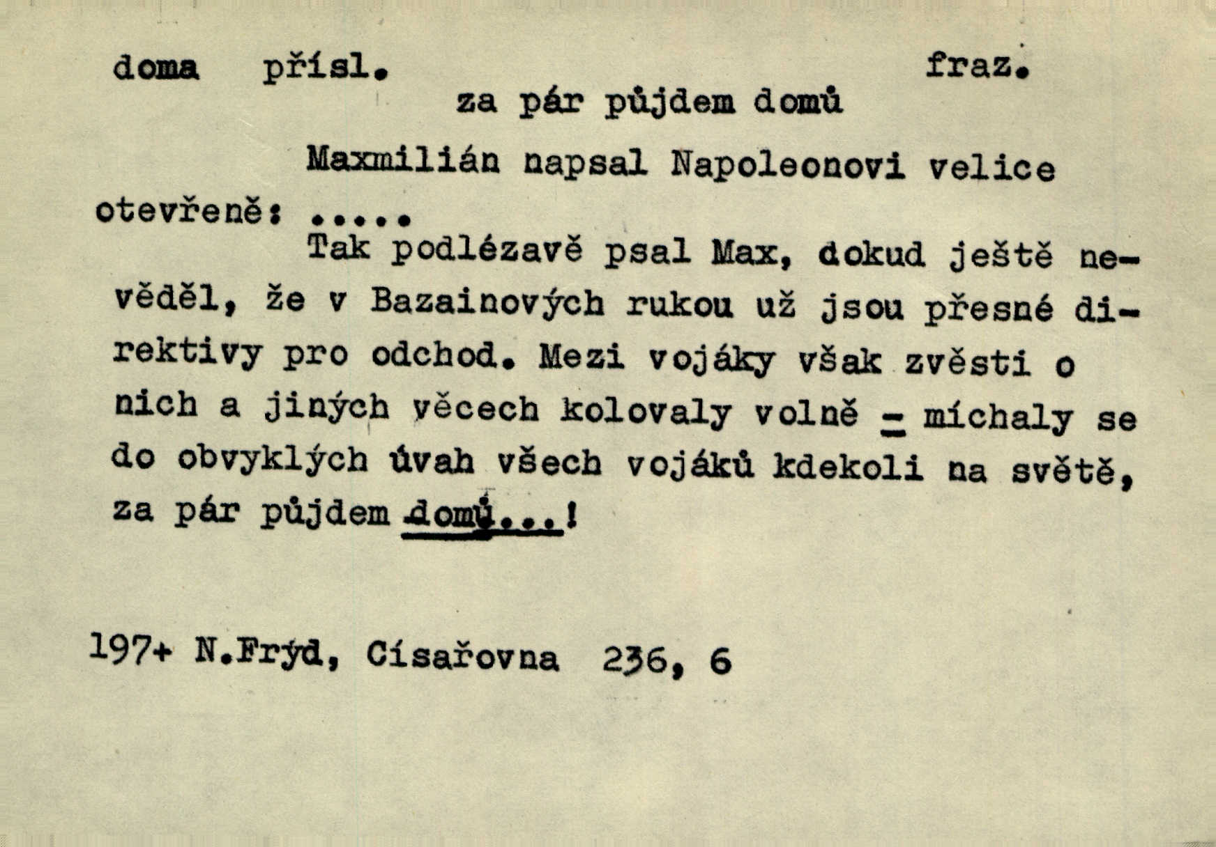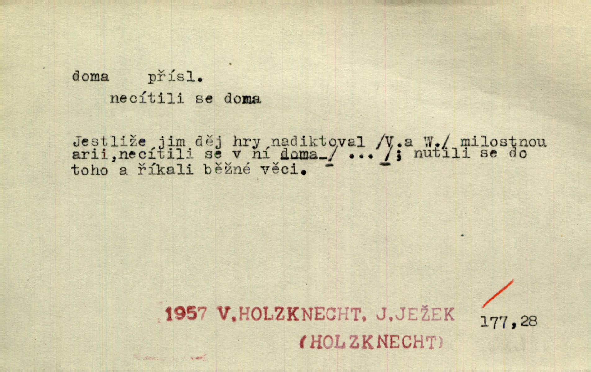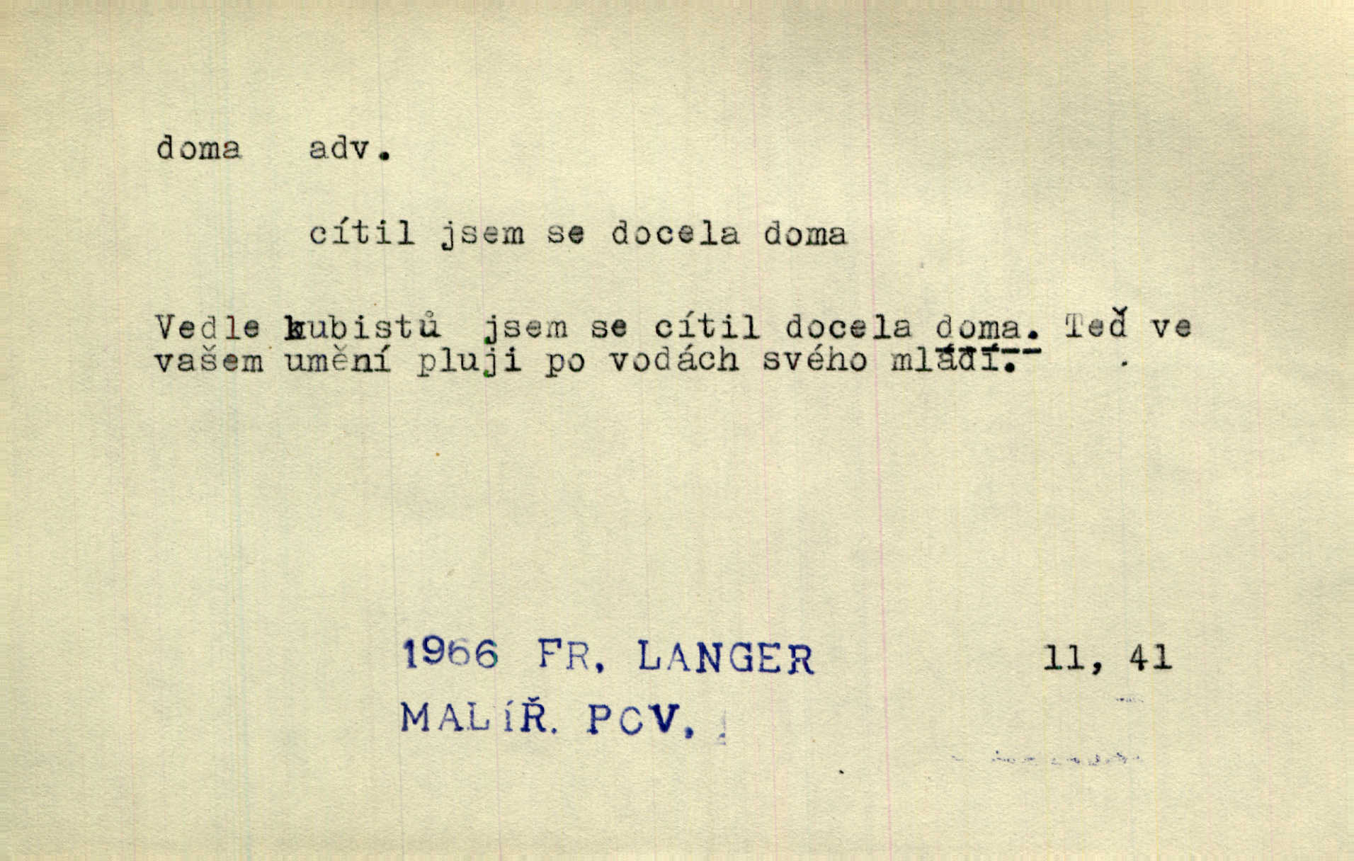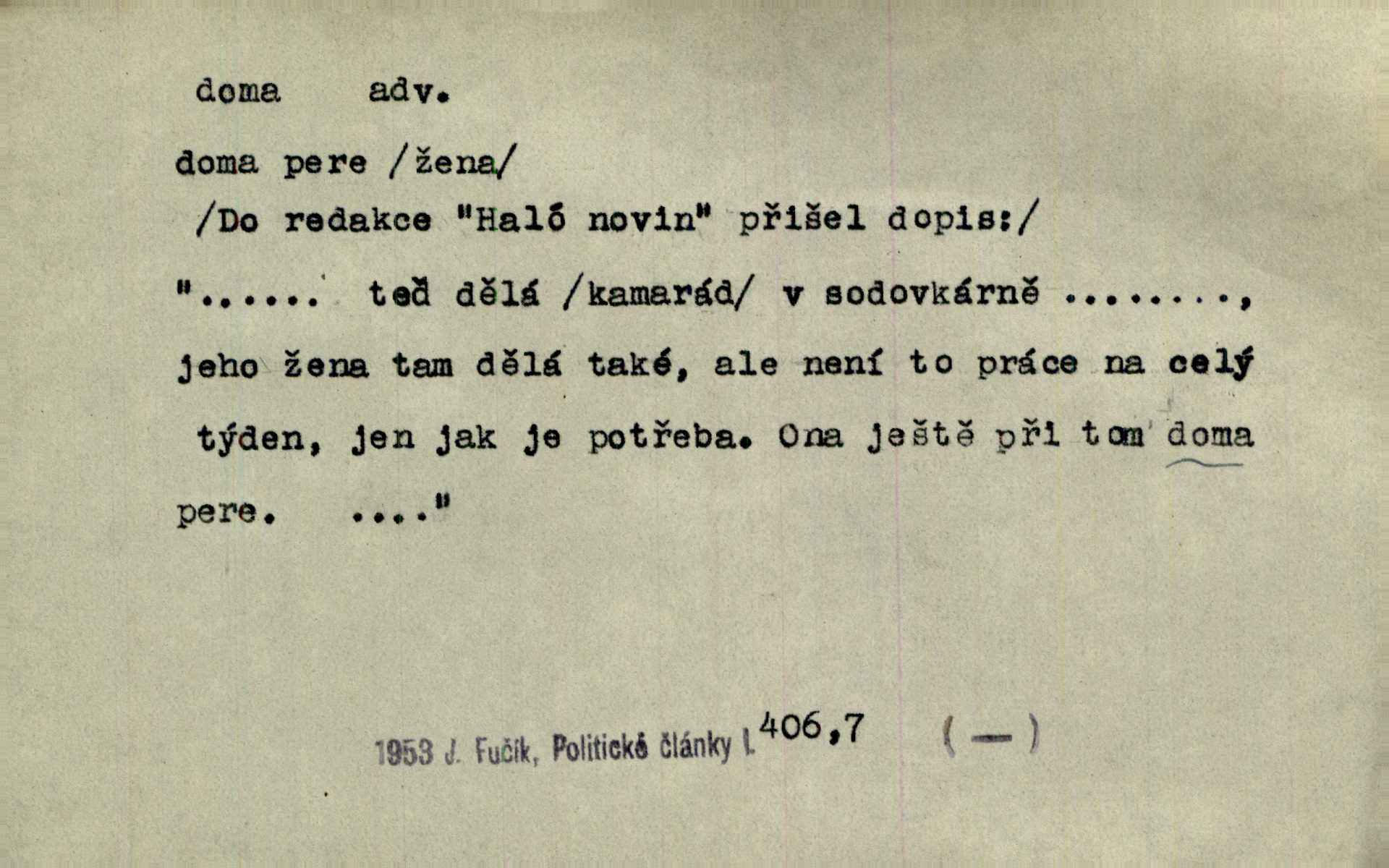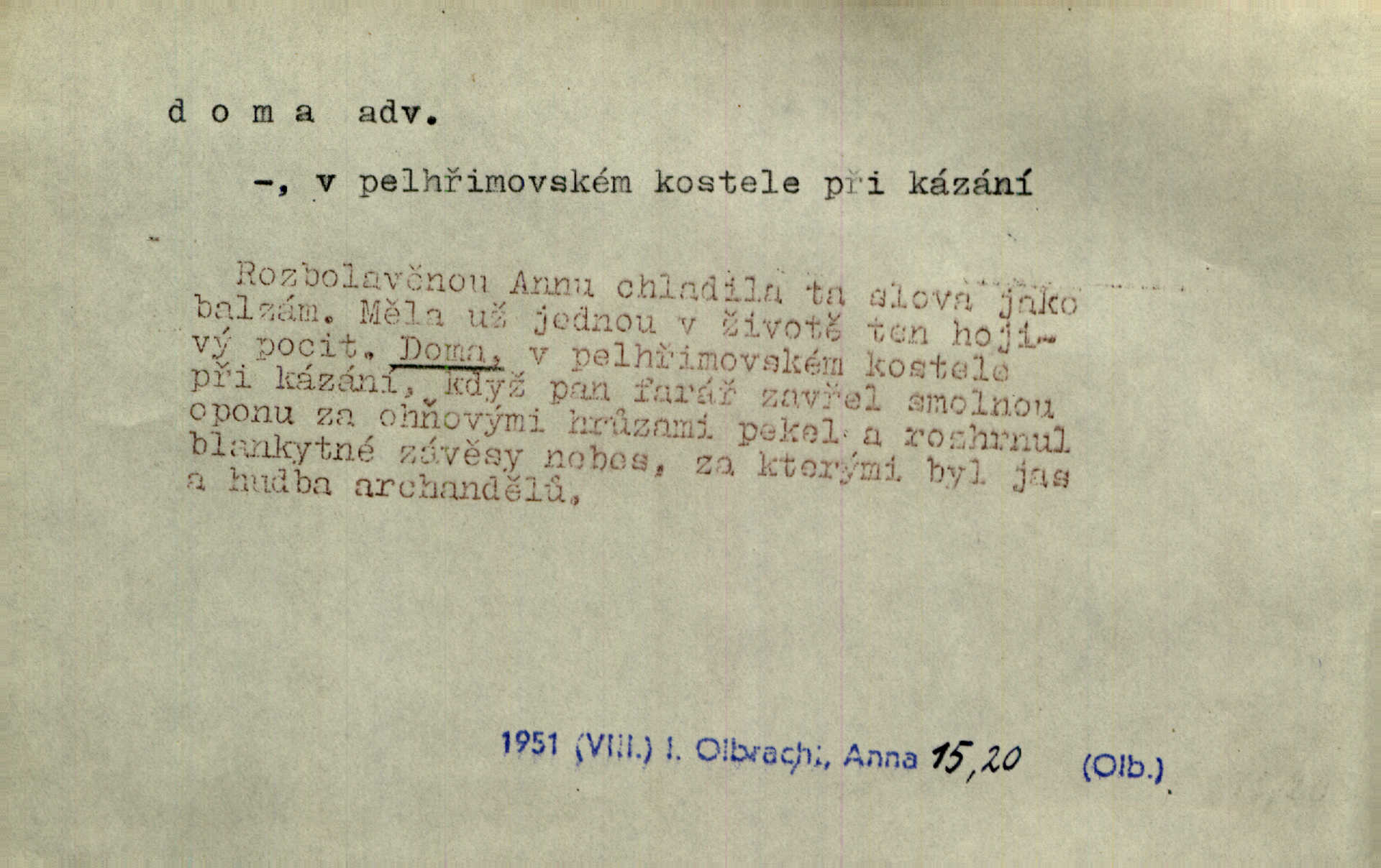 - doma adv. v místě svého trvalého pobytu (v svém bytě, domě, domácnosti, v obci pobytu a p.). Dříve se zpívalo doma i na polích. Jir. V té krajině byla již jako doma, to všechno znala. Jir. Jez doma, co máš, u lidí, co ti dají. Čel. Všude dobře, doma nejlépe. Přísl. [Zloděj] u Lišáků je jako doma často tam dochází. Jir. Každý mleč cítil se ve mlýně doma. Baar. Přen. Kde zněla harfa, doma byla ctnost, tál něhou drsný, bojechtivý jun vládla, sídlila. Vrch. D v své vlasti, v svém státě. Ještě bych nic neříkal, kdyby zůstal zde doma v Čechách; ale musit takhle hned zítra do Netálie! Pfleg. Ze skvostů našich bohatne jen cizina a doma zchudl i svou krví lid. Vlč. D býti doma v něčem vyznati se, rozuměti, pochopiti. Jak slyšela hostův hlas, byla doma. Her. Staruška cítila se jen tehdy doma v rozprávce, když mohla vykládat o lidech s korunkami ve znaku. Preis. I pramilione, vždyť je to Toník, no, nejsem já hned v hlavě doma? Rais. To měla hned na první pohled zjištěno, už věděla, „kde je doma“ na čem je. Hál. D doma neskl. subst. lid. (vlastní) byt, (vlastní) domácnost, domov. Tak, tady budeš teď mít doma! Rais. My tady dnes, tatínku, u vás zůstanem, o doma starost mít nemusíme. Rais. Šaty na doma pro domácí potřebu.