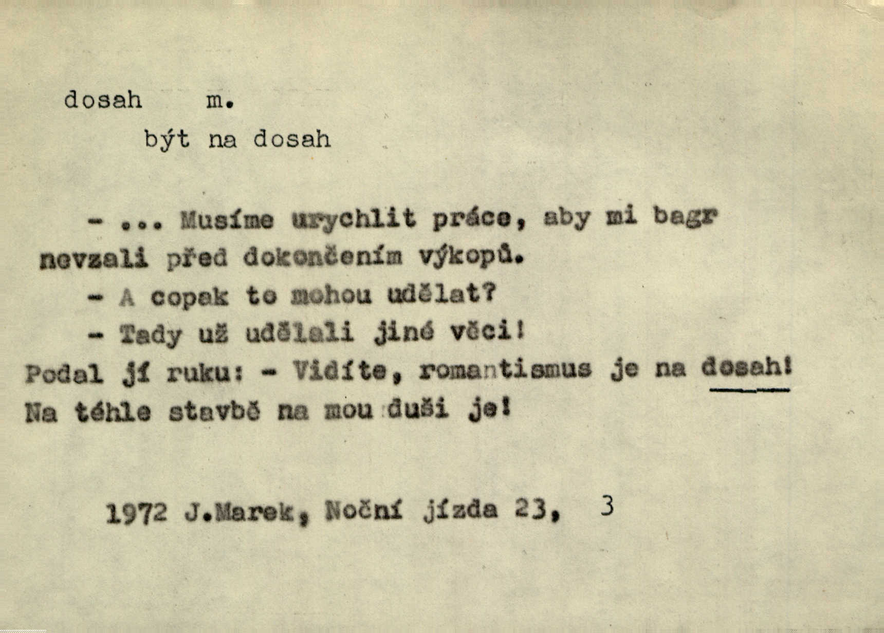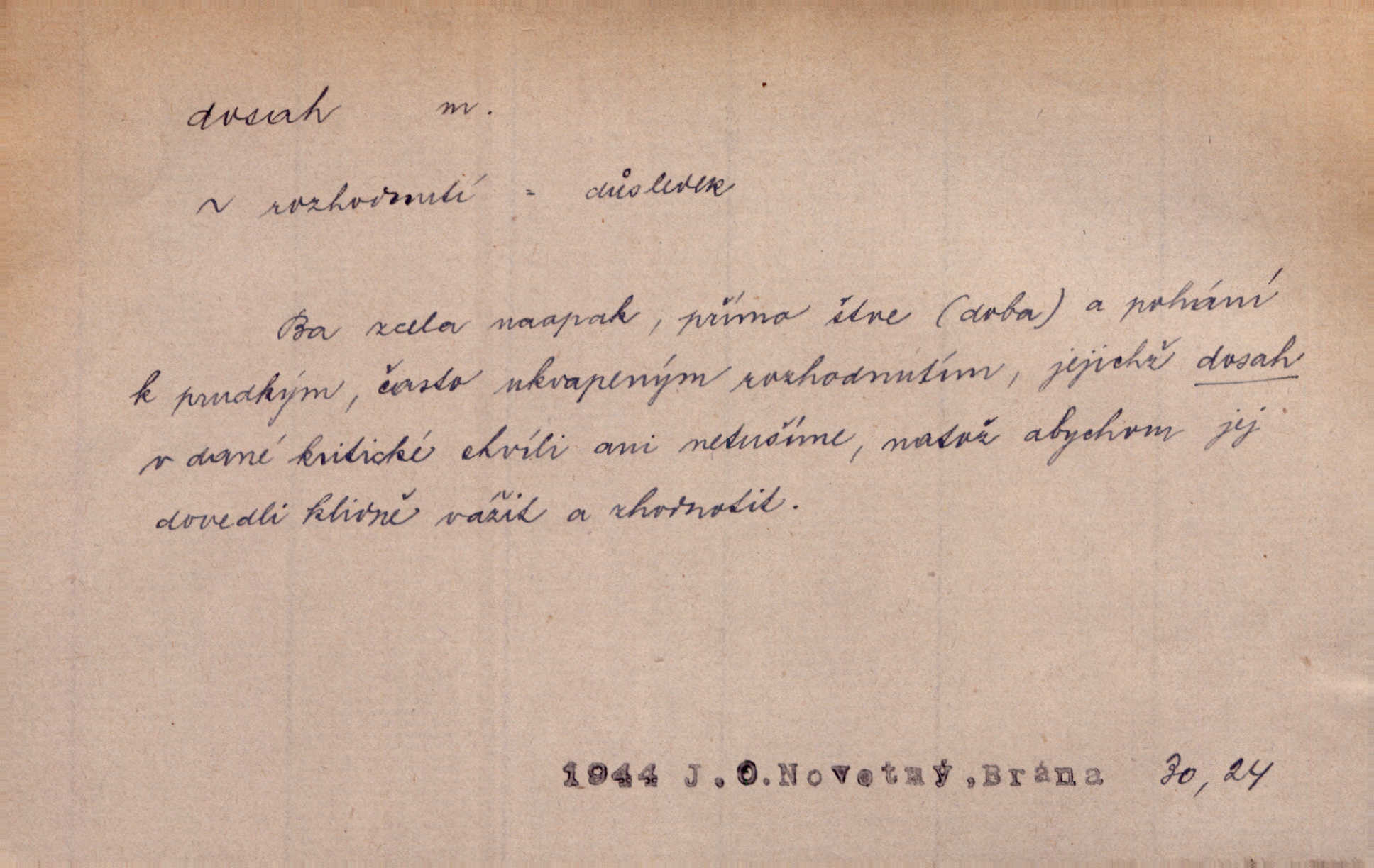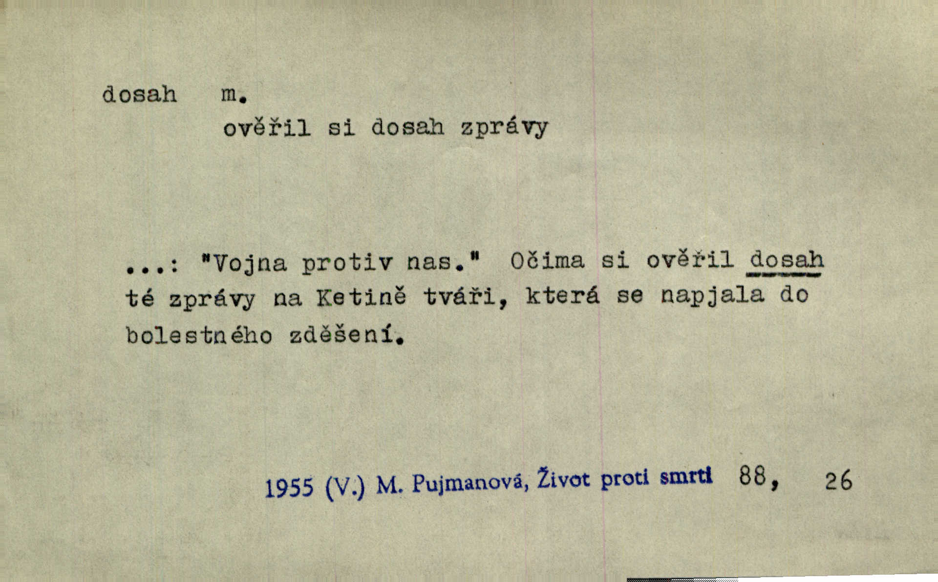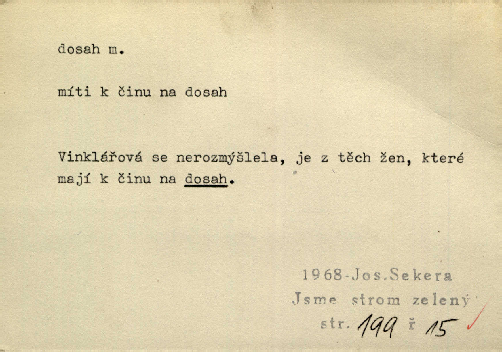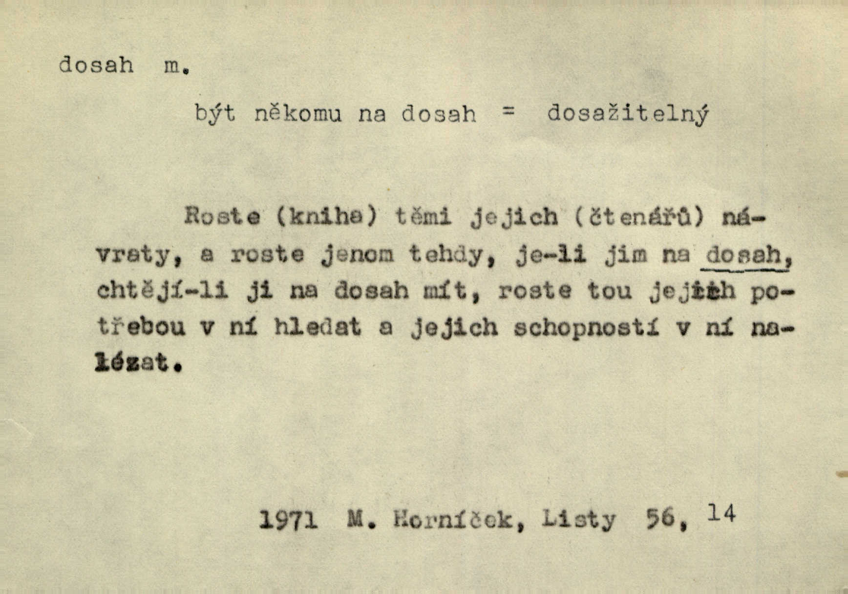- dosah, -u m. prostor, až kam se dosáhne rukama n. jinou věcí. Stárek byl se na dosah Dvořákův přiblížil. Nov. Couvala před jeho dravýma rukama navlas na dosah. Čap. Ch. Rozdával rány všem, kdo mu přišli na dosah. Theer. Nemohl ruce oddáliti z dosahu svištící hole. Svob. Špýchar vznícením se stáje ocitl se v povážlivém dosahu dravého živlu [ohně]. Vrba. Každá kniha, jež nám byla k dosahu, šla z ruky do ruky. Krás. D okruh, až kam sahá vliv, působnost něčeho; důležitost, váha, význam. Gallas ovšem užil této příležitosti, aby z dosahu moci Valdštejnovy navždy unikl. Pekárek. Naši solisté udělali, co vůbec je v lidských silách a v dosahu umělecké možnosti. Mach. Styděl jsem se přiznat, že nechápu dosahu jeho myšlének. Staš. Nepromyslil dosah potupy, která ho stihla. Vrba. Pronáší věty dosahu filosofického věty filosofické. Vrch. Tech. dosah světlometu, anteny, radiového přijimače.