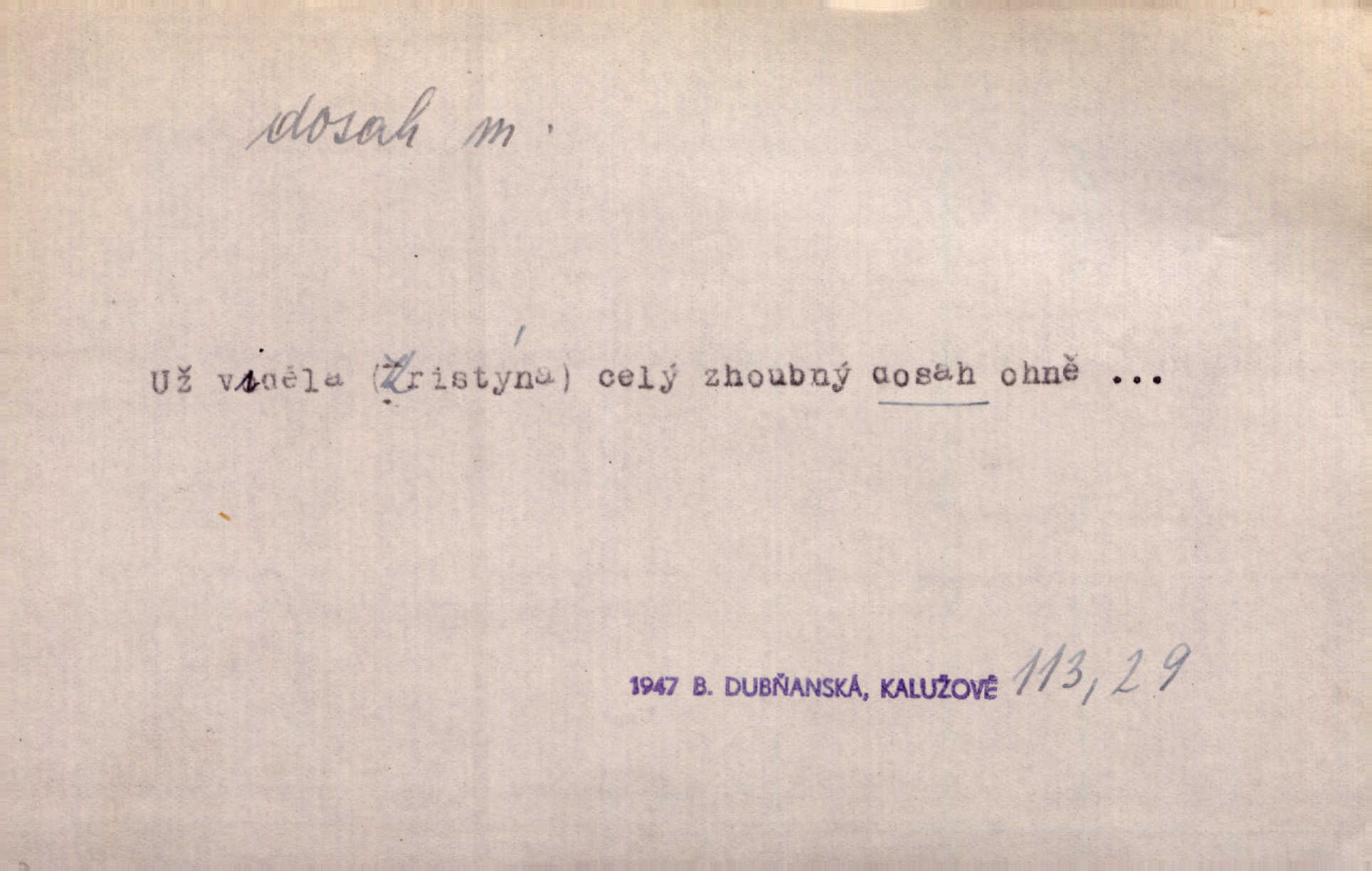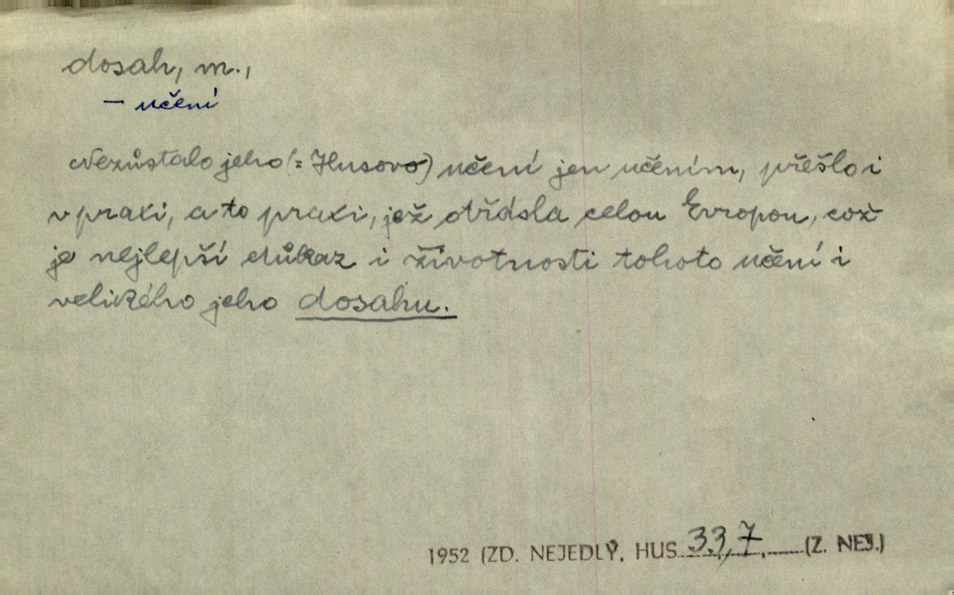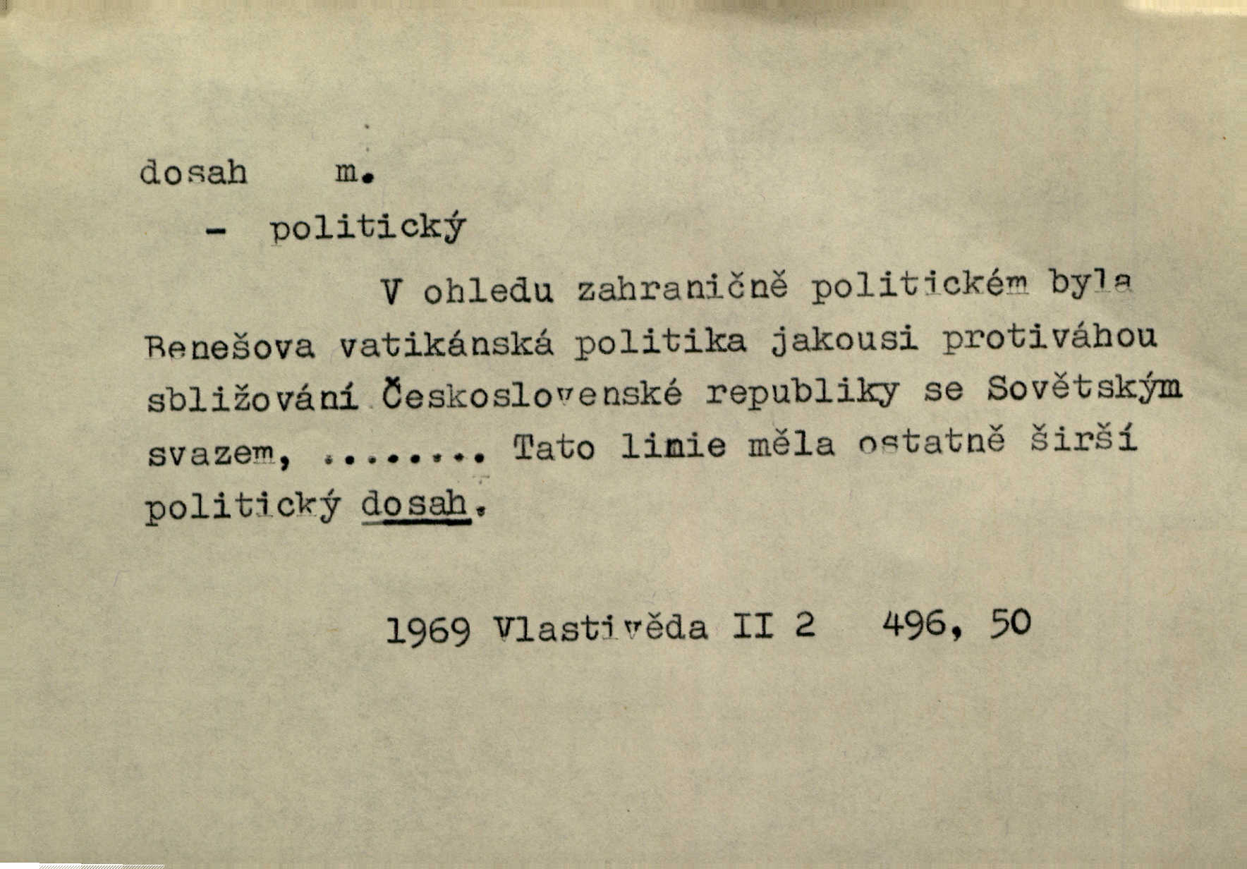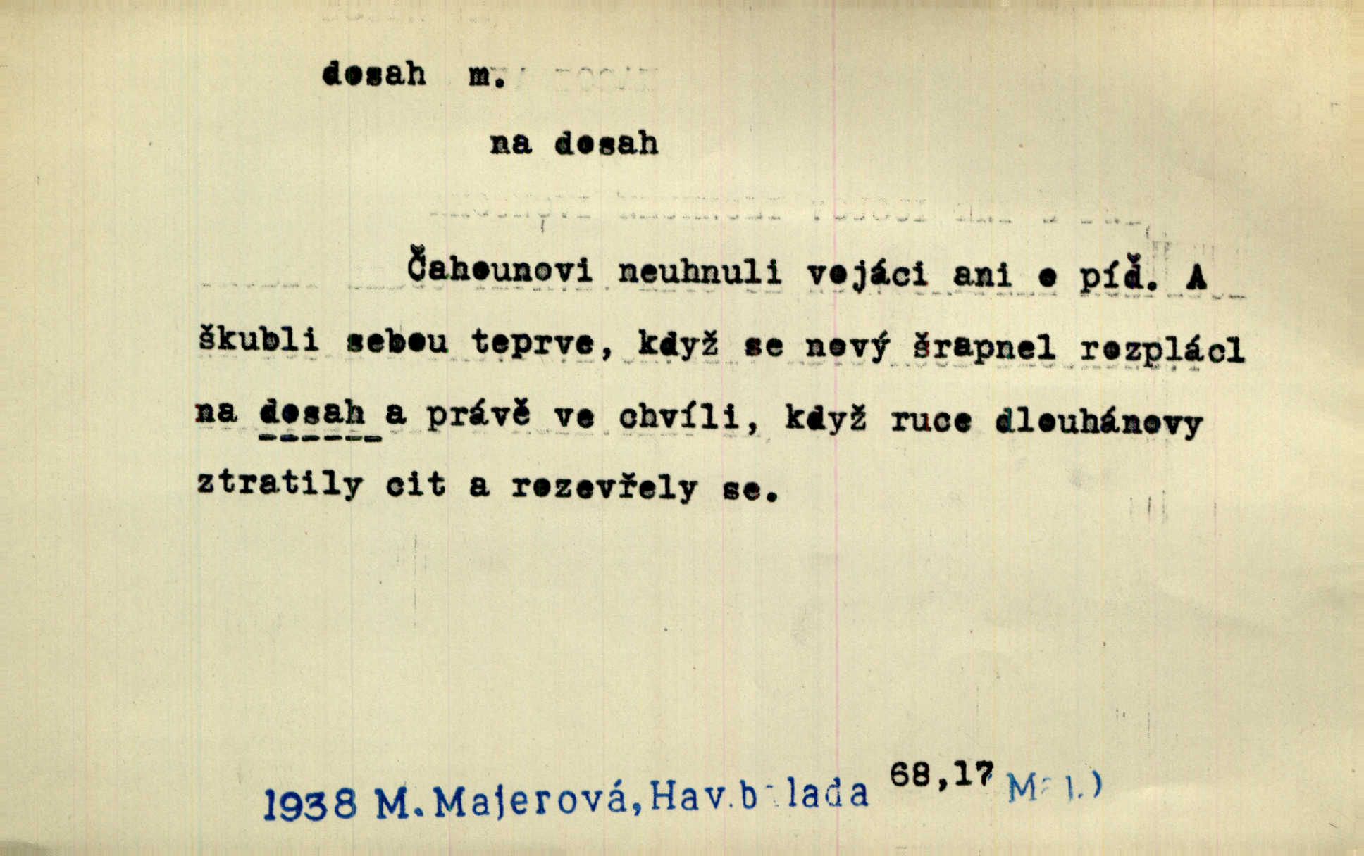 - dosah, -u m. prostor, až kam se dosáhne rukama n. jinou věcí. Stárek byl se na dosah Dvořákův přiblížil. Nov. Couvala před jeho dravýma rukama navlas na dosah. Čap. Ch. Rozdával rány všem, kdo mu přišli na dosah. Theer. Nemohl ruce oddáliti z dosahu svištící hole. Svob. Špýchar vznícením se stáje ocitl se v povážlivém dosahu dravého živlu [ohně]. Vrba. Každá kniha, jež nám byla k dosahu, šla z ruky do ruky. Krás. D okruh, až kam sahá vliv, působnost něčeho; důležitost, váha, význam. Gallas ovšem užil této příležitosti, aby z dosahu moci Valdštejnovy navždy unikl. Pekárek. Naši solisté udělali, co vůbec je v lidských silách a v dosahu umělecké možnosti. Mach. Styděl jsem se přiznat, že nechápu dosahu jeho myšlének. Staš. Nepromyslil dosah potupy, která ho stihla. Vrba. Pronáší věty dosahu filosofického věty filosofické. Vrch. Tech. dosah světlometu, anteny, radiového přijimače.