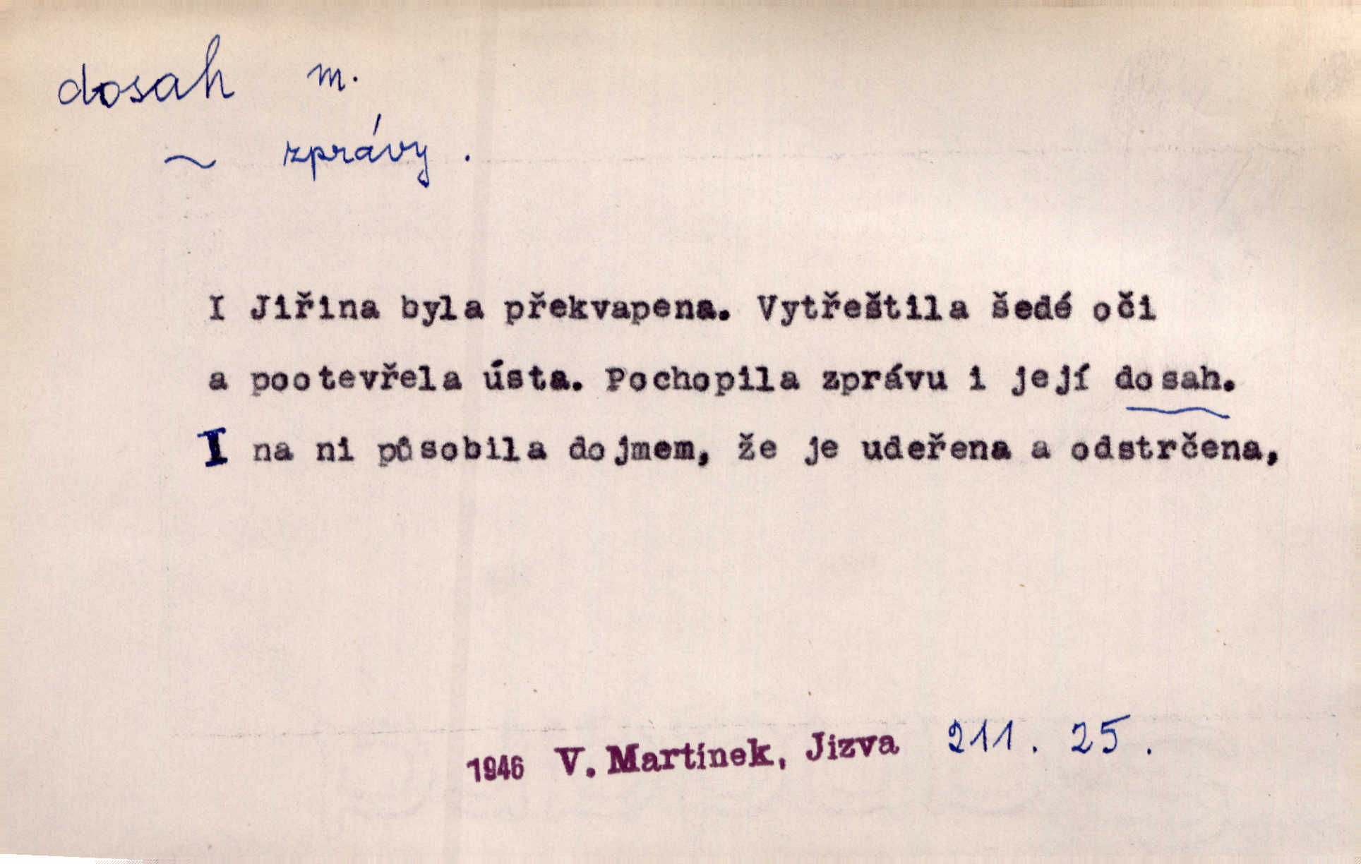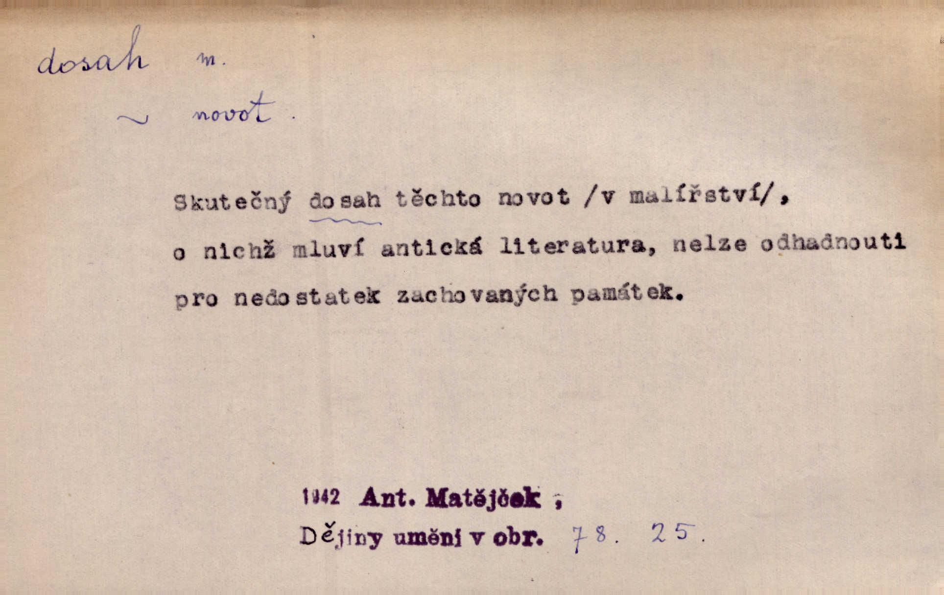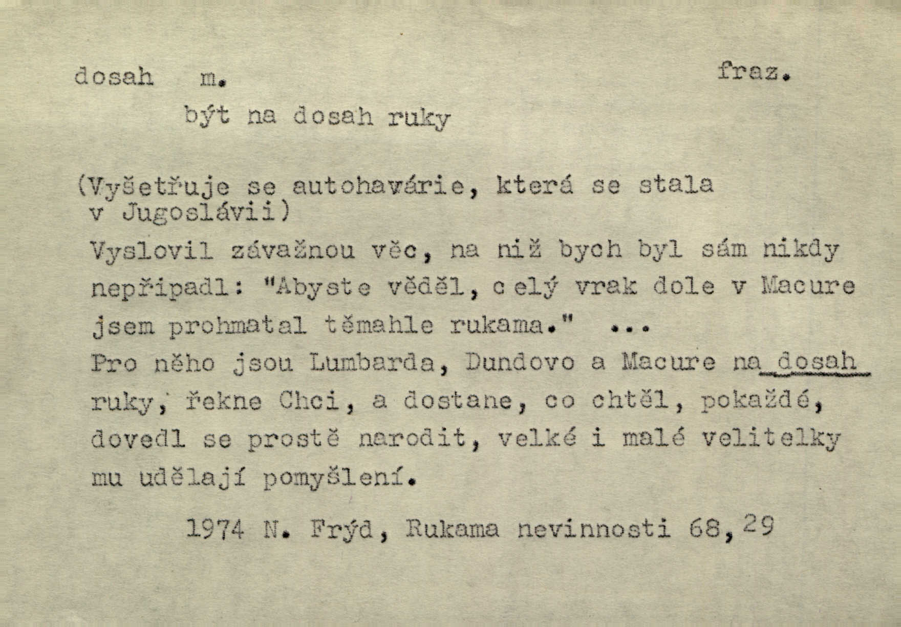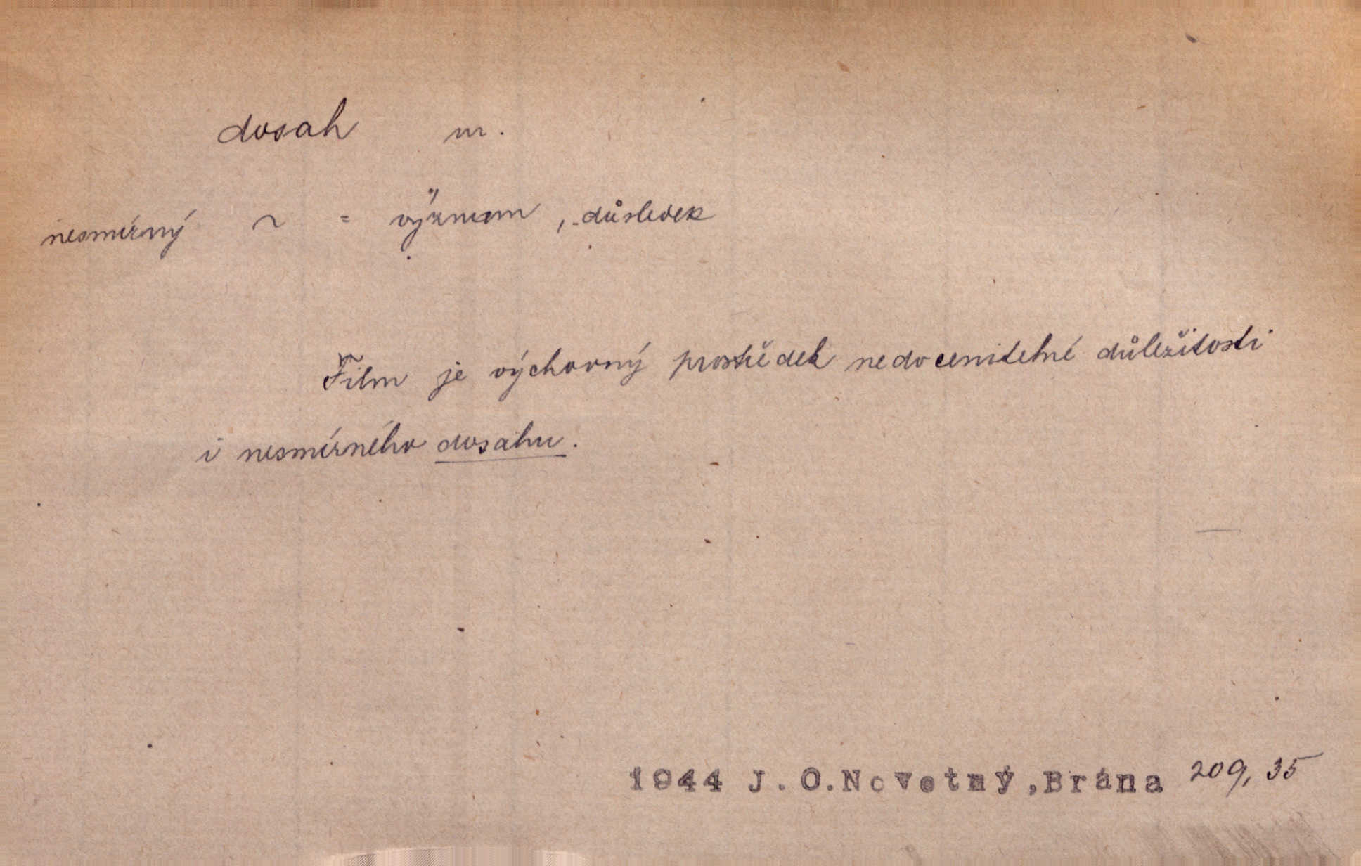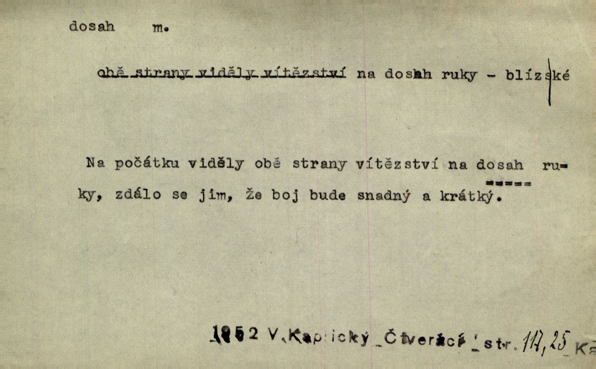 - dosah, -u m. prostor, až kam se dosáhne rukama n. jinou věcí. Stárek byl se na dosah Dvořákův přiblížil. Nov. Couvala před jeho dravýma rukama navlas na dosah. Čap. Ch. Rozdával rány všem, kdo mu přišli na dosah. Theer. Nemohl ruce oddáliti z dosahu svištící hole. Svob. Špýchar vznícením se stáje ocitl se v povážlivém dosahu dravého živlu [ohně]. Vrba. Každá kniha, jež nám byla k dosahu, šla z ruky do ruky. Krás. D okruh, až kam sahá vliv, působnost něčeho; důležitost, váha, význam. Gallas ovšem užil této příležitosti, aby z dosahu moci Valdštejnovy navždy unikl. Pekárek. Naši solisté udělali, co vůbec je v lidských silách a v dosahu umělecké možnosti. Mach. Styděl jsem se přiznat, že nechápu dosahu jeho myšlének. Staš. Nepromyslil dosah potupy, která ho stihla. Vrba. Pronáší věty dosahu filosofického věty filosofické. Vrch. Tech. dosah světlometu, anteny, radiového přijimače.