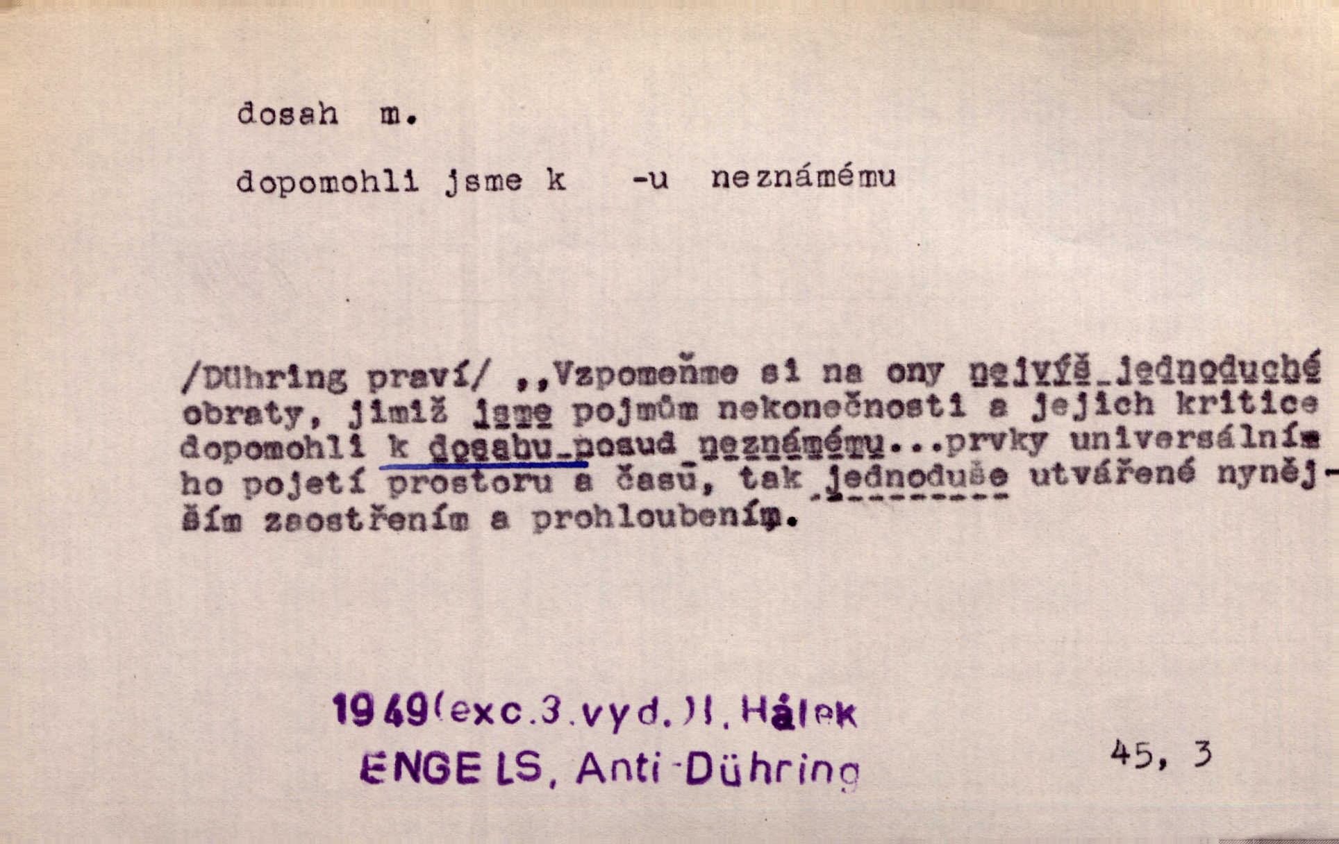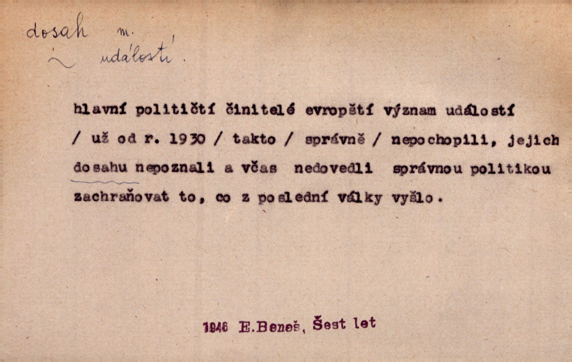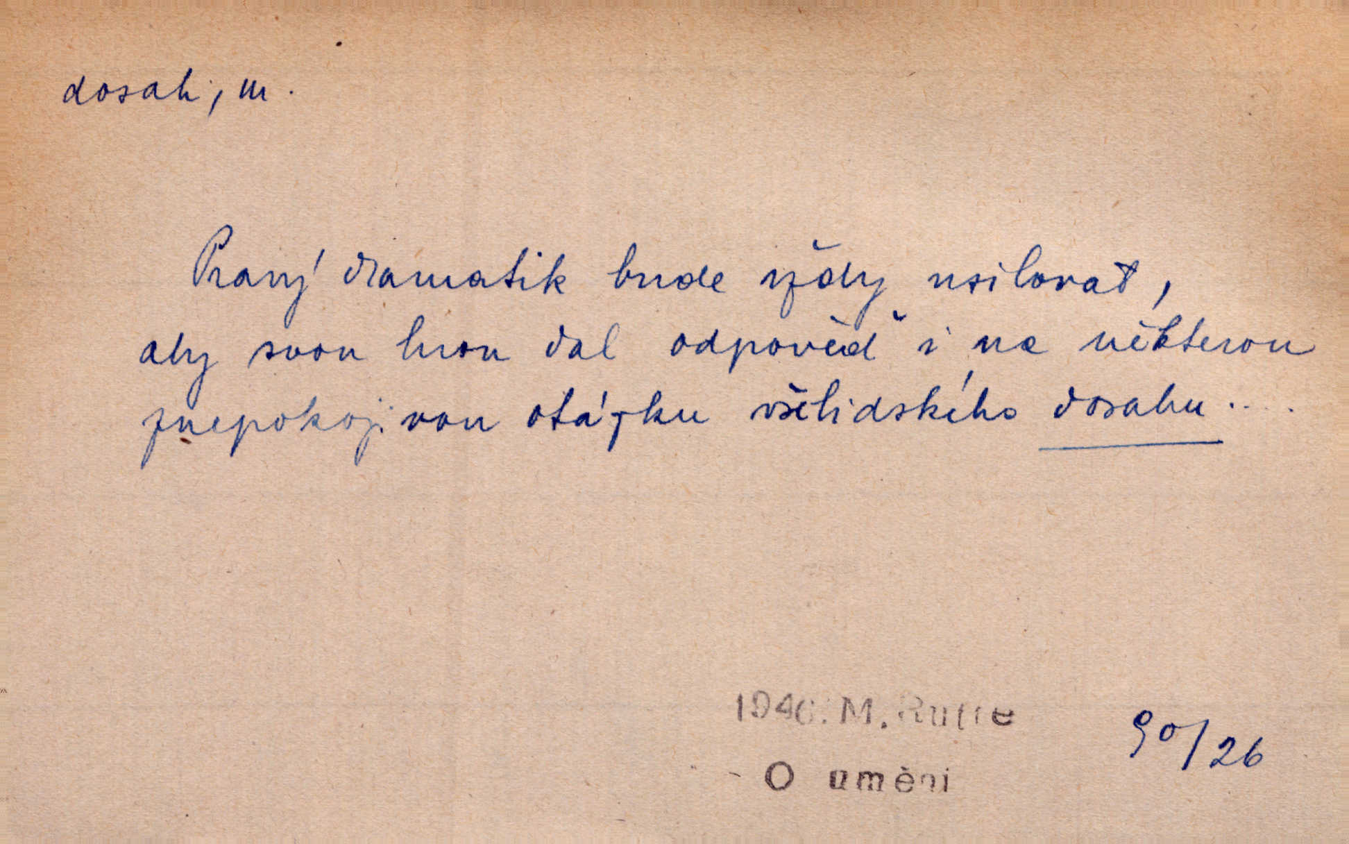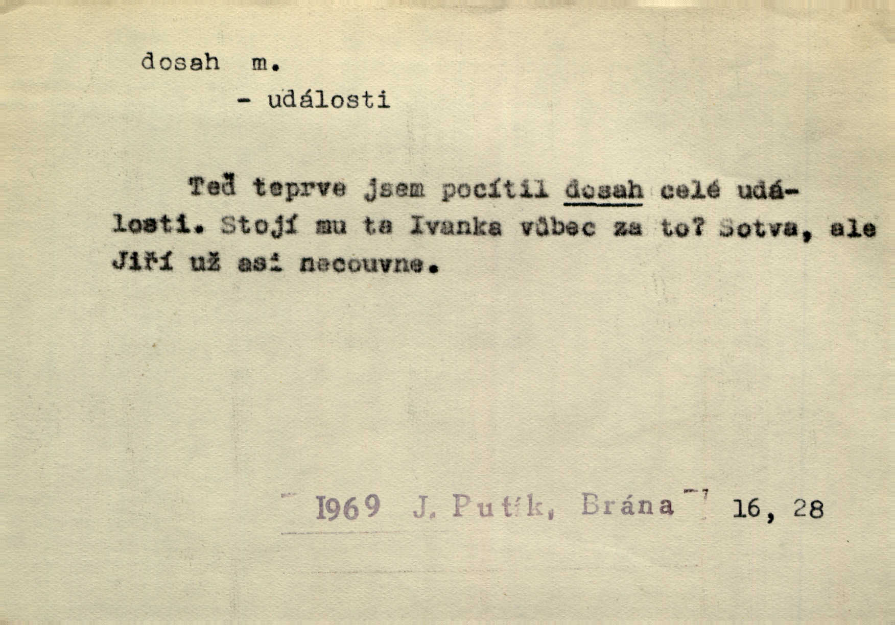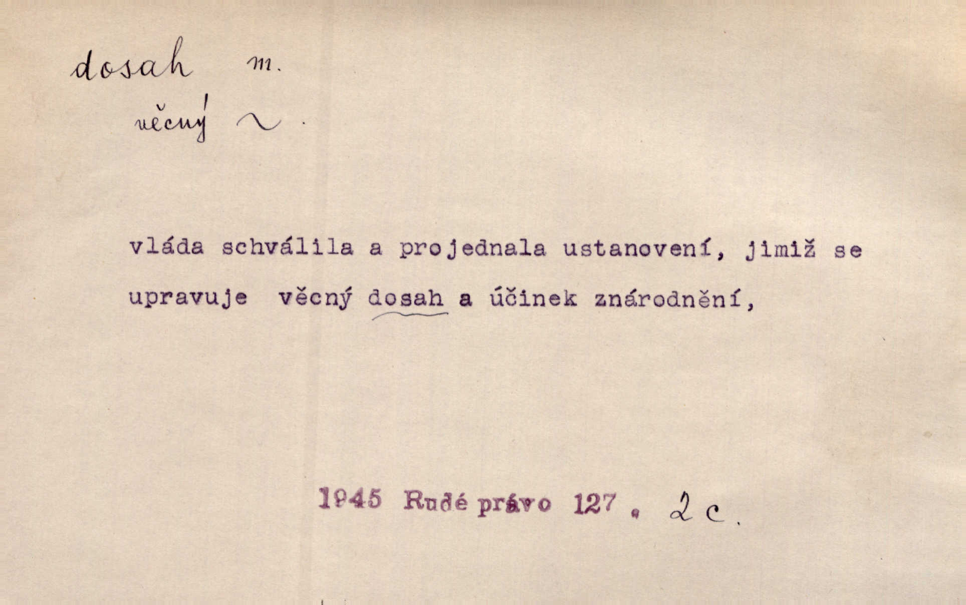 - dosah, -u m. prostor, až kam se dosáhne rukama n. jinou věcí. Stárek byl se na dosah Dvořákův přiblížil. Nov. Couvala před jeho dravýma rukama navlas na dosah. Čap. Ch. Rozdával rány všem, kdo mu přišli na dosah. Theer. Nemohl ruce oddáliti z dosahu svištící hole. Svob. Špýchar vznícením se stáje ocitl se v povážlivém dosahu dravého živlu [ohně]. Vrba. Každá kniha, jež nám byla k dosahu, šla z ruky do ruky. Krás. D okruh, až kam sahá vliv, působnost něčeho; důležitost, váha, význam. Gallas ovšem užil této příležitosti, aby z dosahu moci Valdštejnovy navždy unikl. Pekárek. Naši solisté udělali, co vůbec je v lidských silách a v dosahu umělecké možnosti. Mach. Styděl jsem se přiznat, že nechápu dosahu jeho myšlének. Staš. Nepromyslil dosah potupy, která ho stihla. Vrba. Pronáší věty dosahu filosofického věty filosofické. Vrch. Tech. dosah světlometu, anteny, radiového přijimače.