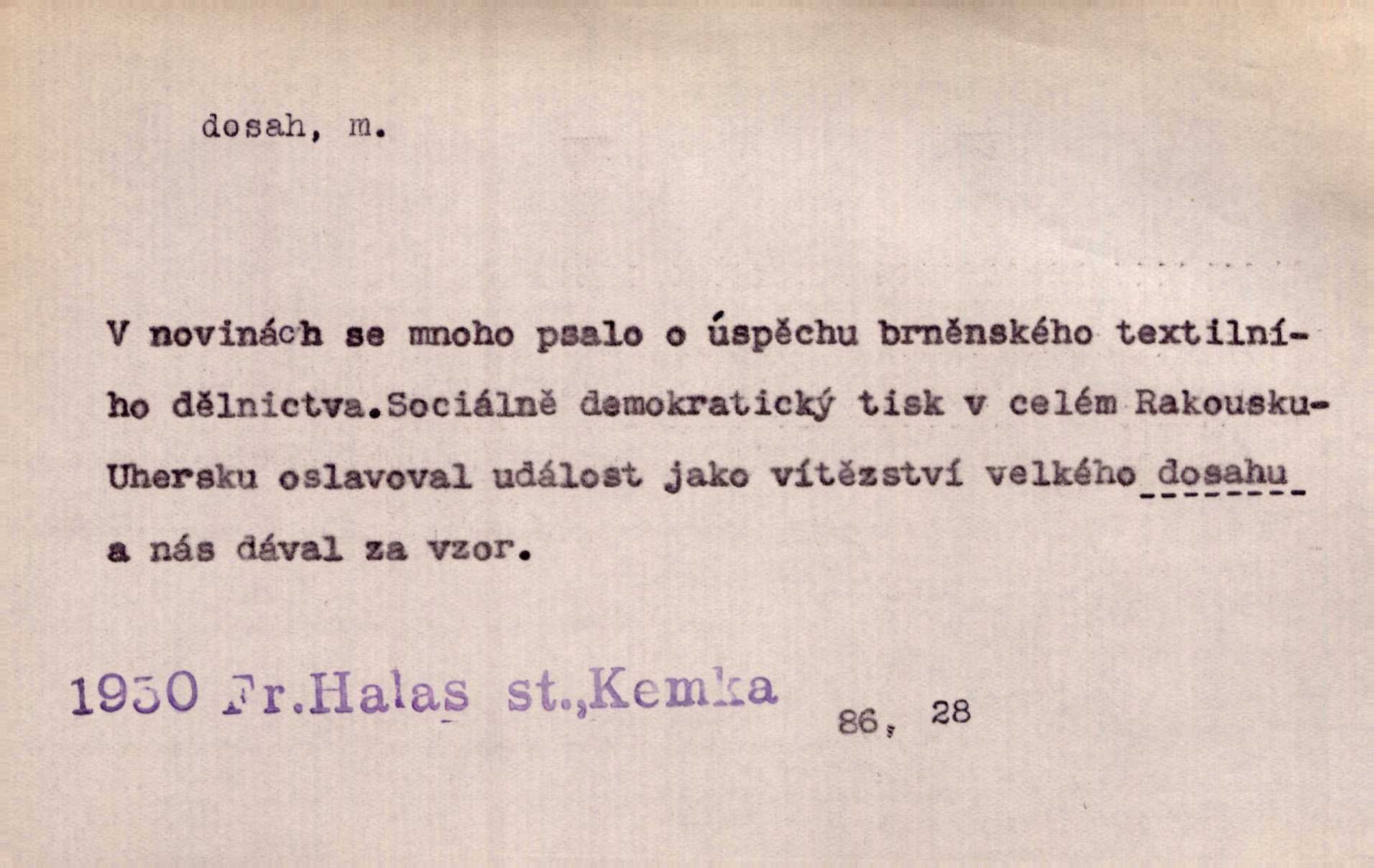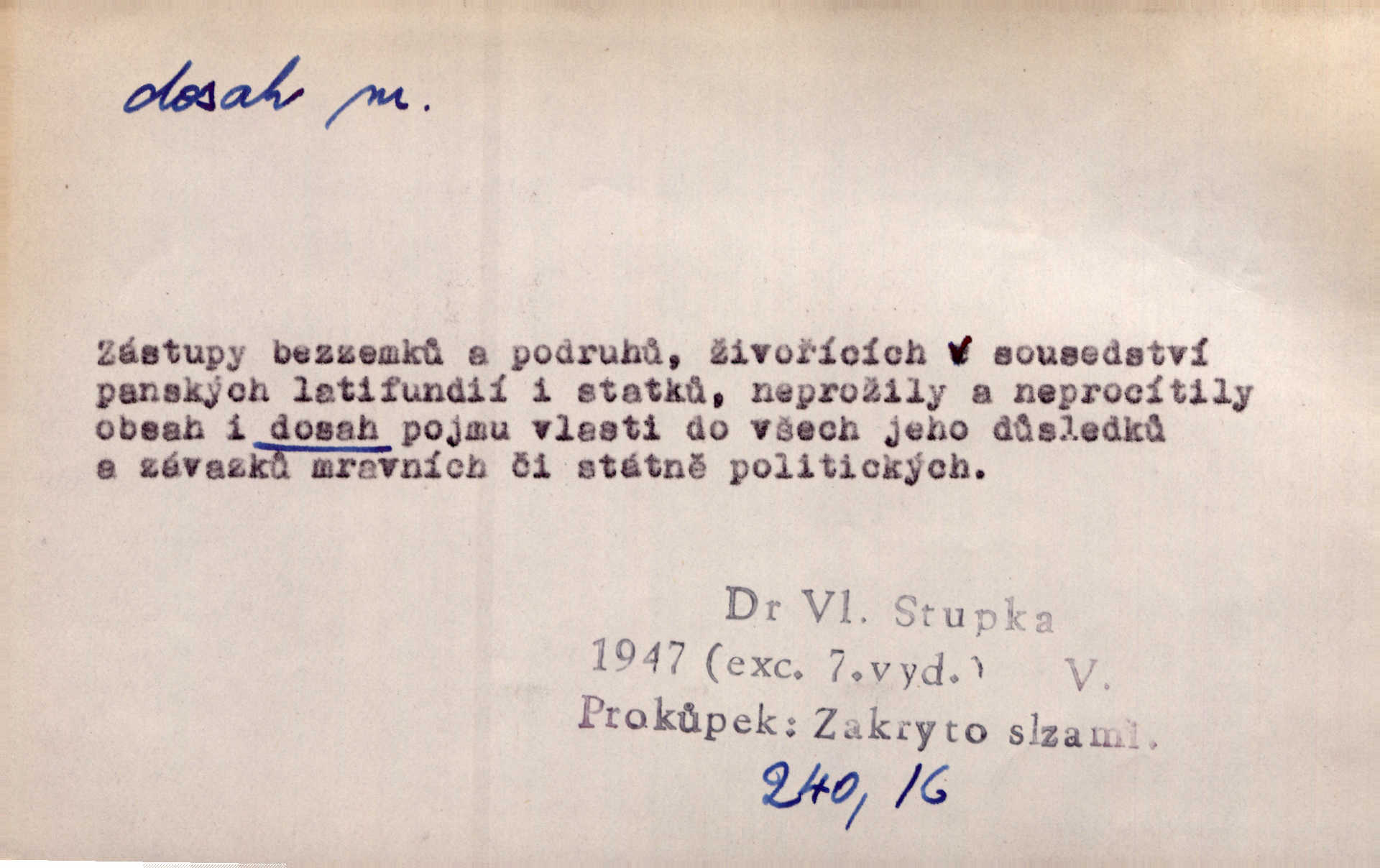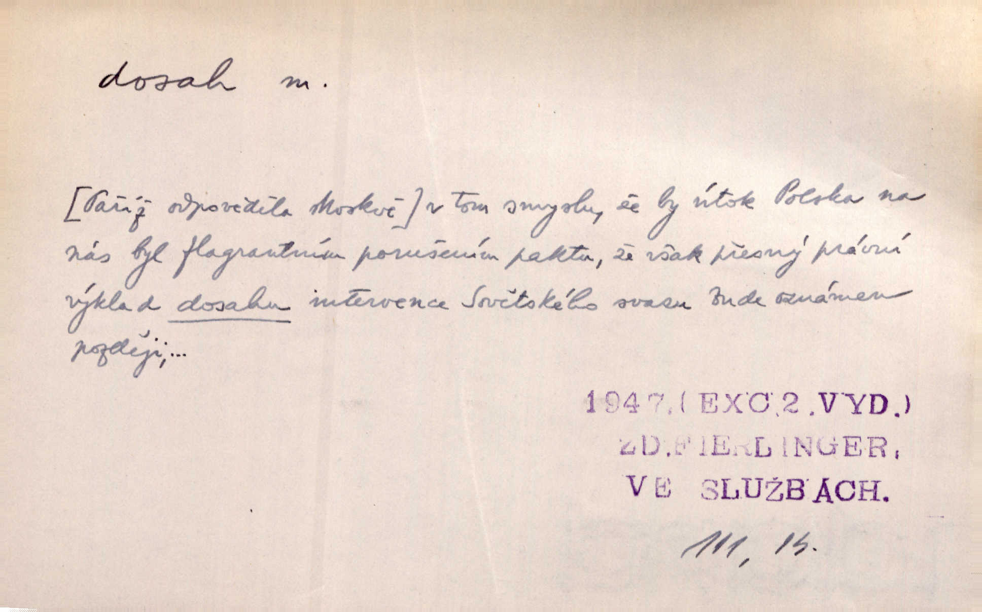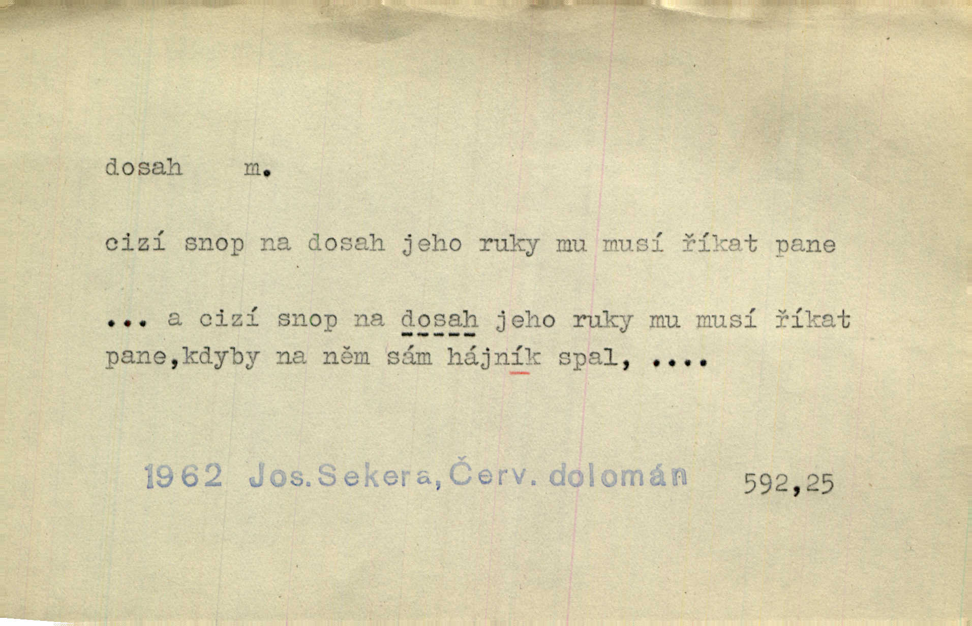 - dosah, -u m. prostor, až kam se dosáhne rukama n. jinou věcí. Stárek byl se na dosah Dvořákův přiblížil. Nov. Couvala před jeho dravýma rukama navlas na dosah. Čap. Ch. Rozdával rány všem, kdo mu přišli na dosah. Theer. Nemohl ruce oddáliti z dosahu svištící hole. Svob. Špýchar vznícením se stáje ocitl se v povážlivém dosahu dravého živlu [ohně]. Vrba. Každá kniha, jež nám byla k dosahu, šla z ruky do ruky. Krás. D okruh, až kam sahá vliv, působnost něčeho; důležitost, váha, význam. Gallas ovšem užil této příležitosti, aby z dosahu moci Valdštejnovy navždy unikl. Pekárek. Naši solisté udělali, co vůbec je v lidských silách a v dosahu umělecké možnosti. Mach. Styděl jsem se přiznat, že nechápu dosahu jeho myšlének. Staš. Nepromyslil dosah potupy, která ho stihla. Vrba. Pronáší věty dosahu filosofického věty filosofické. Vrch. Tech. dosah světlometu, anteny, radiového přijimače.
