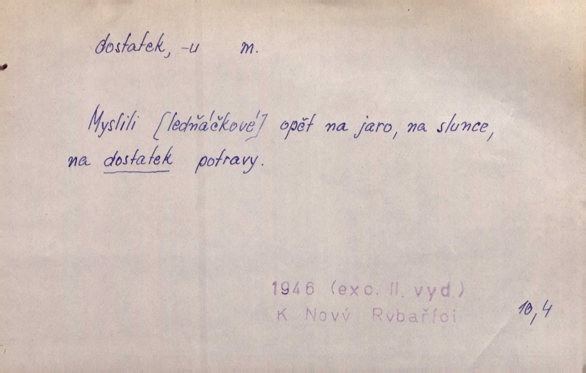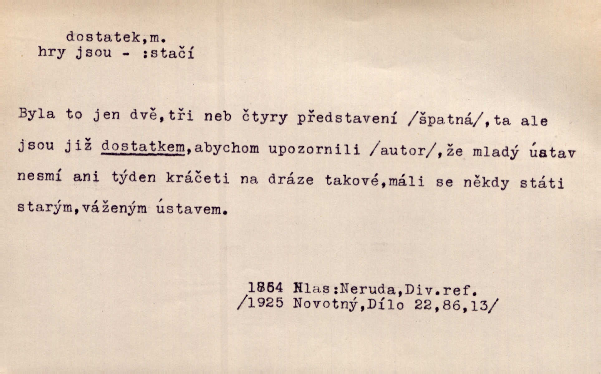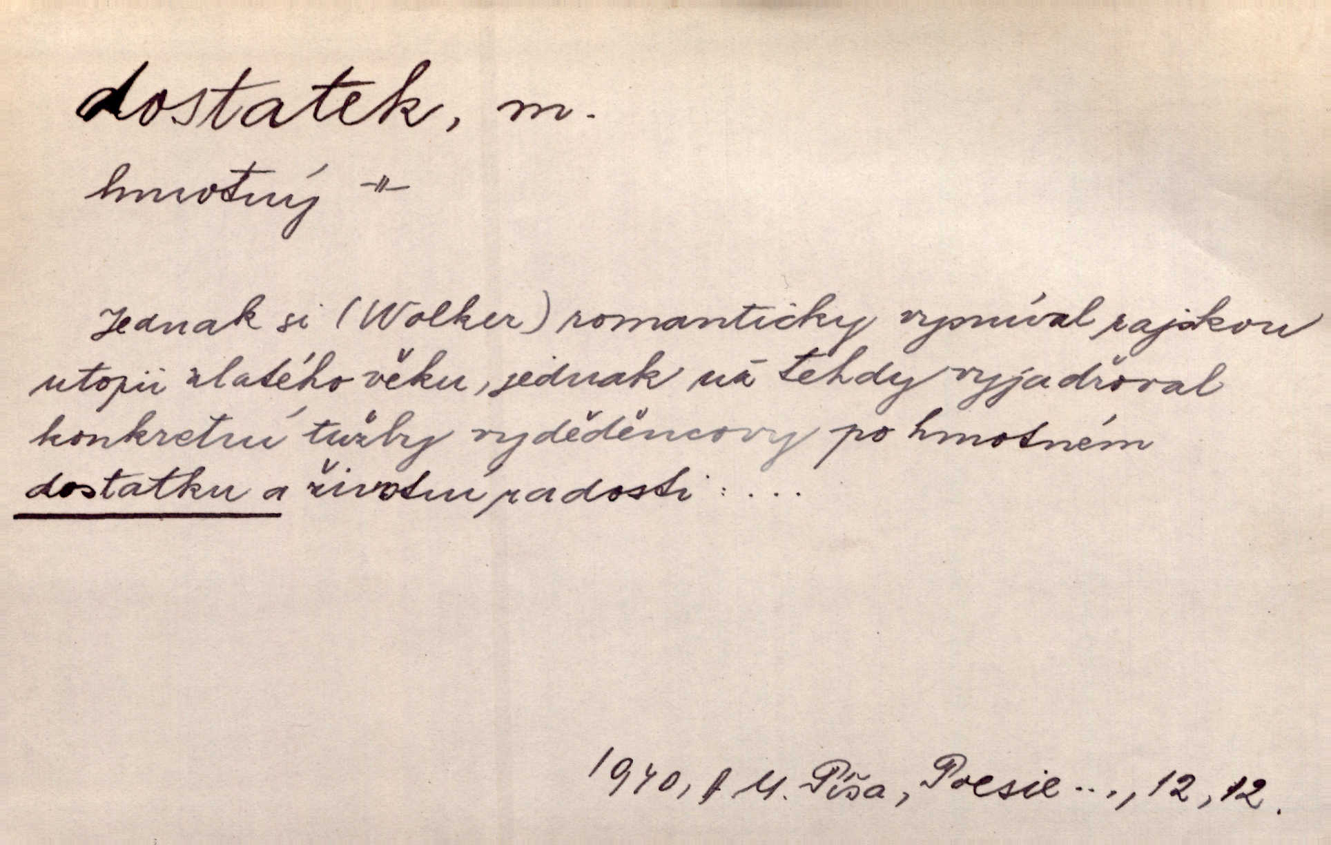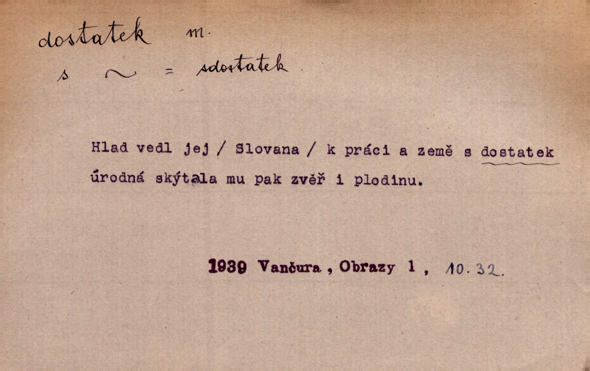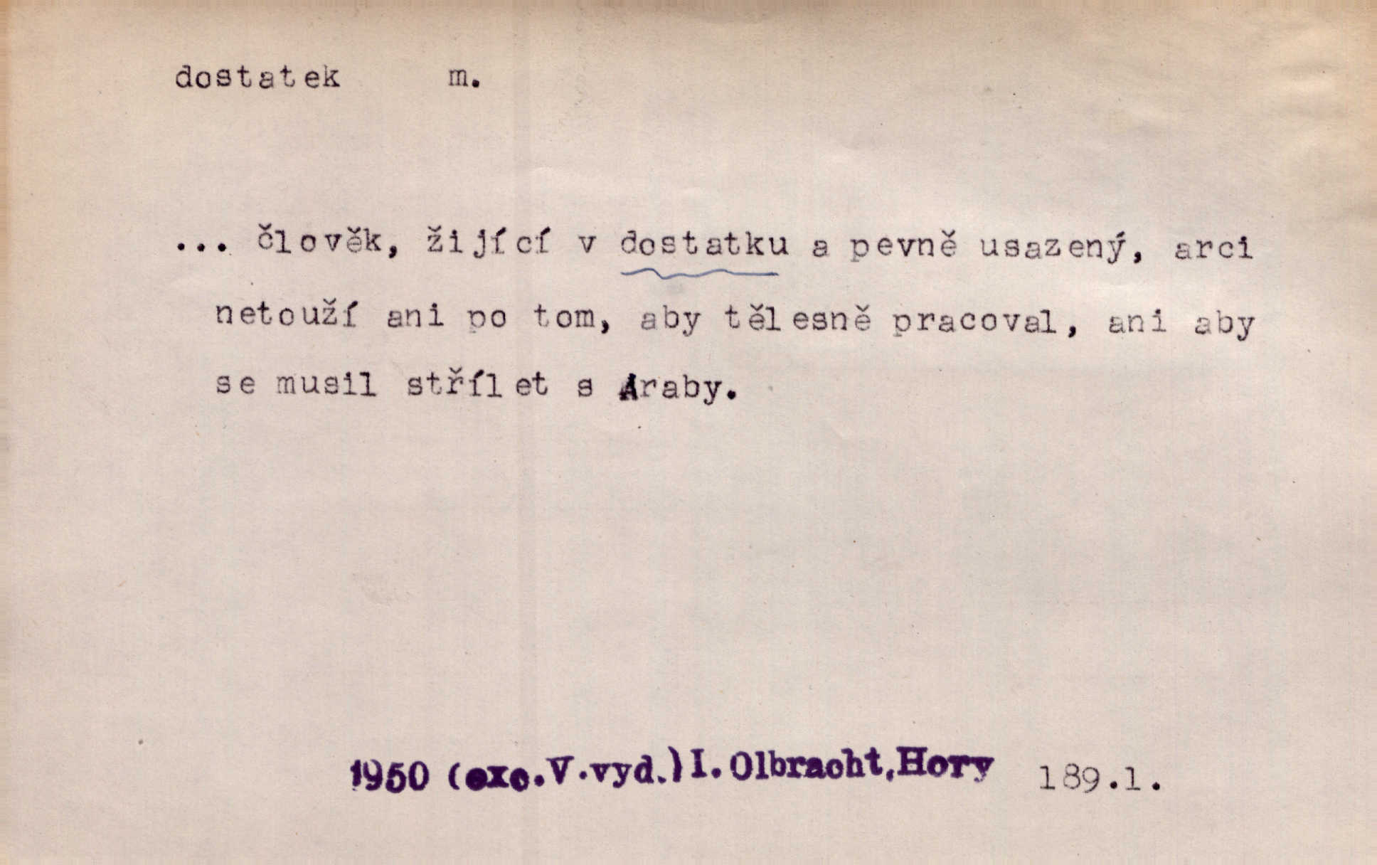 - dostatek, -tku m. vyhovující, uspokojivé množství, postačující počet. Měl jsem dostatek času. Arb. Posud měl obchod málo pomůcek, železnice žádné, silnic také ne všude dostatek. Ner. D s dostatek, dostatek adv. v dostatečném množství, dostatečně. Ovoce jsme požívali s dostatek po celou noc. Čech. Povaha jazyka svanetského není ještě s dostatek objasněna. Čech. Zprávami a zkušenostmi jsem vlastně poučen dostatek. Naše d. Odvahy bylo u Vojt. Nejedlého i u Šeb. Hněvkovského zajisté dostatek. Vrch. Nálada dostatek připravená. Šlej. D postačující množství životních potřeb. Ačkoliv pocházel ze statku, přece za mládí svého málo zvěděl o dostatku. Kos. Všude jevil se dostatek, ba blahobyt. Jir.