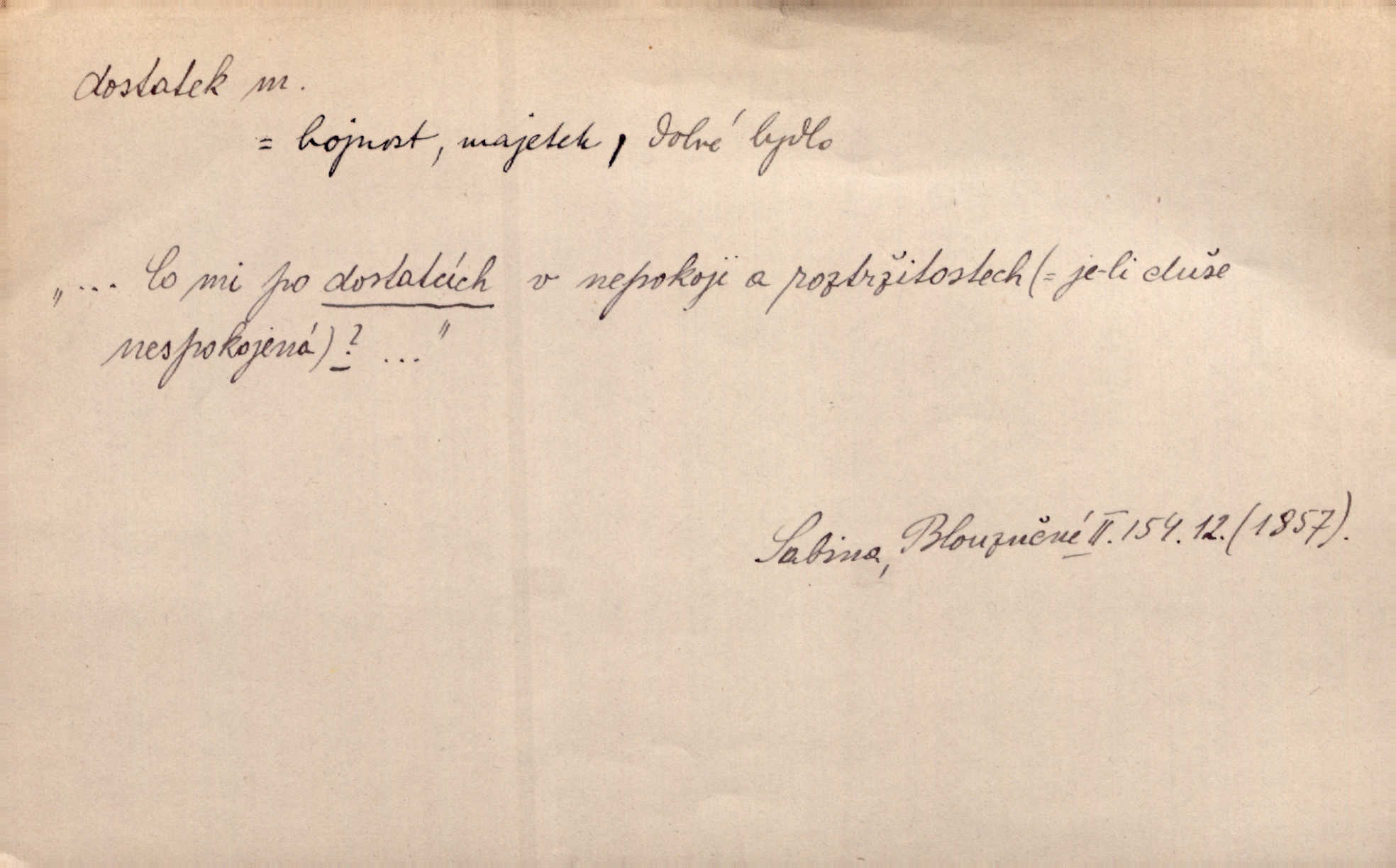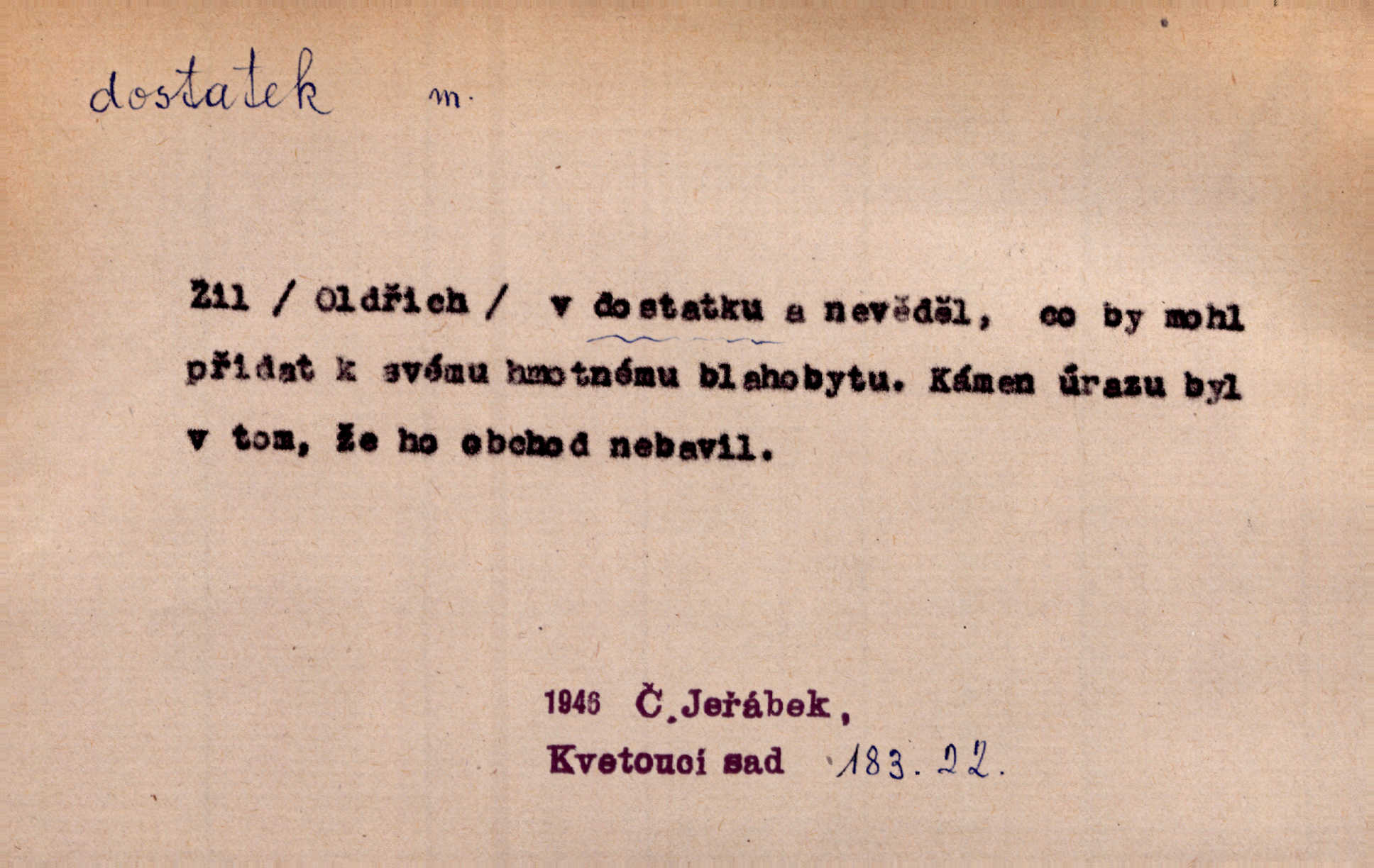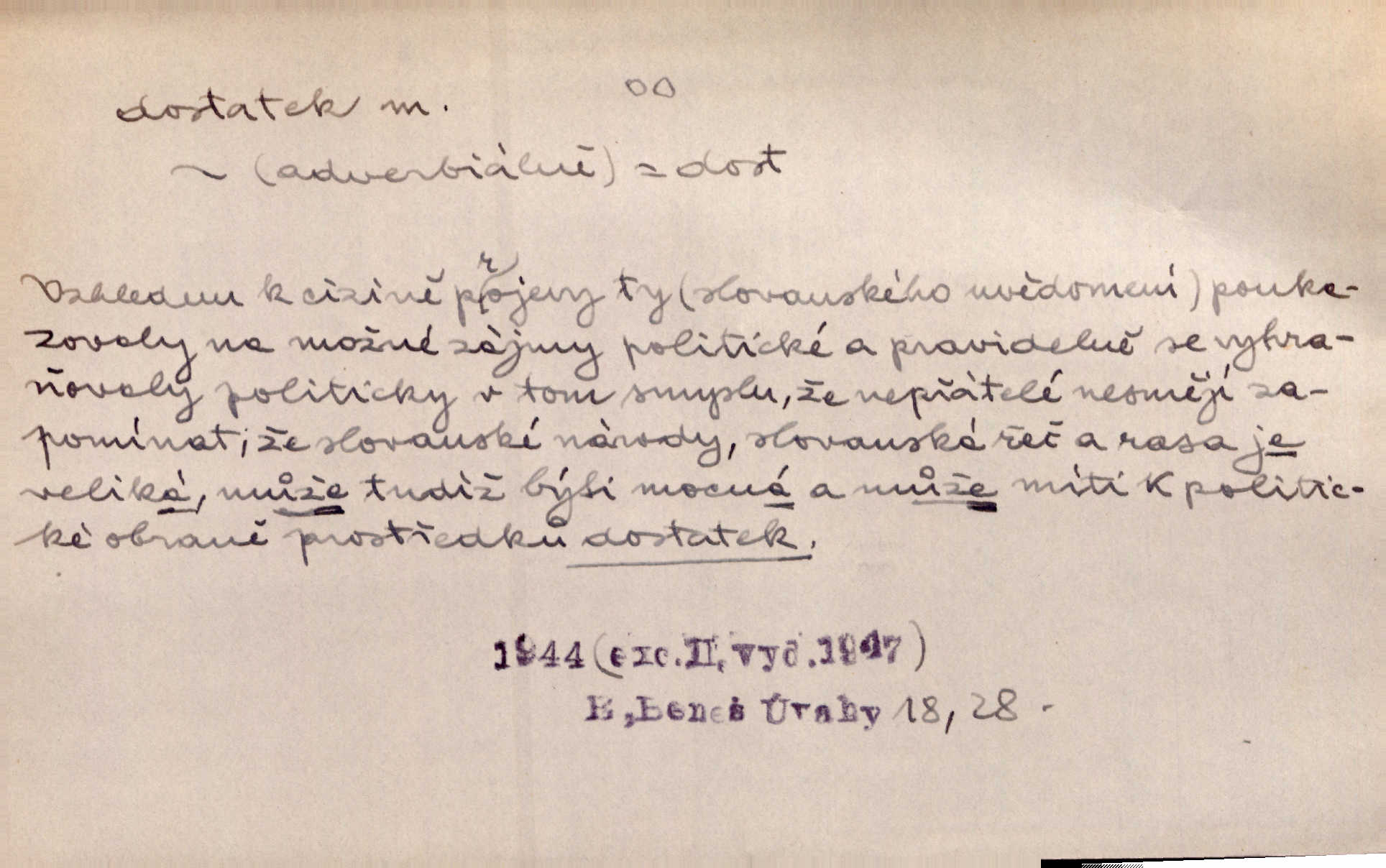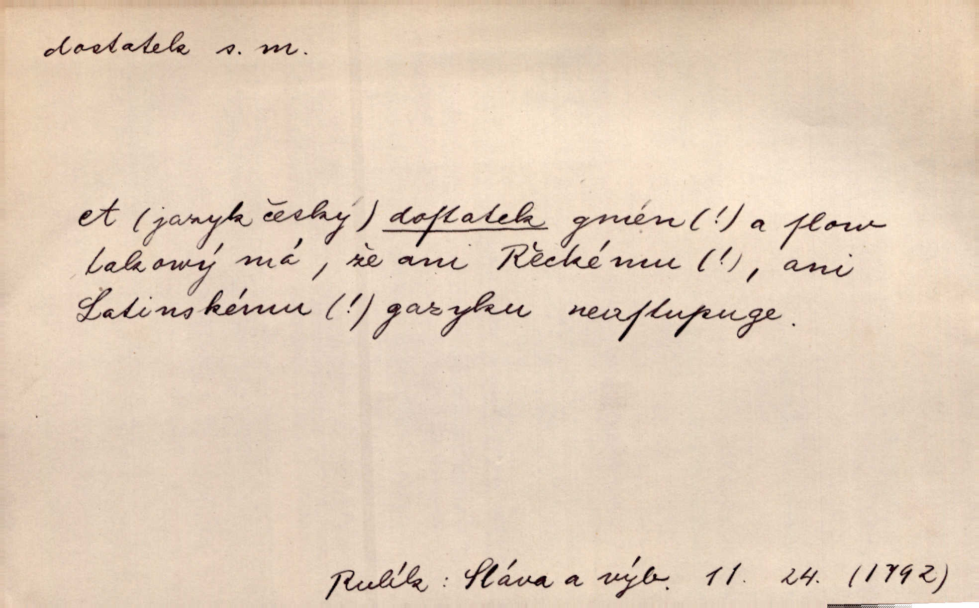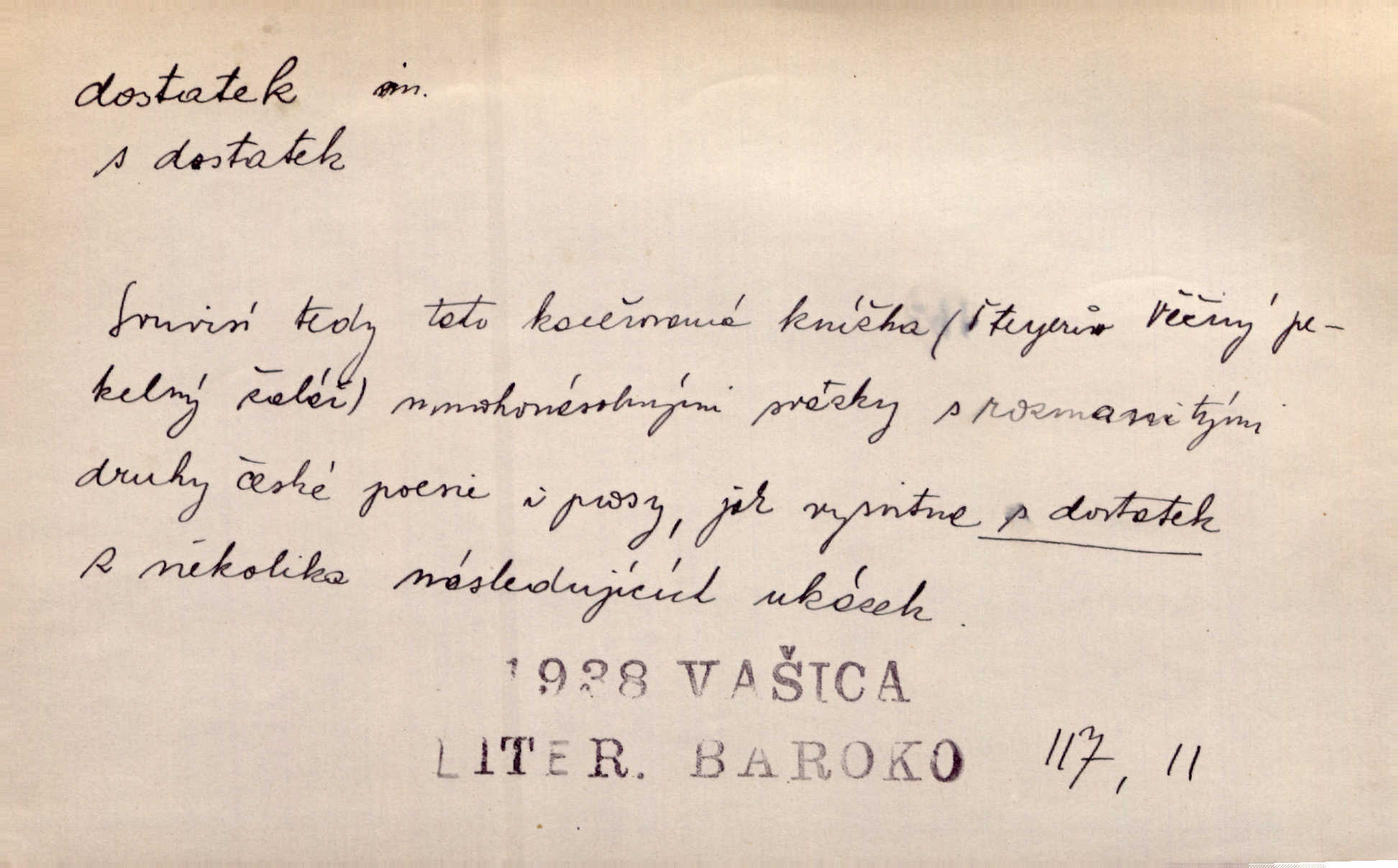 - dostatek, -tku m. vyhovující, uspokojivé množství, postačující počet. Měl jsem dostatek času. Arb. Posud měl obchod málo pomůcek, železnice žádné, silnic také ne všude dostatek. Ner. D s dostatek, dostatek adv. v dostatečném množství, dostatečně. Ovoce jsme požívali s dostatek po celou noc. Čech. Povaha jazyka svanetského není ještě s dostatek objasněna. Čech. Zprávami a zkušenostmi jsem vlastně poučen dostatek. Naše d. Odvahy bylo u Vojt. Nejedlého i u Šeb. Hněvkovského zajisté dostatek. Vrch. Nálada dostatek připravená. Šlej. D postačující množství životních potřeb. Ačkoliv pocházel ze statku, přece za mládí svého málo zvěděl o dostatku. Kos. Všude jevil se dostatek, ba blahobyt. Jir.