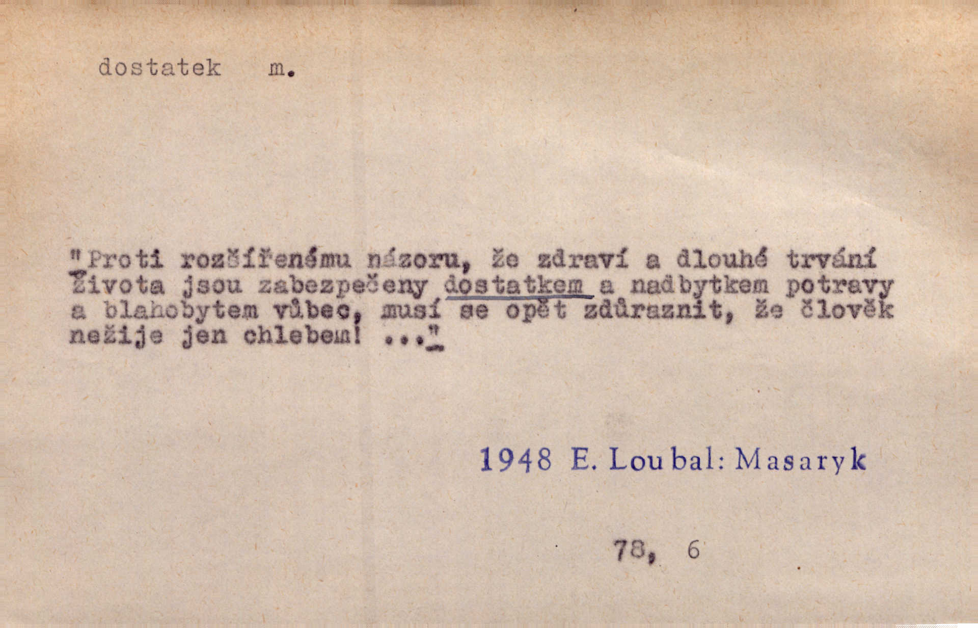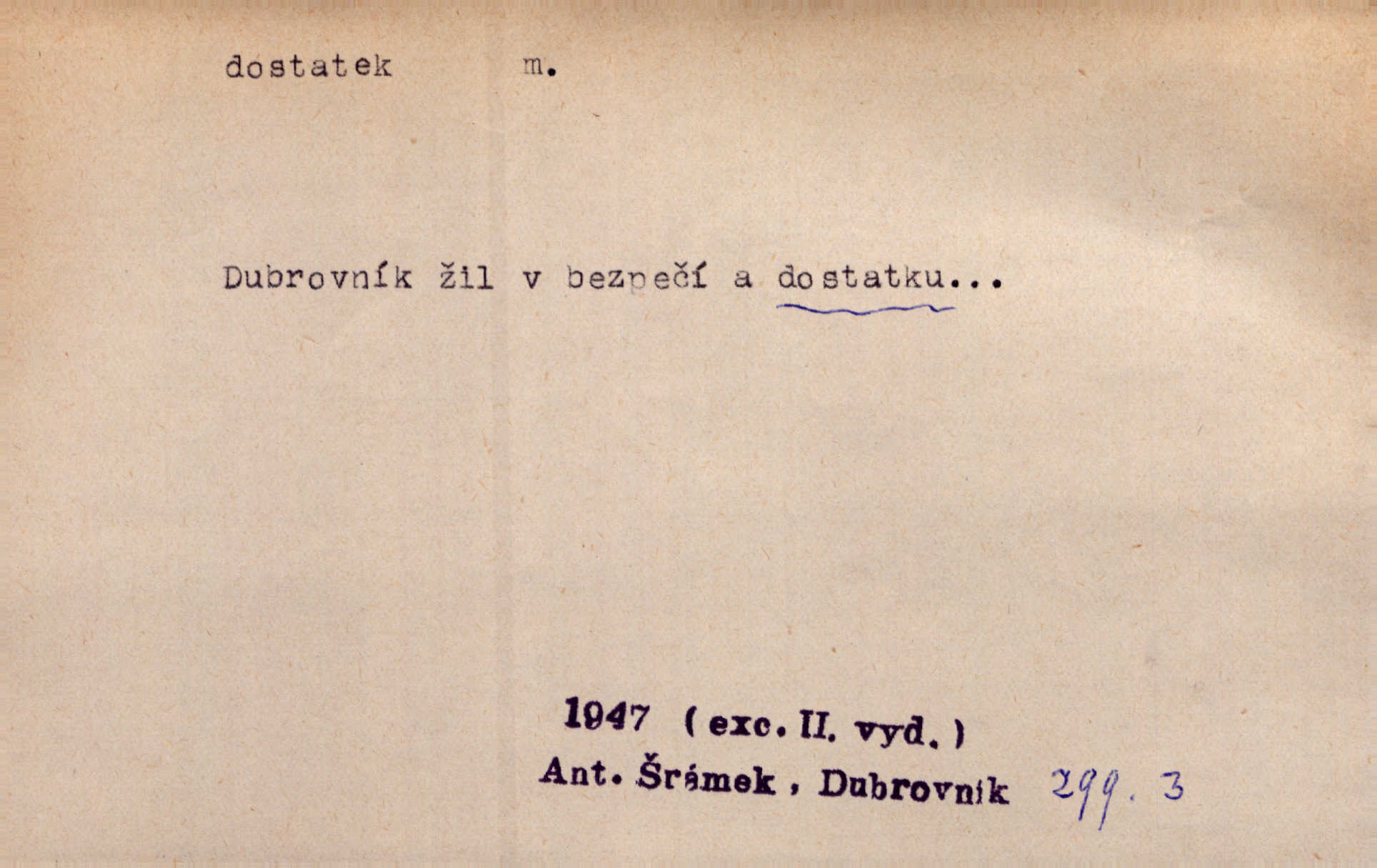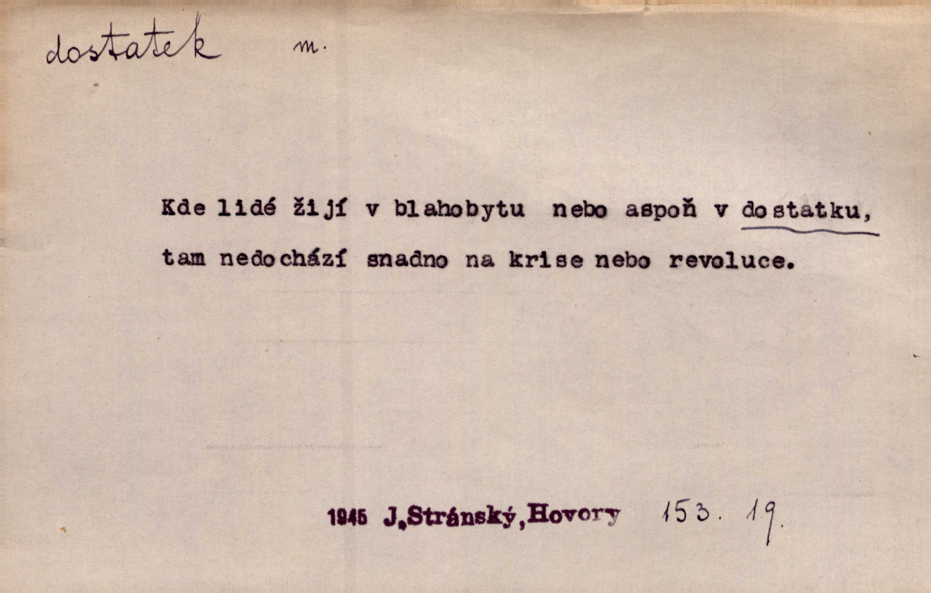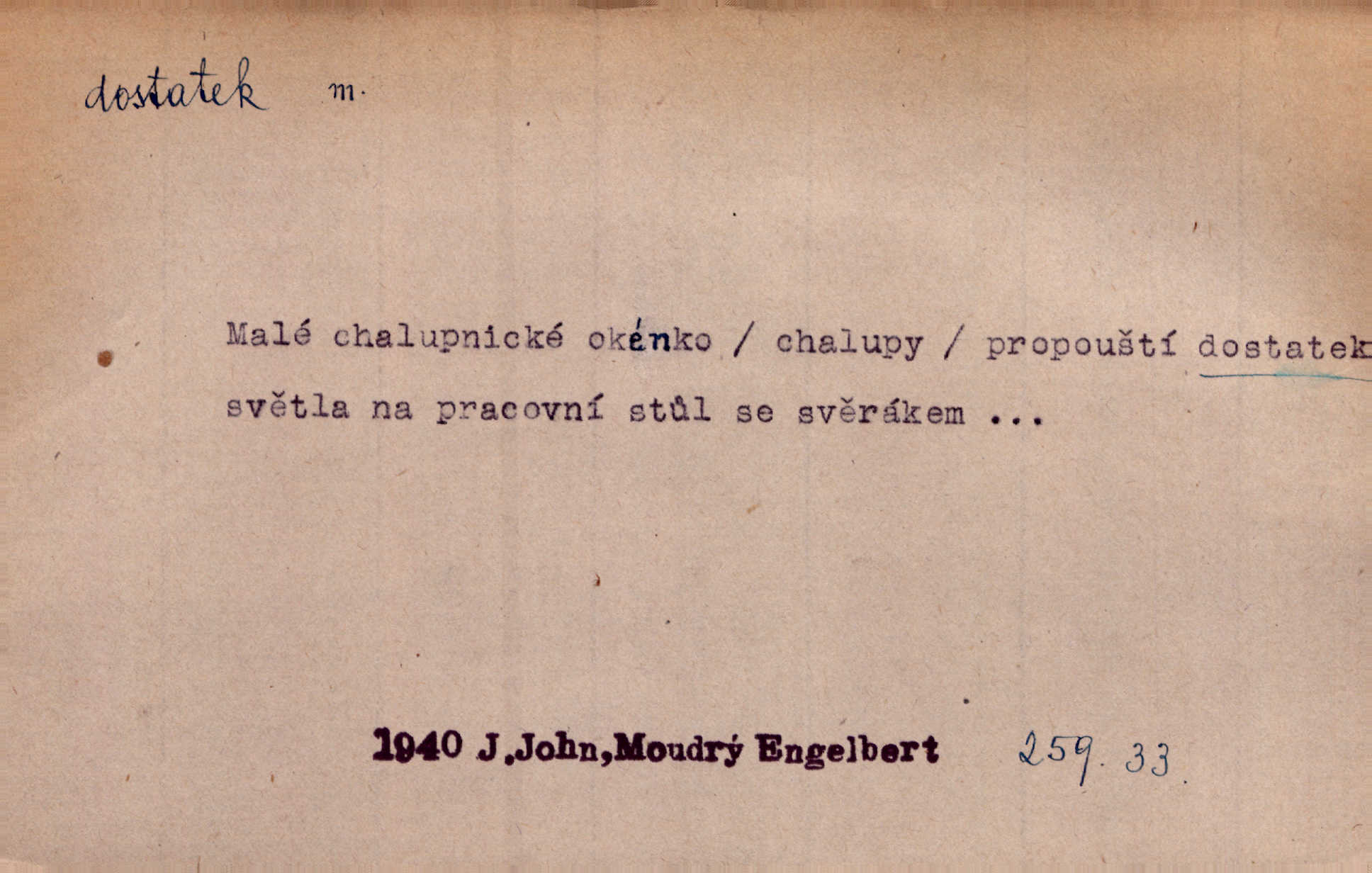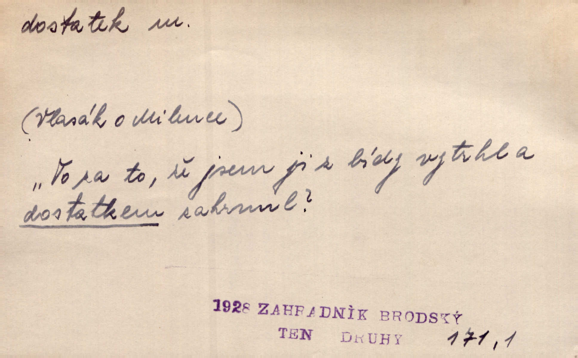 - dostatek, -tku m. vyhovující, uspokojivé množství, postačující počet. Měl jsem dostatek času. Arb. Posud měl obchod málo pomůcek, železnice žádné, silnic také ne všude dostatek. Ner. D s dostatek, dostatek adv. v dostatečném množství, dostatečně. Ovoce jsme požívali s dostatek po celou noc. Čech. Povaha jazyka svanetského není ještě s dostatek objasněna. Čech. Zprávami a zkušenostmi jsem vlastně poučen dostatek. Naše d. Odvahy bylo u Vojt. Nejedlého i u Šeb. Hněvkovského zajisté dostatek. Vrch. Nálada dostatek připravená. Šlej. D postačující množství životních potřeb. Ačkoliv pocházel ze statku, přece za mládí svého málo zvěděl o dostatku. Kos. Všude jevil se dostatek, ba blahobyt. Jir.
