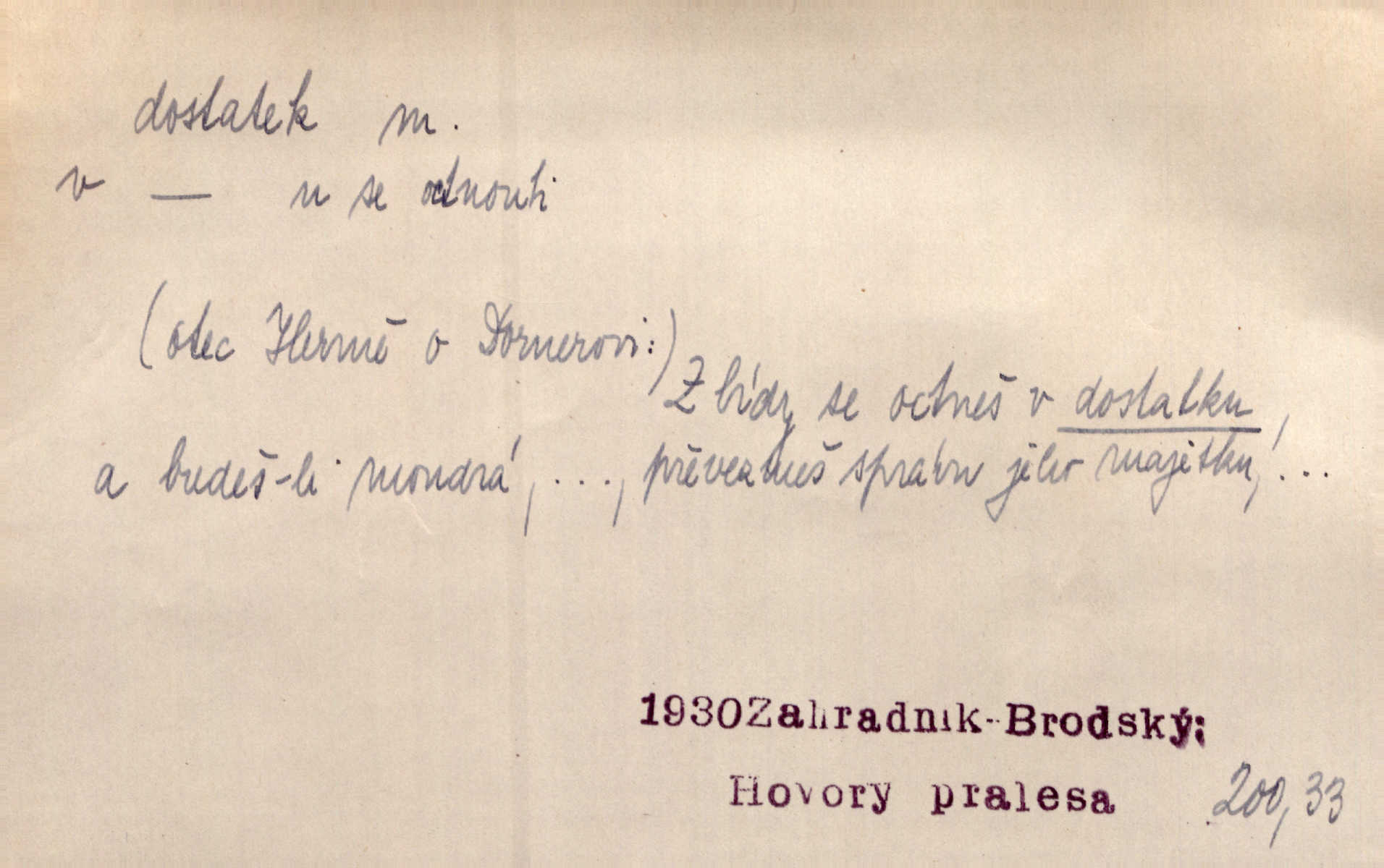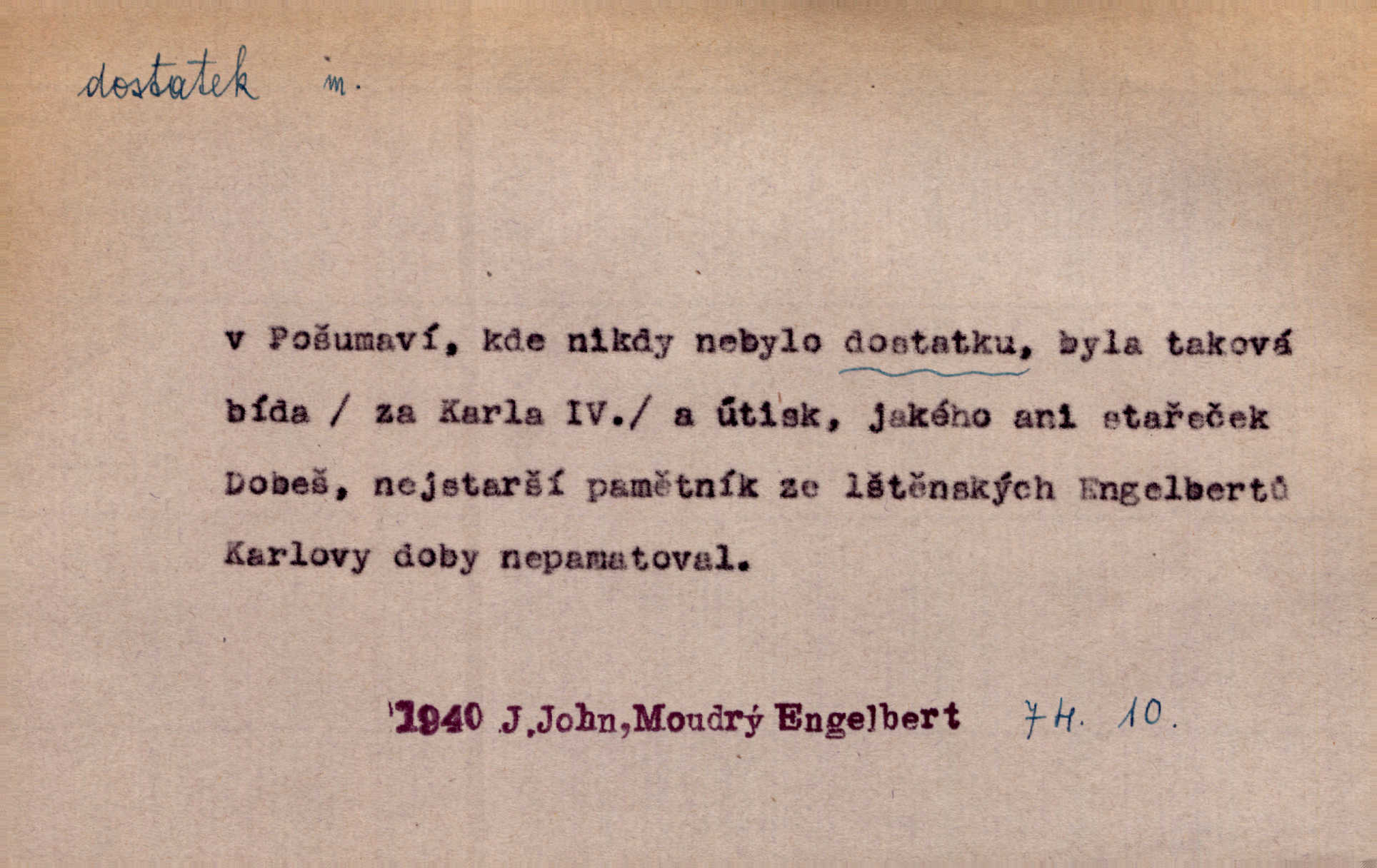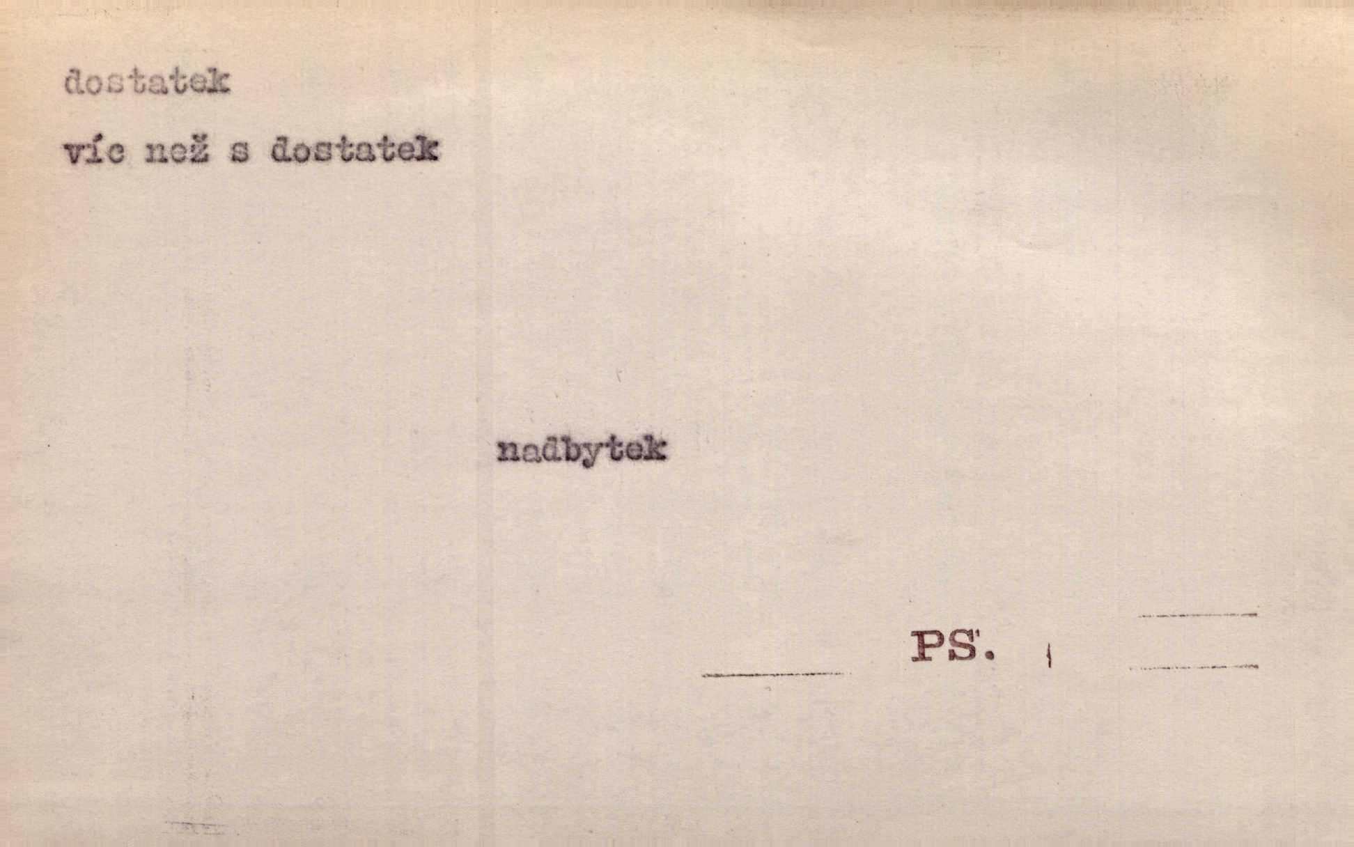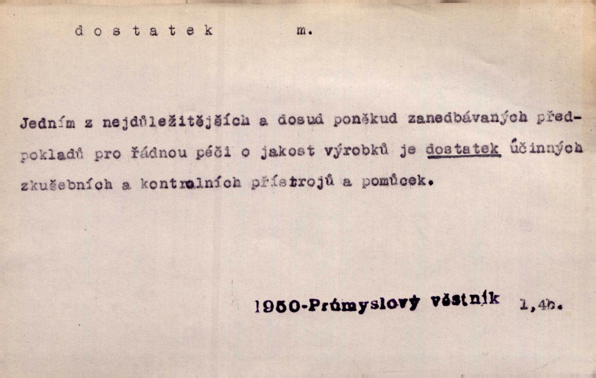 - dostatek, -tku m. vyhovující, uspokojivé množství, postačující počet. Měl jsem dostatek času. Arb. Posud měl obchod málo pomůcek, železnice žádné, silnic také ne všude dostatek. Ner. D s dostatek, dostatek adv. v dostatečném množství, dostatečně. Ovoce jsme požívali s dostatek po celou noc. Čech. Povaha jazyka svanetského není ještě s dostatek objasněna. Čech. Zprávami a zkušenostmi jsem vlastně poučen dostatek. Naše d. Odvahy bylo u Vojt. Nejedlého i u Šeb. Hněvkovského zajisté dostatek. Vrch. Nálada dostatek připravená. Šlej. D postačující množství životních potřeb. Ačkoliv pocházel ze statku, přece za mládí svého málo zvěděl o dostatku. Kos. Všude jevil se dostatek, ba blahobyt. Jir.
