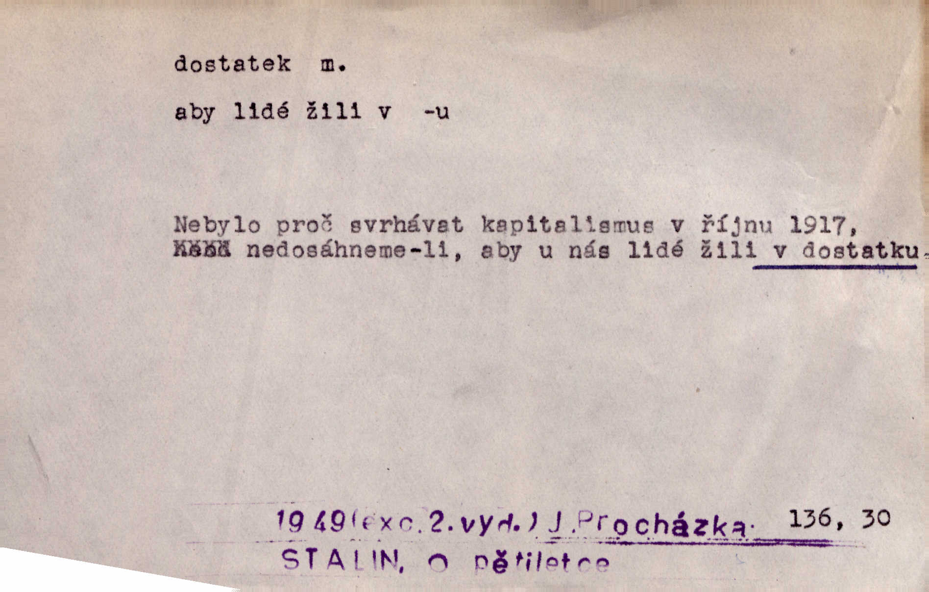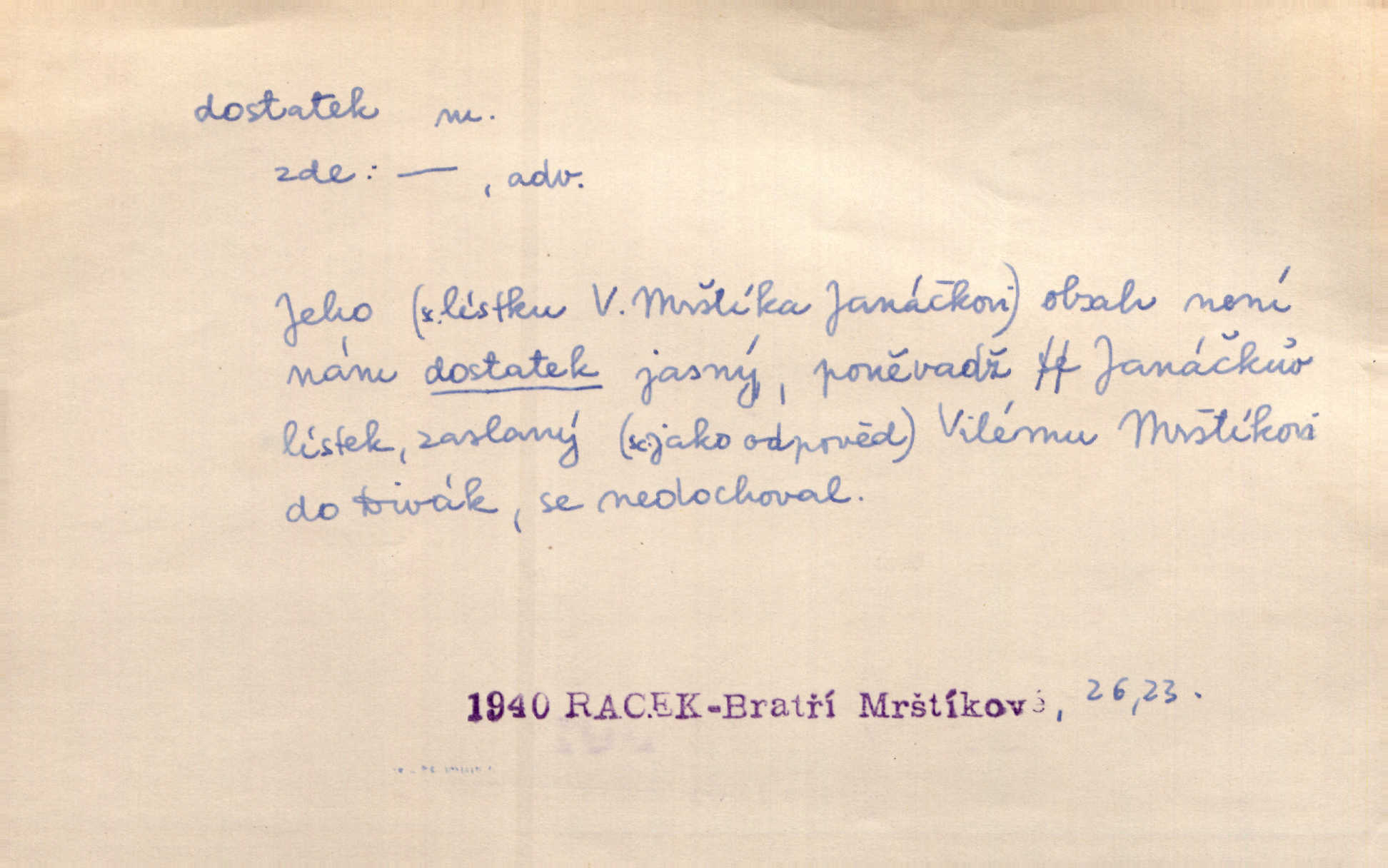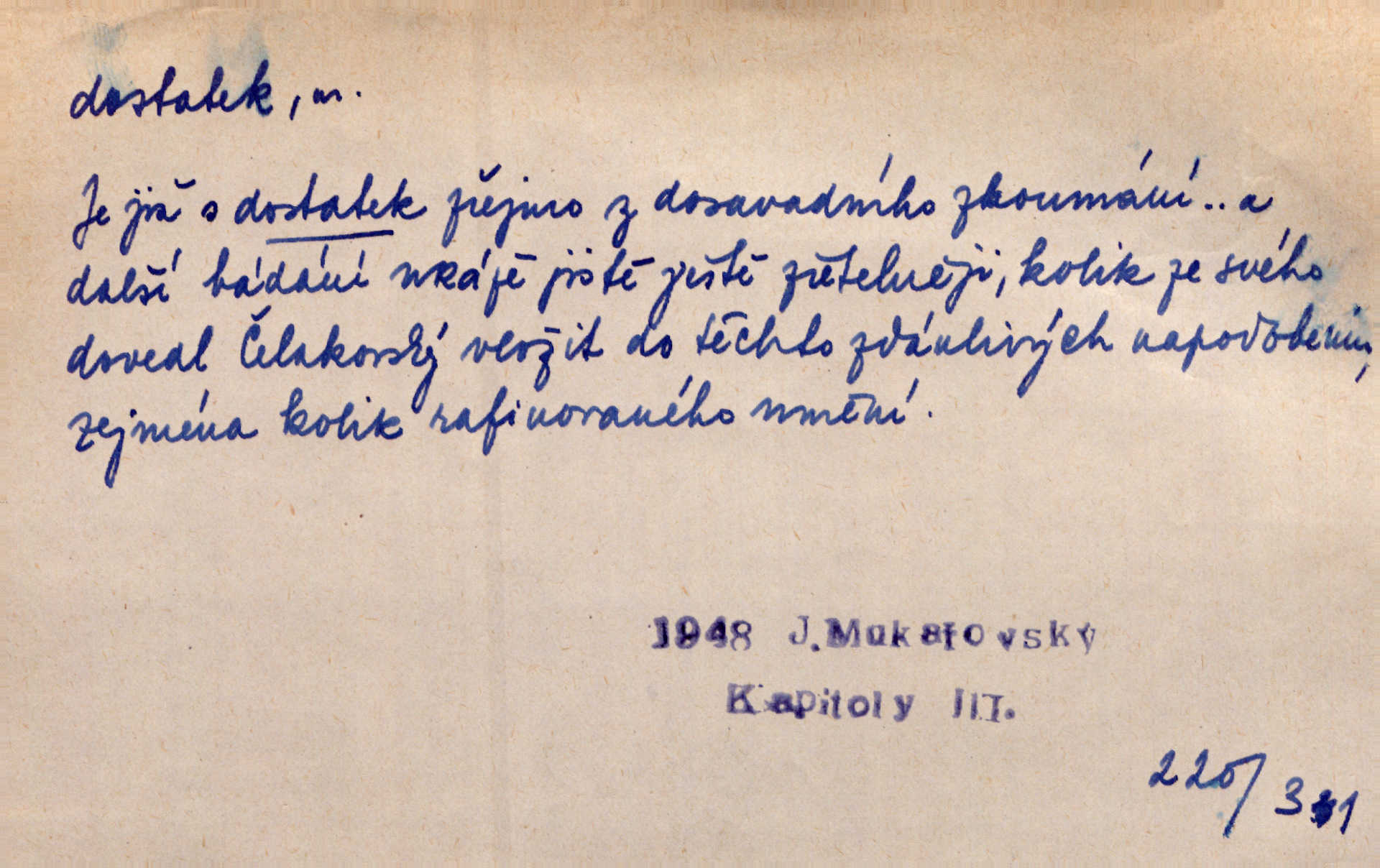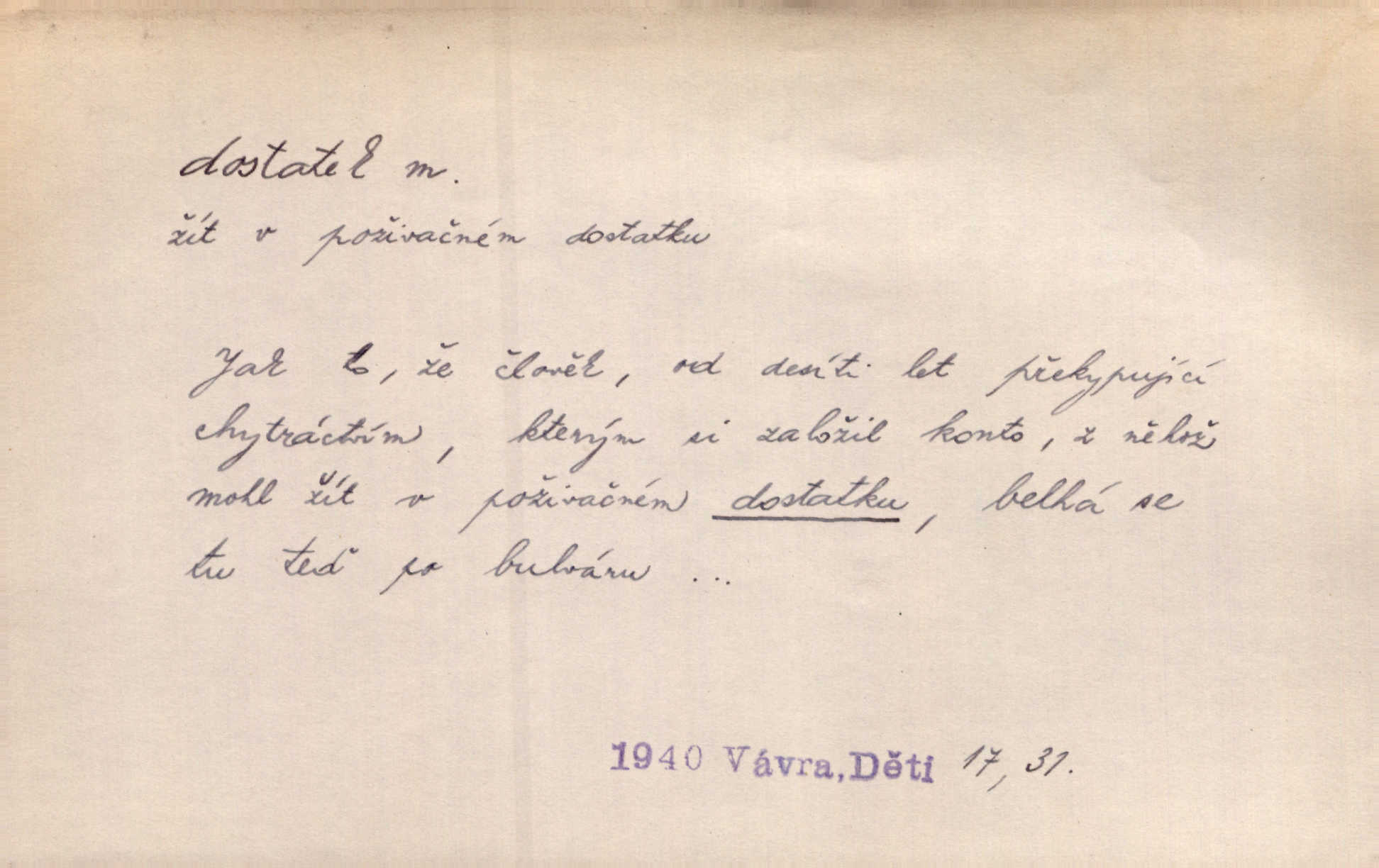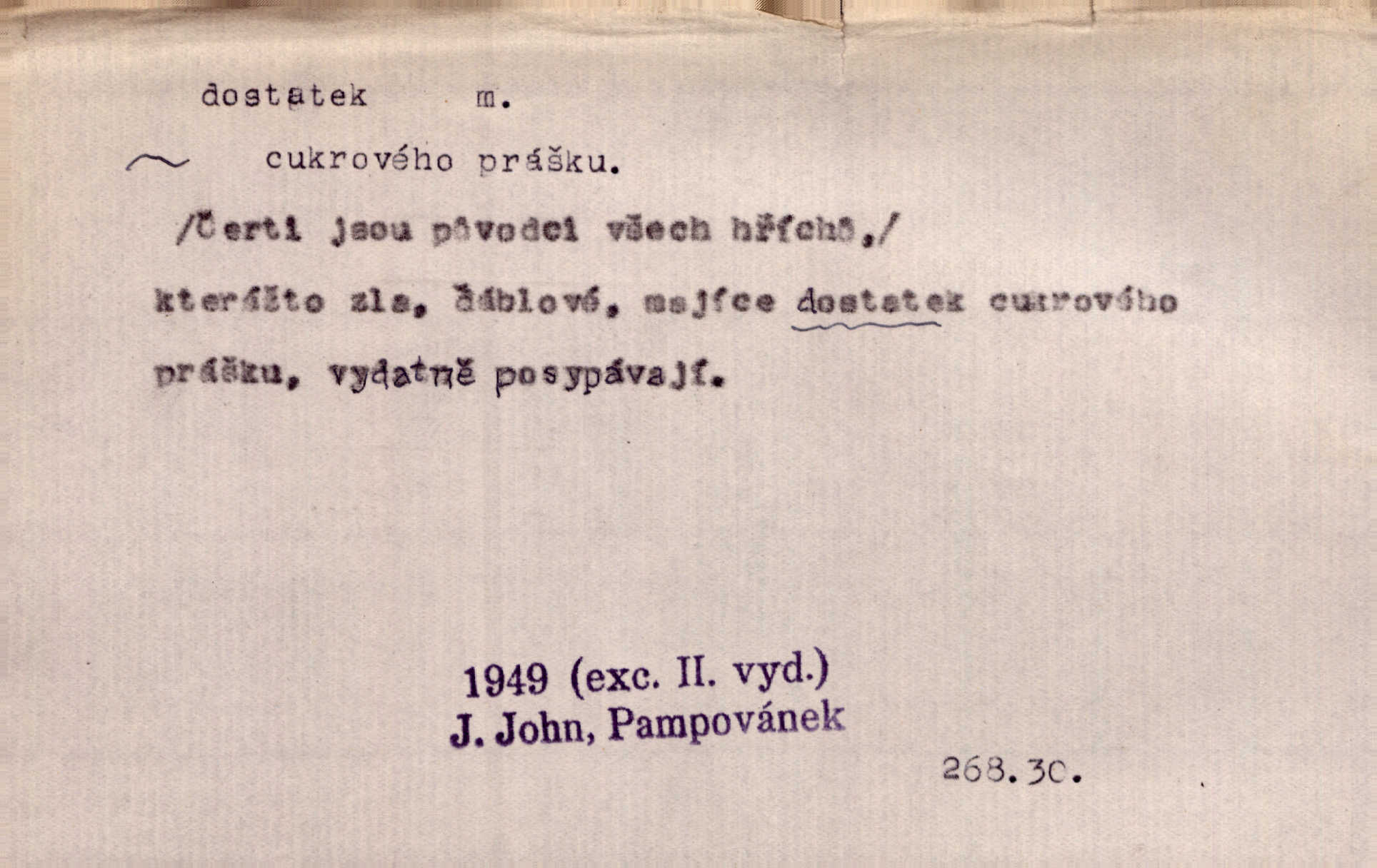 - dostatek, -tku m. vyhovující, uspokojivé množství, postačující počet. Měl jsem dostatek času. Arb. Posud měl obchod málo pomůcek, železnice žádné, silnic také ne všude dostatek. Ner. D s dostatek, dostatek adv. v dostatečném množství, dostatečně. Ovoce jsme požívali s dostatek po celou noc. Čech. Povaha jazyka svanetského není ještě s dostatek objasněna. Čech. Zprávami a zkušenostmi jsem vlastně poučen dostatek. Naše d. Odvahy bylo u Vojt. Nejedlého i u Šeb. Hněvkovského zajisté dostatek. Vrch. Nálada dostatek připravená. Šlej. D postačující množství životních potřeb. Ačkoliv pocházel ze statku, přece za mládí svého málo zvěděl o dostatku. Kos. Všude jevil se dostatek, ba blahobyt. Jir.