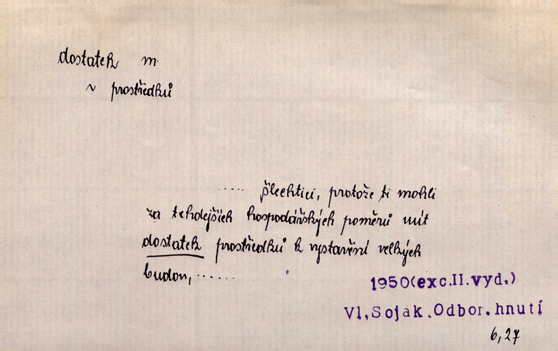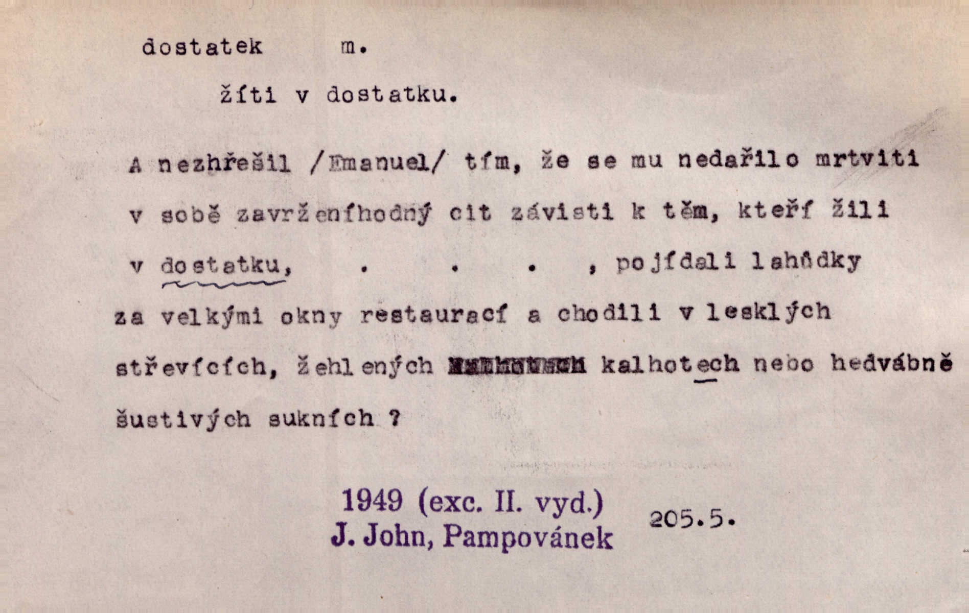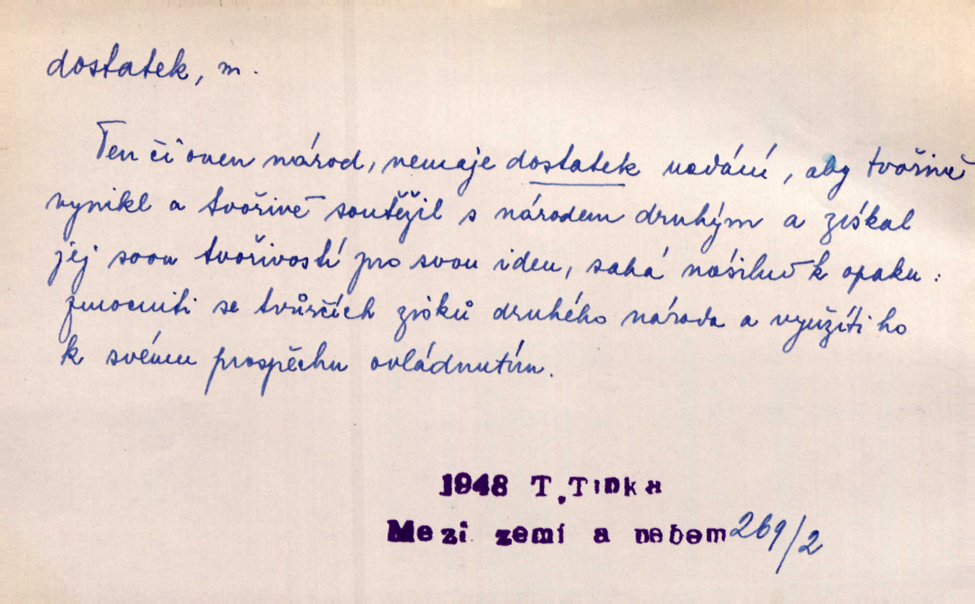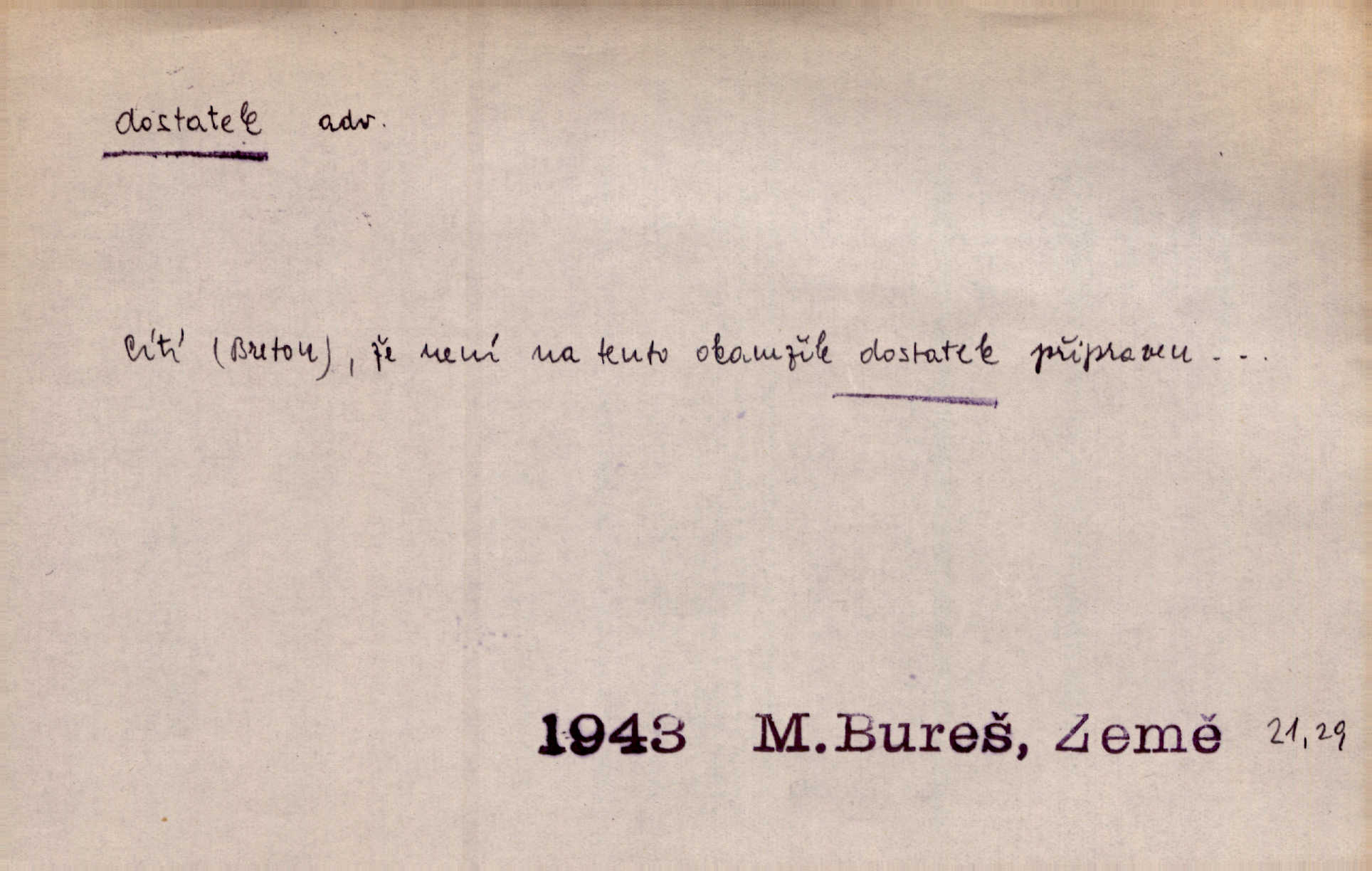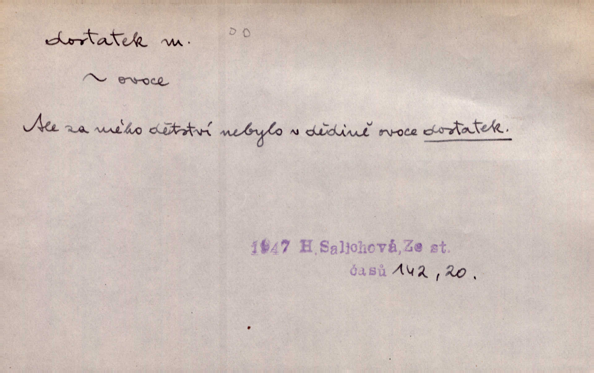 - dostatek, -tku m. vyhovující, uspokojivé množství, postačující počet. Měl jsem dostatek času. Arb. Posud měl obchod málo pomůcek, železnice žádné, silnic také ne všude dostatek. Ner. D s dostatek, dostatek adv. v dostatečném množství, dostatečně. Ovoce jsme požívali s dostatek po celou noc. Čech. Povaha jazyka svanetského není ještě s dostatek objasněna. Čech. Zprávami a zkušenostmi jsem vlastně poučen dostatek. Naše d. Odvahy bylo u Vojt. Nejedlého i u Šeb. Hněvkovského zajisté dostatek. Vrch. Nálada dostatek připravená. Šlej. D postačující množství životních potřeb. Ačkoliv pocházel ze statku, přece za mládí svého málo zvěděl o dostatku. Kos. Všude jevil se dostatek, ba blahobyt. Jir.
