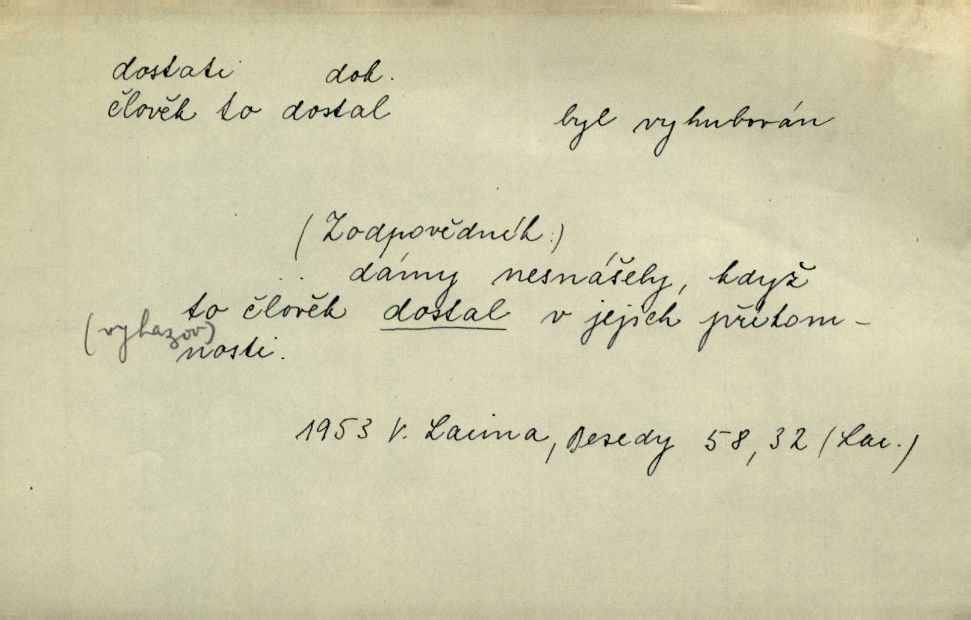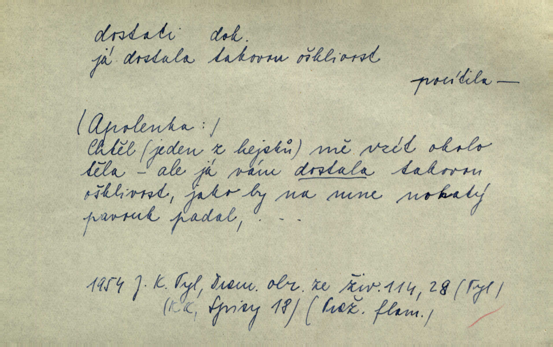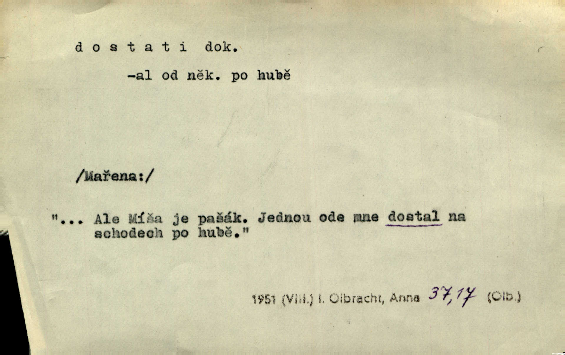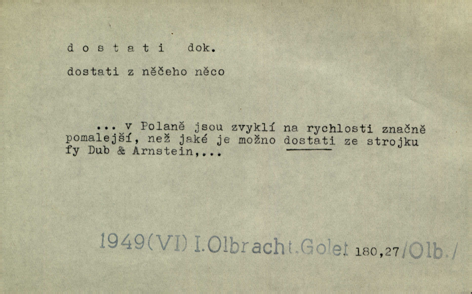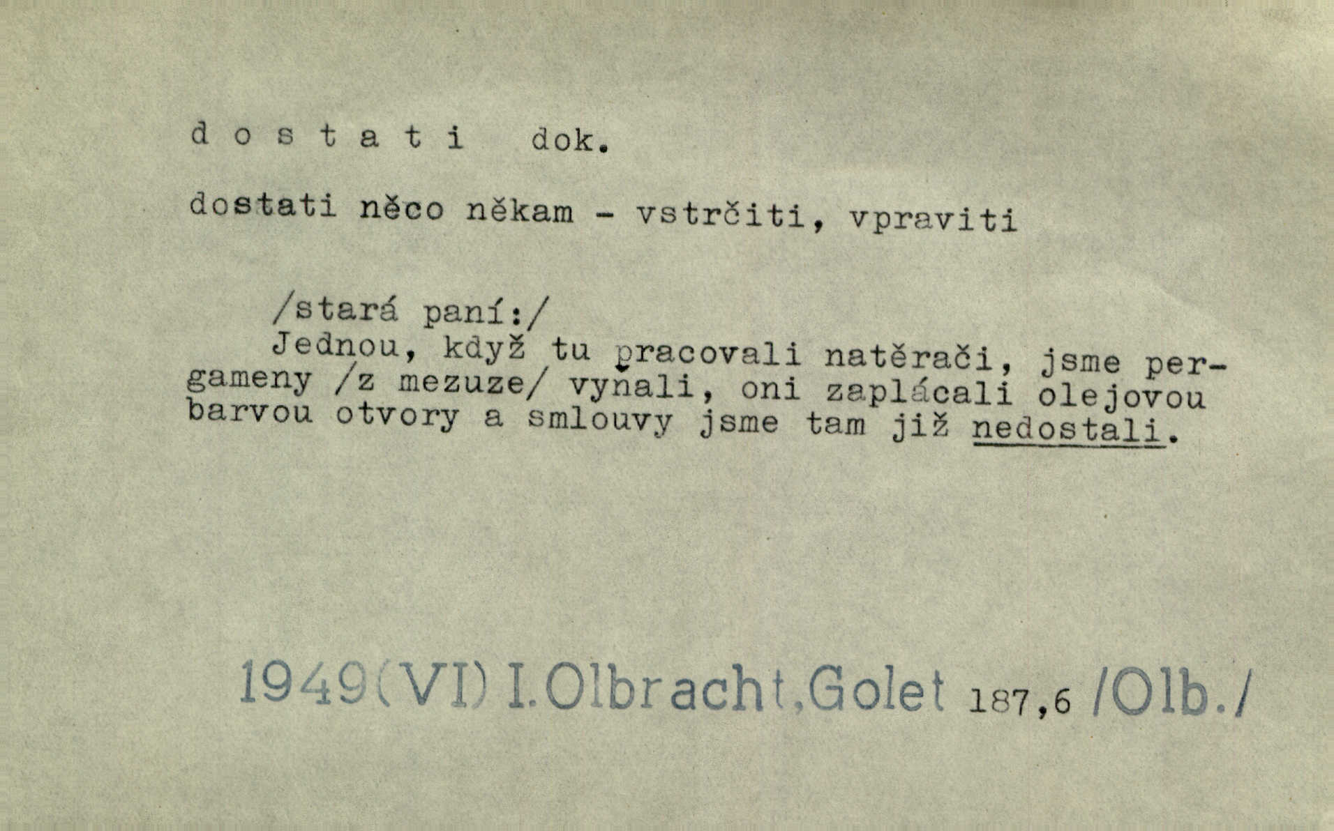 - dostati dok. (dostanu, dostání) (něco) nabýti něčeho bez vlastního úsilí, obyč. darováním. První rok dostal za odměnu své tichosti o celoroční zkoušce rohlík. Ner. Zeptala se dítěte chudého krejčího, co dostalo k Ježíšku. R. Svob. Dostal od císaře darem tisíc zlatých. Jir. Aby dcera byla dostala několik tisíc [věnem]‚ aby syn musil míti přínos na hotových, o tom nebylo slýcháno. Hál. D jakýmkoliv jiným přijetím. I do záložny zanesl [farář] slušný peníz, všecko, co dostal za koně, krávy, vozy, pluhy. Baar. Nedostavše žoldu bimbašovi svému [vojáci] odepřeli holdu. Krás. Za několik neděl dostala Anna list až ze Sedmihradska. Jir. Udělal zkoušky a dostal hned místo. Šim. Dostal hodnou ženu, dostala hodného muže. Šim. Kráva před několika dny dostala telátko otelila se. Kun. Vulg. Z toho by člověk dostal mladý zbláznil by se! Tak bývá po zimě, než stromky dostanou listí. Rais. Fara dostala docela nového ducha. Herb. Obrazy jeho dostaly závratný kurs. Kronb. Jak jsem dostal, tak to dám jak jsem slyšel, tak povídám. Dyk. Brzy dostaly vášně vrch a nikdo nepamatoval bouřnějšího shromáždění nabyly převahy. Zey. Rychtář dostal poručíno, aby mě dal chytit. Jir. Dostal modrý arch byl dán do pense. Dostati poučení, cvik, školu; jméno, rozum, chuť, nechuť k něčemu a p. D (o něčem nepříjemném, obyč. o trestu n. nemoci) utržiti, utrpěti. Kde pán dostane jednu ránu, sedlák utrží dvě a tři. Hol. Onehdy ve Žliči dostal Talián na hřbet. Něm. Však on šenkýřův Pepík dostane, až zase přijde do školy! Prav. Dostati bití, výprask, pardus, na frak, na chrám páně, na hřbet, na kůži, po nose, řezu. Dostati svůj díl, lekci, šňupku, nos, huby, za vyučenou, na pamětnou, co proto. Dostal šest měsíců, dostal od poroty provaz. Dostala po hroznech žáhu. Mrš. To jsou slonbidla, psotník by z nich člověk dostal! Herrm. Dostala jsem z vás takovou trému. Čap. Ch. Dostati souchotiny, zimnici, horečku, zápal, vyrážku, chrlení krve. Dostal roupy rozdováděl se, dostal vítr z něčeho polekal se, dostal pro vítr zažil strachu. Dostati strach, hlad, žízeň a p. D (někam, na něco, něco) dosáhnouti něčeho po jistém úsilí, dohmátnouti někam; uchopiti něco. Již jsem přerostl káď, kdežto jsem jindy na ni ani dostati nemohl. Klicp. Dostane smetákem na strop, dostal klobouk z vody holí, jablko se stromu bidlem a p. D (něco někam, odněkud) dopraviti, vpraviti; (někoho někam, odněkud) pomoci někomu k něčemu, od něčeho. I ta [poslední sirka] zhasla — ještě ji nedostal ani k dýmce. A. Mrš. Sotva sklenici udržel v ruce a polovic vylil, než něco dostal do úst. Prav. Šerka nabobtnala a vodou tak ztěžkala, že ji sotva na vůz dostali. Šmil. Já jsem logaritmy nedostala do ruky až při maturitě, neuměla jsem v nich hledat. Čap. Ch. Upálím tu dívku zlověstnou, do rukou svých když ji dostanu zmocním se jí. Zey. Jak člověk řekne slovo, ani čtyřma páry koní nedostane ho zpátky. Herb. Jen co ji [nemocnou] dostaneme do potu, bude lépe. Herrm. On si dá záležet, aby dostal Mílu s krku, protože ví, to že je můj obránce zbavil se ho. Něm. Kdo se o mne stará, aby mne dostal z chleba připravil o zaměstnání? R. Svob. Musili jsme hledět, abysme ho [syna] dostali někam do kanceláře pomohli mu. Šim. I tento pokus dostati slečnu Máňu pod čepec mine se s úspěchem. Hlad. Dostati někoho do pasti, na lep, na vějičku, do kleští, do tenat přivésti do nesnází, nachytati. Dostati někoho z míry rozhněvati, dostati na svou stranu nakloniti si. Vulg. dostat koho na špek napáliti, obelstíti. D (koho, co odněkud, někam) přiměti, přinutiti, vynutiti. Chlapce pak od těch knih sotva dostali k obědu. Jir. Pořád mě nutili, abych se dal k ostrostřelcům, a nedostali mě do toho. Herrm. Víckrát mě do Vídně žádný nedostane. Rais. Než mohla matka moje slova z ní [nemocné] dostat, už zase do peřin se zvrátila. Svět. D (něco, někoho) opatřiti si, získati si (za peníze n. ujednáním). Takový bůček nedostanete v celé Praze! Šim. Za korunu byl by mohl dostat kočár. Mach. Nemůžeme dostat lidi na řípu. Baar. Zobroubili [tovaryši tkalcovští] často celou ves, celé Padolí, nežli dostali místo. Jir. Napodobením němčiny je k dostání lze, možno dostati, obdržeti (obyč. ke koupi). Spisů jeho v městě k dostání nebylo. Pal. Jen tři kabiny byly k dostání. Kosm. Nic takového tu není k dostání. Šrám. Zatím co tadyhle se rozlévá jiskřivé moře cvočků, není o pár kilometrů dále cvoček k dostání. K. Čap. D (koho) chytiti, dopadnouti, lapiti, zmocniti se. Nalékli jsme na ni [lišku] pečeni, mínili jsme, že ji musíme dostat. Něm. [Strážníci] po pašerácích pásli. Ale Víška dosud ani jednou nedostali. Jir. Bůh buď jeho kůži milostiv, až ho [zloděje] dostaneme. Suš. D (koho) vyzráti na někoho, ošáliti, napáliti někoho. Tak ho [Brtka na vojně] trápili a číhali, aby ho v něčem polapili; až ho dostali. Jir. Vy jste mě dostali se svým Sylvestrem! To jsem vám naběhl. Herrm. To bys neřek’, že si z nás dělají jen blázny? Tebe dostali, ty to neznáš — ale já se nedal! Svob.