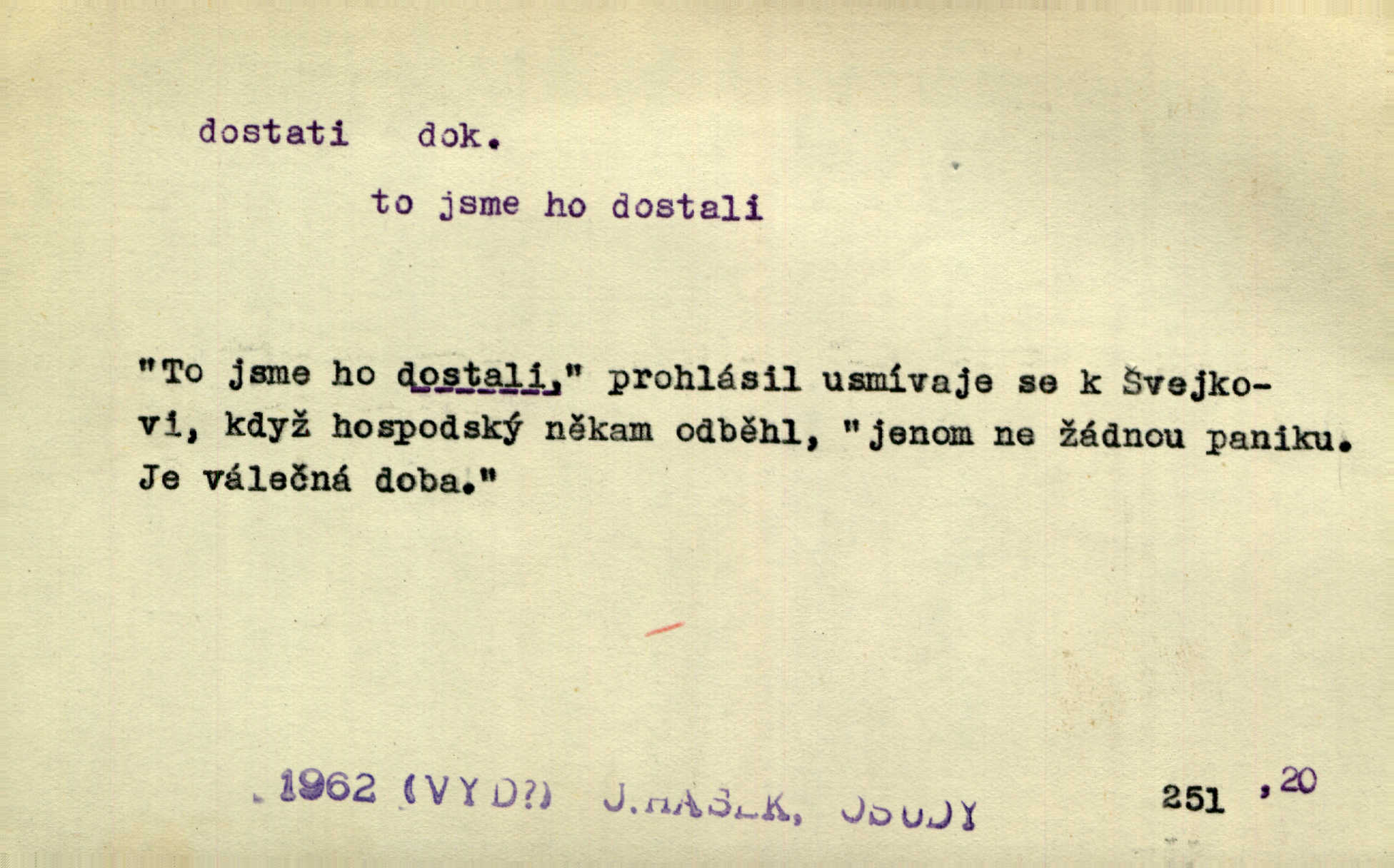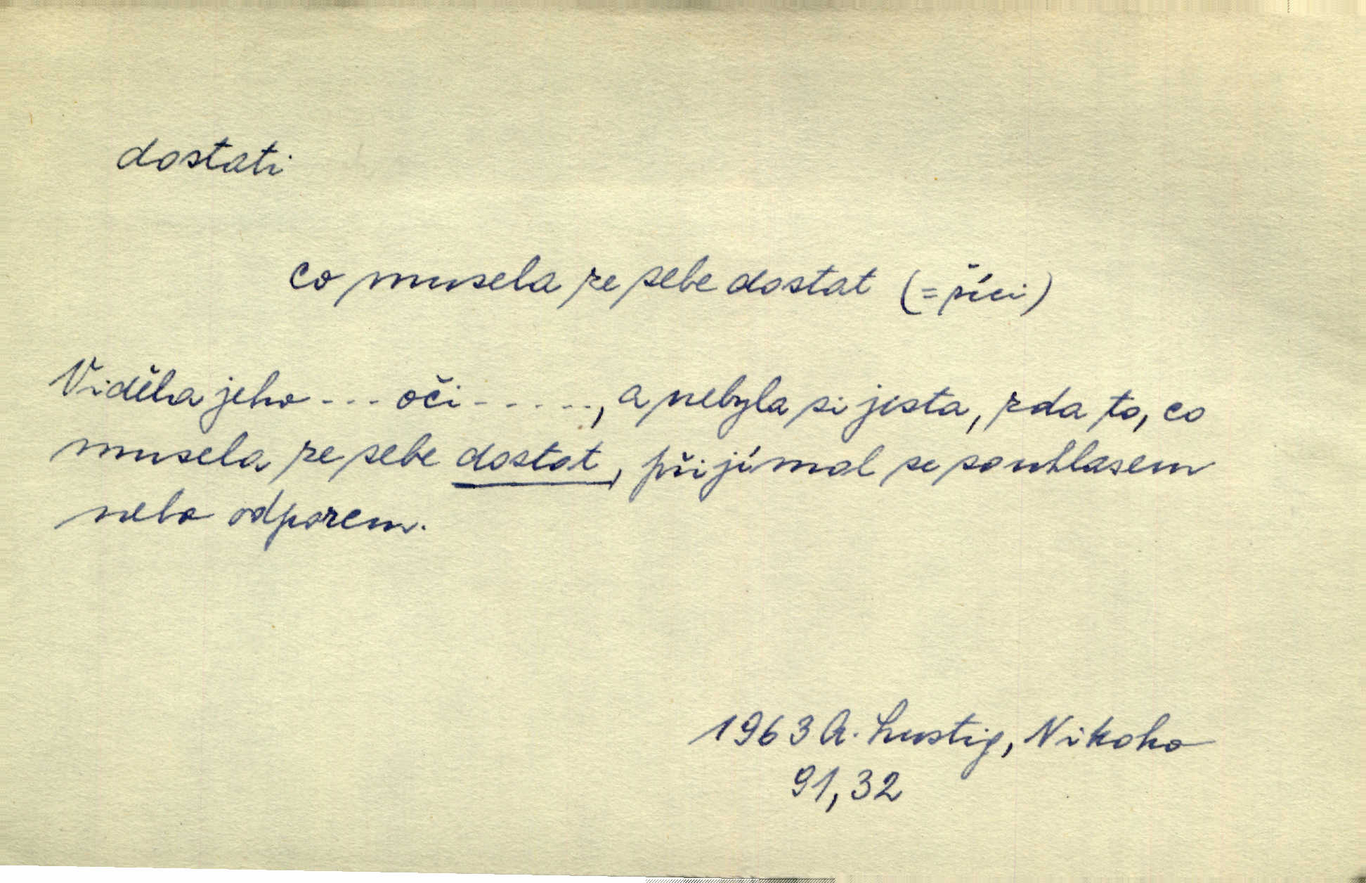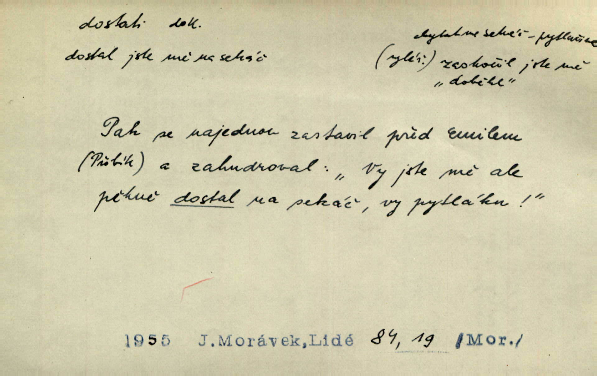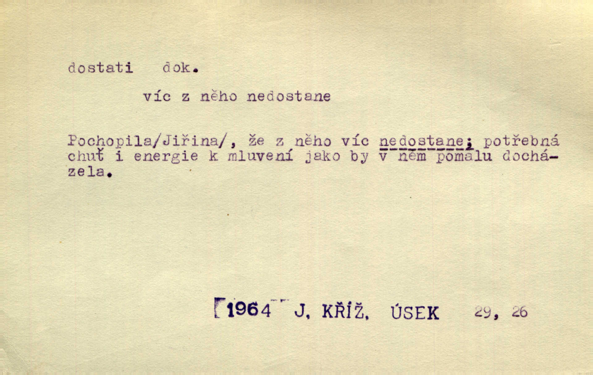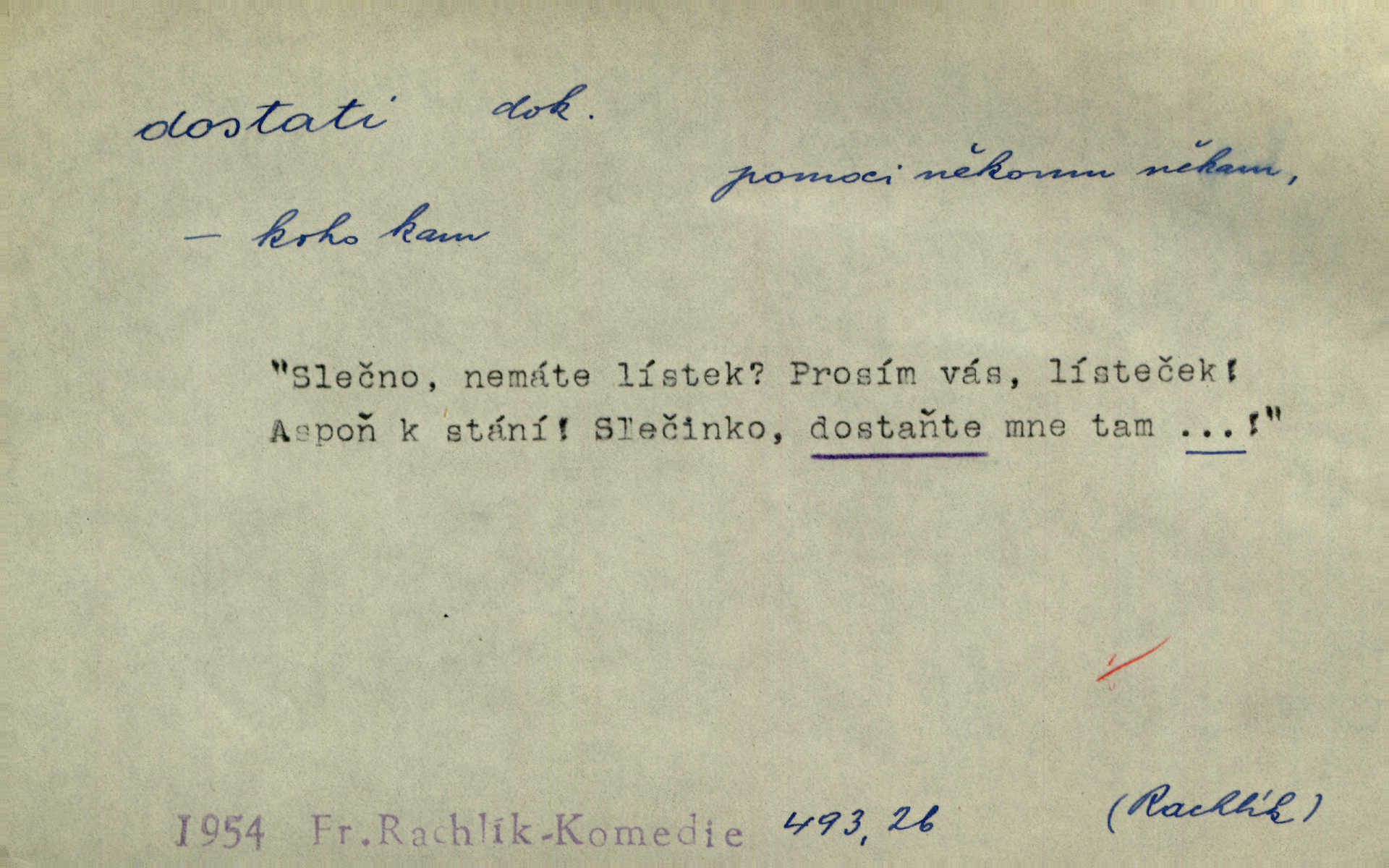 - dostati dok. (dostanu, dostání) (něco) nabýti něčeho bez vlastního úsilí, obyč. darováním. První rok dostal za odměnu své tichosti o celoroční zkoušce rohlík. Ner. Zeptala se dítěte chudého krejčího, co dostalo k Ježíšku. R. Svob. Dostal od císaře darem tisíc zlatých. Jir. Aby dcera byla dostala několik tisíc [věnem]‚ aby syn musil míti přínos na hotových, o tom nebylo slýcháno. Hál. D jakýmkoliv jiným přijetím. I do záložny zanesl [farář] slušný peníz, všecko, co dostal za koně, krávy, vozy, pluhy. Baar. Nedostavše žoldu bimbašovi svému [vojáci] odepřeli holdu. Krás. Za několik neděl dostala Anna list až ze Sedmihradska. Jir. Udělal zkoušky a dostal hned místo. Šim. Dostal hodnou ženu, dostala hodného muže. Šim. Kráva před několika dny dostala telátko otelila se. Kun. Vulg. Z toho by člověk dostal mladý zbláznil by se! Tak bývá po zimě, než stromky dostanou listí. Rais. Fara dostala docela nového ducha. Herb. Obrazy jeho dostaly závratný kurs. Kronb. Jak jsem dostal, tak to dám jak jsem slyšel, tak povídám. Dyk. Brzy dostaly vášně vrch a nikdo nepamatoval bouřnějšího shromáždění nabyly převahy. Zey. Rychtář dostal poručíno, aby mě dal chytit. Jir. Dostal modrý arch byl dán do pense. Dostati poučení, cvik, školu; jméno, rozum, chuť, nechuť k něčemu a p. D (o něčem nepříjemném, obyč. o trestu n. nemoci) utržiti, utrpěti. Kde pán dostane jednu ránu, sedlák utrží dvě a tři. Hol. Onehdy ve Žliči dostal Talián na hřbet. Něm. Však on šenkýřův Pepík dostane, až zase přijde do školy! Prav. Dostati bití, výprask, pardus, na frak, na chrám páně, na hřbet, na kůži, po nose, řezu. Dostati svůj díl, lekci, šňupku, nos, huby, za vyučenou, na pamětnou, co proto. Dostal šest měsíců, dostal od poroty provaz. Dostala po hroznech žáhu. Mrš. To jsou slonbidla, psotník by z nich člověk dostal! Herrm. Dostala jsem z vás takovou trému. Čap. Ch. Dostati souchotiny, zimnici, horečku, zápal, vyrážku, chrlení krve. Dostal roupy rozdováděl se, dostal vítr z něčeho polekal se, dostal pro vítr zažil strachu. Dostati strach, hlad, žízeň a p. D (někam, na něco, něco) dosáhnouti něčeho po jistém úsilí, dohmátnouti někam; uchopiti něco. Již jsem přerostl káď, kdežto jsem jindy na ni ani dostati nemohl. Klicp. Dostane smetákem na strop, dostal klobouk z vody holí, jablko se stromu bidlem a p. D (něco někam, odněkud) dopraviti, vpraviti; (někoho někam, odněkud) pomoci někomu k něčemu, od něčeho. I ta [poslední sirka] zhasla — ještě ji nedostal ani k dýmce. A. Mrš. Sotva sklenici udržel v ruce a polovic vylil, než něco dostal do úst. Prav. Šerka nabobtnala a vodou tak ztěžkala, že ji sotva na vůz dostali. Šmil. Já jsem logaritmy nedostala do ruky až při maturitě, neuměla jsem v nich hledat. Čap. Ch. Upálím tu dívku zlověstnou, do rukou svých když ji dostanu zmocním se jí. Zey. Jak člověk řekne slovo, ani čtyřma páry koní nedostane ho zpátky. Herb. Jen co ji [nemocnou] dostaneme do potu, bude lépe. Herrm. On si dá záležet, aby dostal Mílu s krku, protože ví, to že je můj obránce zbavil se ho. Něm. Kdo se o mne stará, aby mne dostal z chleba připravil o zaměstnání? R. Svob. Musili jsme hledět, abysme ho [syna] dostali někam do kanceláře pomohli mu. Šim. I tento pokus dostati slečnu Máňu pod čepec mine se s úspěchem. Hlad. Dostati někoho do pasti, na lep, na vějičku, do kleští, do tenat přivésti do nesnází, nachytati. Dostati někoho z míry rozhněvati, dostati na svou stranu nakloniti si. Vulg. dostat koho na špek napáliti, obelstíti. D (koho, co odněkud, někam) přiměti, přinutiti, vynutiti. Chlapce pak od těch knih sotva dostali k obědu. Jir. Pořád mě nutili, abych se dal k ostrostřelcům, a nedostali mě do toho. Herrm. Víckrát mě do Vídně žádný nedostane. Rais. Než mohla matka moje slova z ní [nemocné] dostat, už zase do peřin se zvrátila. Svět. D (něco, někoho) opatřiti si, získati si (za peníze n. ujednáním). Takový bůček nedostanete v celé Praze! Šim. Za korunu byl by mohl dostat kočár. Mach. Nemůžeme dostat lidi na řípu. Baar. Zobroubili [tovaryši tkalcovští] často celou ves, celé Padolí, nežli dostali místo. Jir. Napodobením němčiny je k dostání lze, možno dostati, obdržeti (obyč. ke koupi). Spisů jeho v městě k dostání nebylo. Pal. Jen tři kabiny byly k dostání. Kosm. Nic takového tu není k dostání. Šrám. Zatím co tadyhle se rozlévá jiskřivé moře cvočků, není o pár kilometrů dále cvoček k dostání. K. Čap. D (koho) chytiti, dopadnouti, lapiti, zmocniti se. Nalékli jsme na ni [lišku] pečeni, mínili jsme, že ji musíme dostat. Něm. [Strážníci] po pašerácích pásli. Ale Víška dosud ani jednou nedostali. Jir. Bůh buď jeho kůži milostiv, až ho [zloděje] dostaneme. Suš. D (koho) vyzráti na někoho, ošáliti, napáliti někoho. Tak ho [Brtka na vojně] trápili a číhali, aby ho v něčem polapili; až ho dostali. Jir. Vy jste mě dostali se svým Sylvestrem! To jsem vám naběhl. Herrm. To bys neřek’, že si z nás dělají jen blázny? Tebe dostali, ty to neznáš — ale já se nedal! Svob.