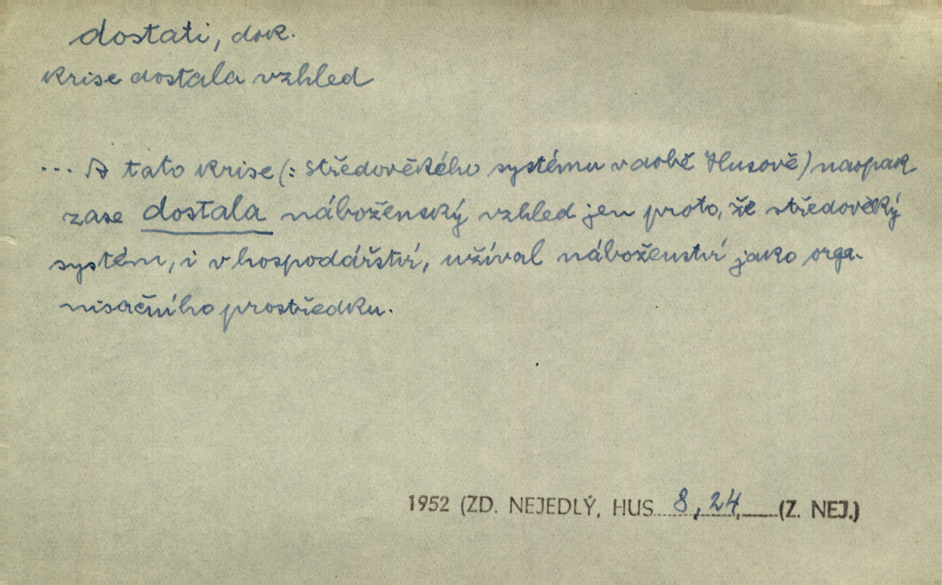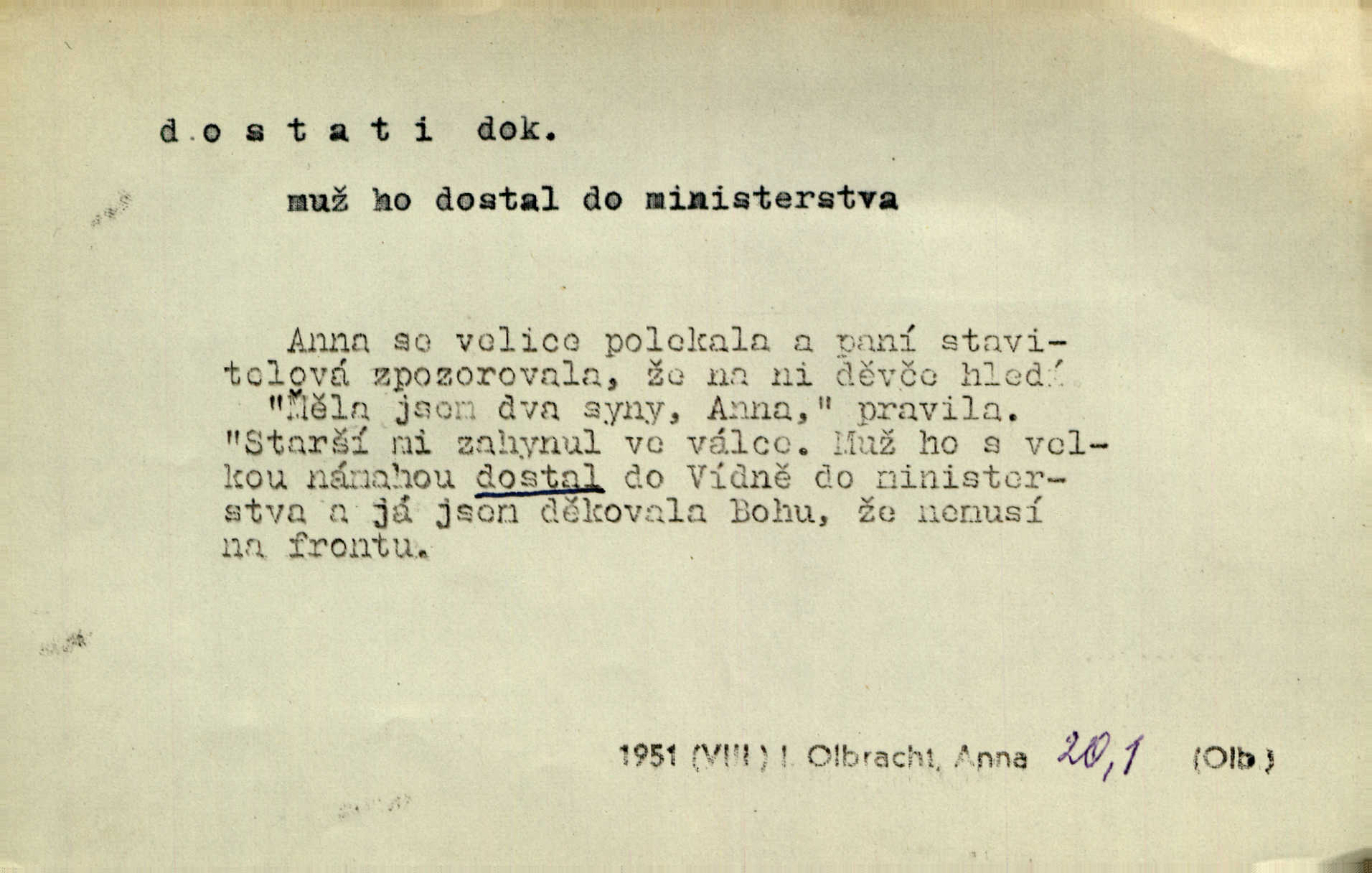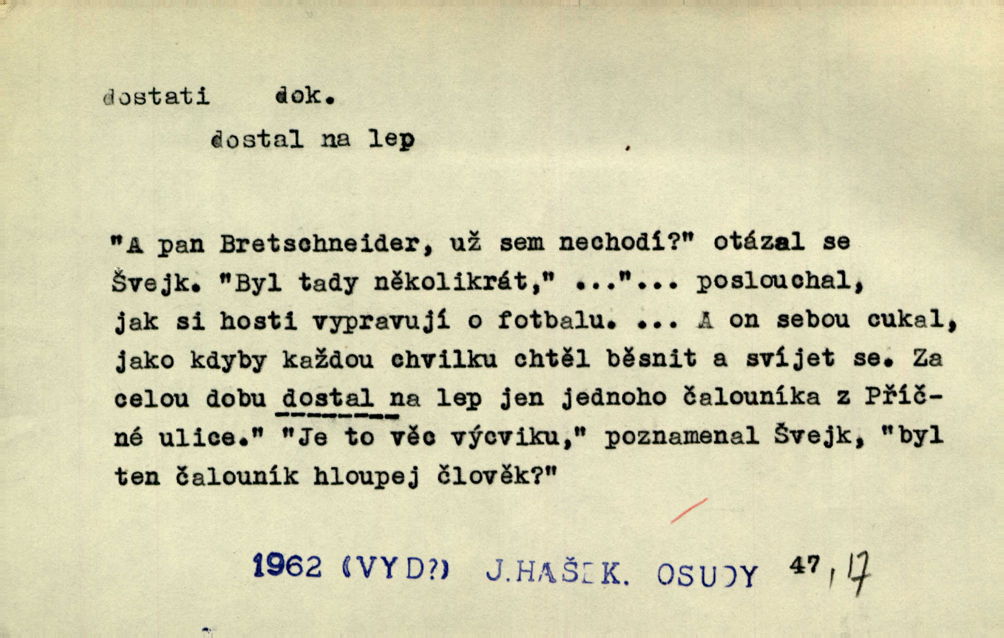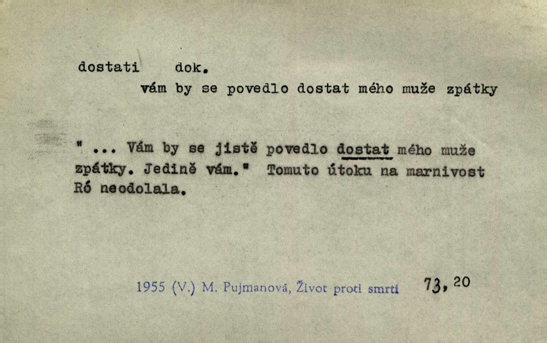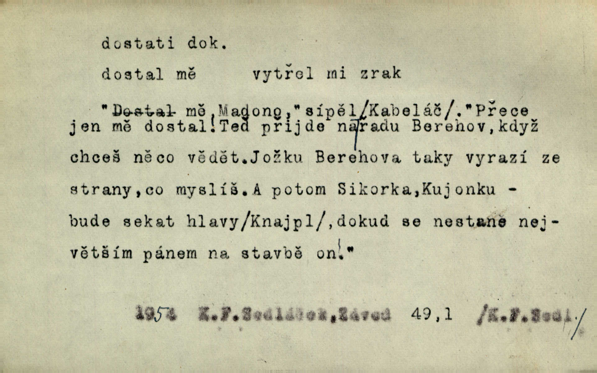 - dostati dok. (dostanu, dostání) (něco) nabýti něčeho bez vlastního úsilí, obyč. darováním. První rok dostal za odměnu své tichosti o celoroční zkoušce rohlík. Ner. Zeptala se dítěte chudého krejčího, co dostalo k Ježíšku. R. Svob. Dostal od císaře darem tisíc zlatých. Jir. Aby dcera byla dostala několik tisíc [věnem]‚ aby syn musil míti přínos na hotových, o tom nebylo slýcháno. Hál. D jakýmkoliv jiným přijetím. I do záložny zanesl [farář] slušný peníz, všecko, co dostal za koně, krávy, vozy, pluhy. Baar. Nedostavše žoldu bimbašovi svému [vojáci] odepřeli holdu. Krás. Za několik neděl dostala Anna list až ze Sedmihradska. Jir. Udělal zkoušky a dostal hned místo. Šim. Dostal hodnou ženu, dostala hodného muže. Šim. Kráva před několika dny dostala telátko otelila se. Kun. Vulg. Z toho by člověk dostal mladý zbláznil by se! Tak bývá po zimě, než stromky dostanou listí. Rais. Fara dostala docela nového ducha. Herb. Obrazy jeho dostaly závratný kurs. Kronb. Jak jsem dostal, tak to dám jak jsem slyšel, tak povídám. Dyk. Brzy dostaly vášně vrch a nikdo nepamatoval bouřnějšího shromáždění nabyly převahy. Zey. Rychtář dostal poručíno, aby mě dal chytit. Jir. Dostal modrý arch byl dán do pense. Dostati poučení, cvik, školu; jméno, rozum, chuť, nechuť k něčemu a p. D (o něčem nepříjemném, obyč. o trestu n. nemoci) utržiti, utrpěti. Kde pán dostane jednu ránu, sedlák utrží dvě a tři. Hol. Onehdy ve Žliči dostal Talián na hřbet. Něm. Však on šenkýřův Pepík dostane, až zase přijde do školy! Prav. Dostati bití, výprask, pardus, na frak, na chrám páně, na hřbet, na kůži, po nose, řezu. Dostati svůj díl, lekci, šňupku, nos, huby, za vyučenou, na pamětnou, co proto. Dostal šest měsíců, dostal od poroty provaz. Dostala po hroznech žáhu. Mrš. To jsou slonbidla, psotník by z nich člověk dostal! Herrm. Dostala jsem z vás takovou trému. Čap. Ch. Dostati souchotiny, zimnici, horečku, zápal, vyrážku, chrlení krve. Dostal roupy rozdováděl se, dostal vítr z něčeho polekal se, dostal pro vítr zažil strachu. Dostati strach, hlad, žízeň a p. D (někam, na něco, něco) dosáhnouti něčeho po jistém úsilí, dohmátnouti někam; uchopiti něco. Již jsem přerostl káď, kdežto jsem jindy na ni ani dostati nemohl. Klicp. Dostane smetákem na strop, dostal klobouk z vody holí, jablko se stromu bidlem a p. D (něco někam, odněkud) dopraviti, vpraviti; (někoho někam, odněkud) pomoci někomu k něčemu, od něčeho. I ta [poslední sirka] zhasla — ještě ji nedostal ani k dýmce. A. Mrš. Sotva sklenici udržel v ruce a polovic vylil, než něco dostal do úst. Prav. Šerka nabobtnala a vodou tak ztěžkala, že ji sotva na vůz dostali. Šmil. Já jsem logaritmy nedostala do ruky až při maturitě, neuměla jsem v nich hledat. Čap. Ch. Upálím tu dívku zlověstnou, do rukou svých když ji dostanu zmocním se jí. Zey. Jak člověk řekne slovo, ani čtyřma páry koní nedostane ho zpátky. Herb. Jen co ji [nemocnou] dostaneme do potu, bude lépe. Herrm. On si dá záležet, aby dostal Mílu s krku, protože ví, to že je můj obránce zbavil se ho. Něm. Kdo se o mne stará, aby mne dostal z chleba připravil o zaměstnání? R. Svob. Musili jsme hledět, abysme ho [syna] dostali někam do kanceláře pomohli mu. Šim. I tento pokus dostati slečnu Máňu pod čepec mine se s úspěchem. Hlad. Dostati někoho do pasti, na lep, na vějičku, do kleští, do tenat přivésti do nesnází, nachytati. Dostati někoho z míry rozhněvati, dostati na svou stranu nakloniti si. Vulg. dostat koho na špek napáliti, obelstíti. D (koho, co odněkud, někam) přiměti, přinutiti, vynutiti. Chlapce pak od těch knih sotva dostali k obědu. Jir. Pořád mě nutili, abych se dal k ostrostřelcům, a nedostali mě do toho. Herrm. Víckrát mě do Vídně žádný nedostane. Rais. Než mohla matka moje slova z ní [nemocné] dostat, už zase do peřin se zvrátila. Svět. D (něco, někoho) opatřiti si, získati si (za peníze n. ujednáním). Takový bůček nedostanete v celé Praze! Šim. Za korunu byl by mohl dostat kočár. Mach. Nemůžeme dostat lidi na řípu. Baar. Zobroubili [tovaryši tkalcovští] často celou ves, celé Padolí, nežli dostali místo. Jir. Napodobením němčiny je k dostání lze, možno dostati, obdržeti (obyč. ke koupi). Spisů jeho v městě k dostání nebylo. Pal. Jen tři kabiny byly k dostání. Kosm. Nic takového tu není k dostání. Šrám. Zatím co tadyhle se rozlévá jiskřivé moře cvočků, není o pár kilometrů dále cvoček k dostání. K. Čap. D (koho) chytiti, dopadnouti, lapiti, zmocniti se. Nalékli jsme na ni [lišku] pečeni, mínili jsme, že ji musíme dostat. Něm. [Strážníci] po pašerácích pásli. Ale Víška dosud ani jednou nedostali. Jir. Bůh buď jeho kůži milostiv, až ho [zloděje] dostaneme. Suš. D (koho) vyzráti na někoho, ošáliti, napáliti někoho. Tak ho [Brtka na vojně] trápili a číhali, aby ho v něčem polapili; až ho dostali. Jir. Vy jste mě dostali se svým Sylvestrem! To jsem vám naběhl. Herrm. To bys neřek’, že si z nás dělají jen blázny? Tebe dostali, ty to neznáš — ale já se nedal! Svob.
