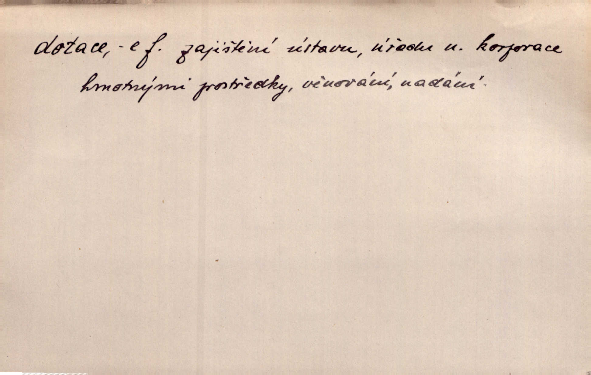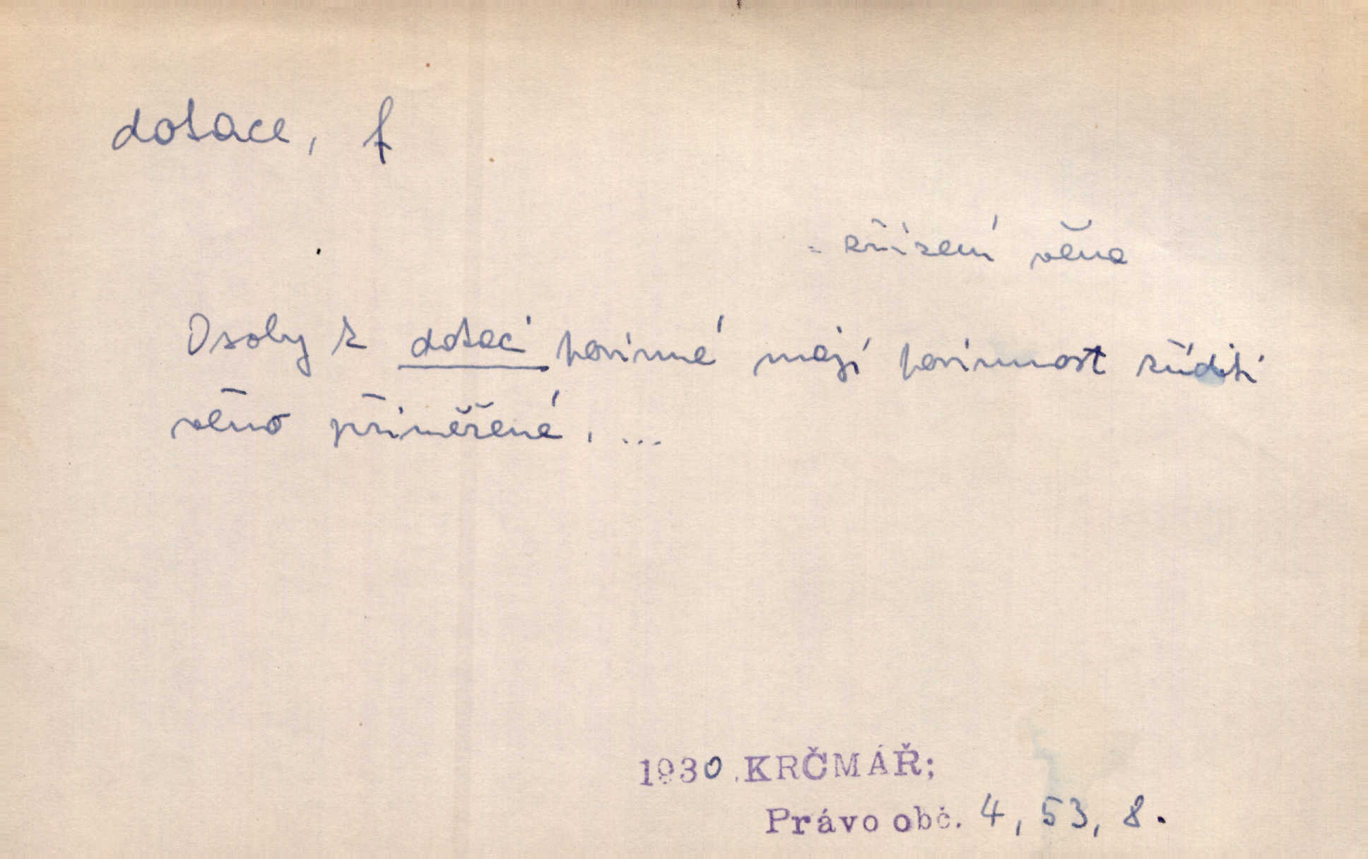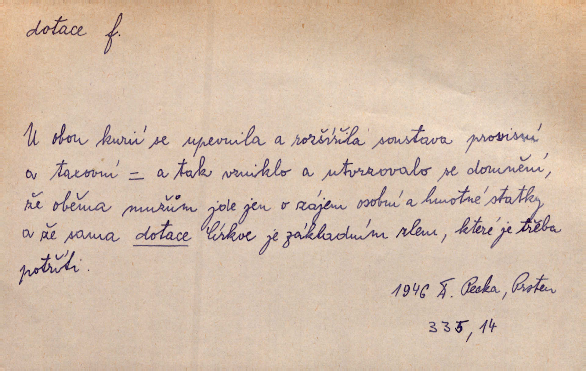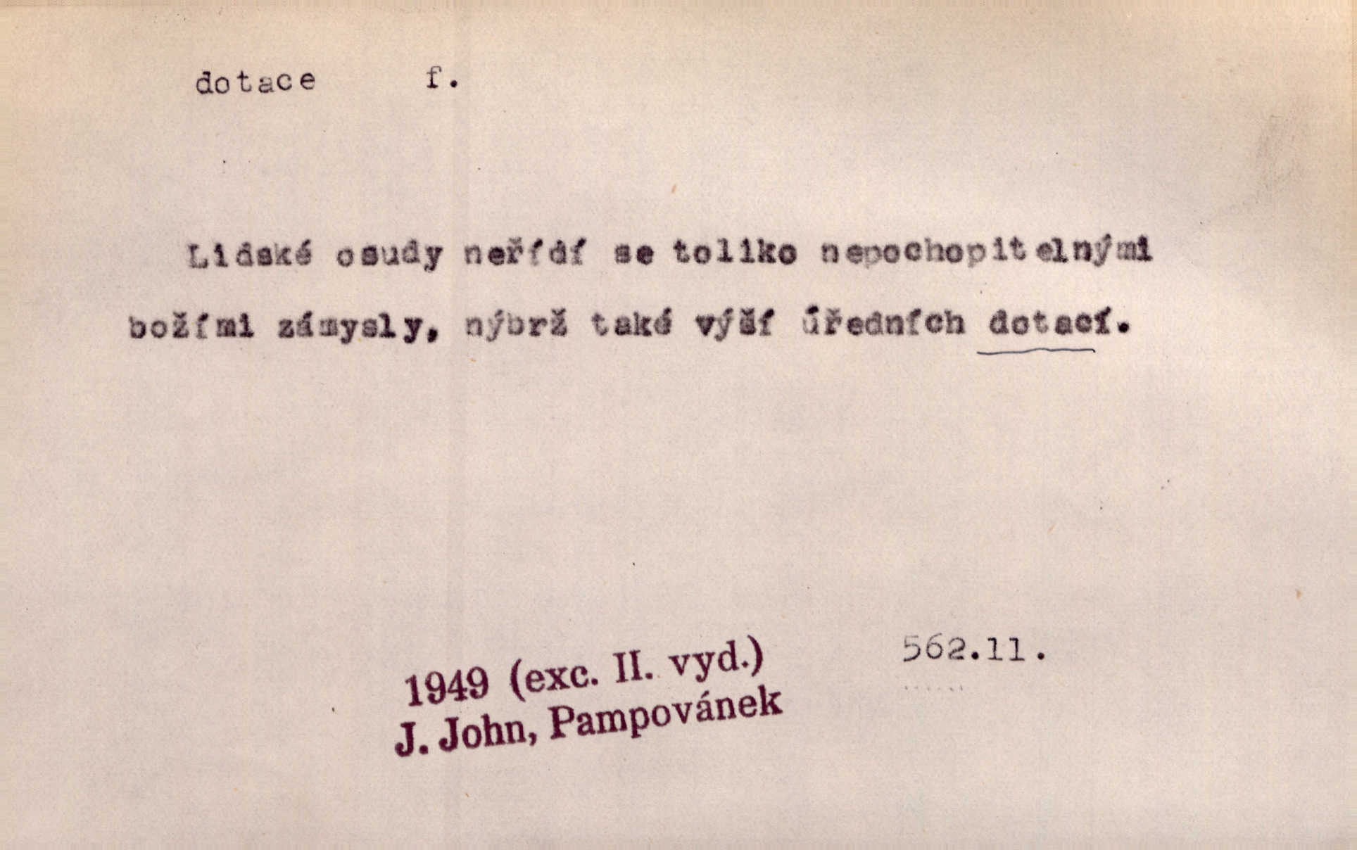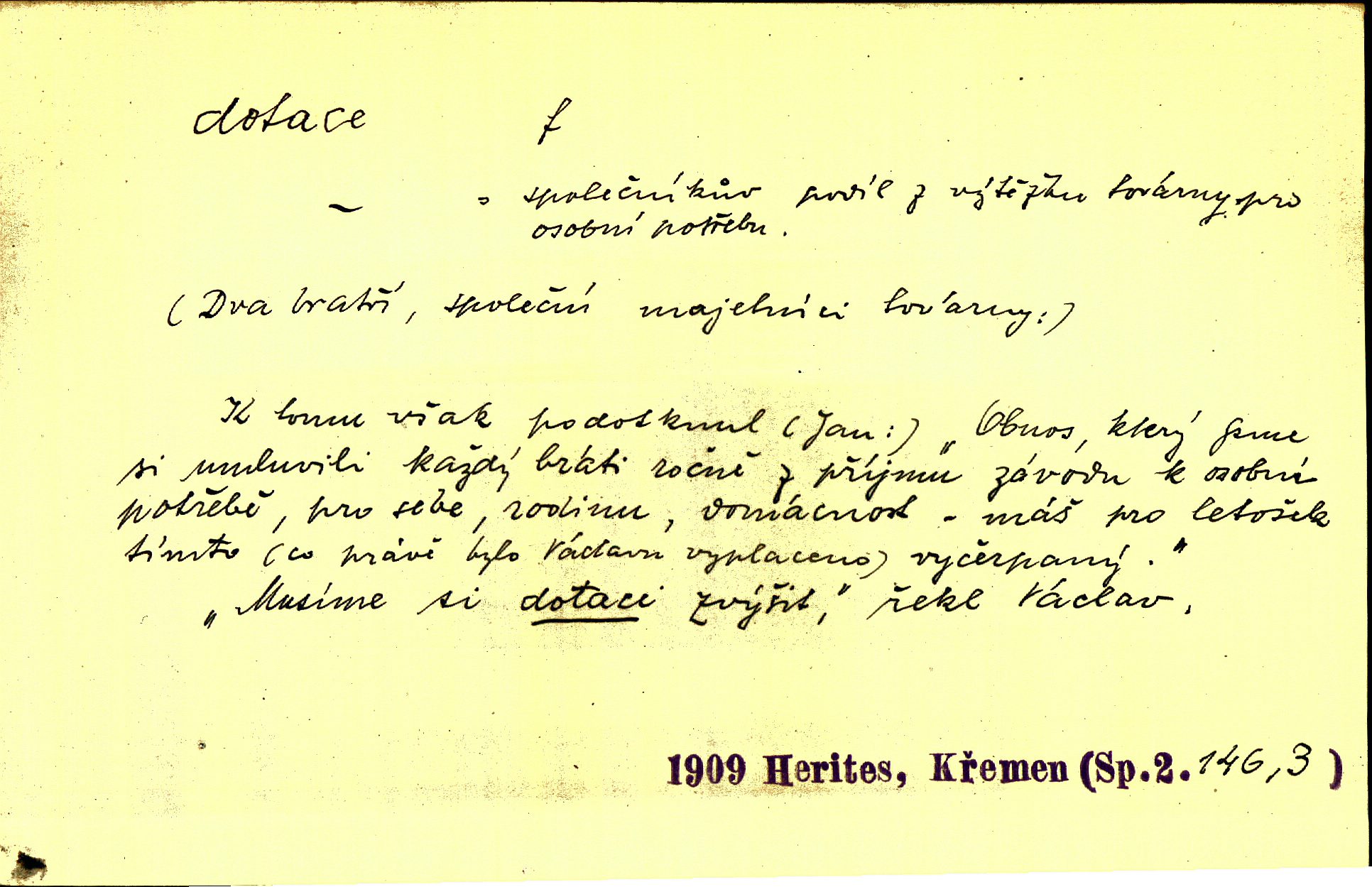 - dotace, -e f. pravidelný příděl peněz, zvl. nějakému ústavu n. úřadu, veřejné korporaci n. jednotlivcům. Státní a soukromá dotace. Řádná, mimořádná dotace (op. subvence, podpora). Žert. Měl jsem jednoho takového pátkáře [žebráka]‚ jehož dotaci určil jsem, nevím už proč, na dva krejcary týdně. Ner.