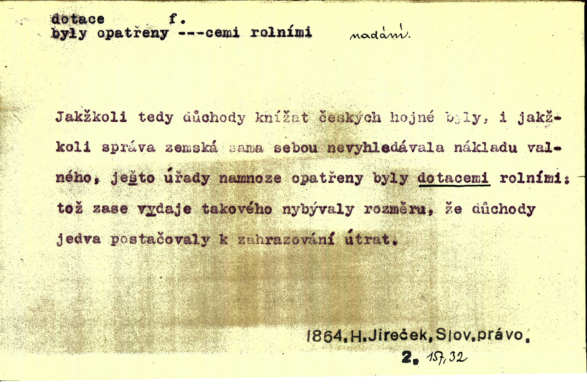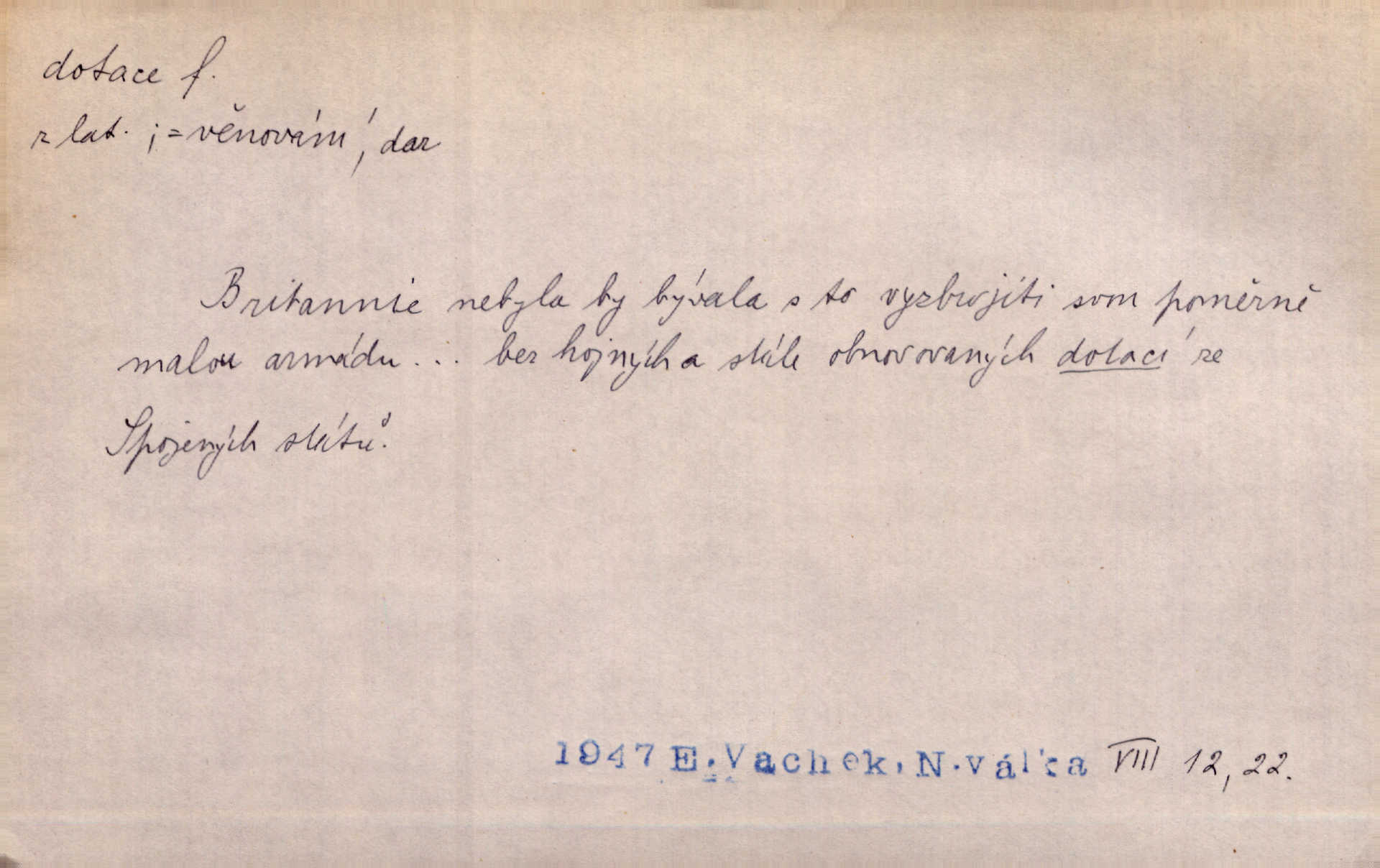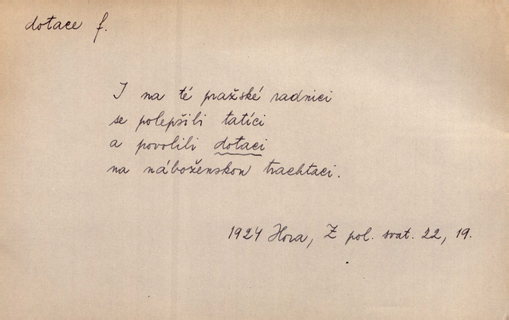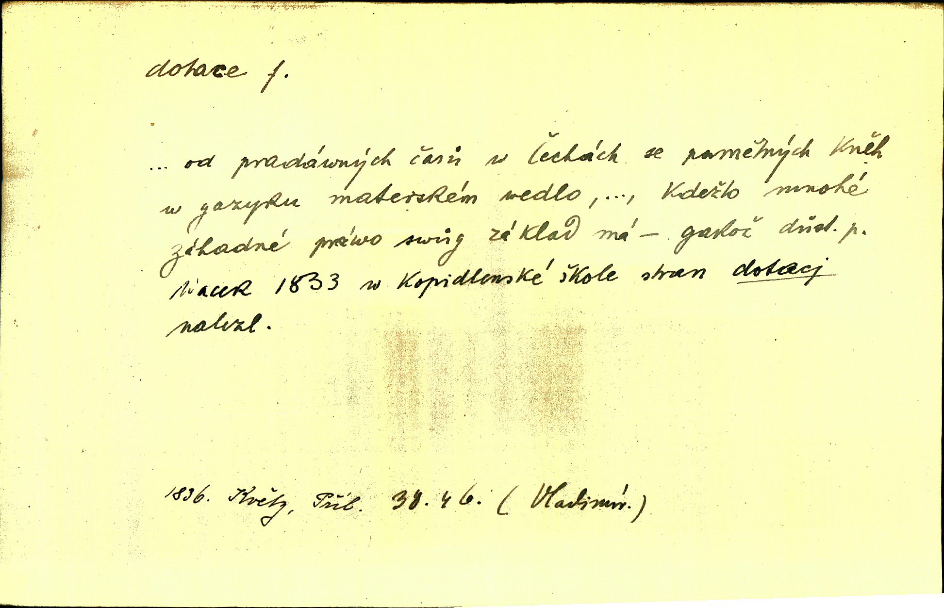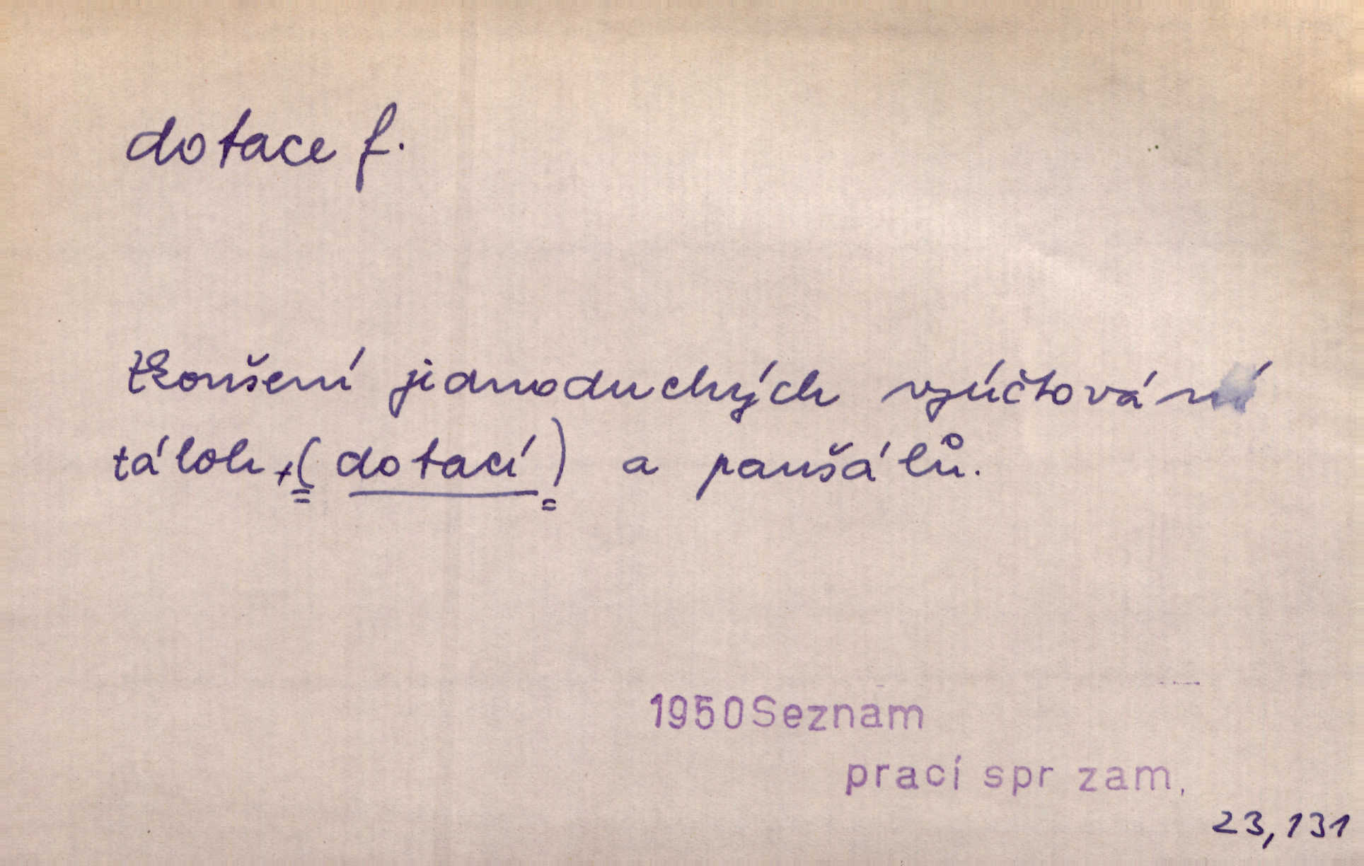 - dotace, -e f. pravidelný příděl peněz, zvl. nějakému ústavu n. úřadu, veřejné korporaci n. jednotlivcům. Státní a soukromá dotace. Řádná, mimořádná dotace (op. subvence, podpora). Žert. Měl jsem jednoho takového pátkáře [žebráka]‚ jehož dotaci určil jsem, nevím už proč, na dva krejcary týdně. Ner.