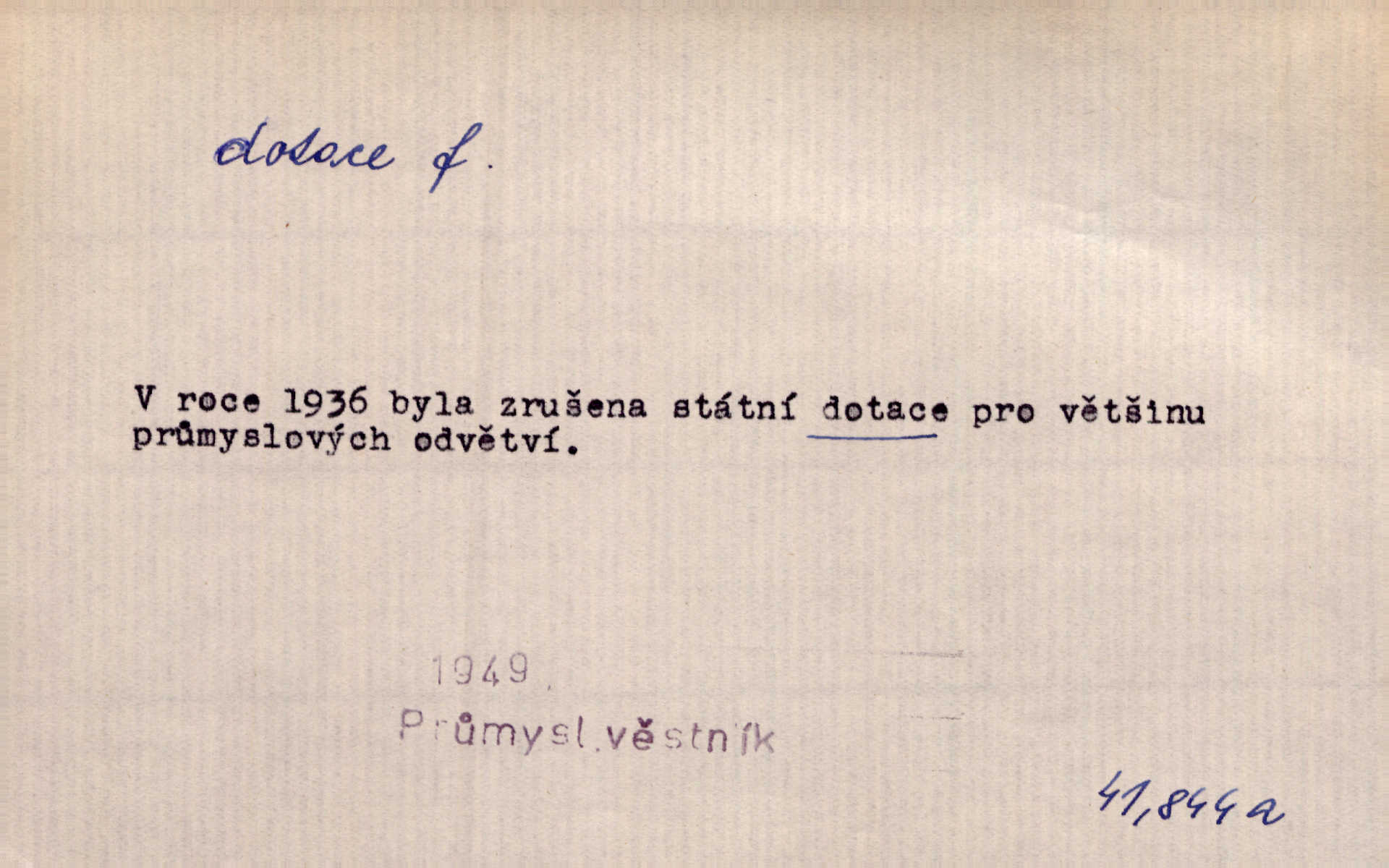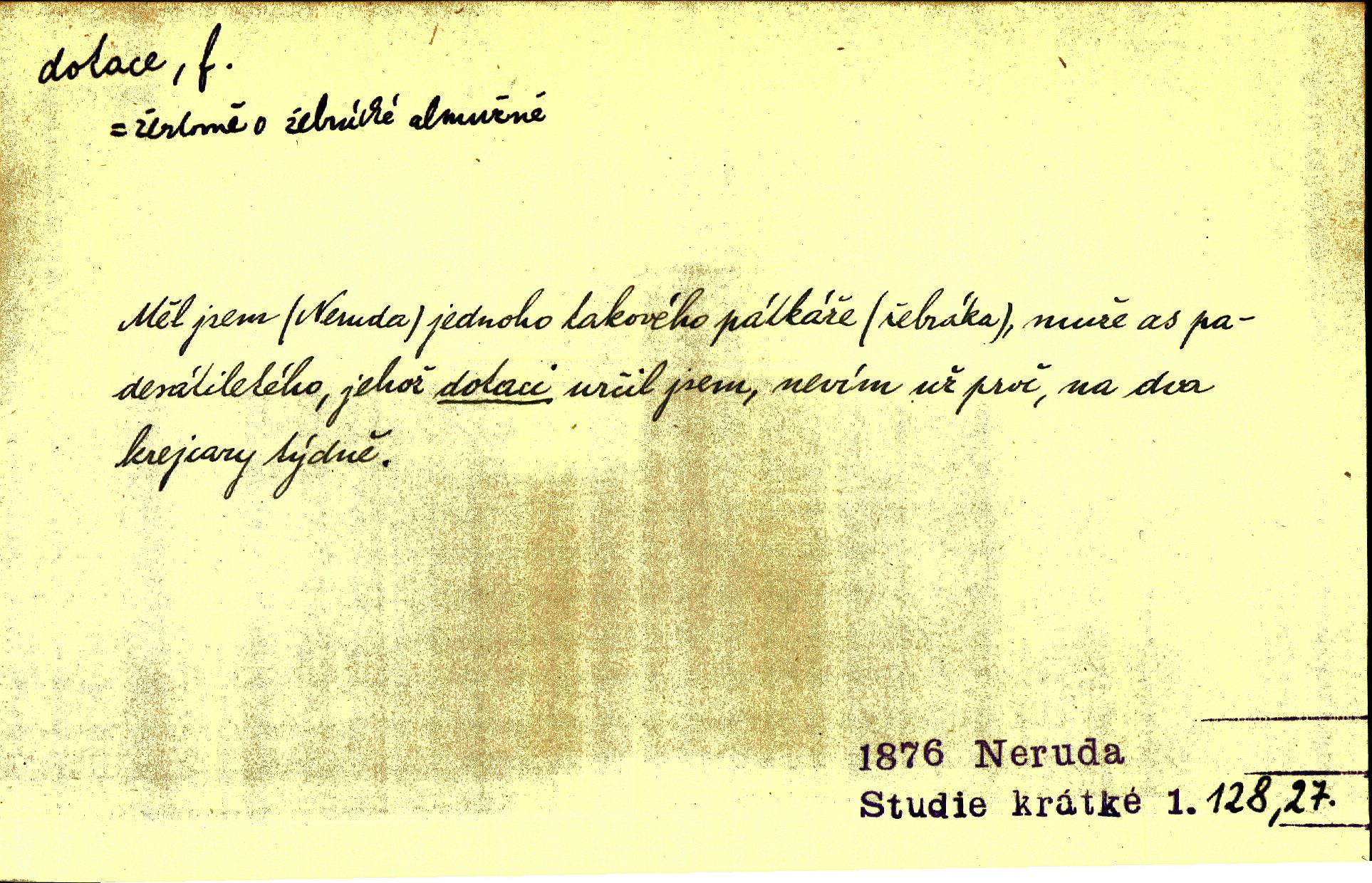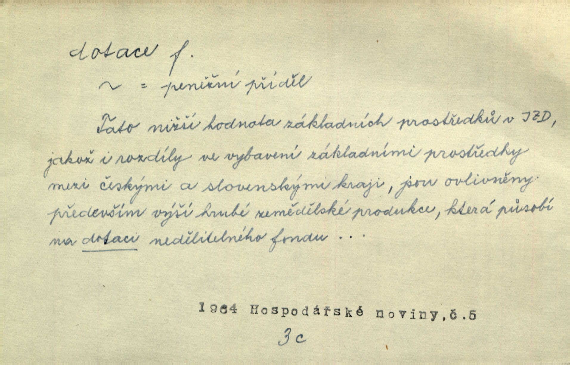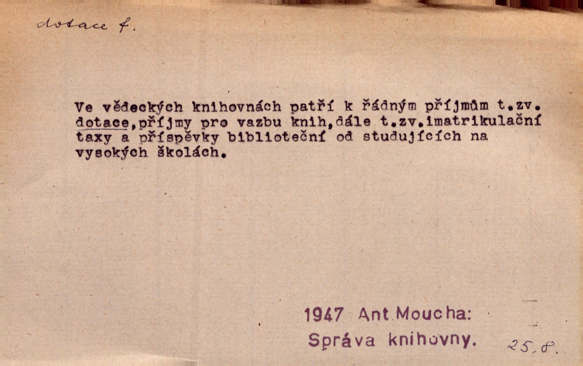 - dotace, -e f. pravidelný příděl peněz, zvl. nějakému ústavu n. úřadu, veřejné korporaci n. jednotlivcům. Státní a soukromá dotace. Řádná, mimořádná dotace (op. subvence, podpora). Žert. Měl jsem jednoho takového pátkáře [žebráka]‚ jehož dotaci určil jsem, nevím už proč, na dva krejcary týdně. Ner.
