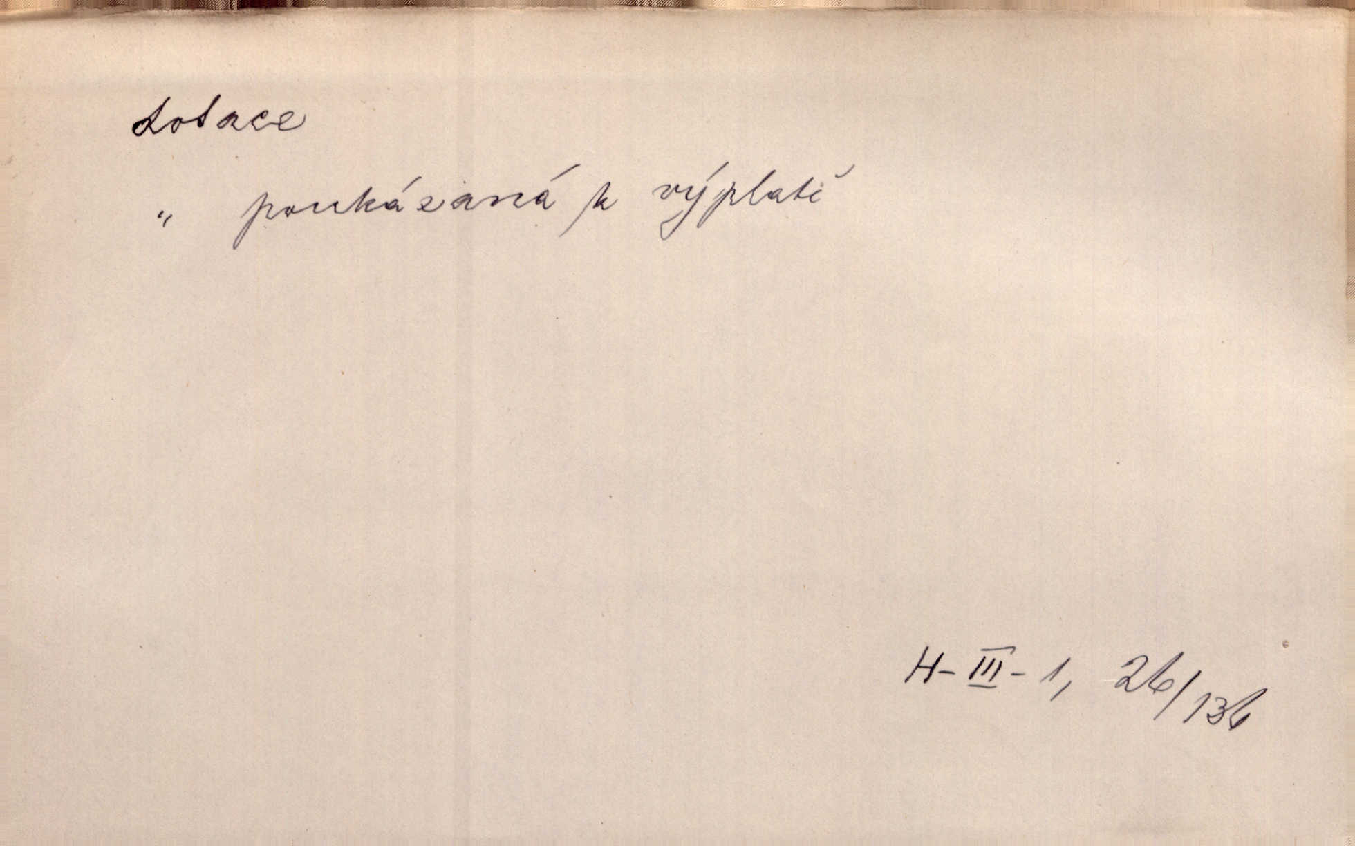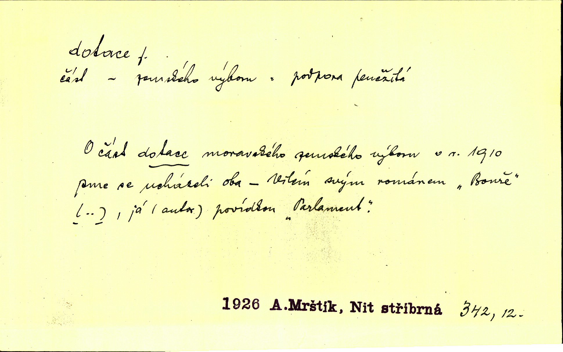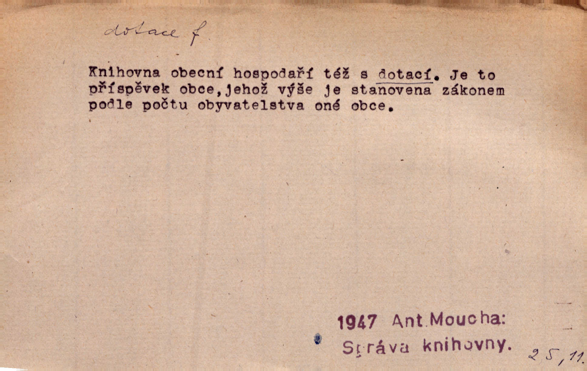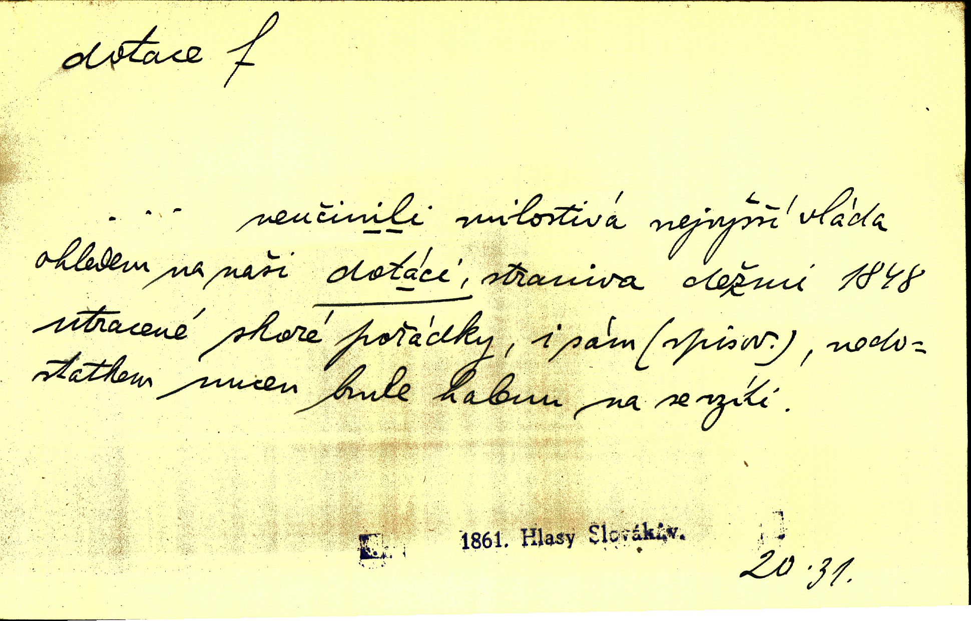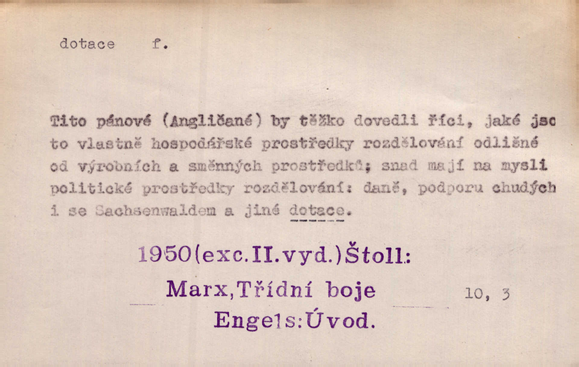 - dotace, -e f. pravidelný příděl peněz, zvl. nějakému ústavu n. úřadu, veřejné korporaci n. jednotlivcům. Státní a soukromá dotace. Řádná, mimořádná dotace (op. subvence, podpora). Žert. Měl jsem jednoho takového pátkáře [žebráka]‚ jehož dotaci určil jsem, nevím už proč, na dva krejcary týdně. Ner.