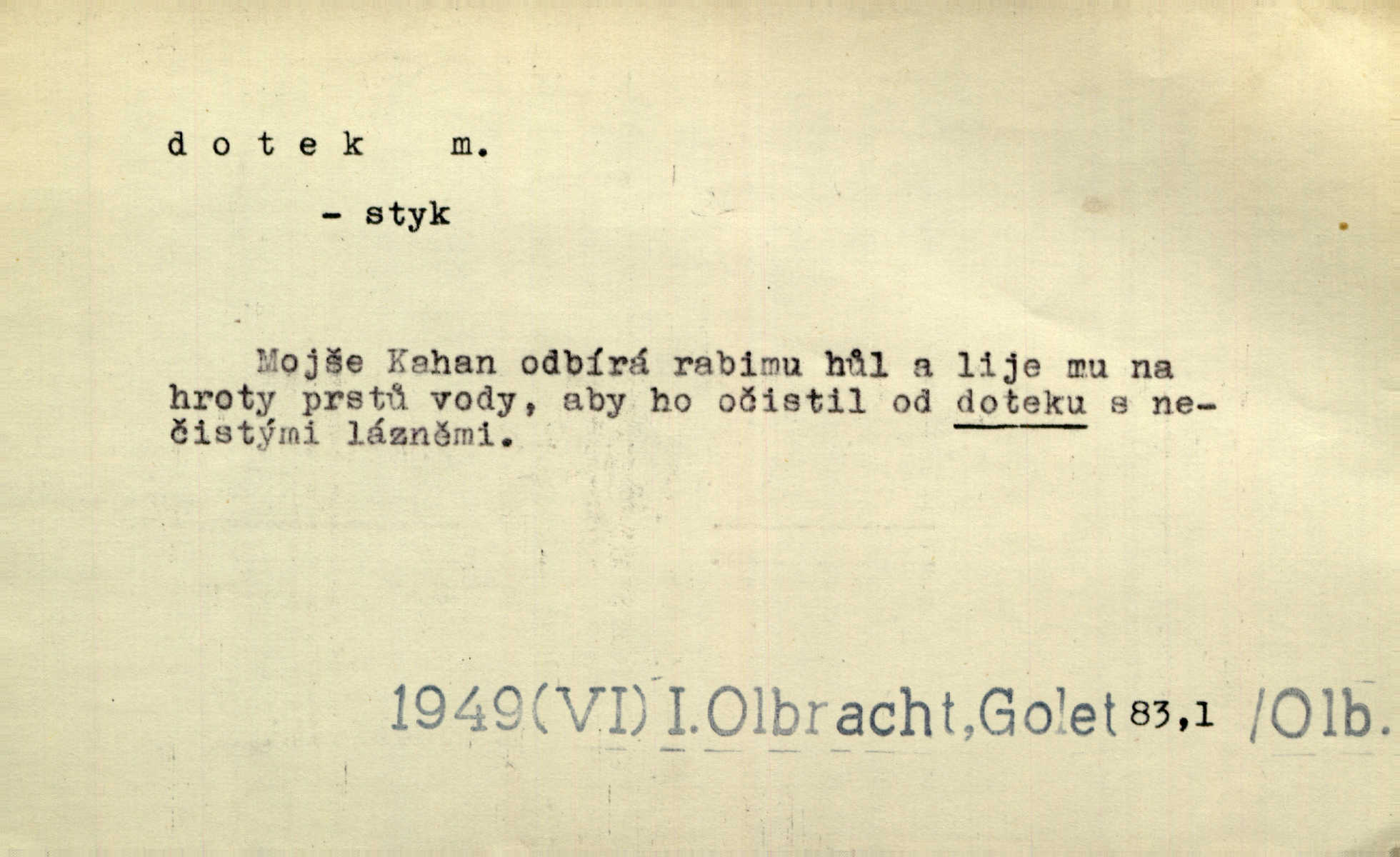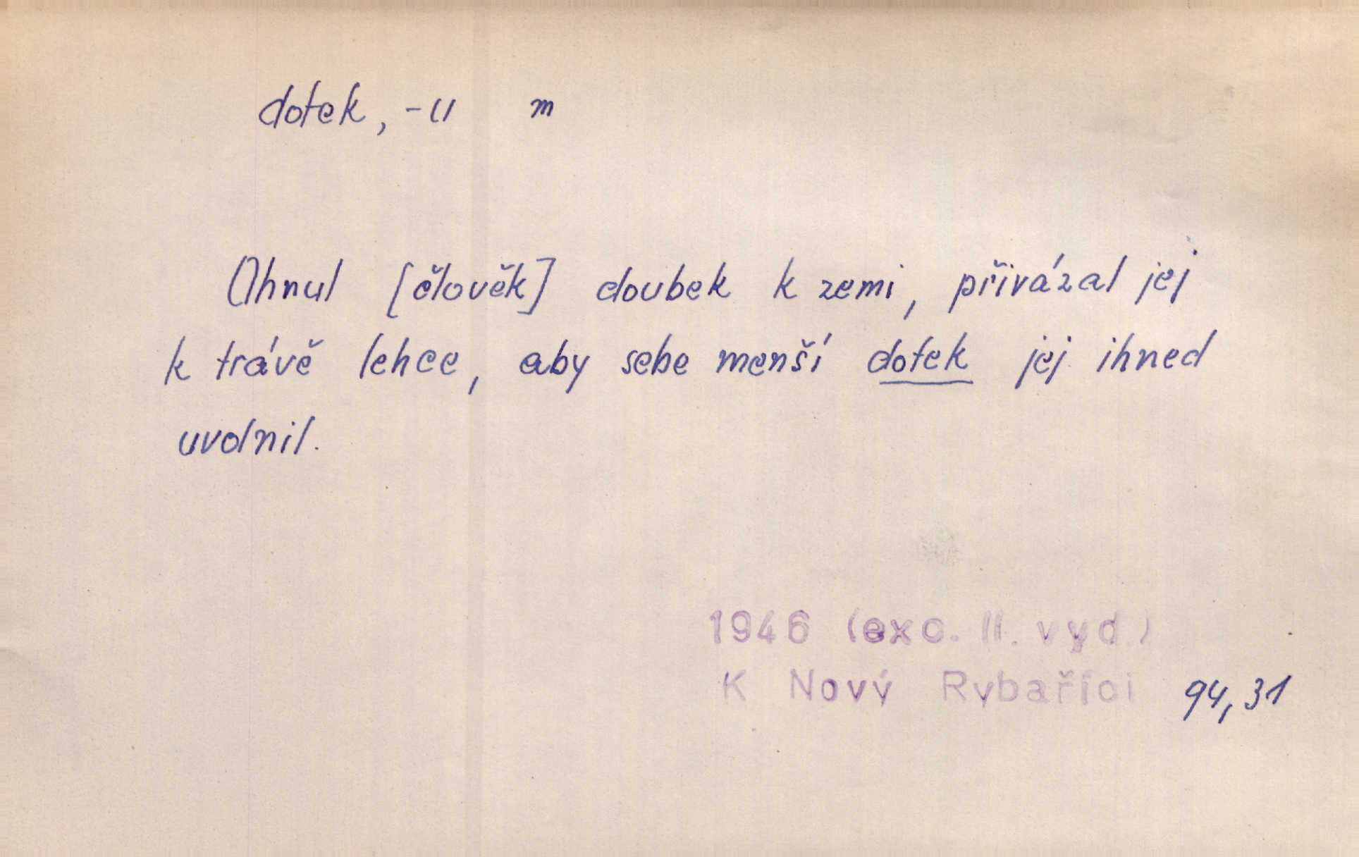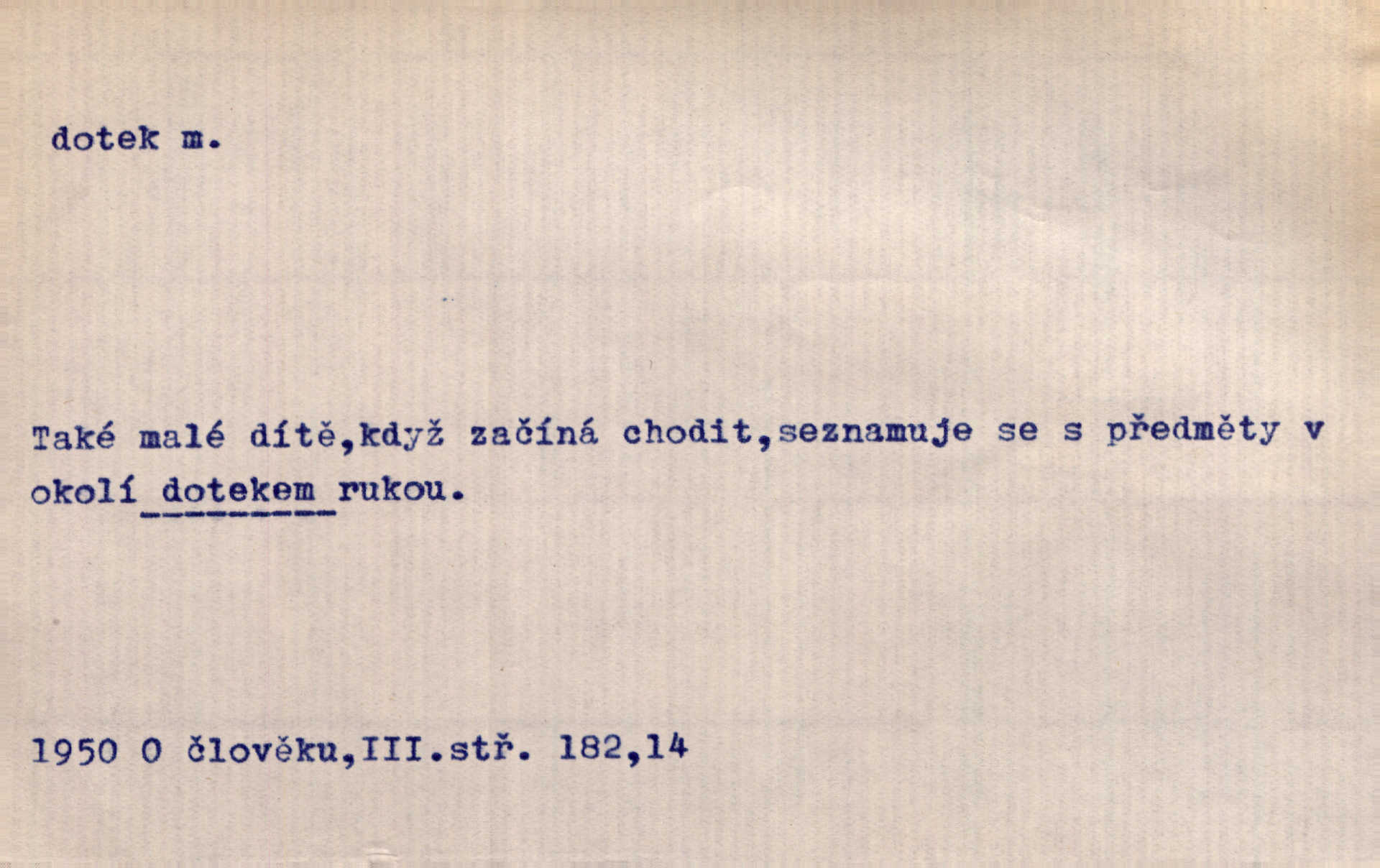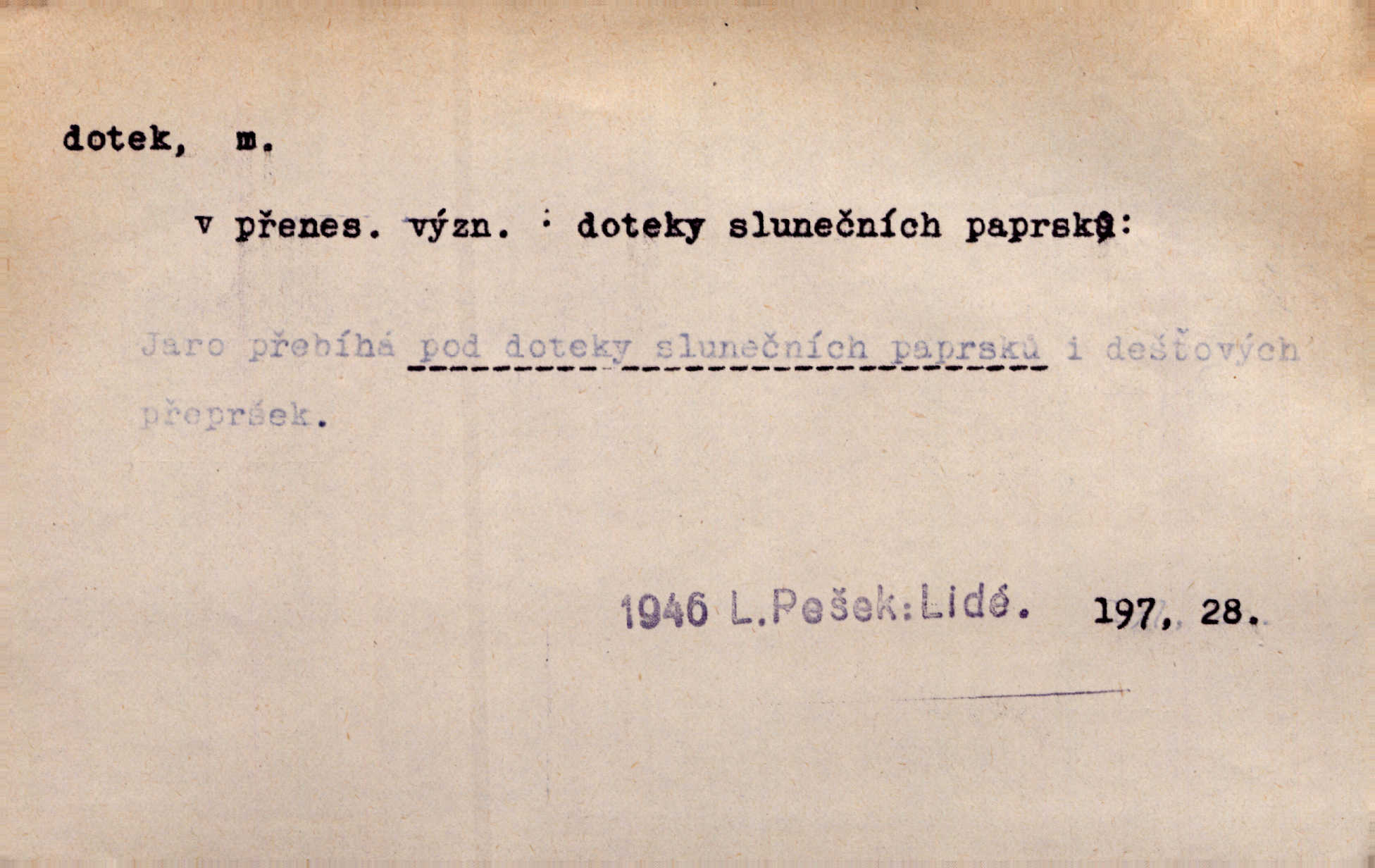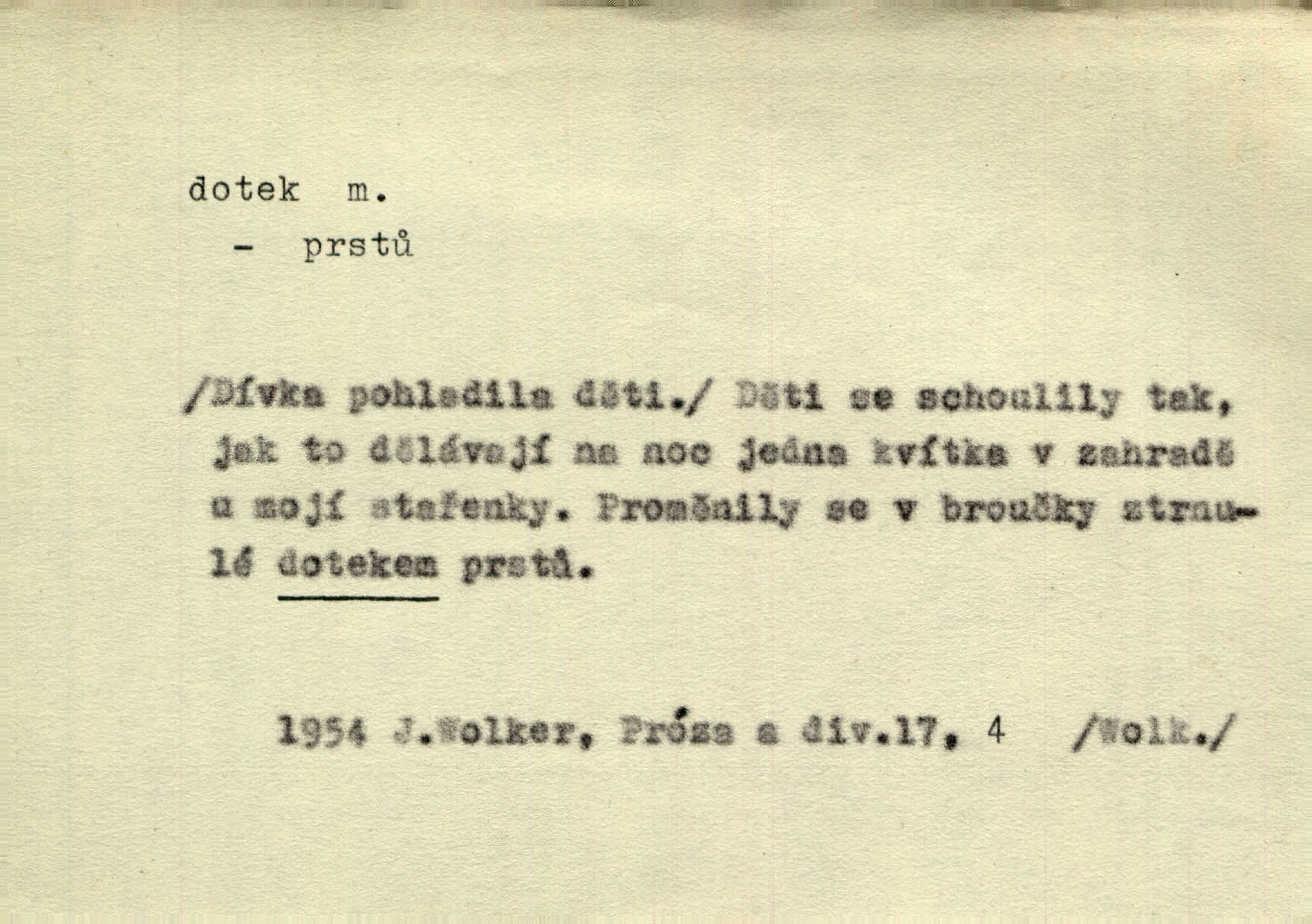 - dotek, -u m. dotknutí. Cítila, že se ta nemoc zrovna hrkotem z ní ztrácí pod teplými doteky starostlivé ruky. A. Mrš. Těl. Předklon s dotekem země dlaněmi. Těl. soust. Počal chápati krásu zvuku a rozkoš slunečního doteku. Olb. Ještě jako by cítila chladivý dotek vody pramene. Dyk. D El. tech. spojení dvou vodičů, jimiž prochází elektrický proud, kontakt. Geom. dotek dvojný, dotek křivek, ploch. Sr. dotyk.