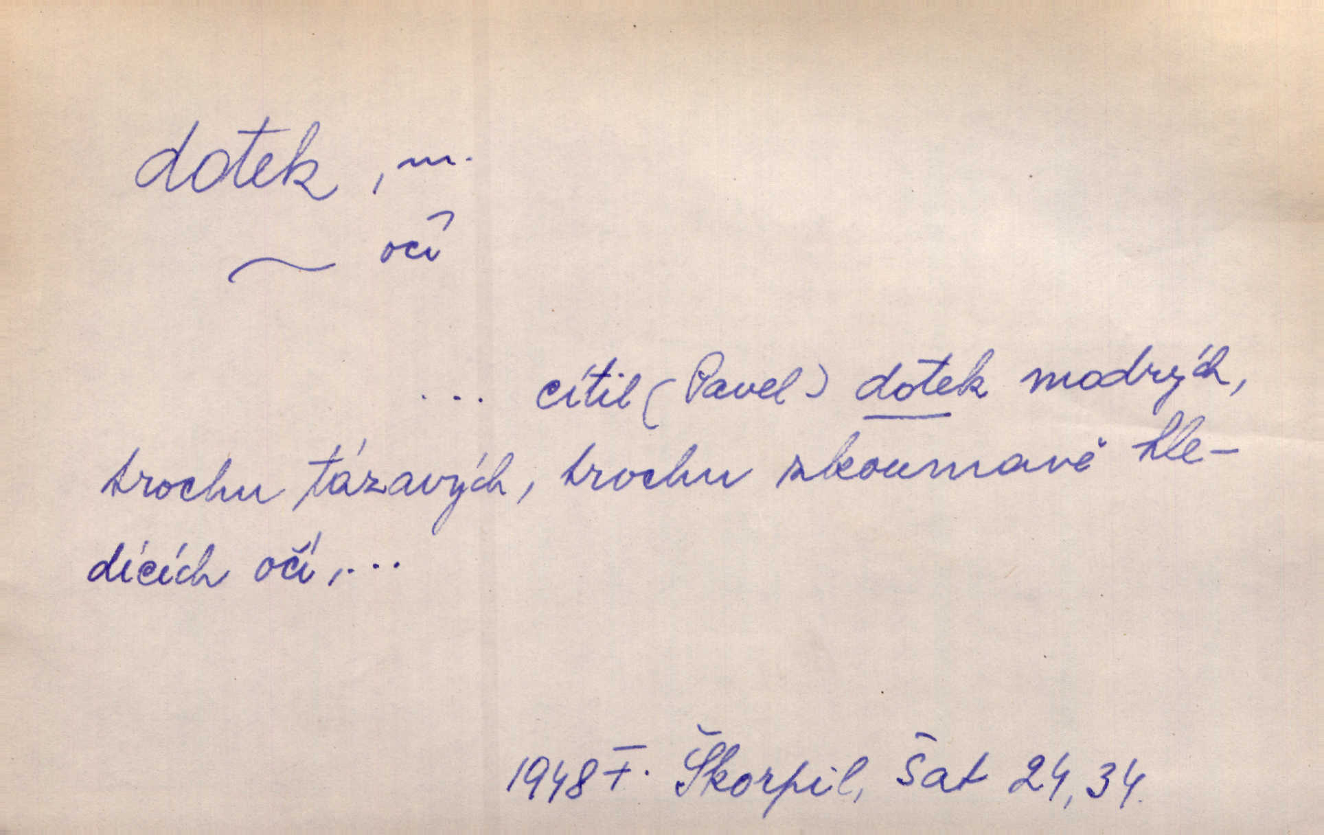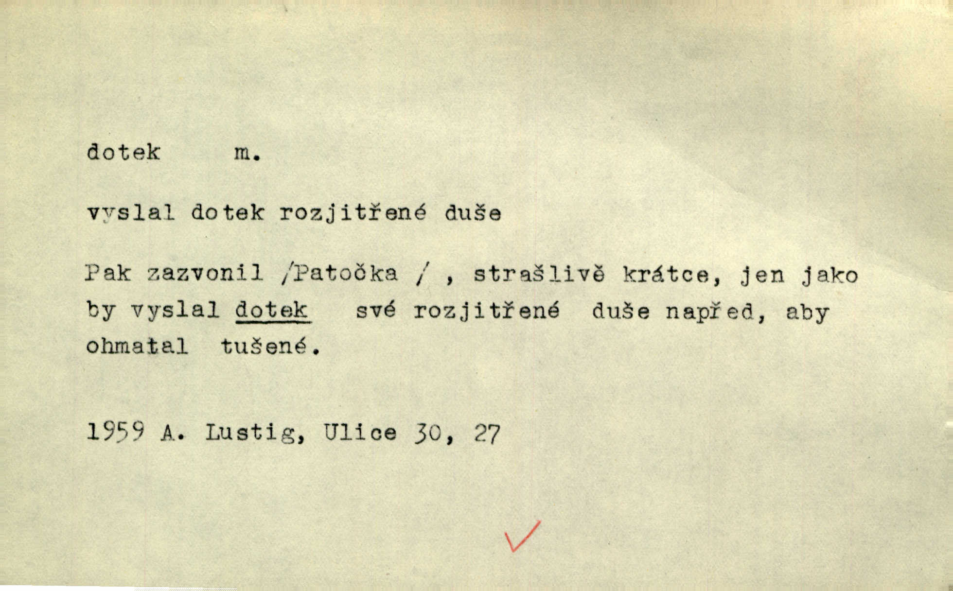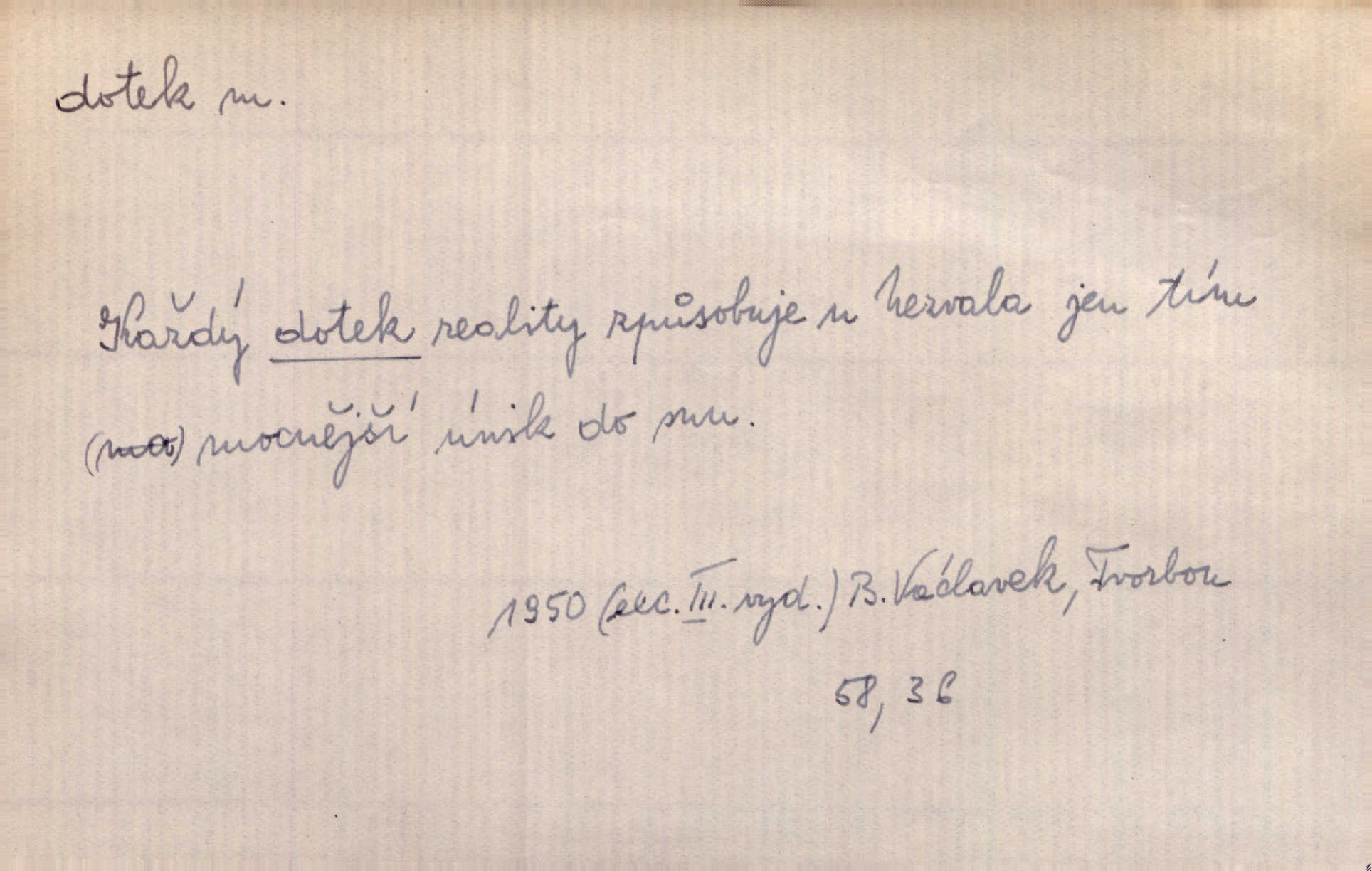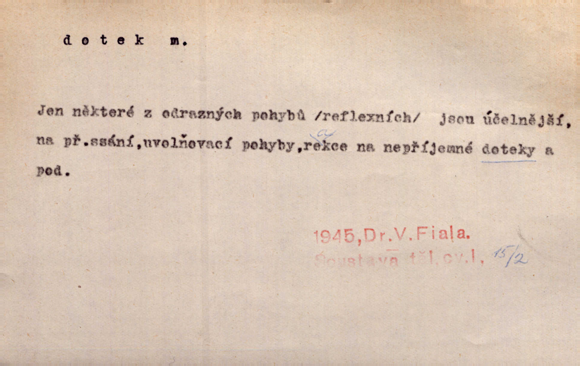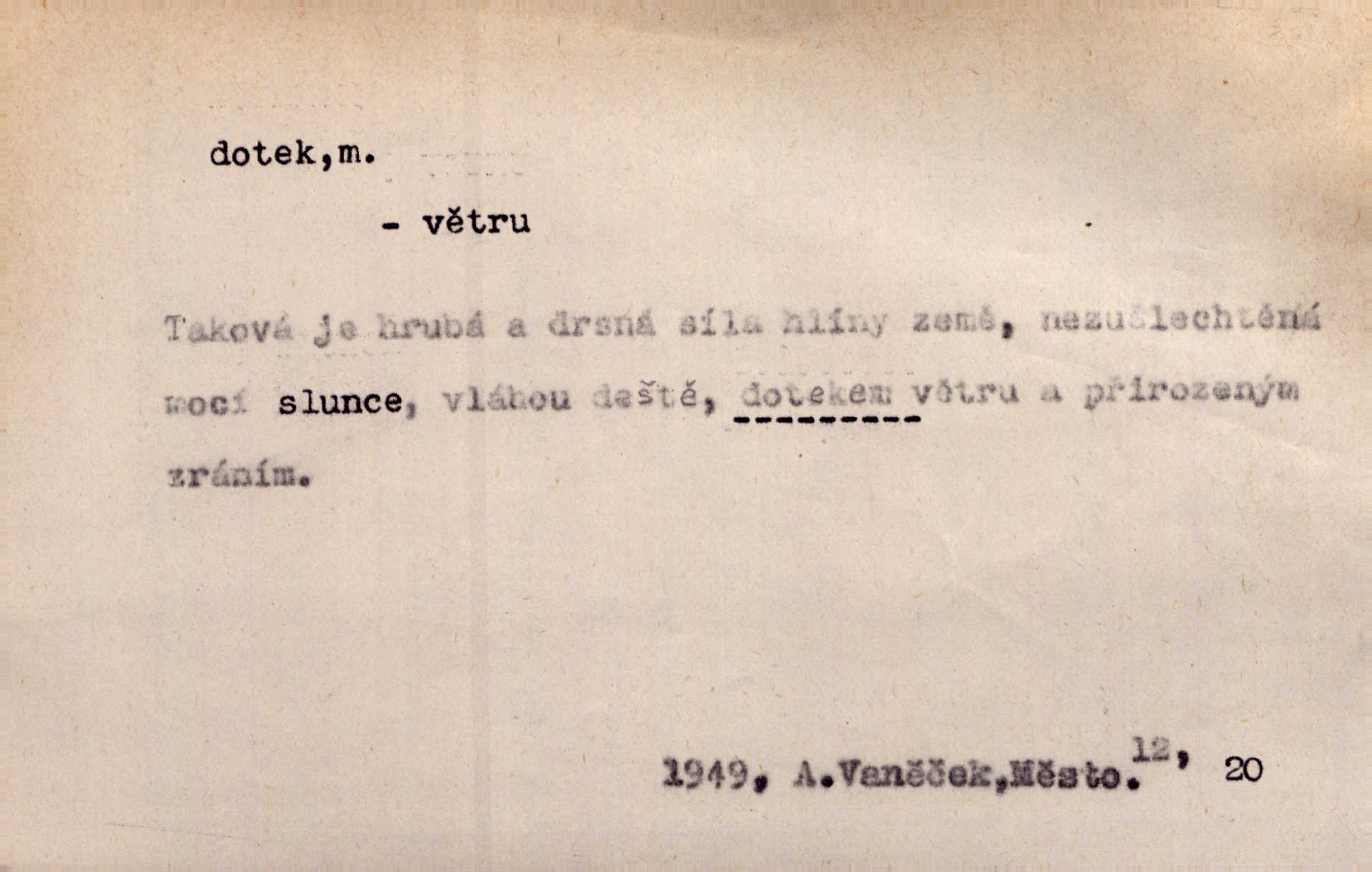 - dotek, -u m. dotknutí. Cítila, že se ta nemoc zrovna hrkotem z ní ztrácí pod teplými doteky starostlivé ruky. A. Mrš. Těl. Předklon s dotekem země dlaněmi. Těl. soust. Počal chápati krásu zvuku a rozkoš slunečního doteku. Olb. Ještě jako by cítila chladivý dotek vody pramene. Dyk. D El. tech. spojení dvou vodičů, jimiž prochází elektrický proud, kontakt. Geom. dotek dvojný, dotek křivek, ploch. Sr. dotyk.