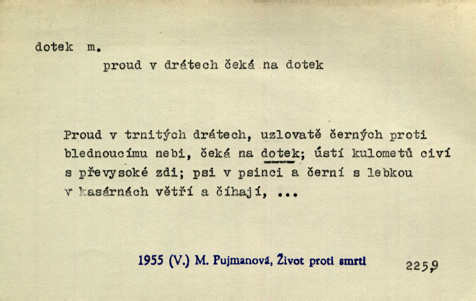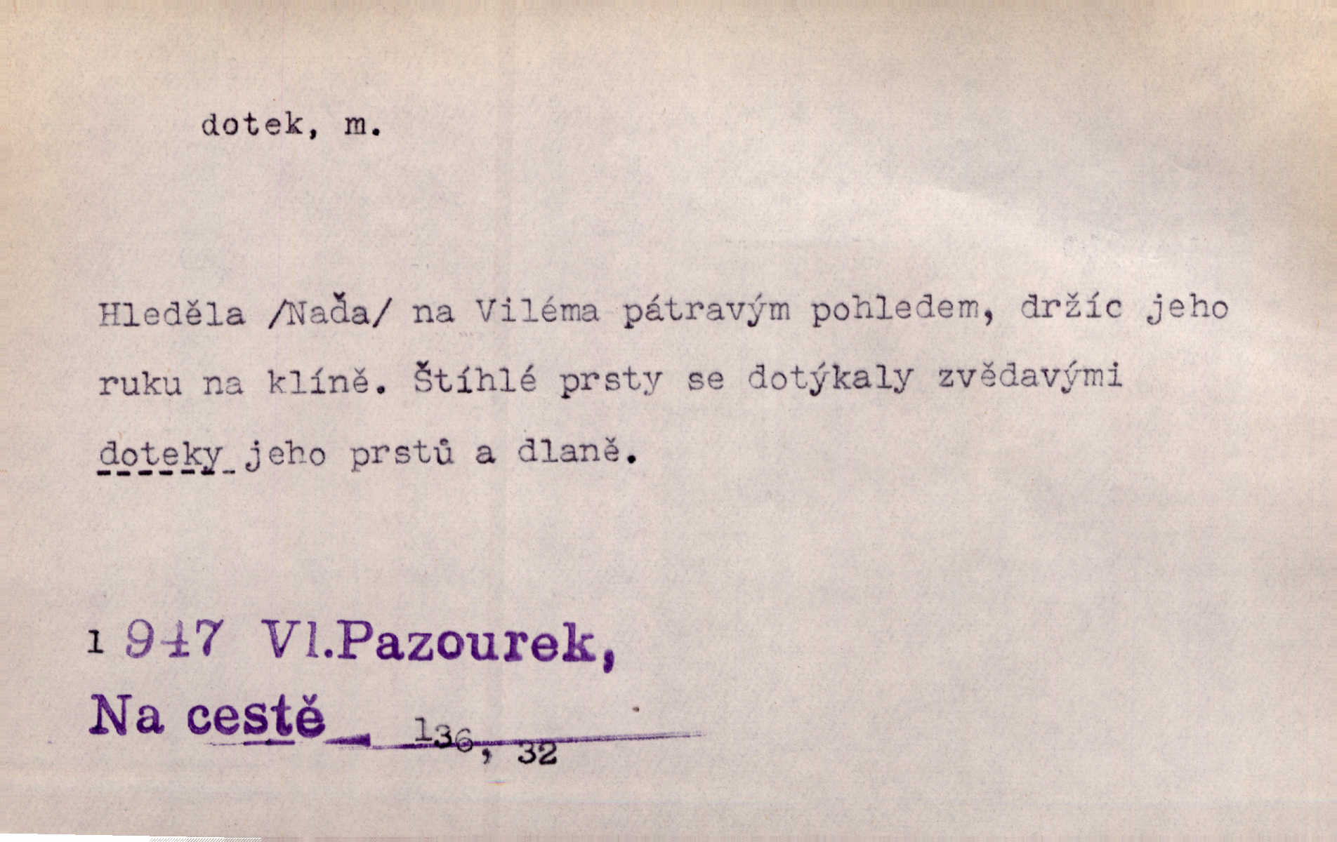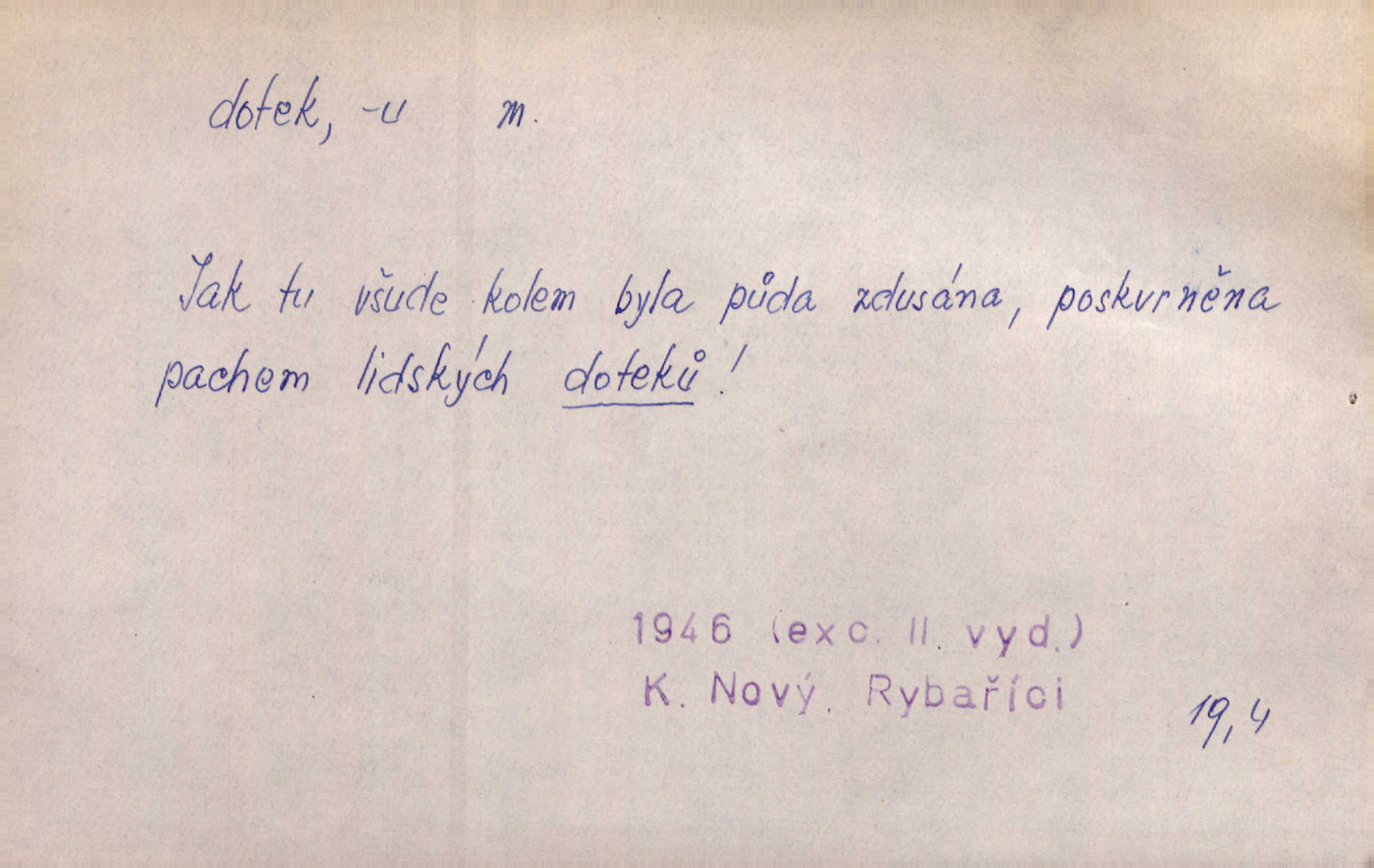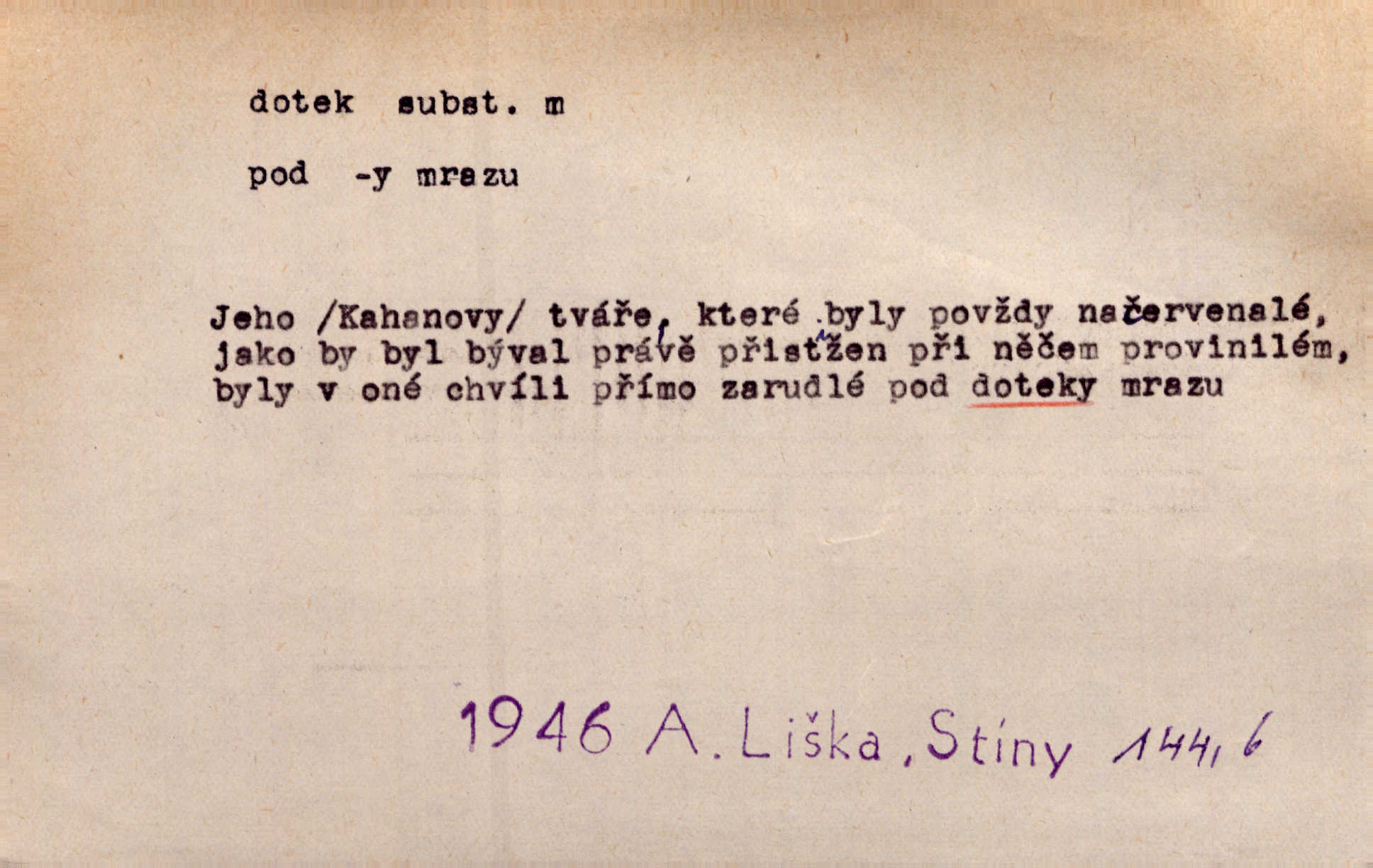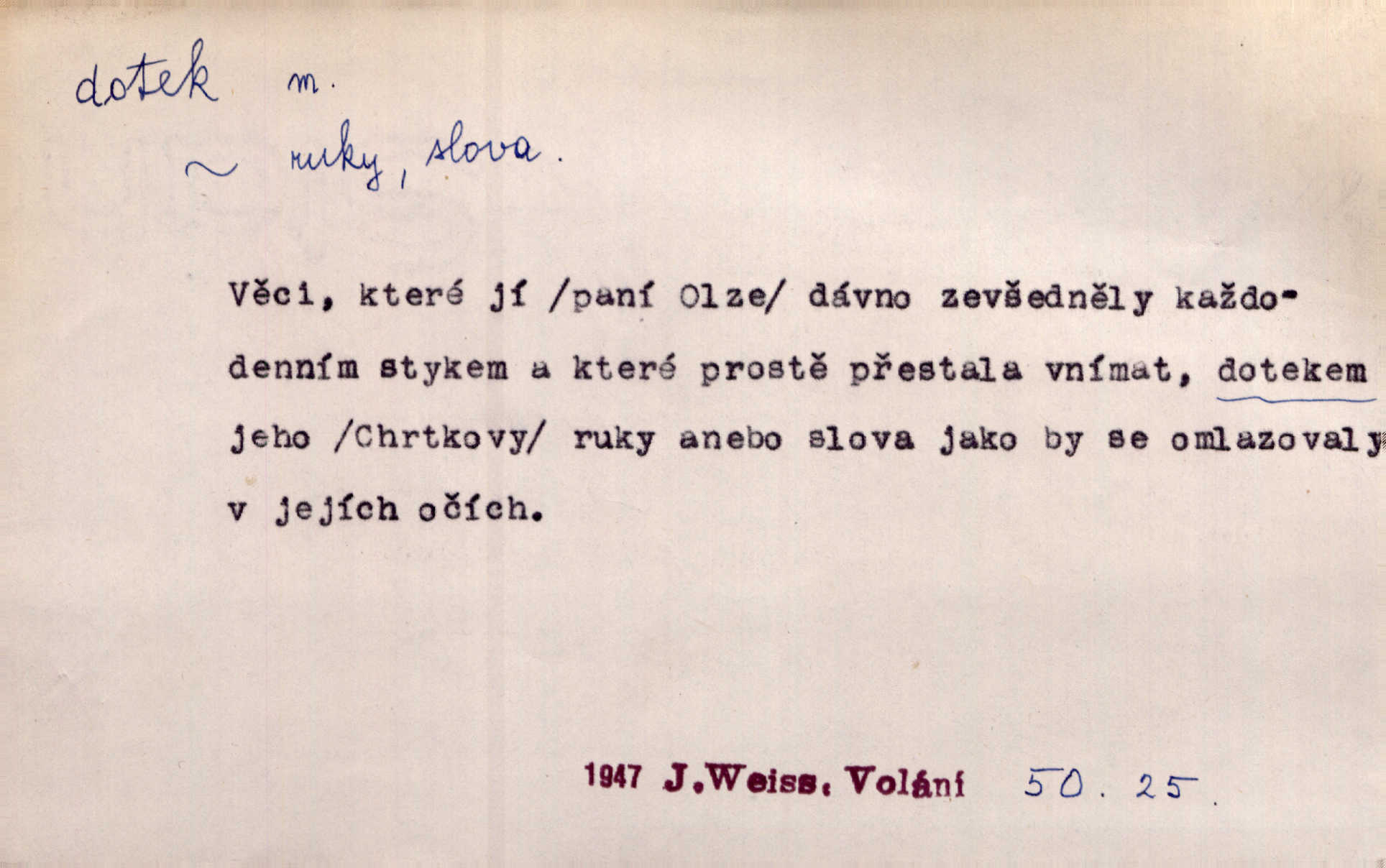 - dotek, -u m. dotknutí. Cítila, že se ta nemoc zrovna hrkotem z ní ztrácí pod teplými doteky starostlivé ruky. A. Mrš. Těl. Předklon s dotekem země dlaněmi. Těl. soust. Počal chápati krásu zvuku a rozkoš slunečního doteku. Olb. Ještě jako by cítila chladivý dotek vody pramene. Dyk. D El. tech. spojení dvou vodičů, jimiž prochází elektrický proud, kontakt. Geom. dotek dvojný, dotek křivek, ploch. Sr. dotyk.