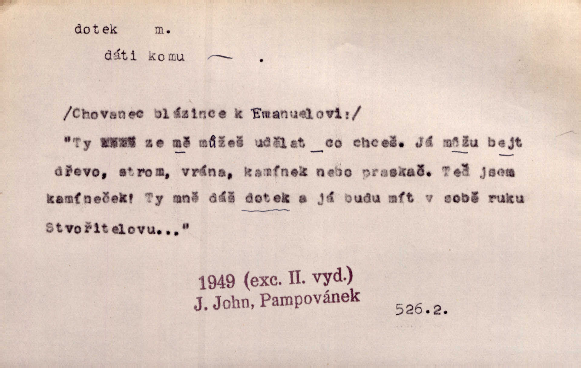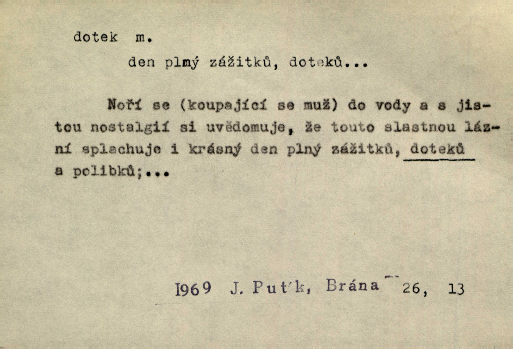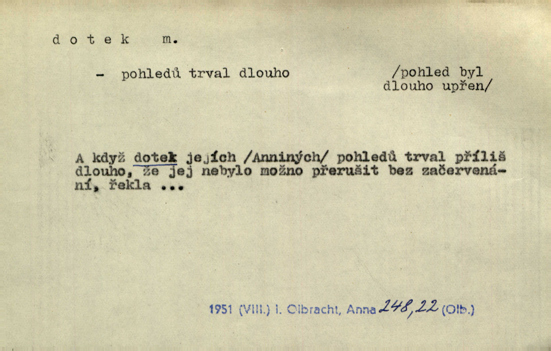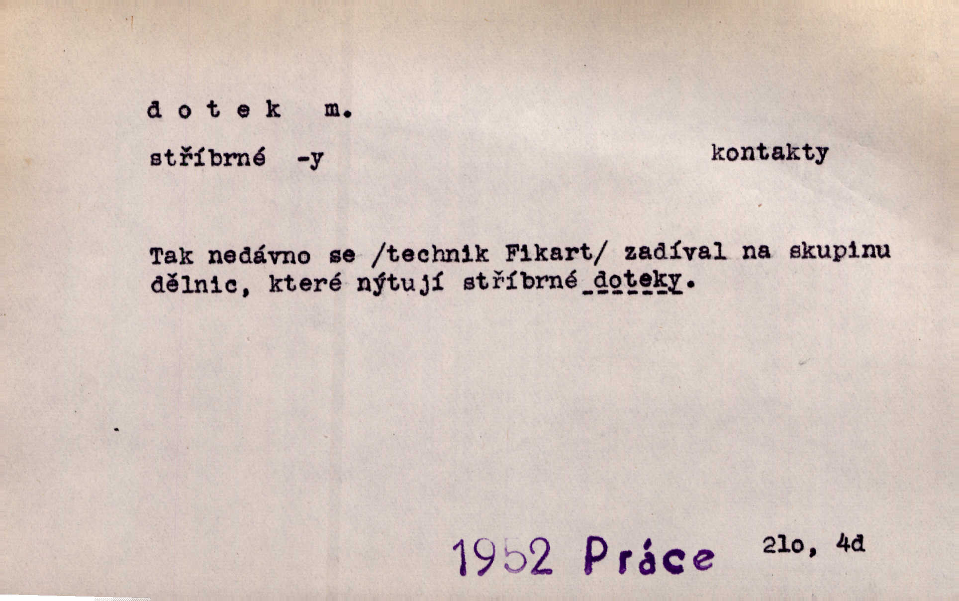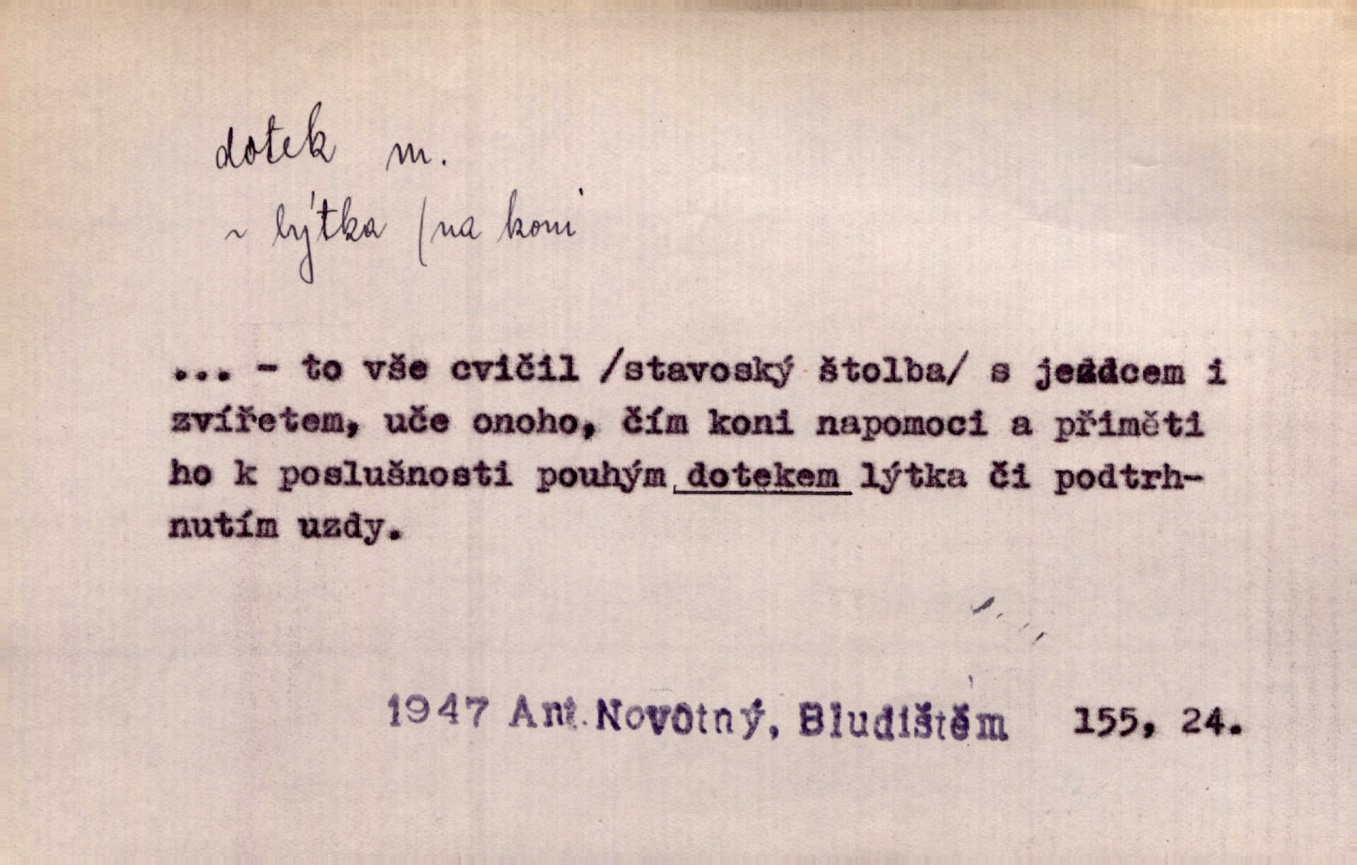- dotek, -u m. dotknutí. Cítila, že se ta nemoc zrovna hrkotem z ní ztrácí pod teplými doteky starostlivé ruky. A. Mrš. Těl. Předklon s dotekem země dlaněmi. Těl. soust. Počal chápati krásu zvuku a rozkoš slunečního doteku. Olb. Ještě jako by cítila chladivý dotek vody pramene. Dyk. D El. tech. spojení dvou vodičů, jimiž prochází elektrický proud, kontakt. Geom. dotek dvojný, dotek křivek, ploch. Sr. dotyk.