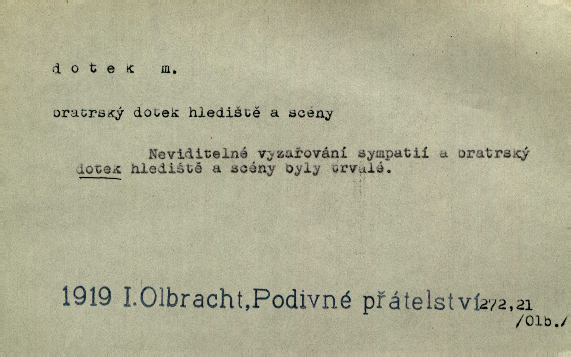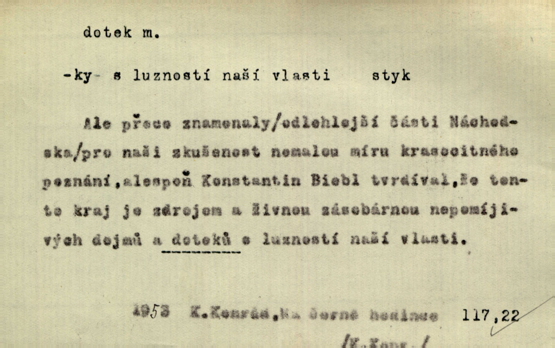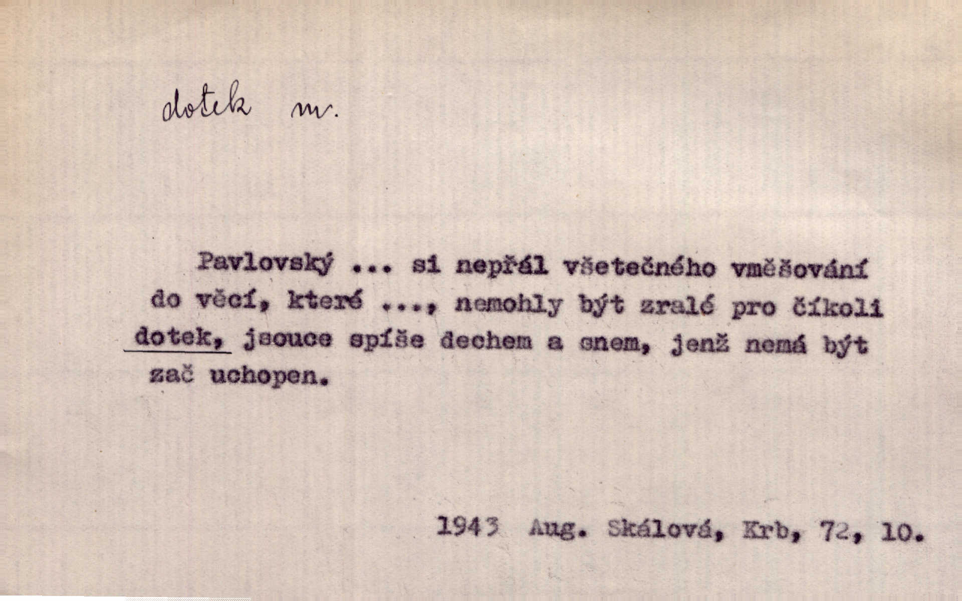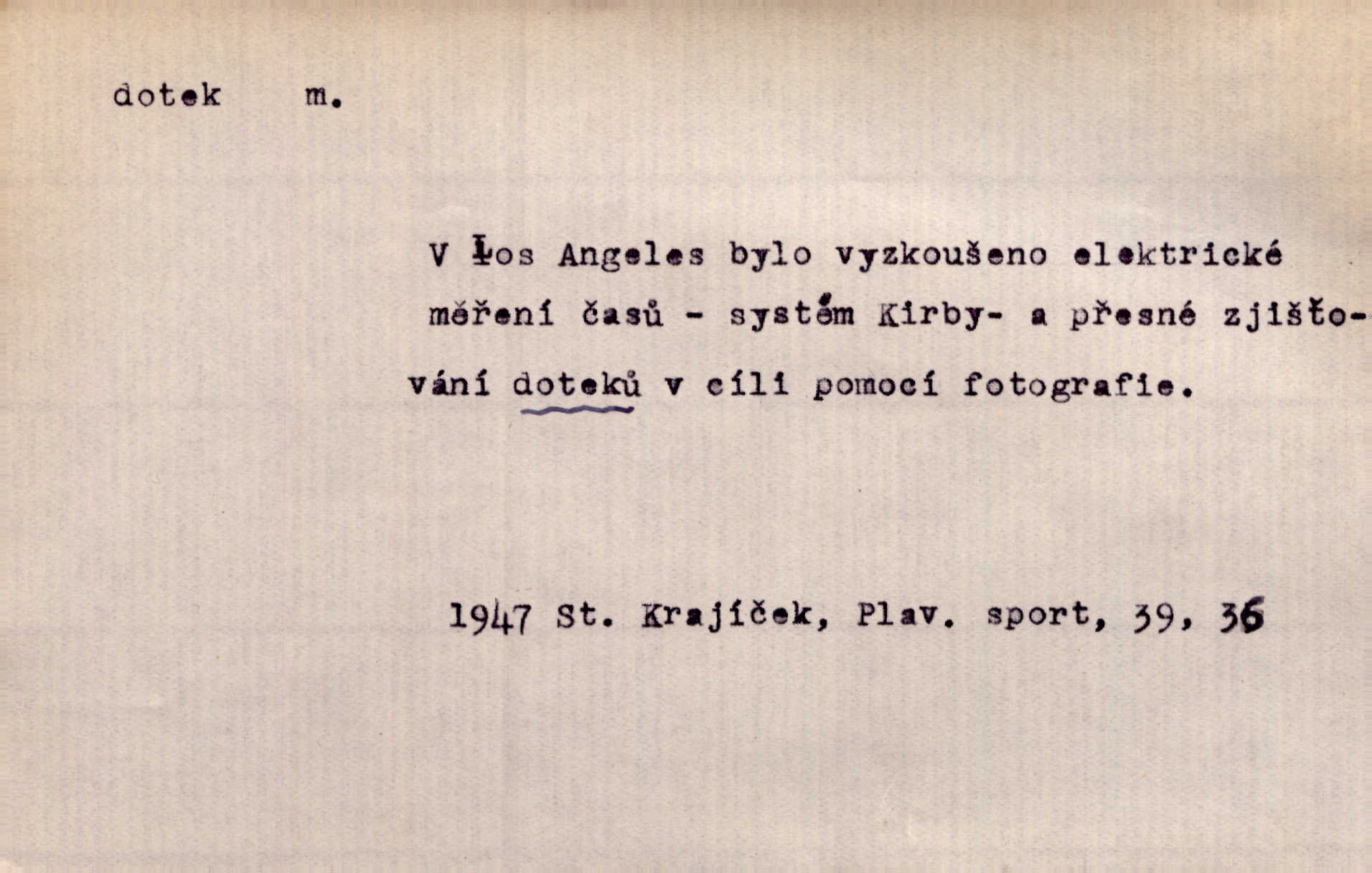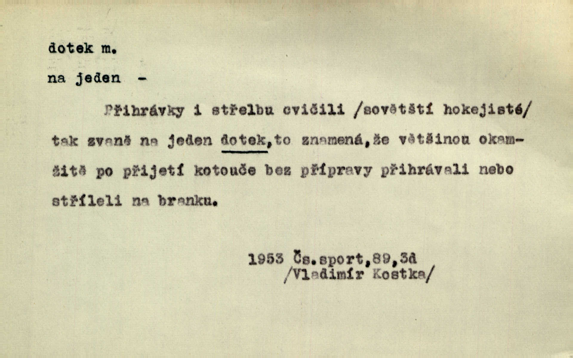 - dotek, -u m. dotknutí. Cítila, že se ta nemoc zrovna hrkotem z ní ztrácí pod teplými doteky starostlivé ruky. A. Mrš. Těl. Předklon s dotekem země dlaněmi. Těl. soust. Počal chápati krásu zvuku a rozkoš slunečního doteku. Olb. Ještě jako by cítila chladivý dotek vody pramene. Dyk. D El. tech. spojení dvou vodičů, jimiž prochází elektrický proud, kontakt. Geom. dotek dvojný, dotek křivek, ploch. Sr. dotyk.