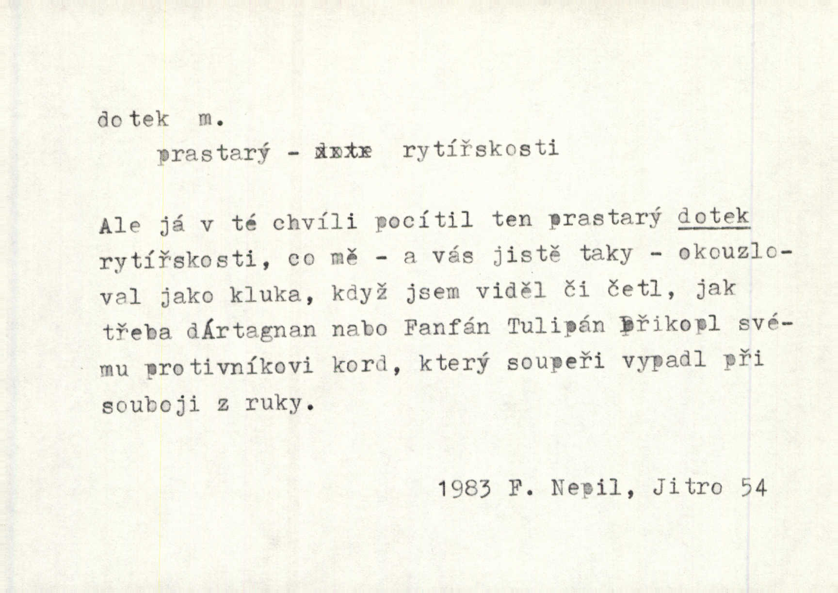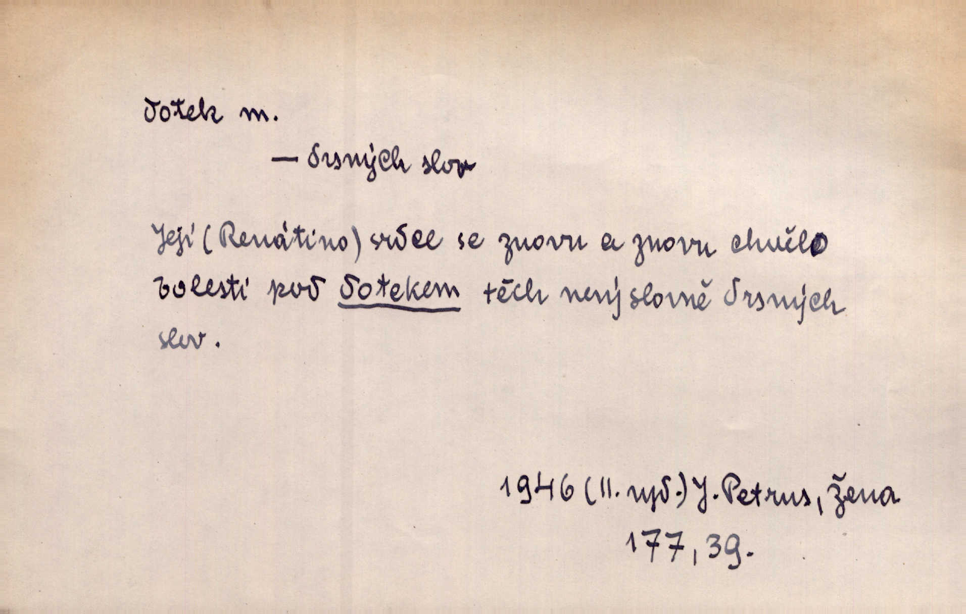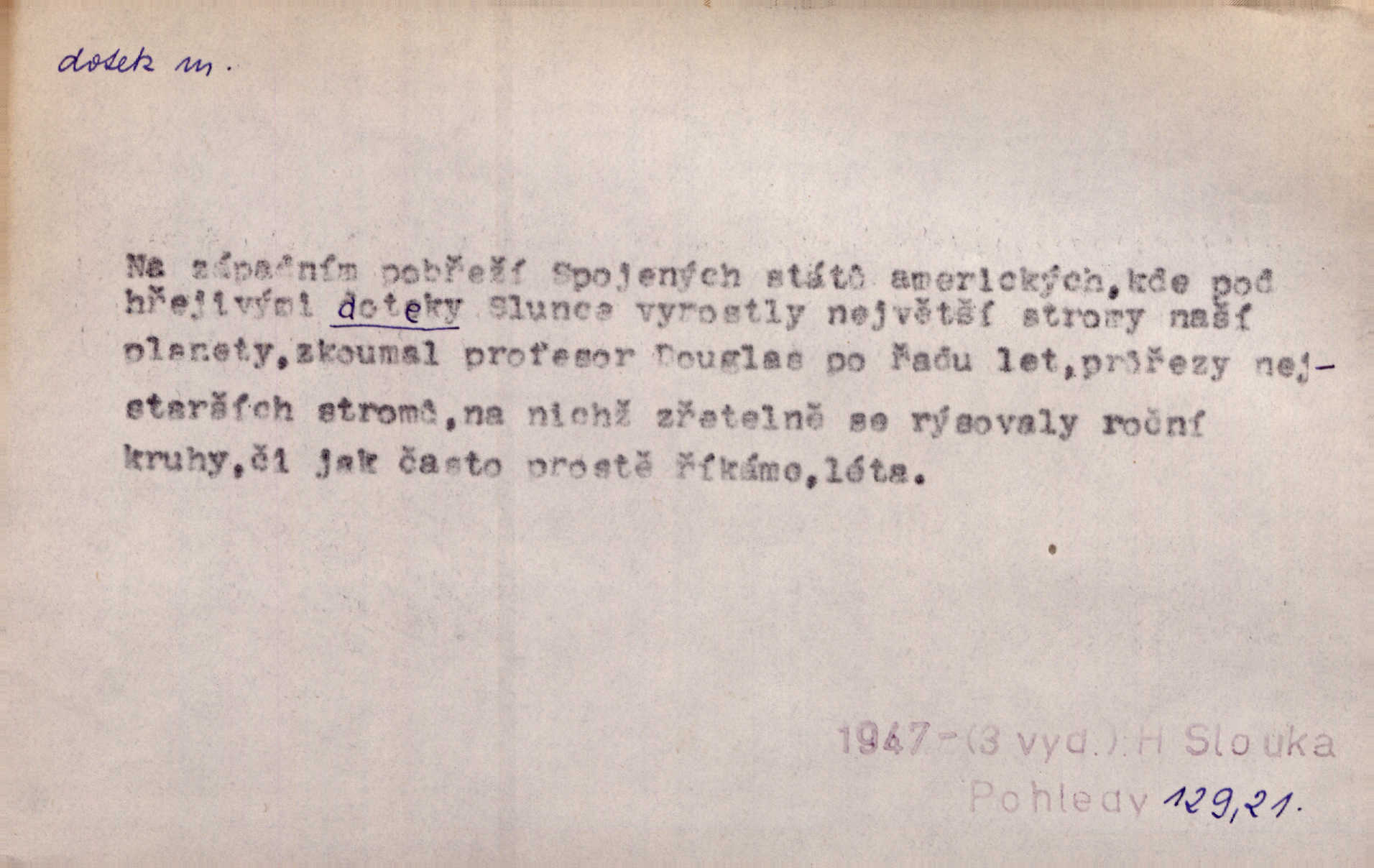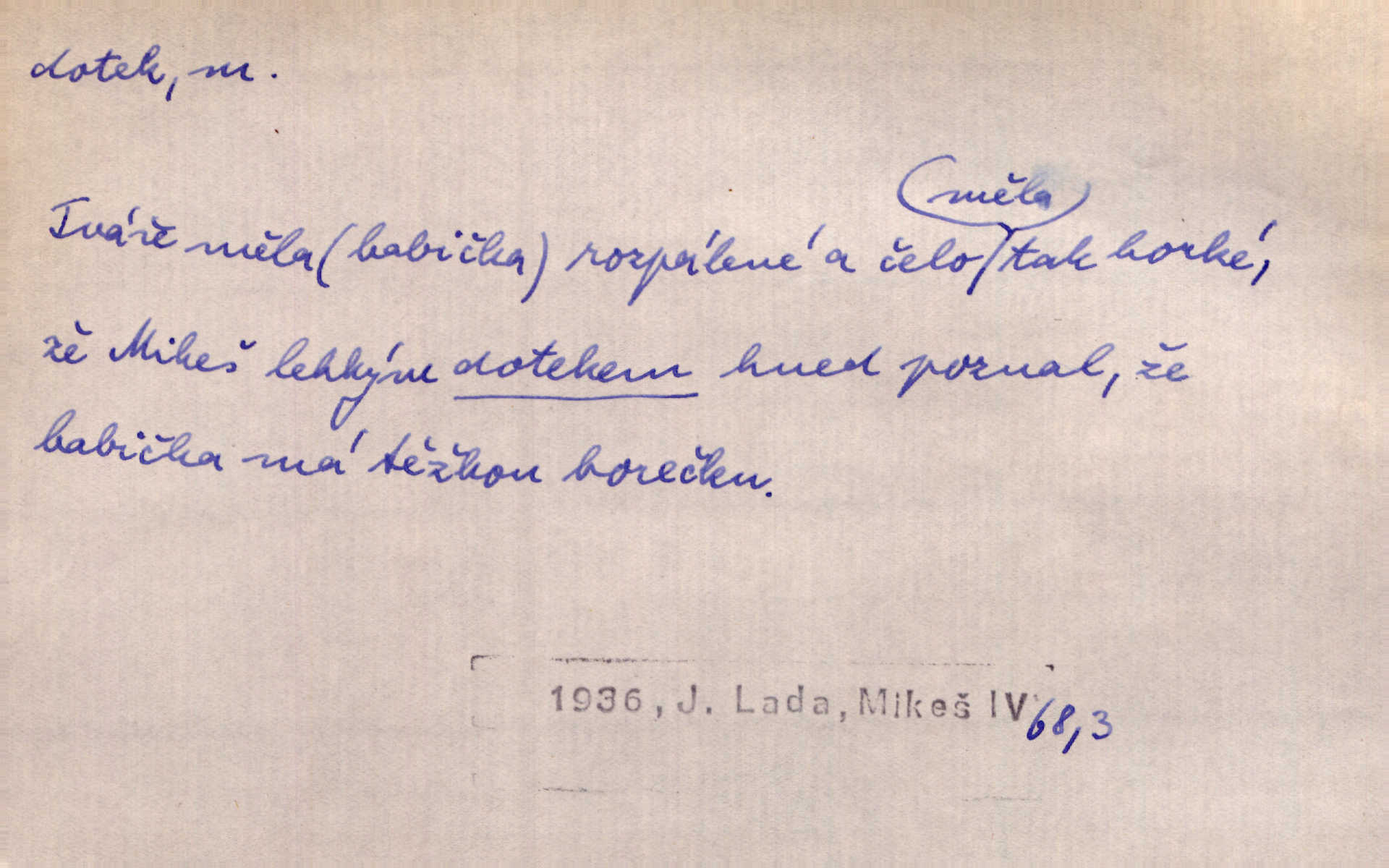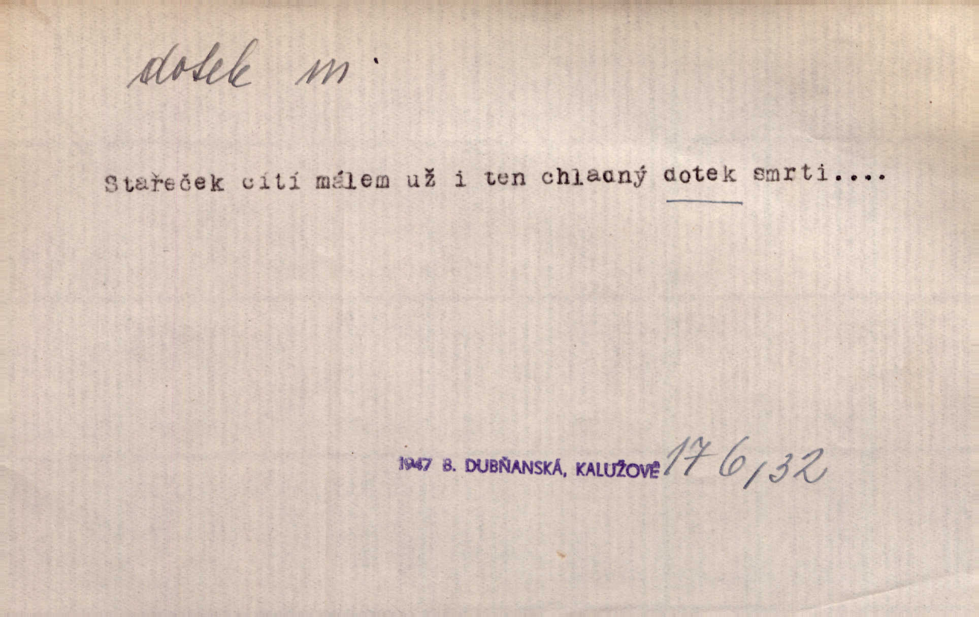 - dotek, -u m. dotknutí. Cítila, že se ta nemoc zrovna hrkotem z ní ztrácí pod teplými doteky starostlivé ruky. A. Mrš. Těl. Předklon s dotekem země dlaněmi. Těl. soust. Počal chápati krásu zvuku a rozkoš slunečního doteku. Olb. Ještě jako by cítila chladivý dotek vody pramene. Dyk. D El. tech. spojení dvou vodičů, jimiž prochází elektrický proud, kontakt. Geom. dotek dvojný, dotek křivek, ploch. Sr. dotyk.