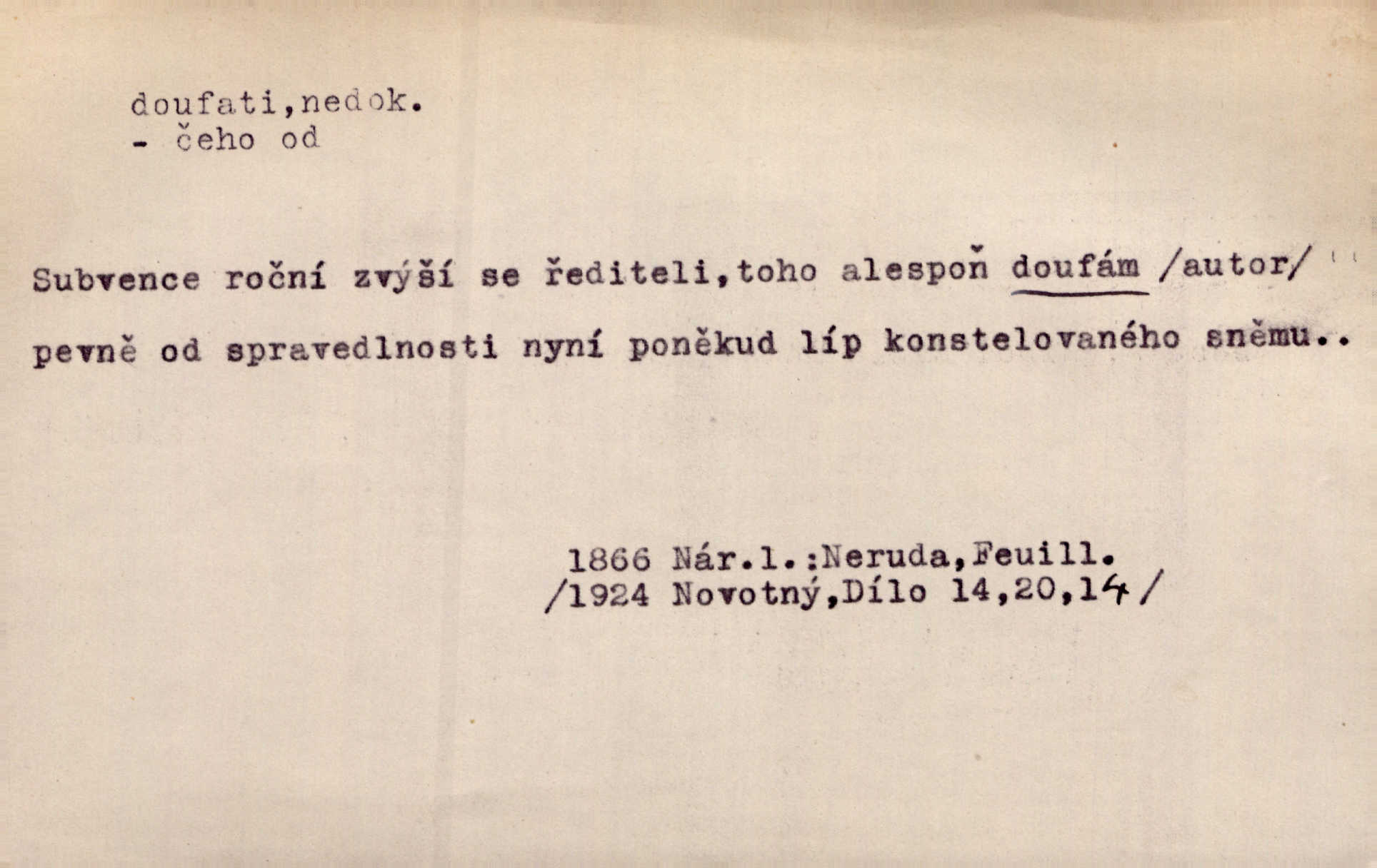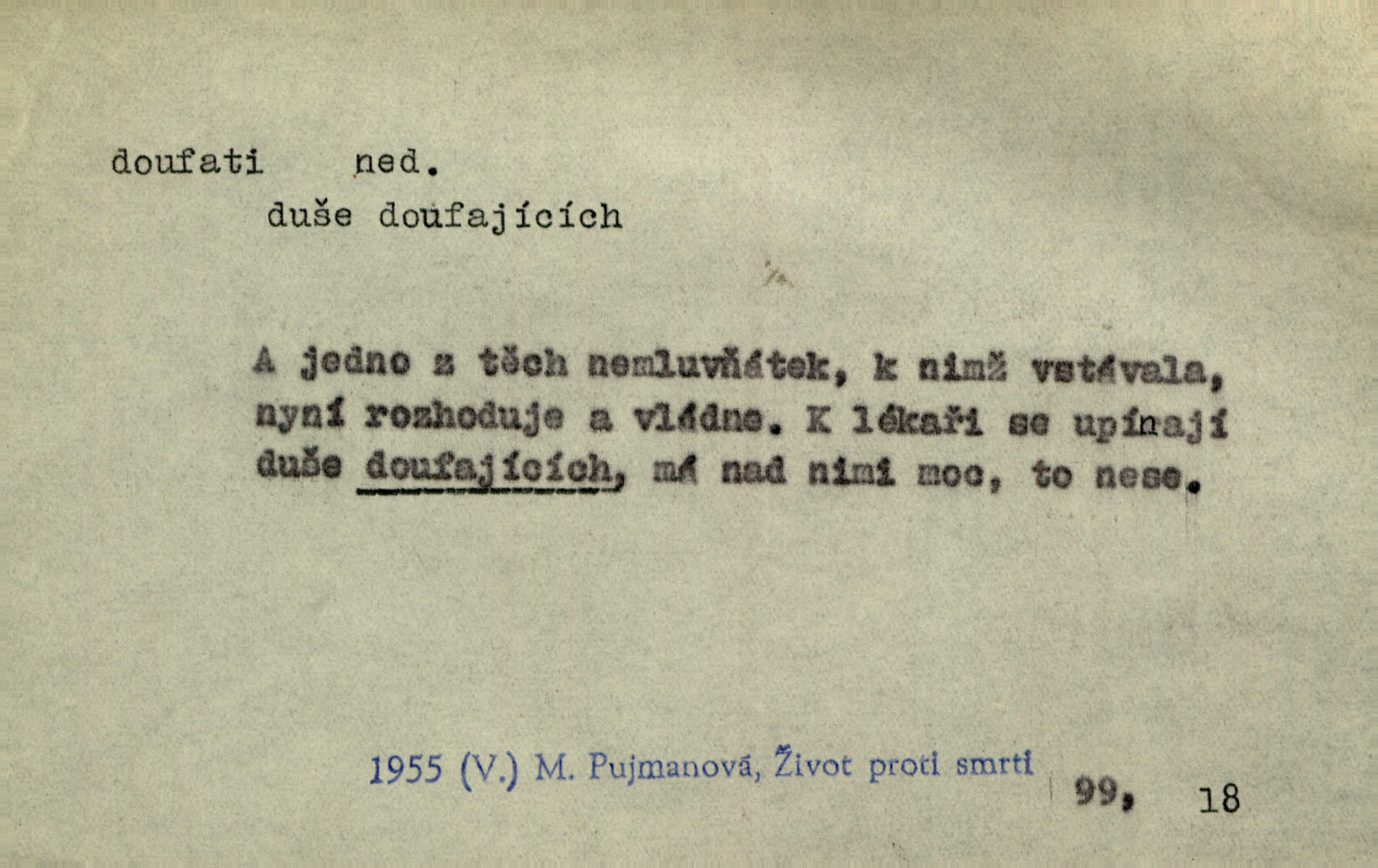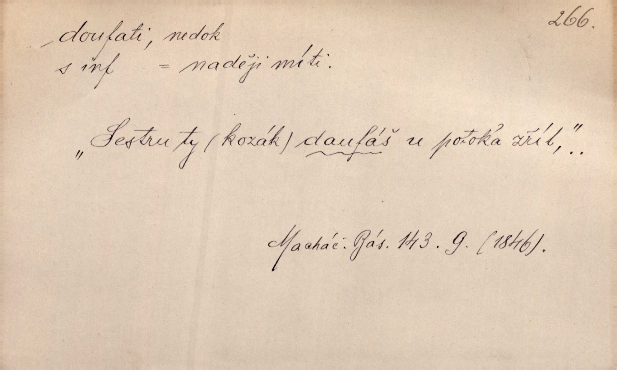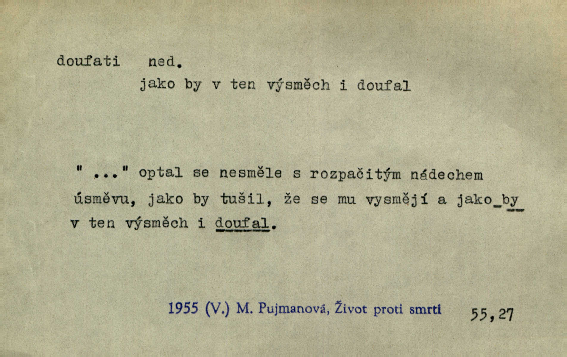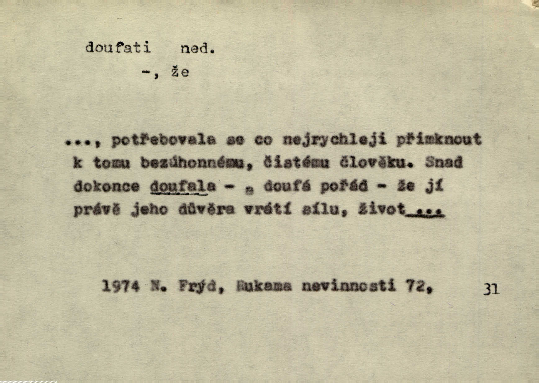 - doufati ned. (co n. čeho, v koho, več, nač) oddávati se naději, činiti si n. míti naději, nadíti se, míti důvěru, s důvěrou očekávati, spoléhati. Pohlédla k němu úzkostně, jako by od něho spásu doufala. Jir. Hrdlička od nové doby snášelivé a osvícené doufá nové léto i pro rozkvět našeho jazyka. J. Vlč. Polož na jednu váhu všechny nepříjemnosti, na druhou všechen zisk, jejž do svého poslancování doufáš. Staš. U babičky doufala zajisté lepšího vděku za svou novinku. Herb. Kurfiřt byl se totiž znovu uchýlil s žádostmi svými k císaři, od něhož jediné mohl doufati pomoci. Pekárek. Pevně jsem doufal v tebe, Hospodine. Erb. Doufám na věčnou spásu hříšné svojí duše. Vrch. Zítra povím vám, zda doufat na mou pomoc můžete. Zey. Ti všichni doufali v rychlé a správné vyřízení své žádosti. V. Mrš. V Boha doufej, a sám foukej. Přísl. Doufám, že náš obchod vydaří se skvěle. Čech.