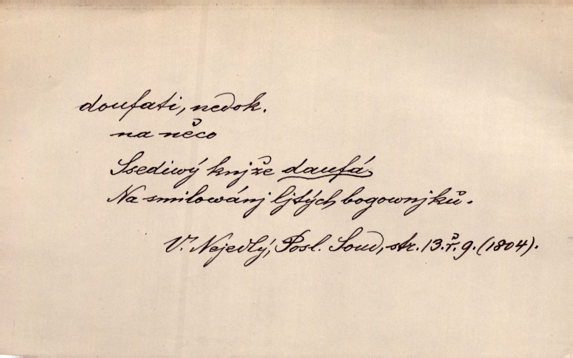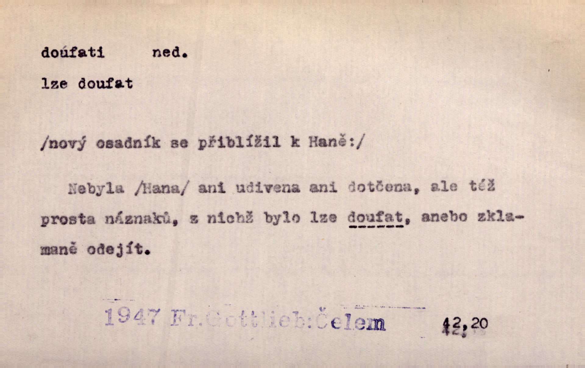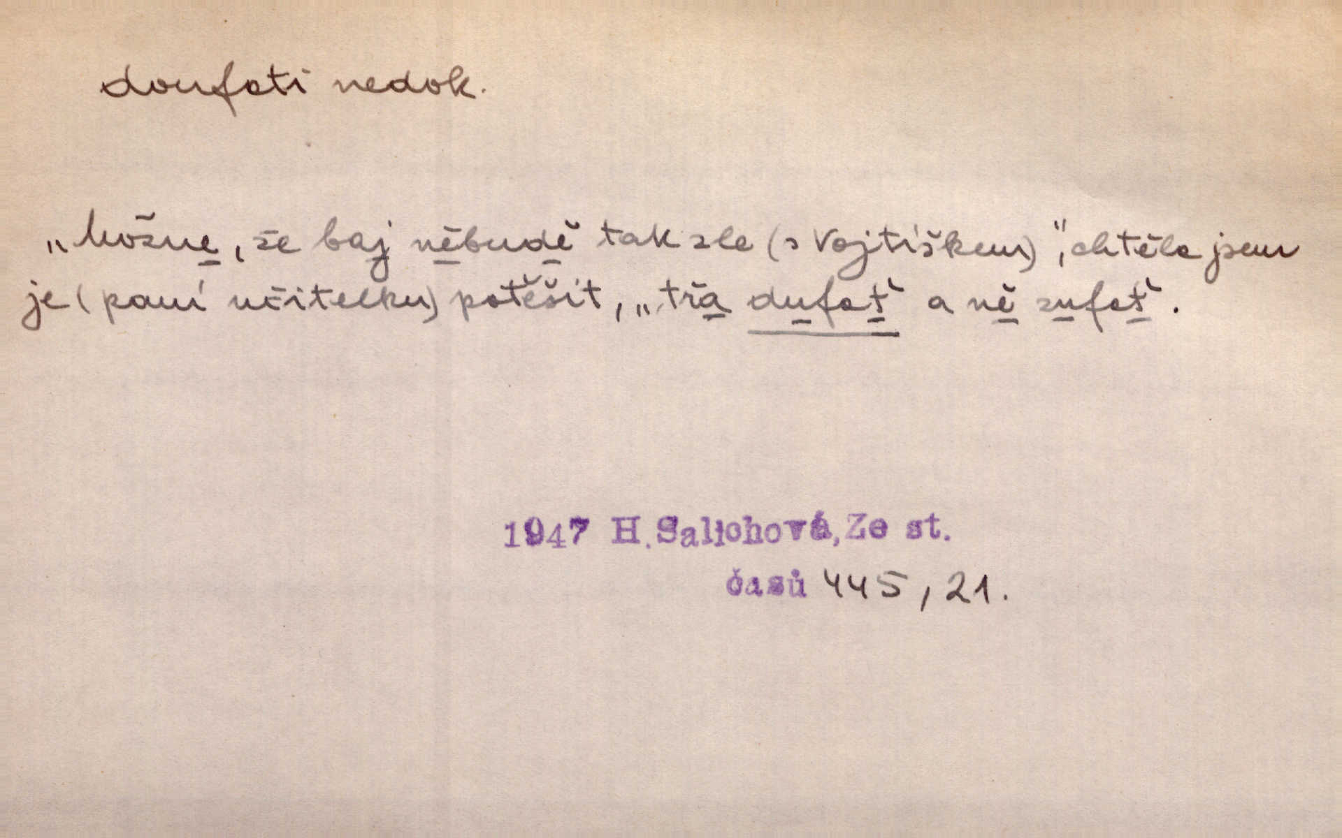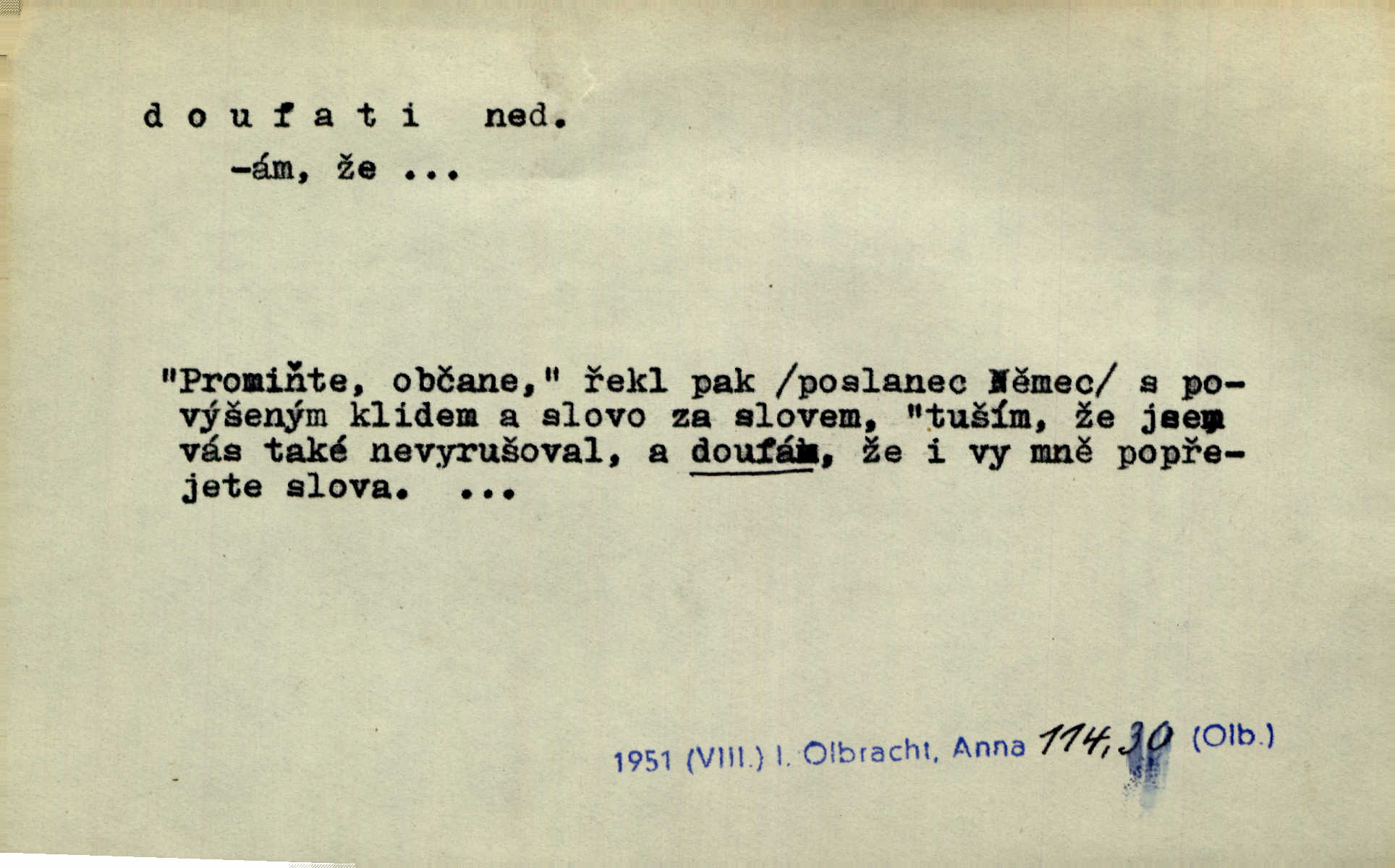 - doufati ned. (co n. čeho, v koho, več, nač) oddávati se naději, činiti si n. míti naději, nadíti se, míti důvěru, s důvěrou očekávati, spoléhati. Pohlédla k němu úzkostně, jako by od něho spásu doufala. Jir. Hrdlička od nové doby snášelivé a osvícené doufá nové léto i pro rozkvět našeho jazyka. J. Vlč. Polož na jednu váhu všechny nepříjemnosti, na druhou všechen zisk, jejž do svého poslancování doufáš. Staš. U babičky doufala zajisté lepšího vděku za svou novinku. Herb. Kurfiřt byl se totiž znovu uchýlil s žádostmi svými k císaři, od něhož jediné mohl doufati pomoci. Pekárek. Pevně jsem doufal v tebe, Hospodine. Erb. Doufám na věčnou spásu hříšné svojí duše. Vrch. Zítra povím vám, zda doufat na mou pomoc můžete. Zey. Ti všichni doufali v rychlé a správné vyřízení své žádosti. V. Mrš. V Boha doufej, a sám foukej. Přísl. Doufám, že náš obchod vydaří se skvěle. Čech.