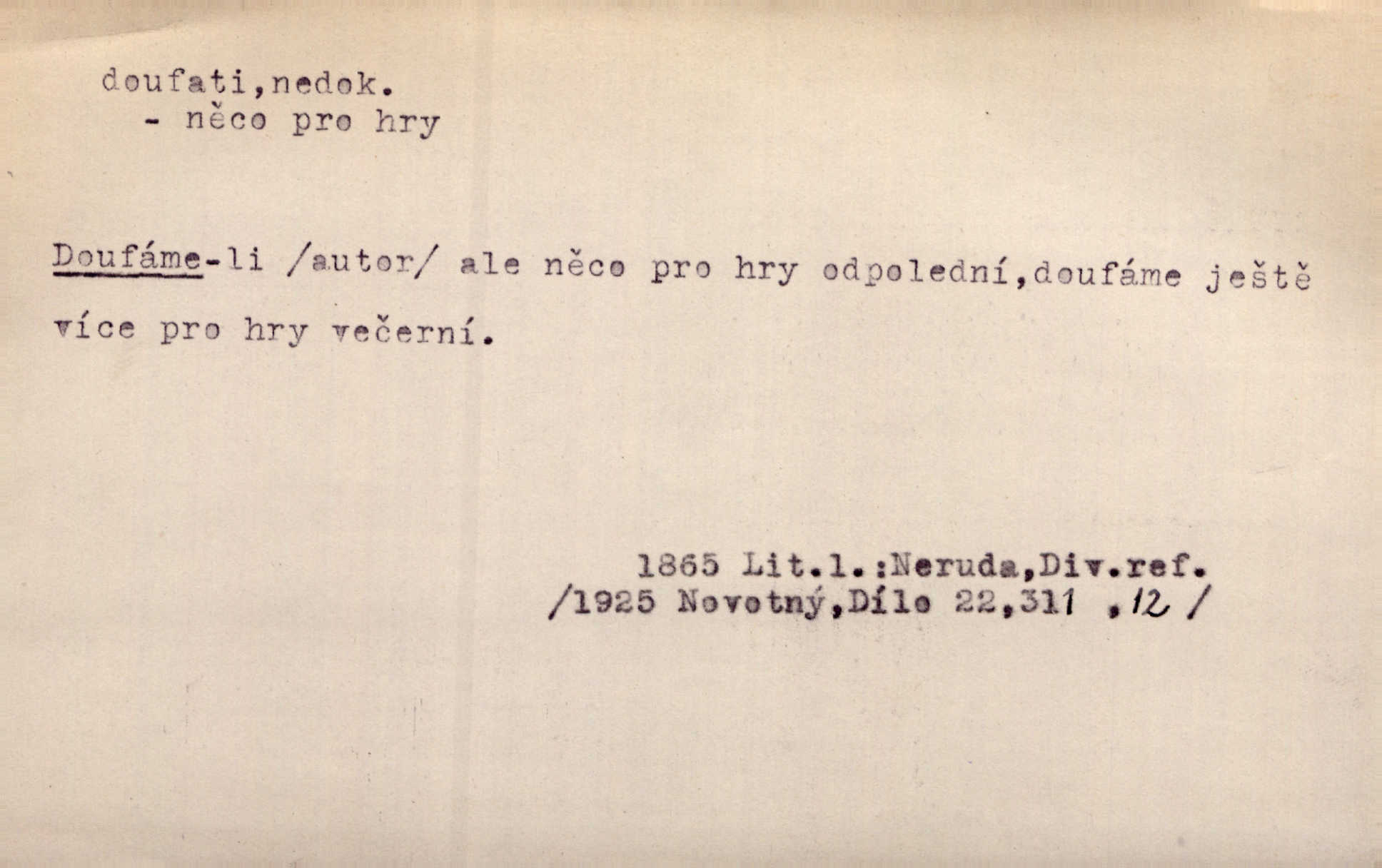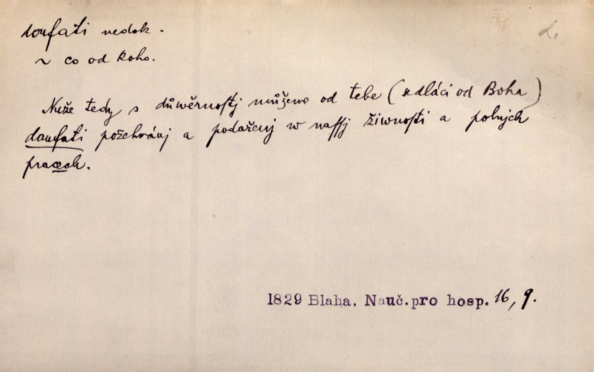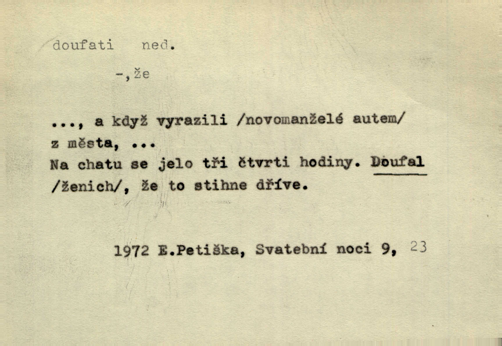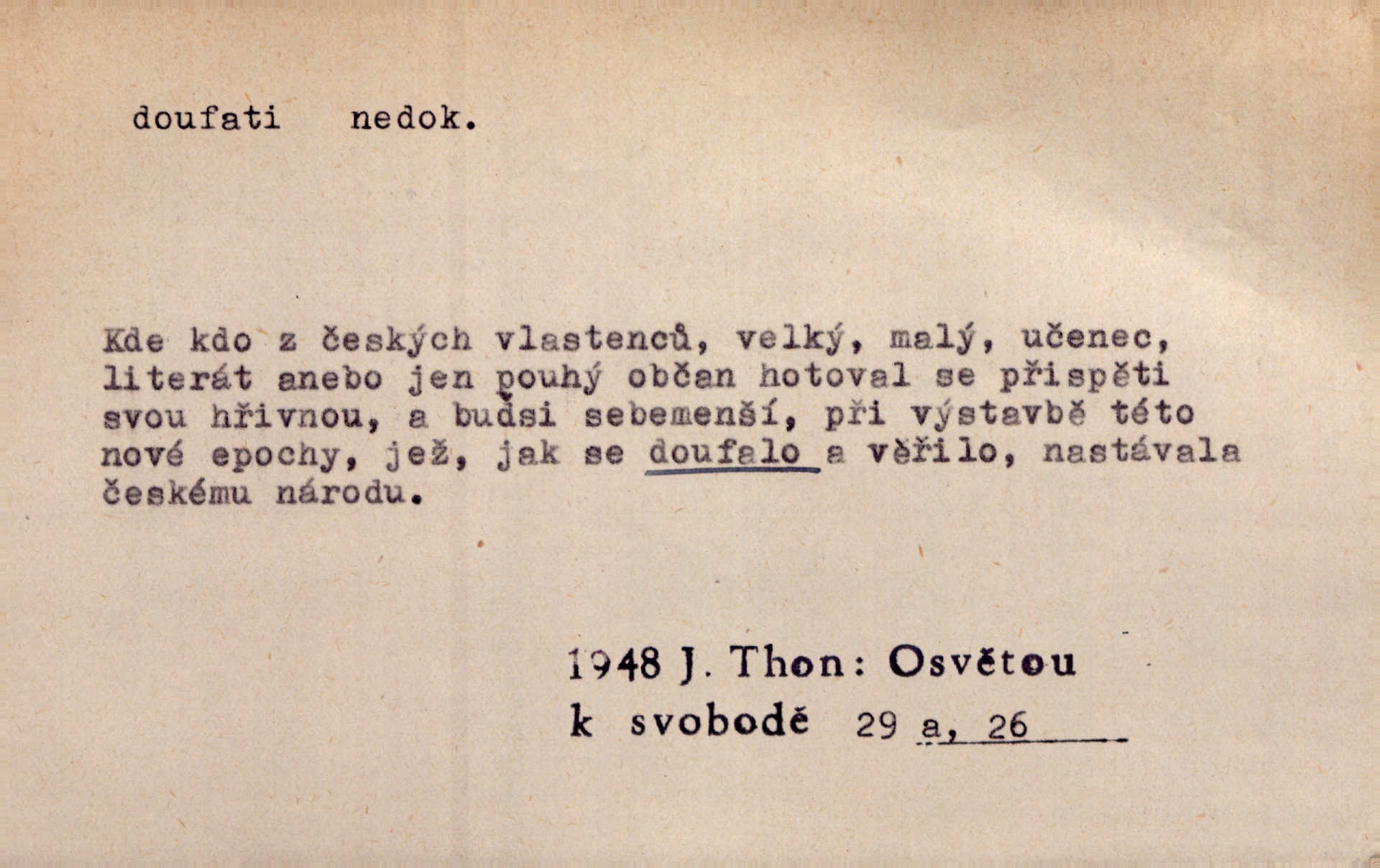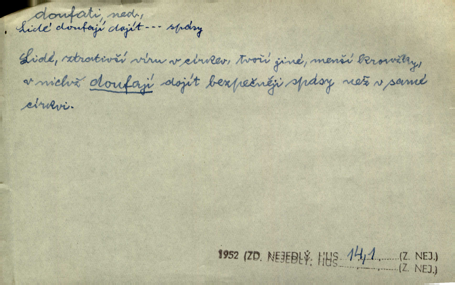 - doufati ned. (co n. čeho, v koho, več, nač) oddávati se naději, činiti si n. míti naději, nadíti se, míti důvěru, s důvěrou očekávati, spoléhati. Pohlédla k němu úzkostně, jako by od něho spásu doufala. Jir. Hrdlička od nové doby snášelivé a osvícené doufá nové léto i pro rozkvět našeho jazyka. J. Vlč. Polož na jednu váhu všechny nepříjemnosti, na druhou všechen zisk, jejž do svého poslancování doufáš. Staš. U babičky doufala zajisté lepšího vděku za svou novinku. Herb. Kurfiřt byl se totiž znovu uchýlil s žádostmi svými k císaři, od něhož jediné mohl doufati pomoci. Pekárek. Pevně jsem doufal v tebe, Hospodine. Erb. Doufám na věčnou spásu hříšné svojí duše. Vrch. Zítra povím vám, zda doufat na mou pomoc můžete. Zey. Ti všichni doufali v rychlé a správné vyřízení své žádosti. V. Mrš. V Boha doufej, a sám foukej. Přísl. Doufám, že náš obchod vydaří se skvěle. Čech.