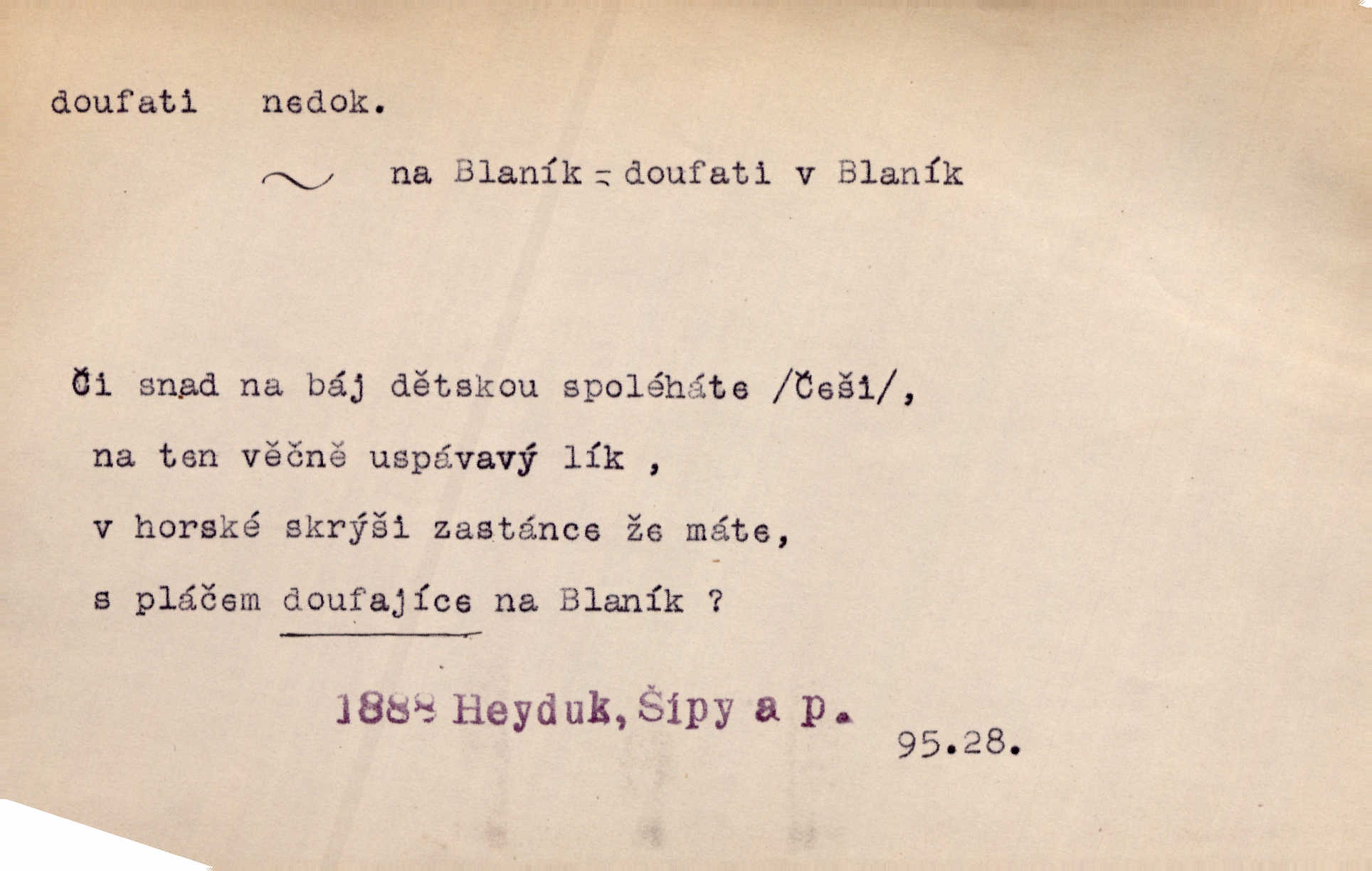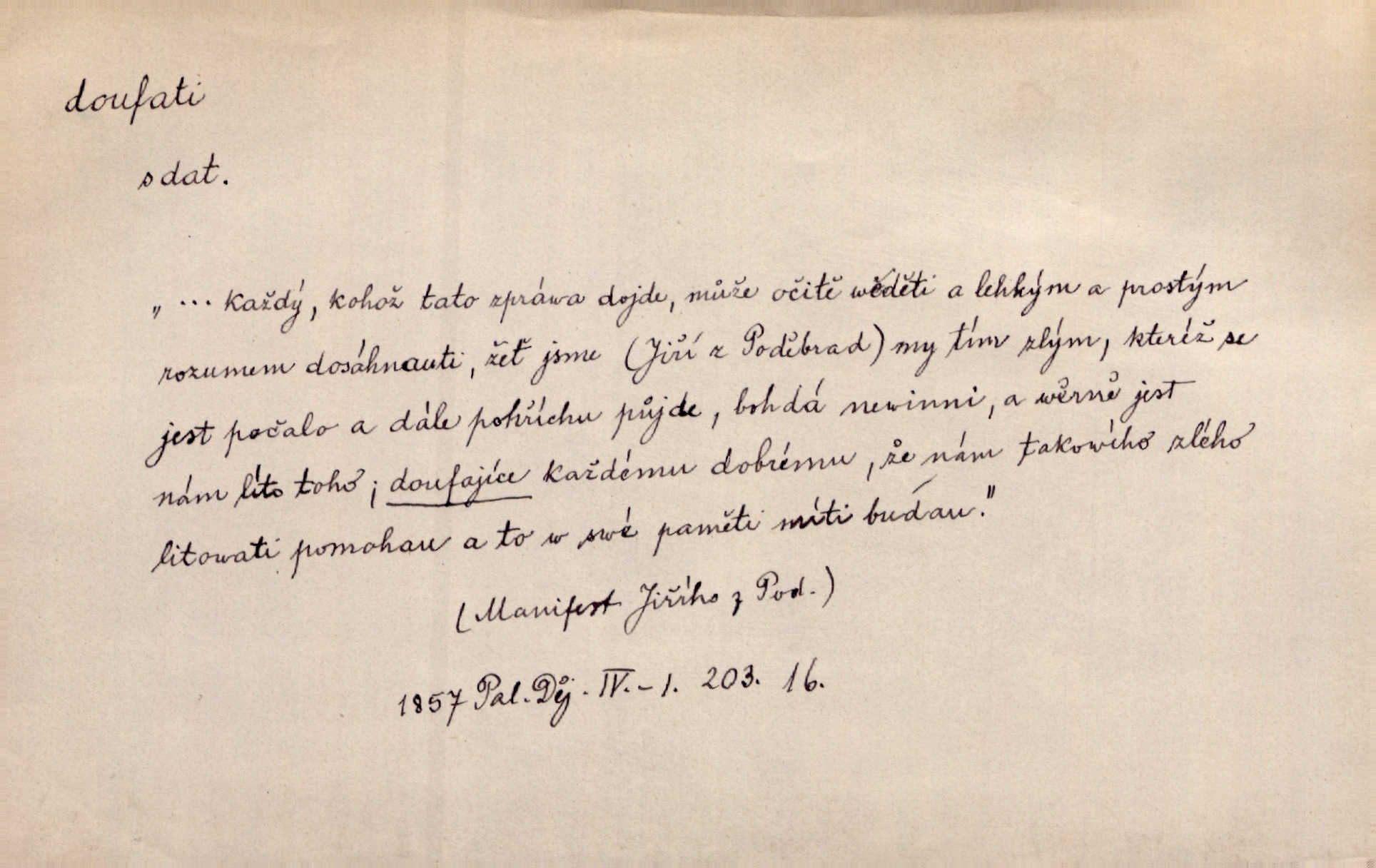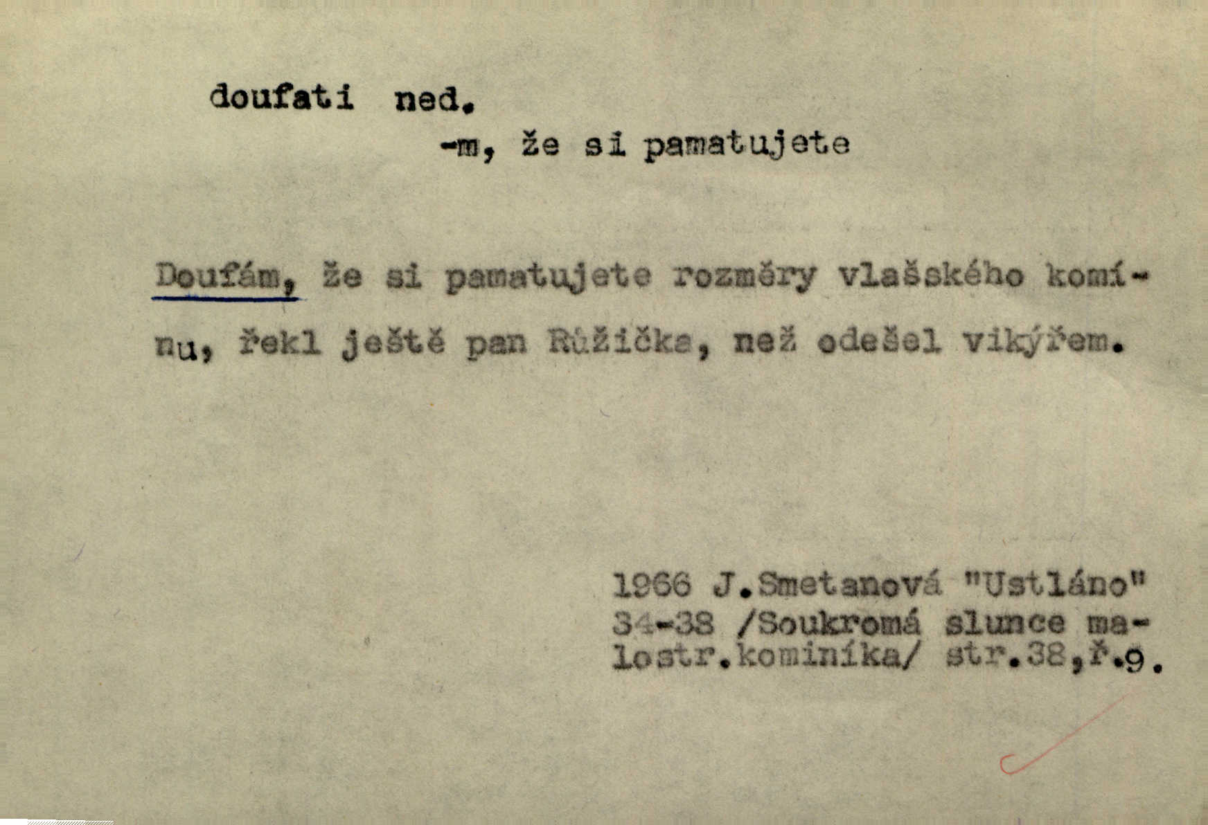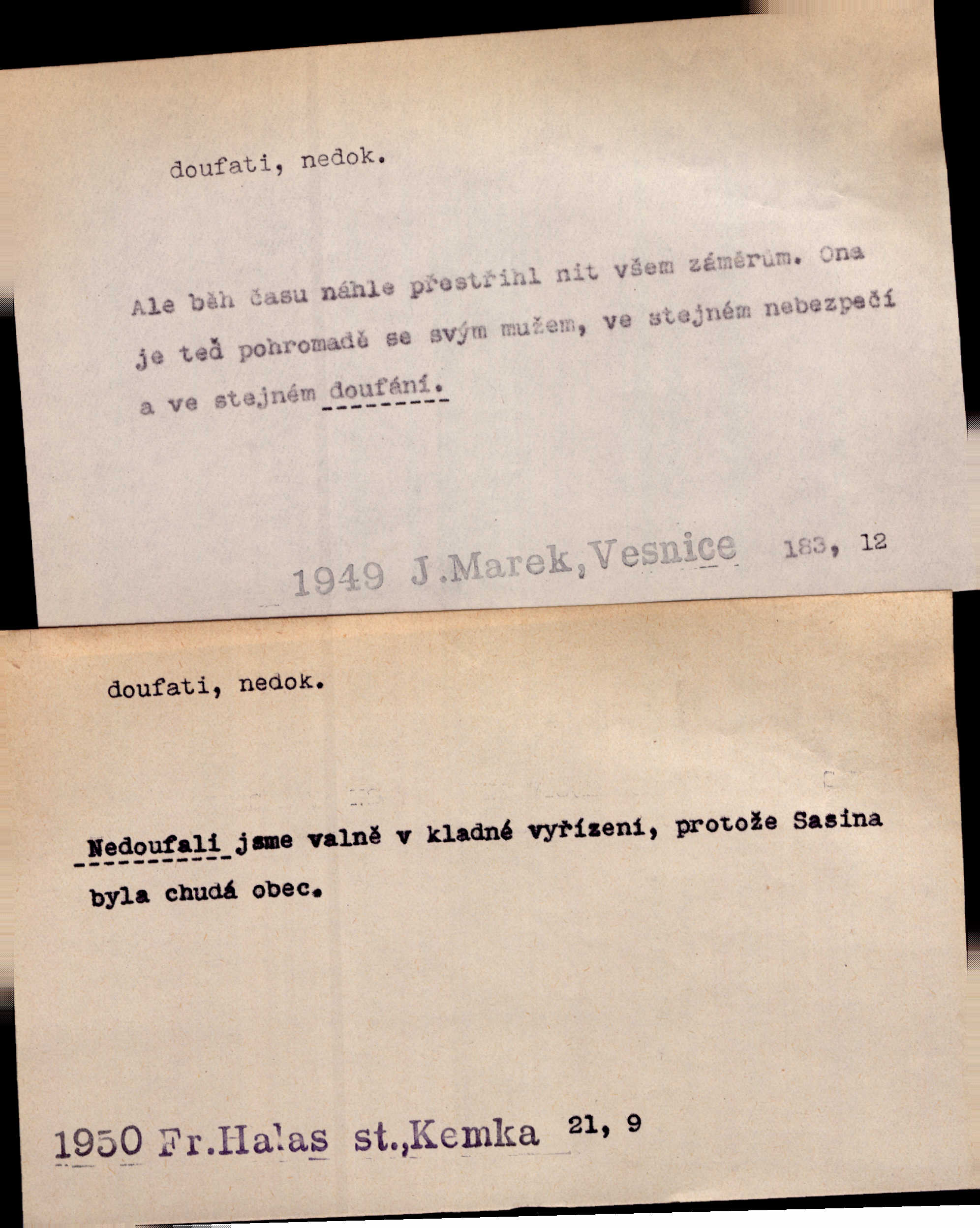 - doufati ned. (co n. čeho, v koho, več, nač) oddávati se naději, činiti si n. míti naději, nadíti se, míti důvěru, s důvěrou očekávati, spoléhati. Pohlédla k němu úzkostně, jako by od něho spásu doufala. Jir. Hrdlička od nové doby snášelivé a osvícené doufá nové léto i pro rozkvět našeho jazyka. J. Vlč. Polož na jednu váhu všechny nepříjemnosti, na druhou všechen zisk, jejž do svého poslancování doufáš. Staš. U babičky doufala zajisté lepšího vděku za svou novinku. Herb. Kurfiřt byl se totiž znovu uchýlil s žádostmi svými k císaři, od něhož jediné mohl doufati pomoci. Pekárek. Pevně jsem doufal v tebe, Hospodine. Erb. Doufám na věčnou spásu hříšné svojí duše. Vrch. Zítra povím vám, zda doufat na mou pomoc můžete. Zey. Ti všichni doufali v rychlé a správné vyřízení své žádosti. V. Mrš. V Boha doufej, a sám foukej. Přísl. Doufám, že náš obchod vydaří se skvěle. Čech.