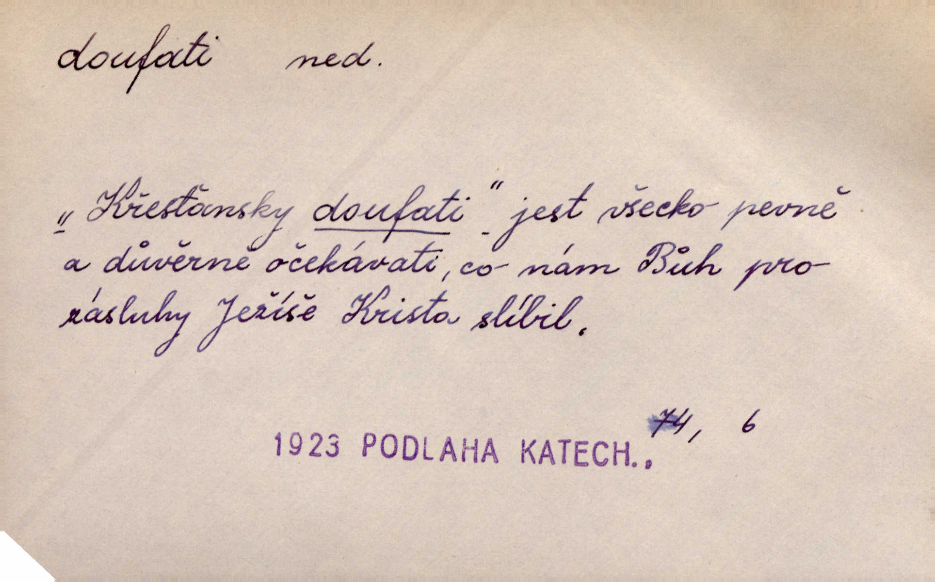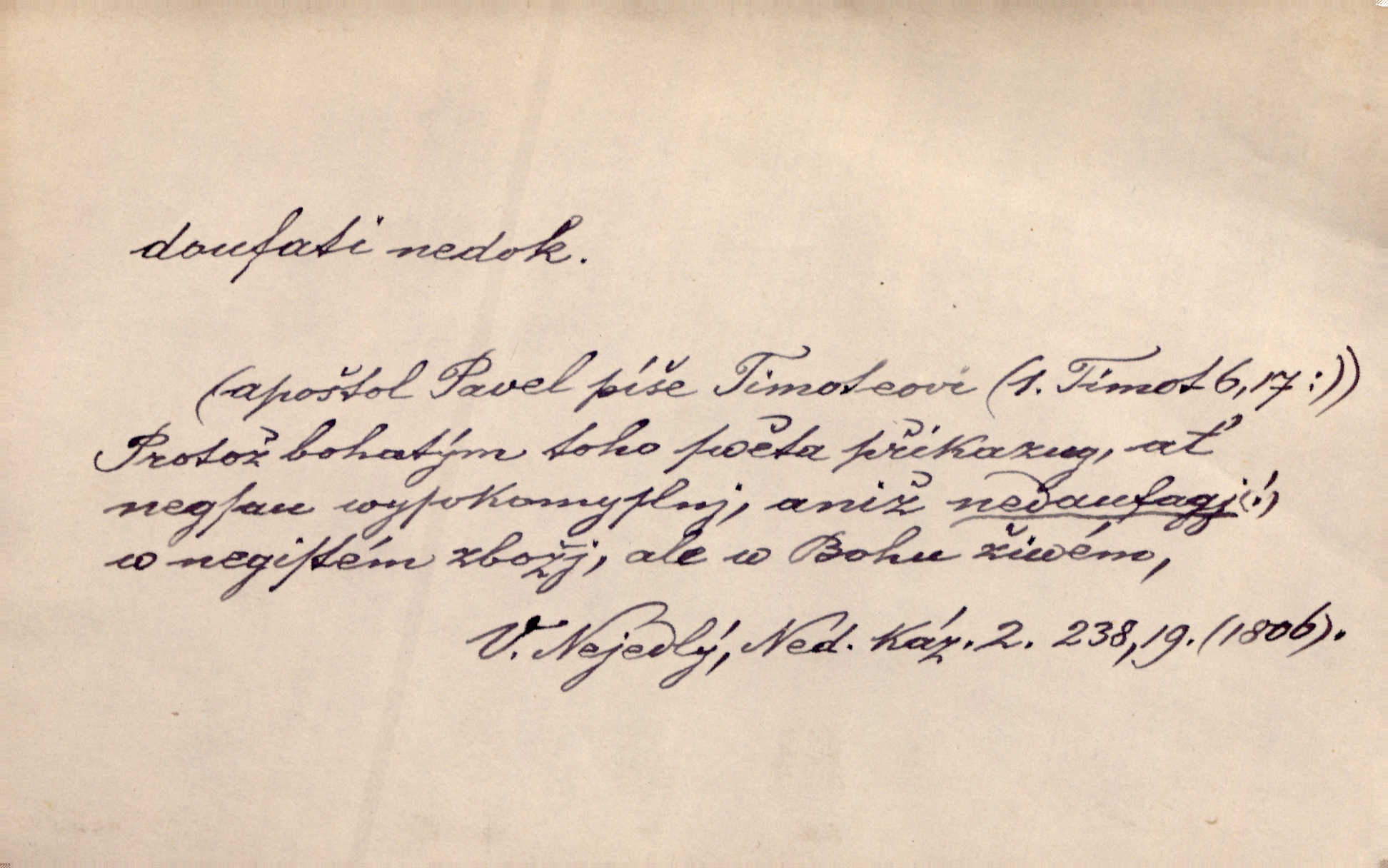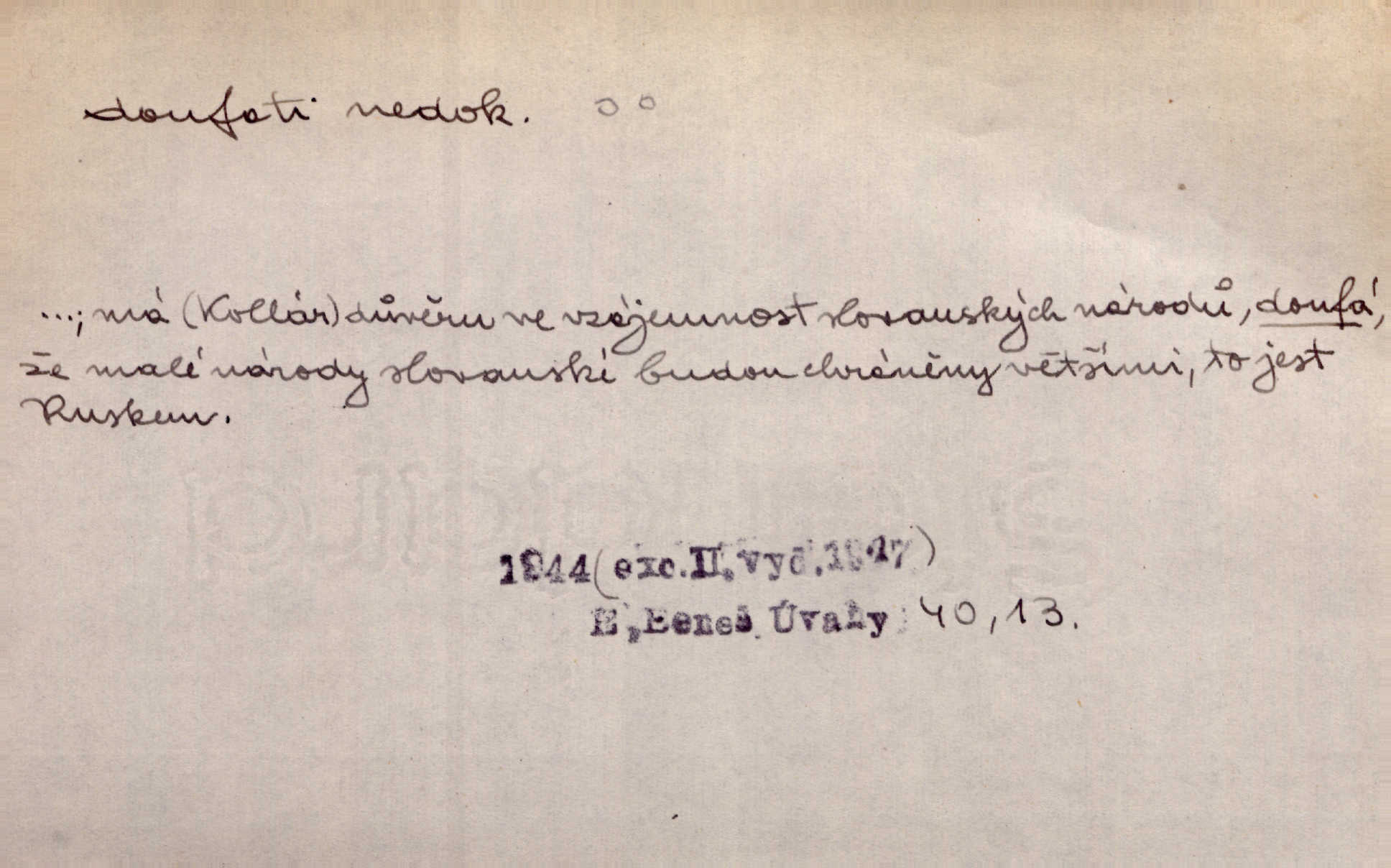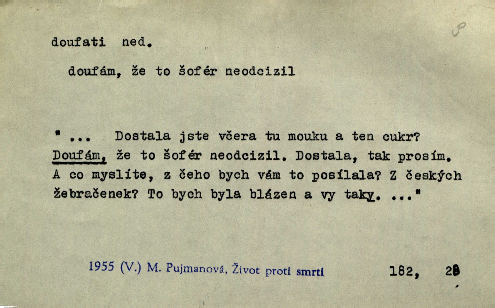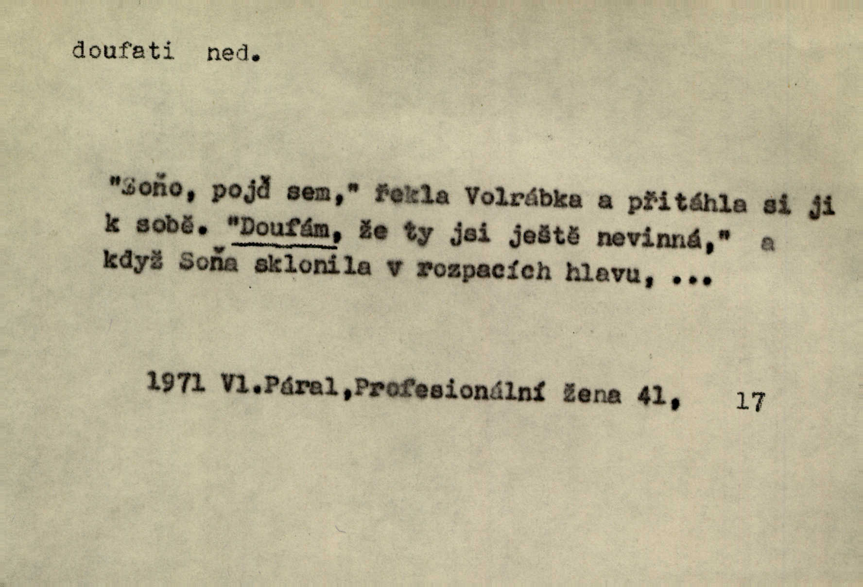 - doufati ned. (co n. čeho, v koho, več, nač) oddávati se naději, činiti si n. míti naději, nadíti se, míti důvěru, s důvěrou očekávati, spoléhati. Pohlédla k němu úzkostně, jako by od něho spásu doufala. Jir. Hrdlička od nové doby snášelivé a osvícené doufá nové léto i pro rozkvět našeho jazyka. J. Vlč. Polož na jednu váhu všechny nepříjemnosti, na druhou všechen zisk, jejž do svého poslancování doufáš. Staš. U babičky doufala zajisté lepšího vděku za svou novinku. Herb. Kurfiřt byl se totiž znovu uchýlil s žádostmi svými k císaři, od něhož jediné mohl doufati pomoci. Pekárek. Pevně jsem doufal v tebe, Hospodine. Erb. Doufám na věčnou spásu hříšné svojí duše. Vrch. Zítra povím vám, zda doufat na mou pomoc můžete. Zey. Ti všichni doufali v rychlé a správné vyřízení své žádosti. V. Mrš. V Boha doufej, a sám foukej. Přísl. Doufám, že náš obchod vydaří se skvěle. Čech.