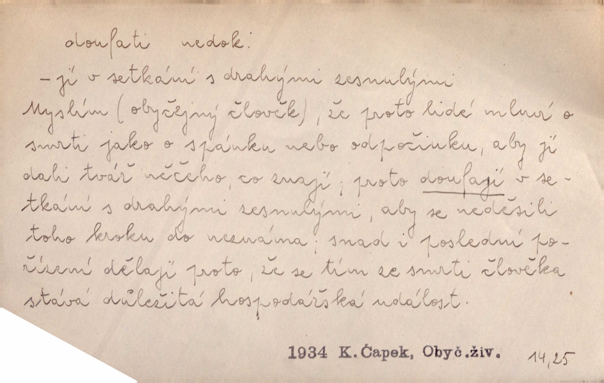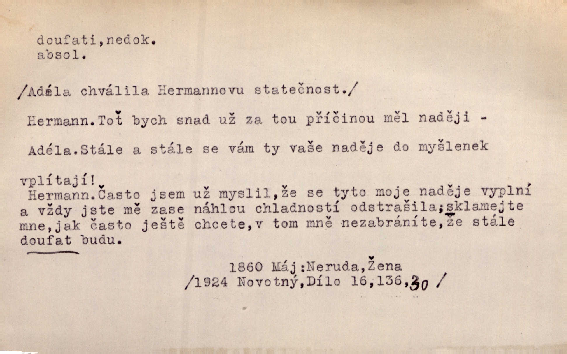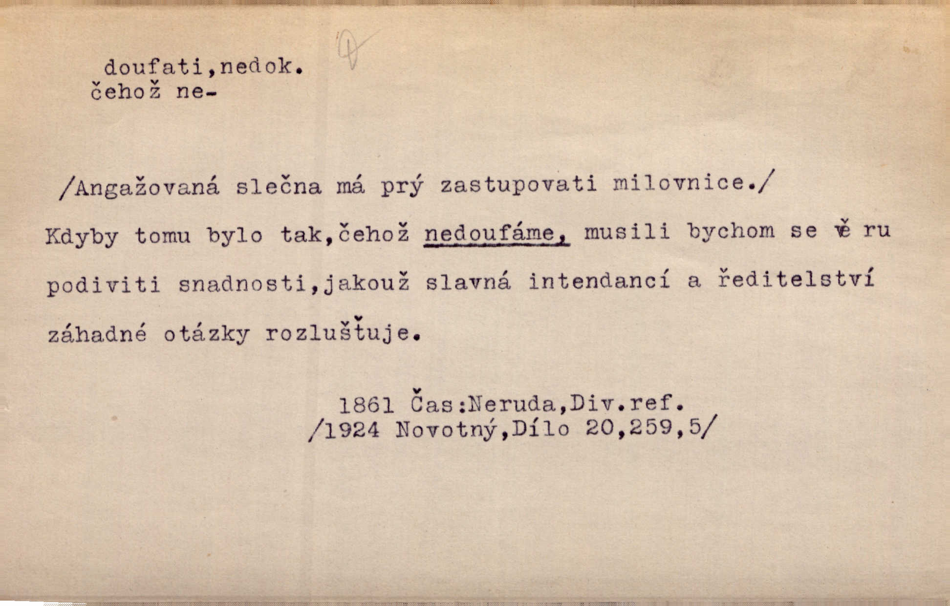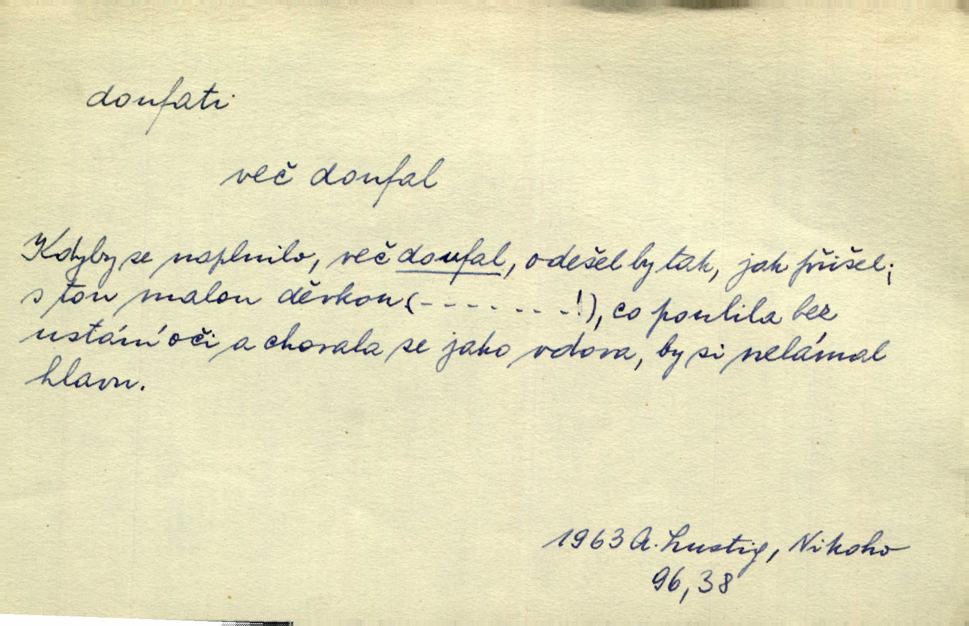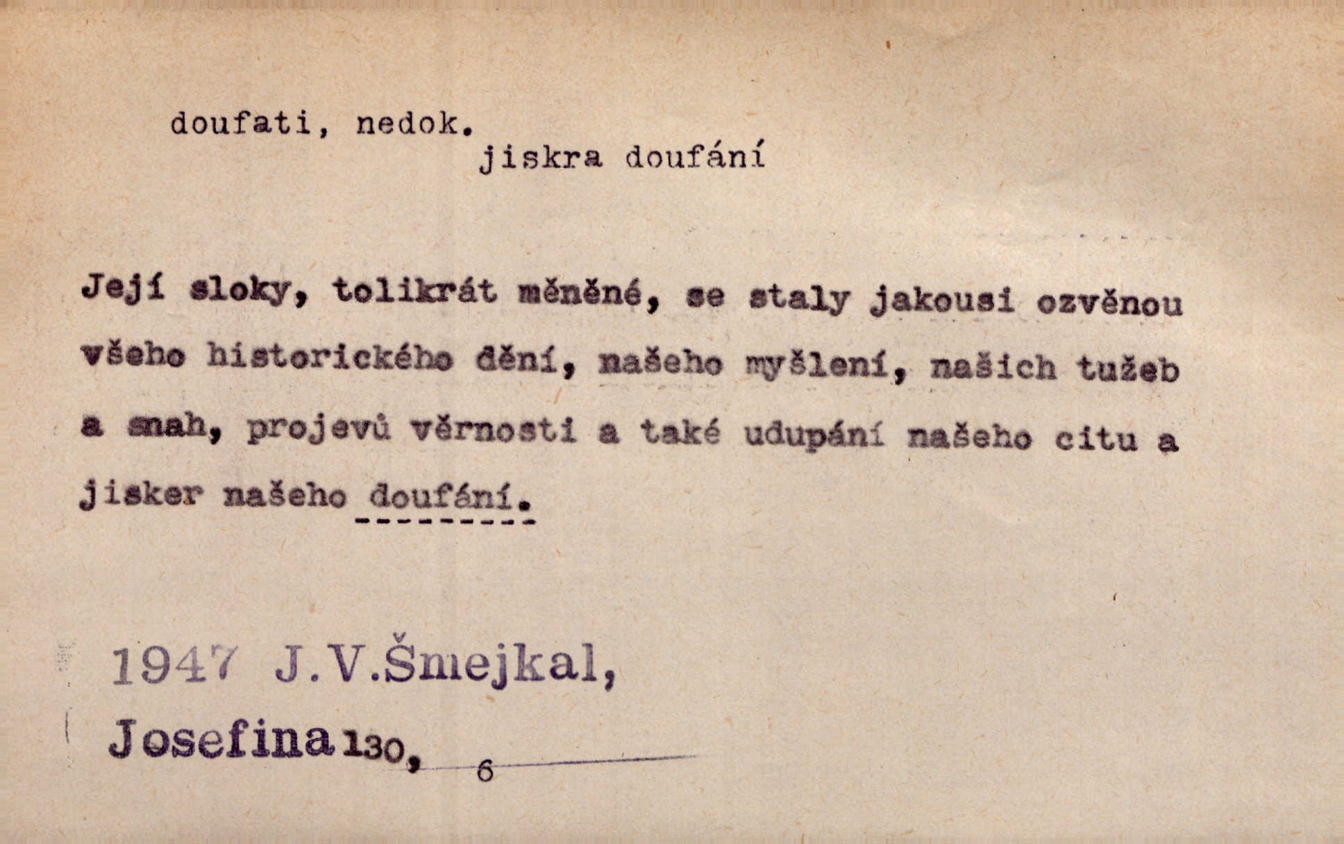 - doufati ned. (co n. čeho, v koho, več, nač) oddávati se naději, činiti si n. míti naději, nadíti se, míti důvěru, s důvěrou očekávati, spoléhati. Pohlédla k němu úzkostně, jako by od něho spásu doufala. Jir. Hrdlička od nové doby snášelivé a osvícené doufá nové léto i pro rozkvět našeho jazyka. J. Vlč. Polož na jednu váhu všechny nepříjemnosti, na druhou všechen zisk, jejž do svého poslancování doufáš. Staš. U babičky doufala zajisté lepšího vděku za svou novinku. Herb. Kurfiřt byl se totiž znovu uchýlil s žádostmi svými k císaři, od něhož jediné mohl doufati pomoci. Pekárek. Pevně jsem doufal v tebe, Hospodine. Erb. Doufám na věčnou spásu hříšné svojí duše. Vrch. Zítra povím vám, zda doufat na mou pomoc můžete. Zey. Ti všichni doufali v rychlé a správné vyřízení své žádosti. V. Mrš. V Boha doufej, a sám foukej. Přísl. Doufám, že náš obchod vydaří se skvěle. Čech.