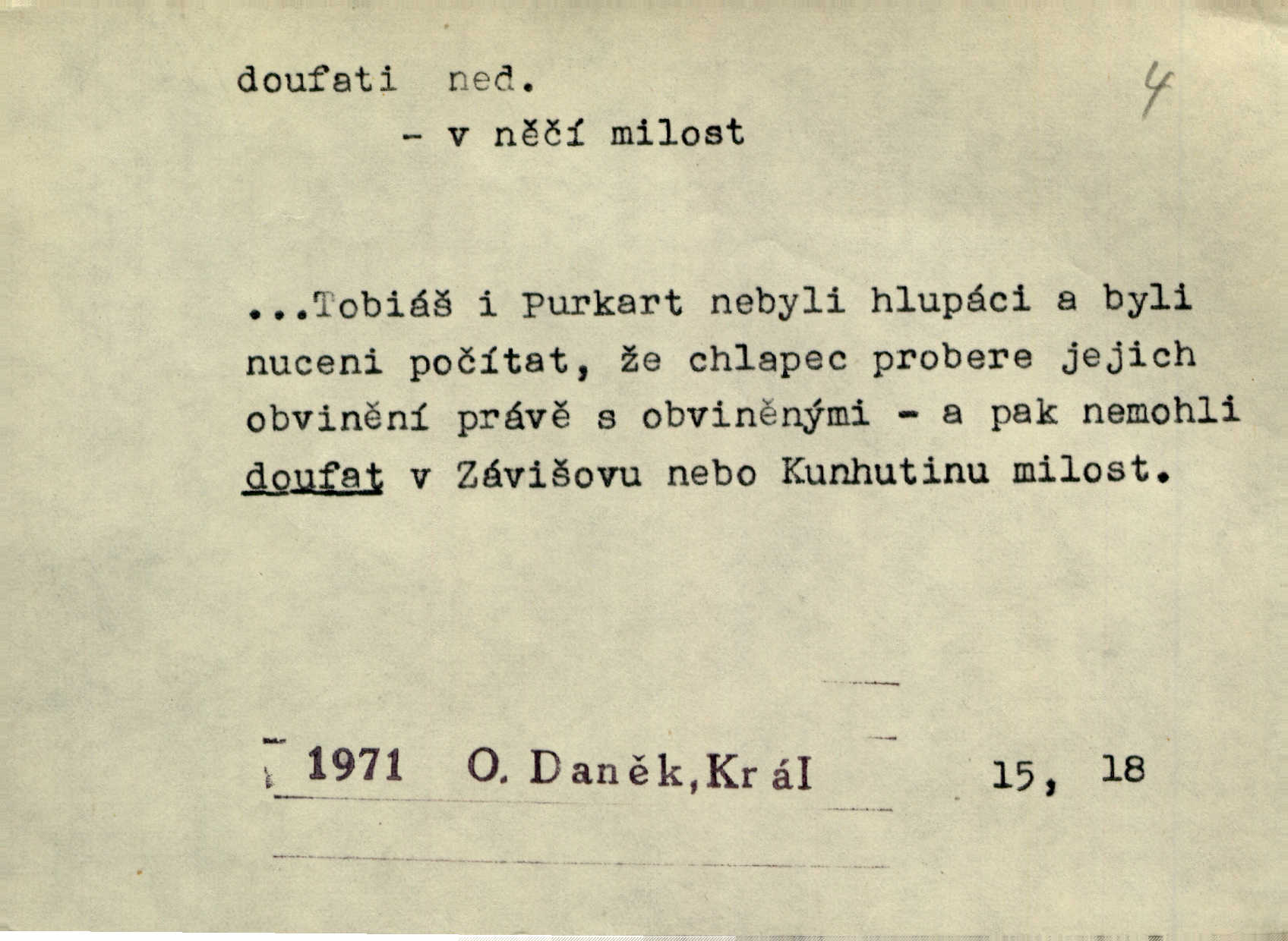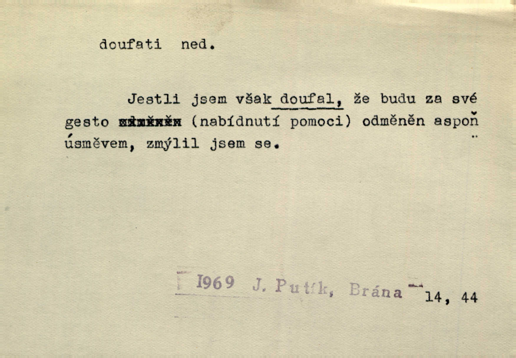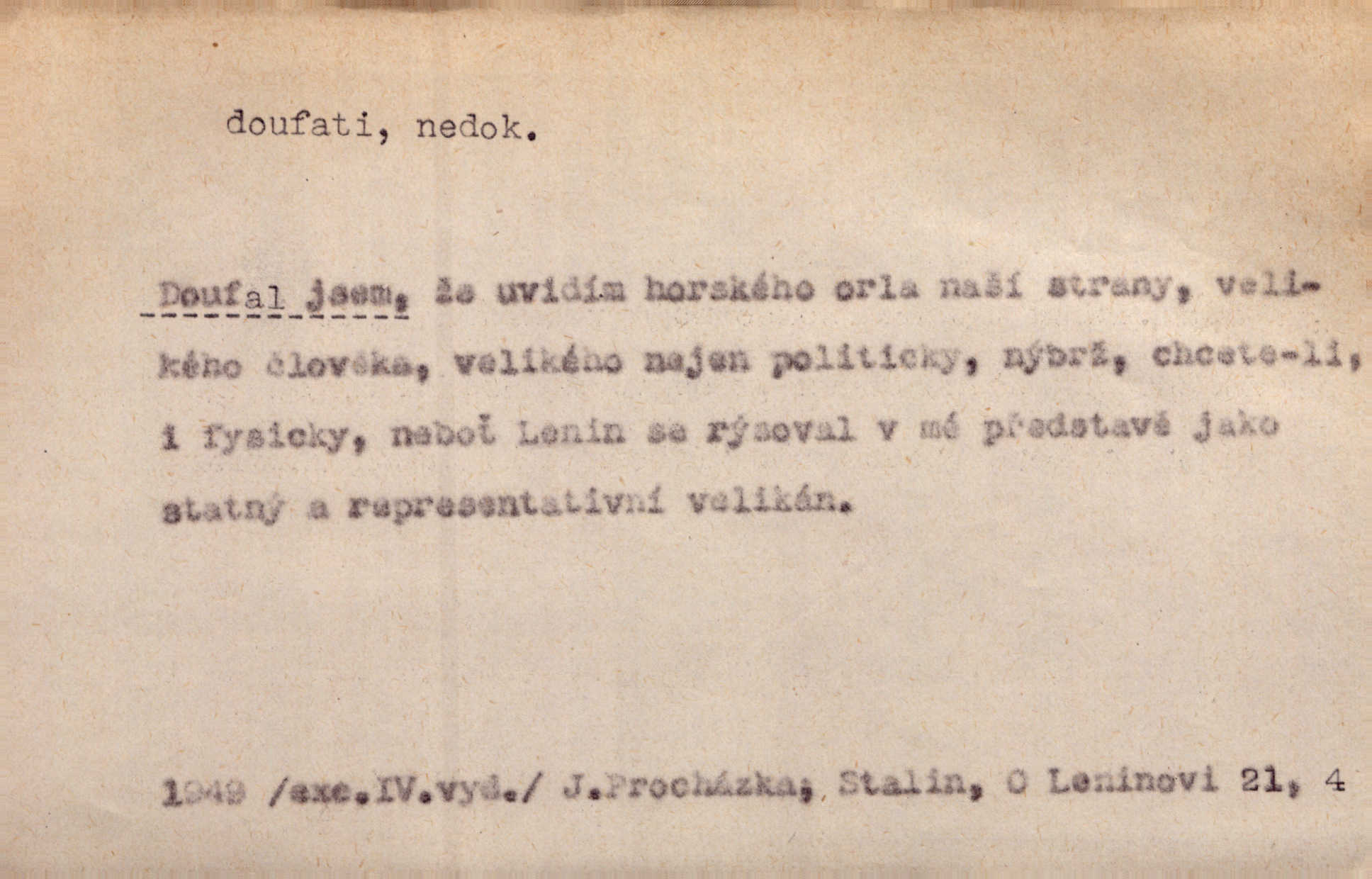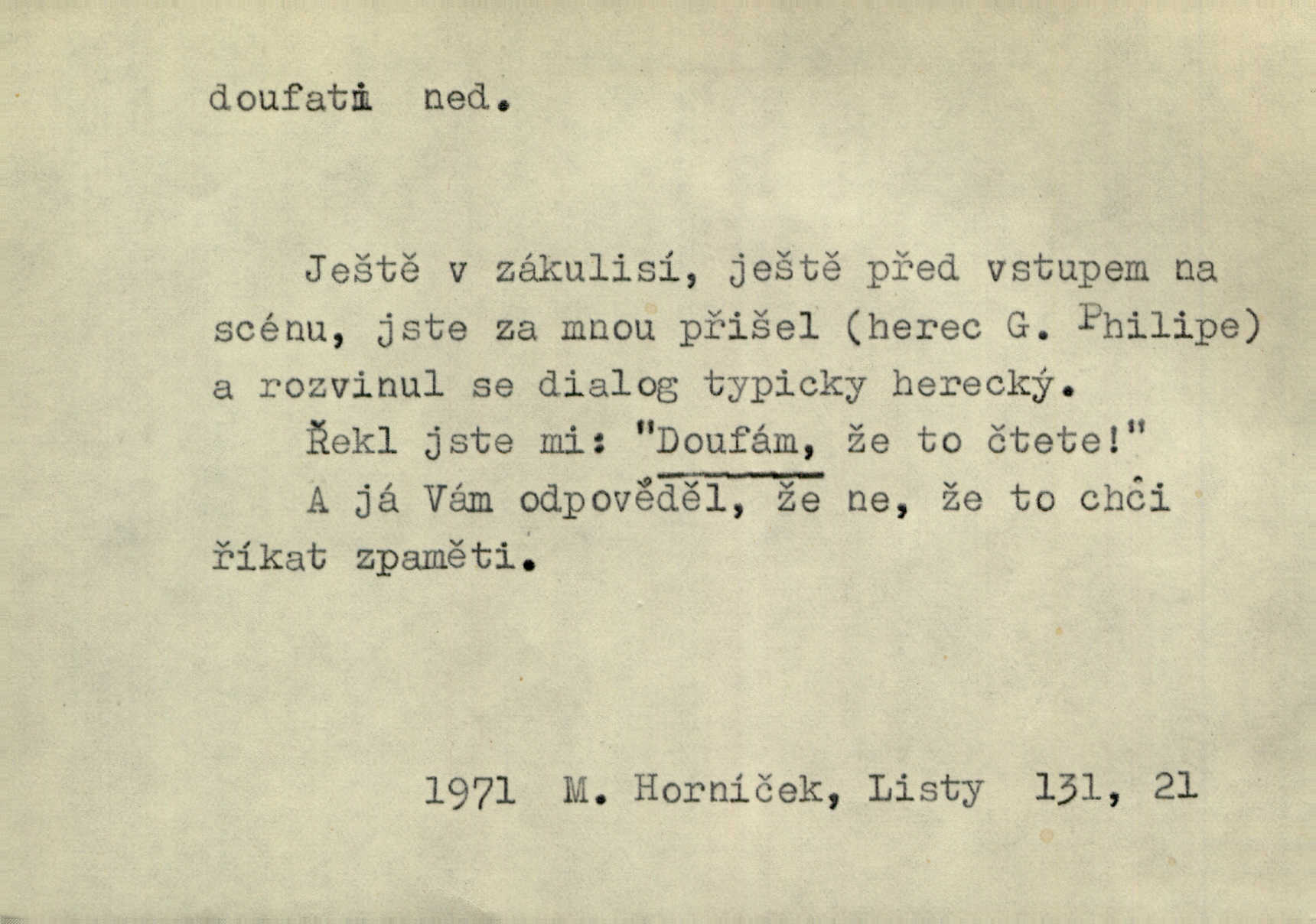 - doufati ned. (co n. čeho, v koho, več, nač) oddávati se naději, činiti si n. míti naději, nadíti se, míti důvěru, s důvěrou očekávati, spoléhati. Pohlédla k němu úzkostně, jako by od něho spásu doufala. Jir. Hrdlička od nové doby snášelivé a osvícené doufá nové léto i pro rozkvět našeho jazyka. J. Vlč. Polož na jednu váhu všechny nepříjemnosti, na druhou všechen zisk, jejž do svého poslancování doufáš. Staš. U babičky doufala zajisté lepšího vděku za svou novinku. Herb. Kurfiřt byl se totiž znovu uchýlil s žádostmi svými k císaři, od něhož jediné mohl doufati pomoci. Pekárek. Pevně jsem doufal v tebe, Hospodine. Erb. Doufám na věčnou spásu hříšné svojí duše. Vrch. Zítra povím vám, zda doufat na mou pomoc můžete. Zey. Ti všichni doufali v rychlé a správné vyřízení své žádosti. V. Mrš. V Boha doufej, a sám foukej. Přísl. Doufám, že náš obchod vydaří se skvěle. Čech.