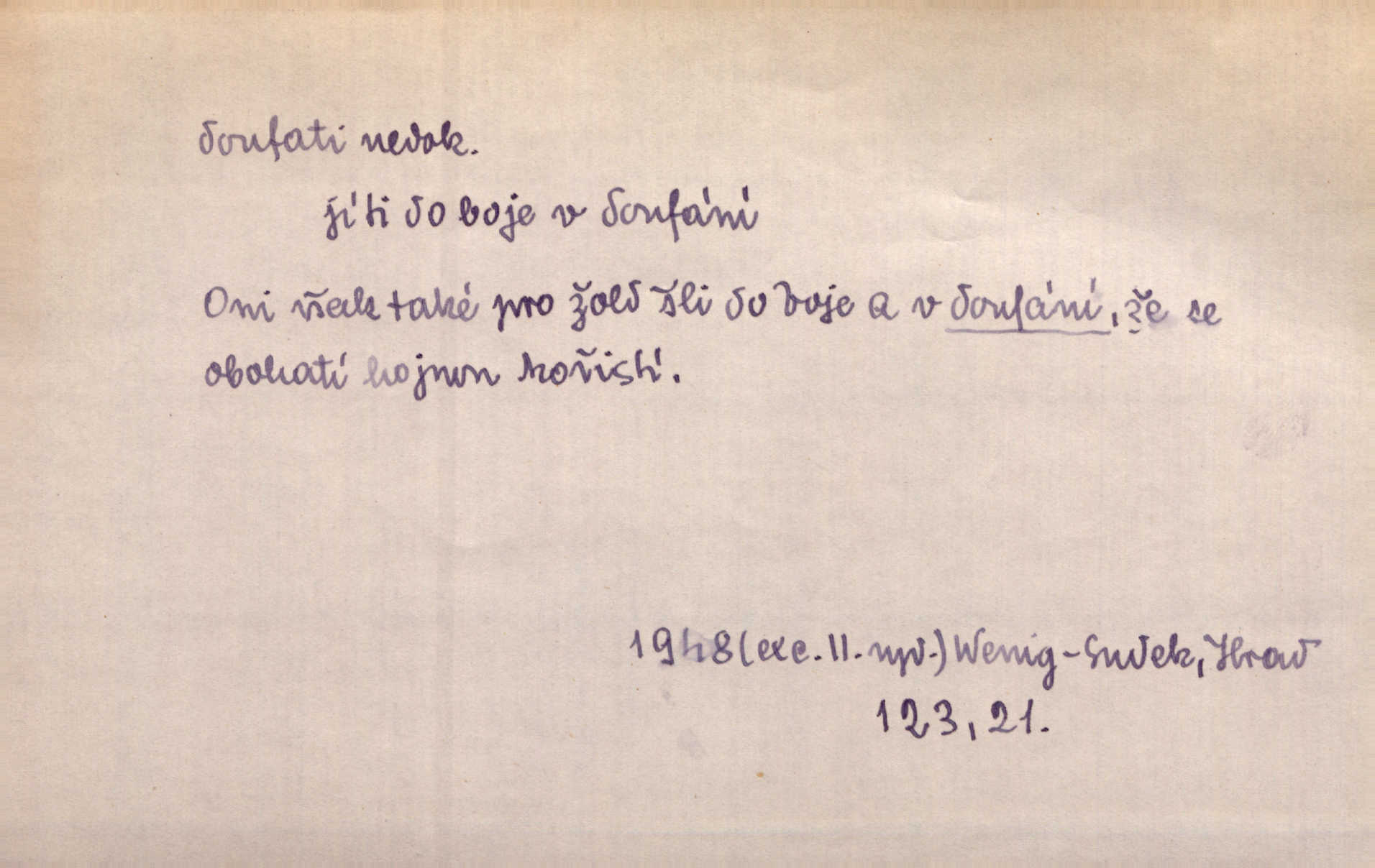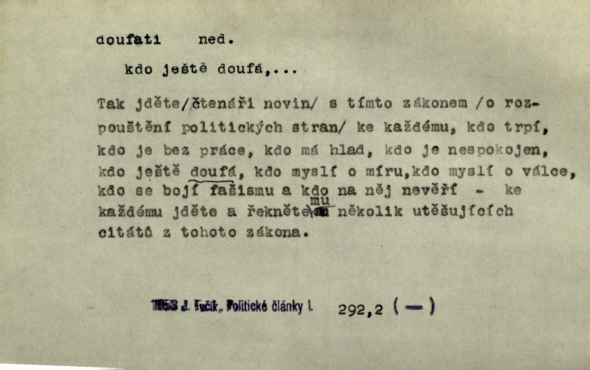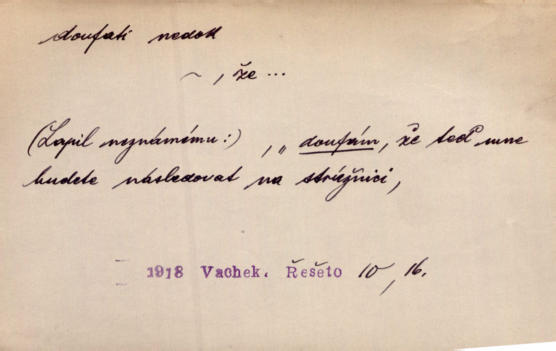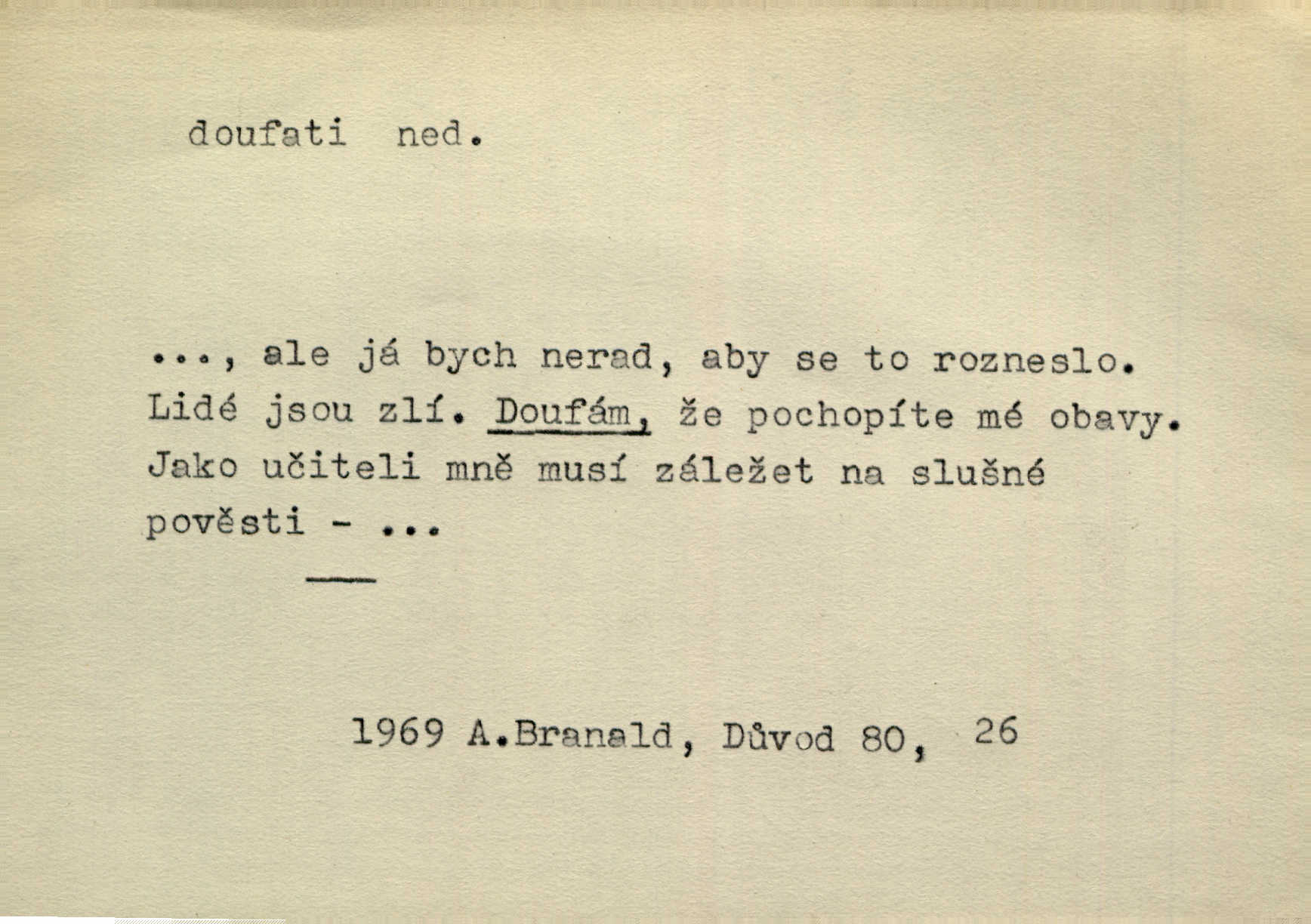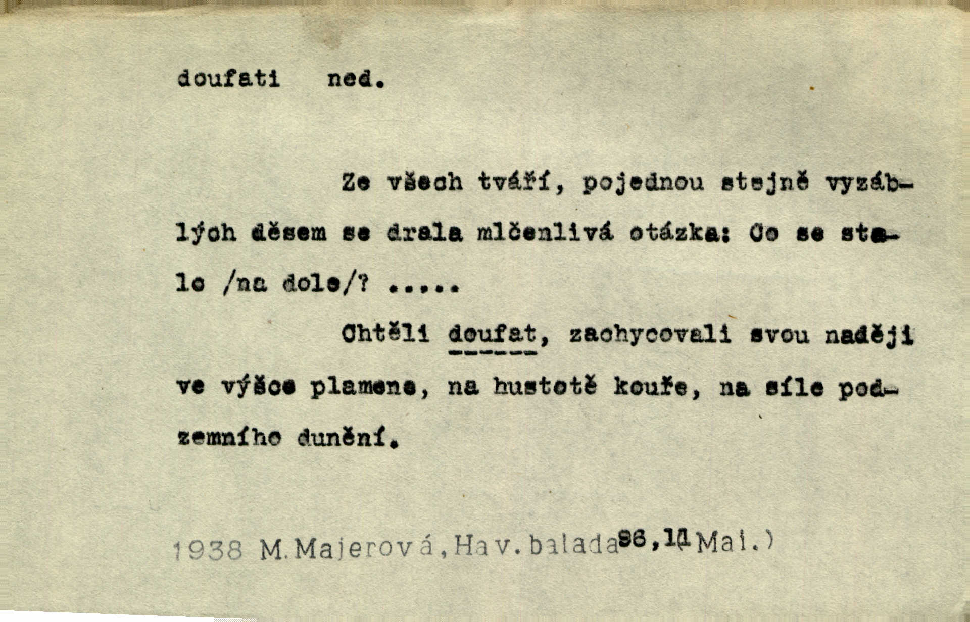 - doufati ned. (co n. čeho, v koho, več, nač) oddávati se naději, činiti si n. míti naději, nadíti se, míti důvěru, s důvěrou očekávati, spoléhati. Pohlédla k němu úzkostně, jako by od něho spásu doufala. Jir. Hrdlička od nové doby snášelivé a osvícené doufá nové léto i pro rozkvět našeho jazyka. J. Vlč. Polož na jednu váhu všechny nepříjemnosti, na druhou všechen zisk, jejž do svého poslancování doufáš. Staš. U babičky doufala zajisté lepšího vděku za svou novinku. Herb. Kurfiřt byl se totiž znovu uchýlil s žádostmi svými k císaři, od něhož jediné mohl doufati pomoci. Pekárek. Pevně jsem doufal v tebe, Hospodine. Erb. Doufám na věčnou spásu hříšné svojí duše. Vrch. Zítra povím vám, zda doufat na mou pomoc můžete. Zey. Ti všichni doufali v rychlé a správné vyřízení své žádosti. V. Mrš. V Boha doufej, a sám foukej. Přísl. Doufám, že náš obchod vydaří se skvěle. Čech.