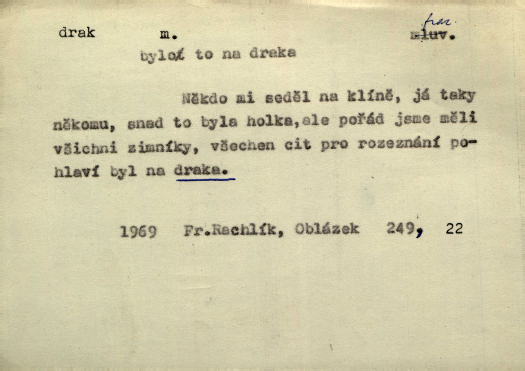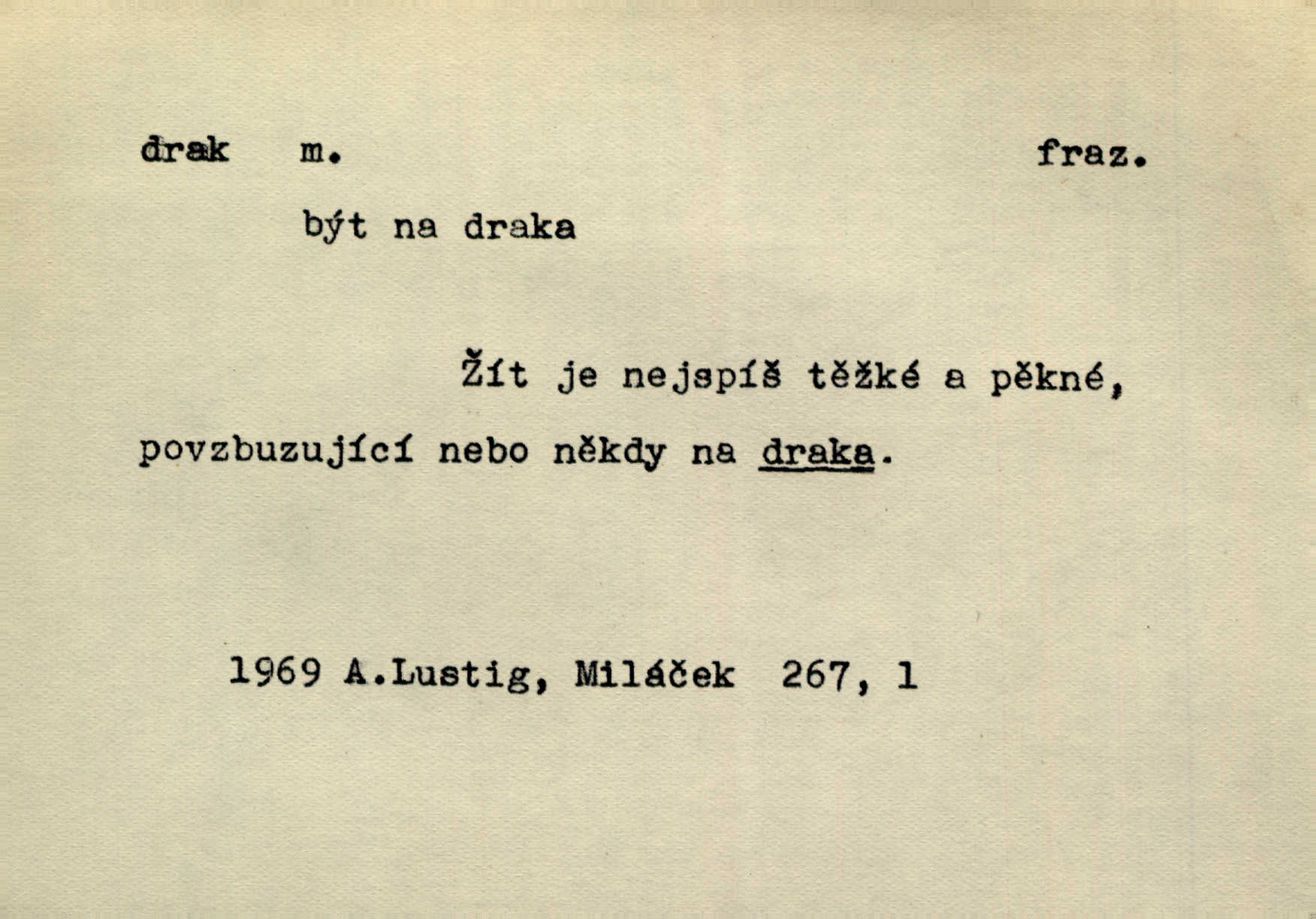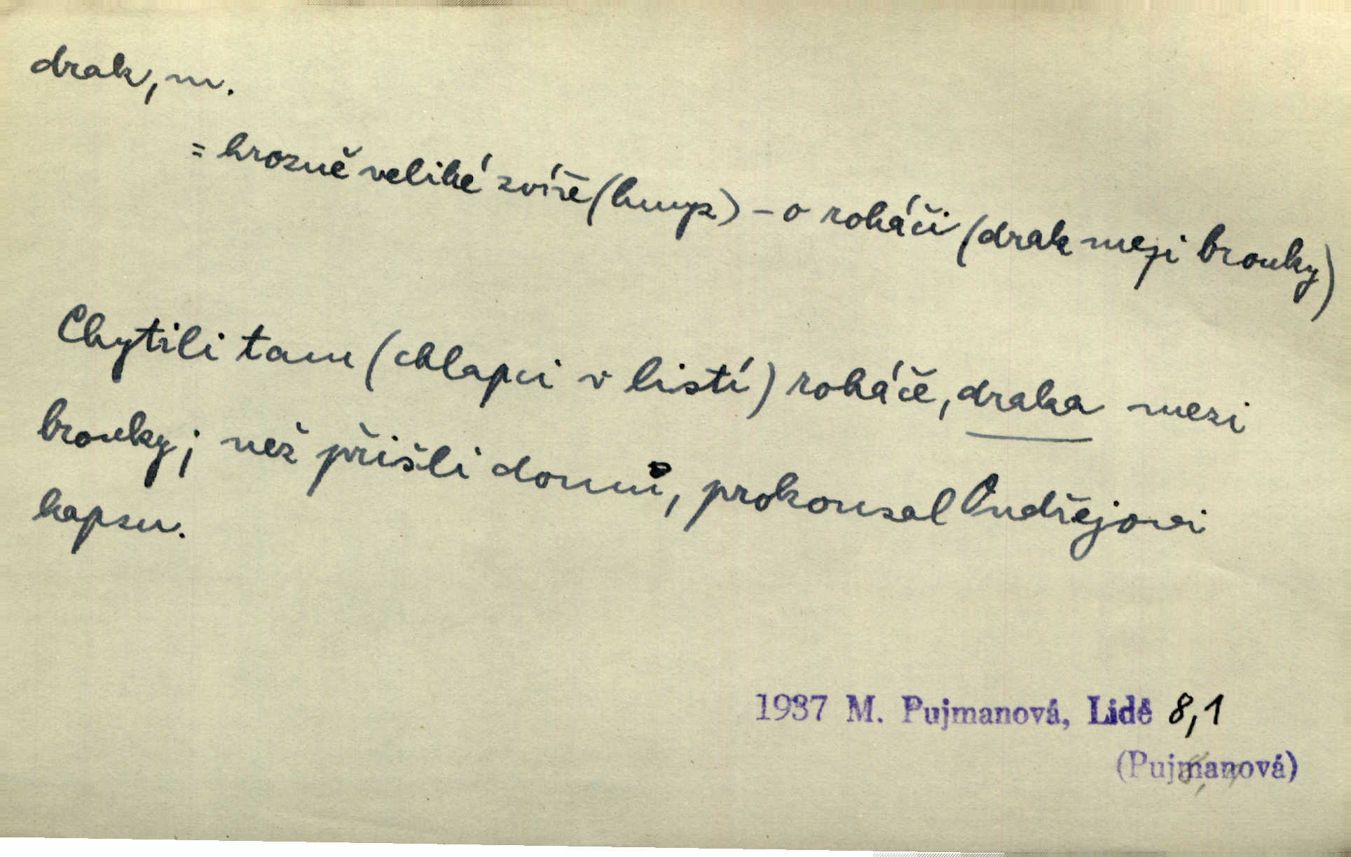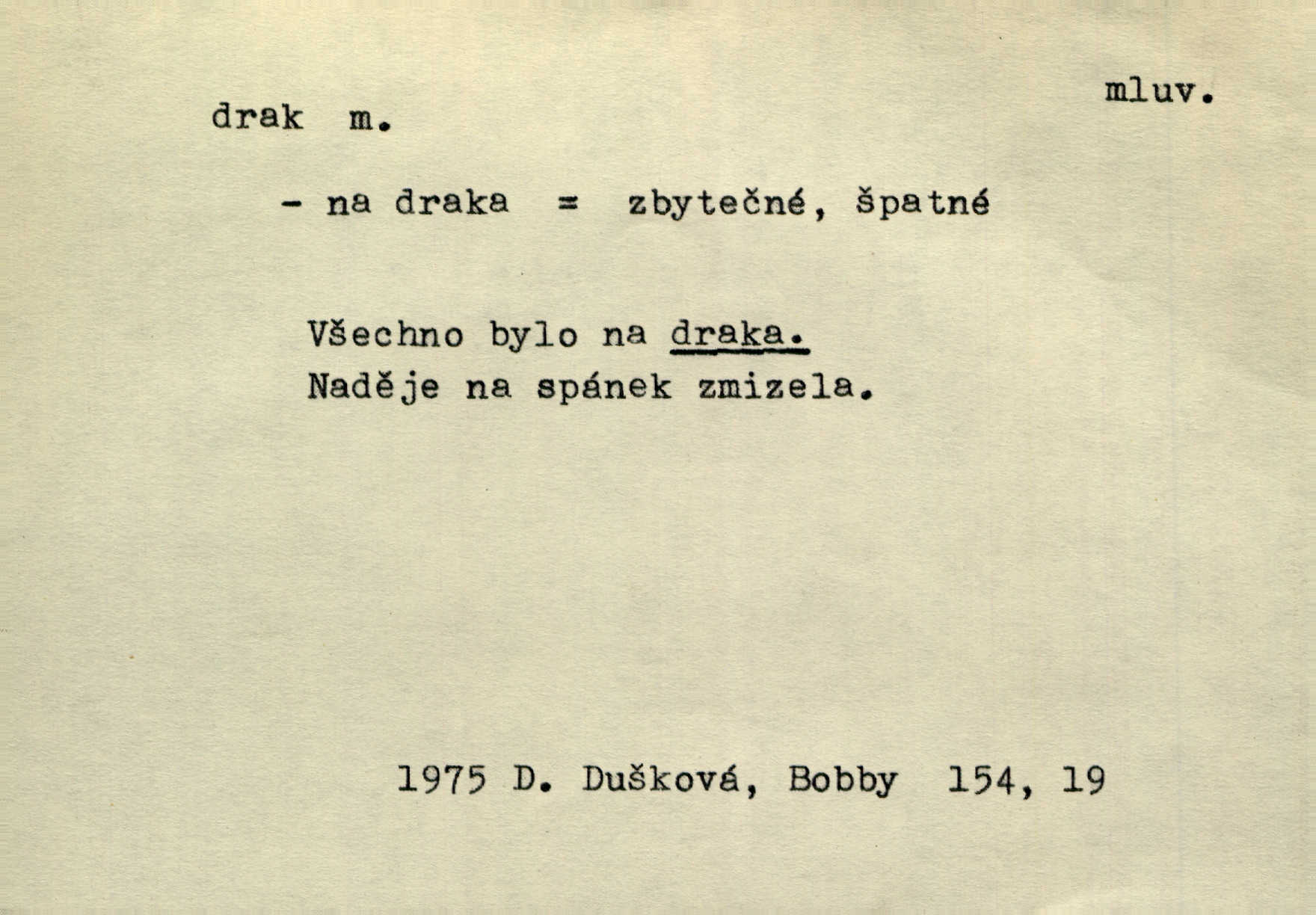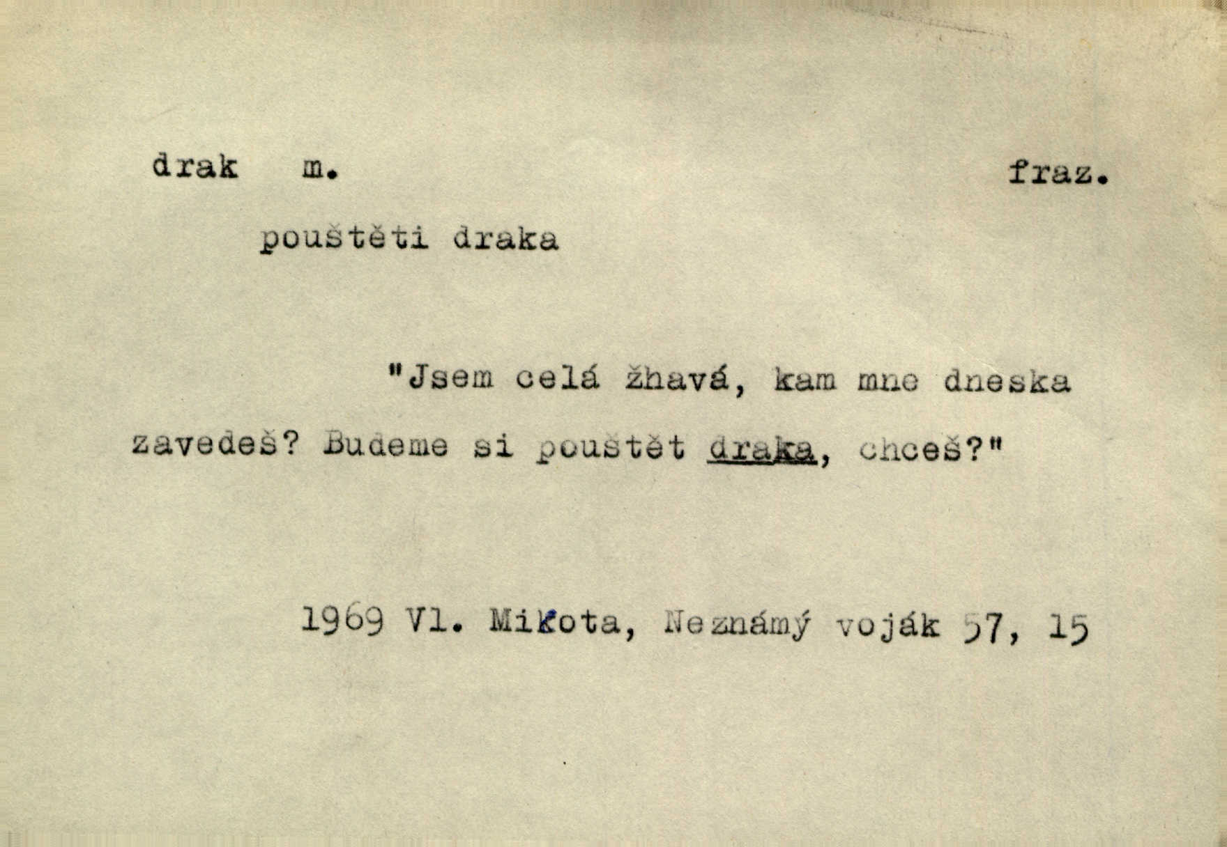 - drak, -a m. pohádková obluda mající podobu okřídleného ještěra, saň. Když přišla až na vykázané místo, spatřila jeskyni, u jejíhož vchodu dva draci hlídali. Něm. Křídla divá drak stříbrný na obě strany stele. Čech. Jako dva ohromní draci soptící dým a oheň valily se parní stroje. Baar. Nad římsami viděti divné arabesky, lvy, jednorožce, draky a jiná fantastická zvířata. Jir. Profesoři byli tenkráte jako draci, celou hodinu jen zkoušeli byli rozvzteklení. Dibl. Kouká někdy jako drak nenávistně. Svob. My bojovali jako draci zuřivě. Vrch. Je do práce jako drak velmi horlivý, prudký. D Arch. ďábel. Pozbav mysl naši mraků [Bože]‚ nedej škodit zlému draku. Suš. D Arch. v kletbách. Tisíc draků — jáť se neznám sám. Voc. Tys po draku chytrý. Sab. Táhni ke draku. Ehrenb. D Bás. o věcech podobných draku vzhledem n. jinými vlastnostmi. Dlouhý železný drak vypletl se supě a syče spoustou vagonů ze začouzené síně římského nádraží vlak. Mach. Jen čistota oběti něžné může zápasit se drakem pýchy. Svob. Drak germanismu dosud úplně poražen není. Hol. D zlý člověk, zvl. zlá žena. Matka je drak. Hál. Ti mají babičku — no pravý drak to je. Přít. Hum. Zapomněl, že už je čas, aby šel domů, že musí odpoledne „vyvíst draka“ [manželku]. Jir. Pravý talent má samé draky proti sobě. Svob. D Hum. neposedné, rozpustilé dítě. Ale tatínku, s radostí vám tu Honzíka necháme, máme doma ještě tři takové draky. Baar. D o bdělém, přísném strážci. Doma střehl ji jako největší poklad starý domácí drak, věrná služka Nany. Podl. D dětská hračka k pouštění po větru. Na svahu za hřbitovem pouštěli dva chlapci papírového draka. Šrám. D Vulg. vzíti draka utéci. U Kazaně se vysadilo asi třicet námořníků, před nimiž kazaňská ochrana „vzala draka“. Lang. D Vulg. Mít draka, koupit si draka opíti se. D Astron. jm. souhvězdí. D Zool. drak mořský ryba z čeledi Pegassidae. D Let. obyčejné letadlo s nehybnými nosnými plochami, drakové letadlo. Met. meteorologický drak létací zařízení skříňovitého tvaru, upevněné na drátě a nesoucí meteorologické přístroje. Hosp. druh holubů, dragoun (Columba dimacha).