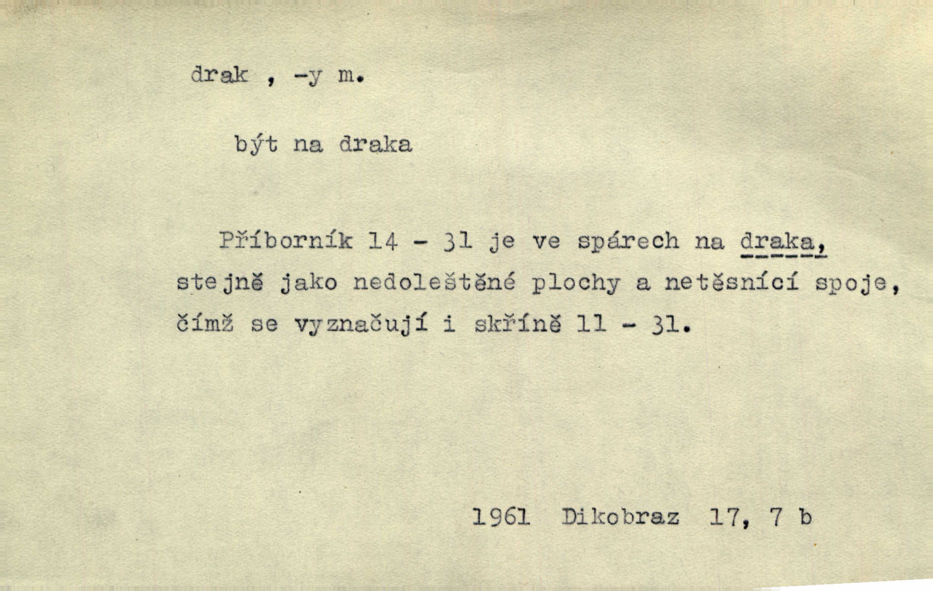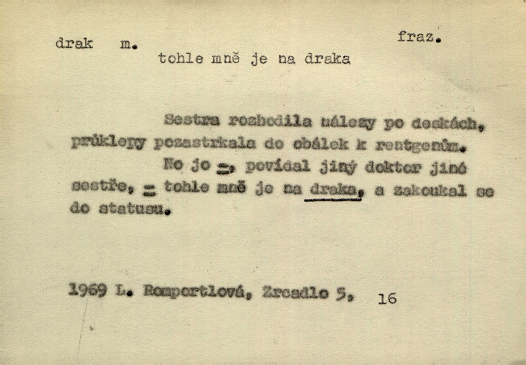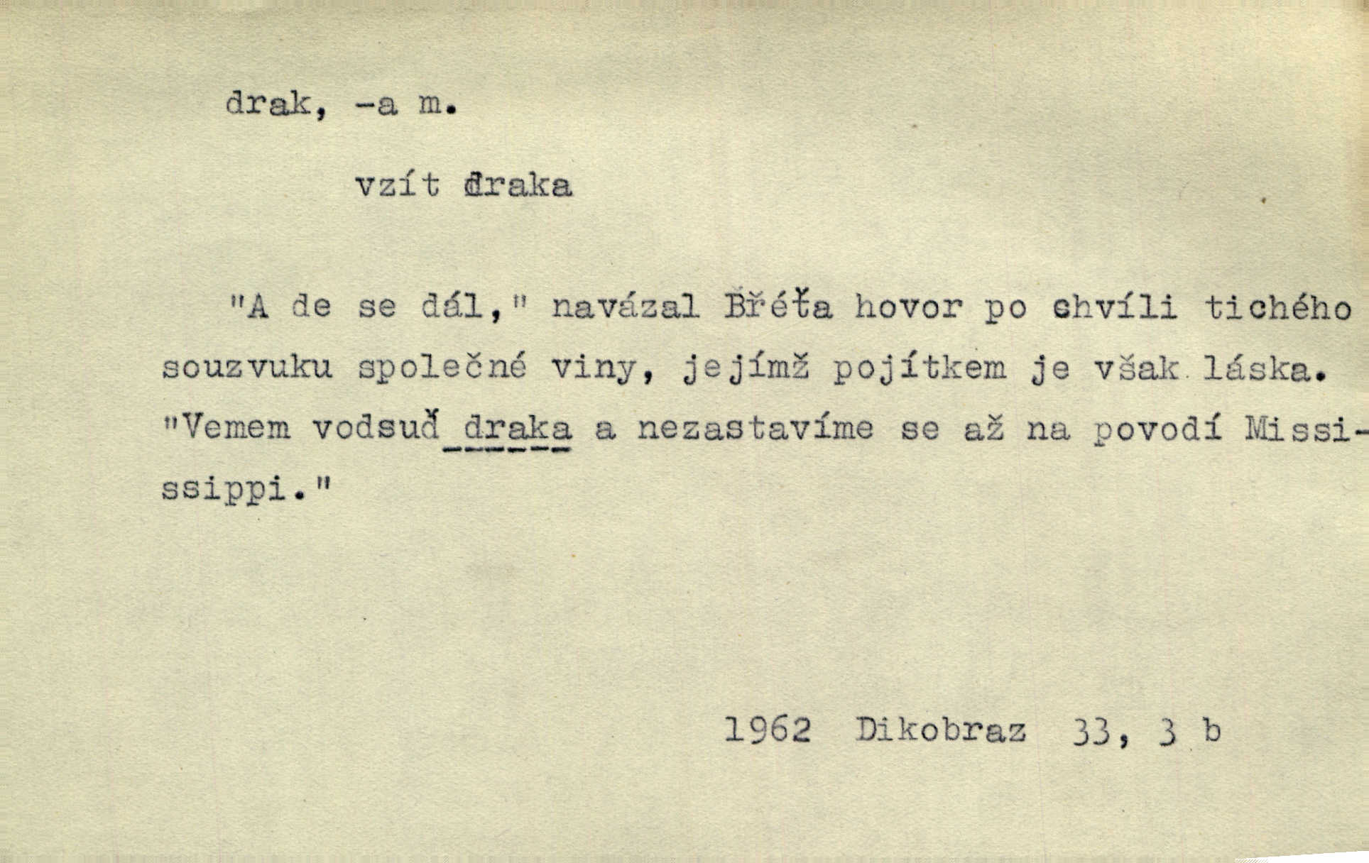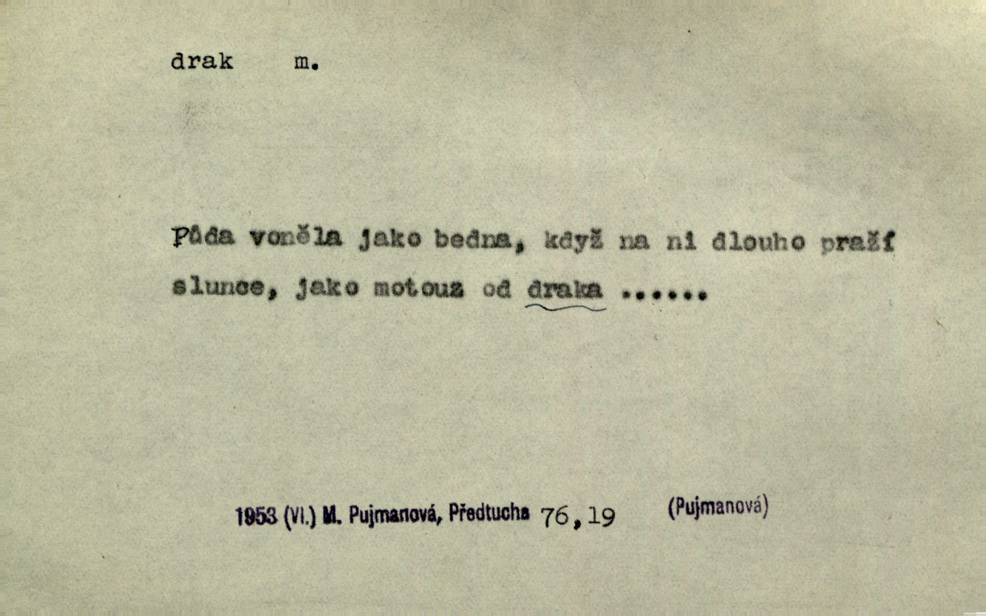 - drak, -a m. pohádková obluda mající podobu okřídleného ještěra, saň. Když přišla až na vykázané místo, spatřila jeskyni, u jejíhož vchodu dva draci hlídali. Něm. Křídla divá drak stříbrný na obě strany stele. Čech. Jako dva ohromní draci soptící dým a oheň valily se parní stroje. Baar. Nad římsami viděti divné arabesky, lvy, jednorožce, draky a jiná fantastická zvířata. Jir. Profesoři byli tenkráte jako draci, celou hodinu jen zkoušeli byli rozvzteklení. Dibl. Kouká někdy jako drak nenávistně. Svob. My bojovali jako draci zuřivě. Vrch. Je do práce jako drak velmi horlivý, prudký. D Arch. ďábel. Pozbav mysl naši mraků [Bože]‚ nedej škodit zlému draku. Suš. D Arch. v kletbách. Tisíc draků — jáť se neznám sám. Voc. Tys po draku chytrý. Sab. Táhni ke draku. Ehrenb. D Bás. o věcech podobných draku vzhledem n. jinými vlastnostmi. Dlouhý železný drak vypletl se supě a syče spoustou vagonů ze začouzené síně římského nádraží vlak. Mach. Jen čistota oběti něžné může zápasit se drakem pýchy. Svob. Drak germanismu dosud úplně poražen není. Hol. D zlý člověk, zvl. zlá žena. Matka je drak. Hál. Ti mají babičku — no pravý drak to je. Přít. Hum. Zapomněl, že už je čas, aby šel domů, že musí odpoledne „vyvíst draka“ [manželku]. Jir. Pravý talent má samé draky proti sobě. Svob. D Hum. neposedné, rozpustilé dítě. Ale tatínku, s radostí vám tu Honzíka necháme, máme doma ještě tři takové draky. Baar. D o bdělém, přísném strážci. Doma střehl ji jako největší poklad starý domácí drak, věrná služka Nany. Podl. D dětská hračka k pouštění po větru. Na svahu za hřbitovem pouštěli dva chlapci papírového draka. Šrám. D Vulg. vzíti draka utéci. U Kazaně se vysadilo asi třicet námořníků, před nimiž kazaňská ochrana „vzala draka“. Lang. D Vulg. Mít draka, koupit si draka opíti se. D Astron. jm. souhvězdí. D Zool. drak mořský ryba z čeledi Pegassidae. D Let. obyčejné letadlo s nehybnými nosnými plochami, drakové letadlo. Met. meteorologický drak létací zařízení skříňovitého tvaru, upevněné na drátě a nesoucí meteorologické přístroje. Hosp. druh holubů, dragoun (Columba dimacha).