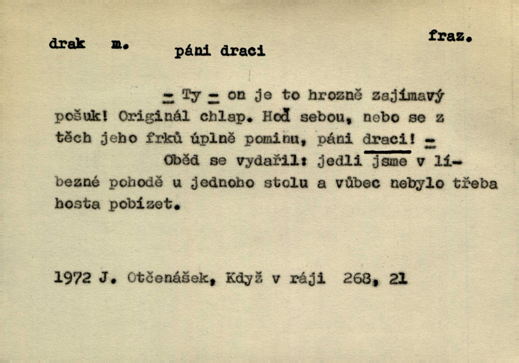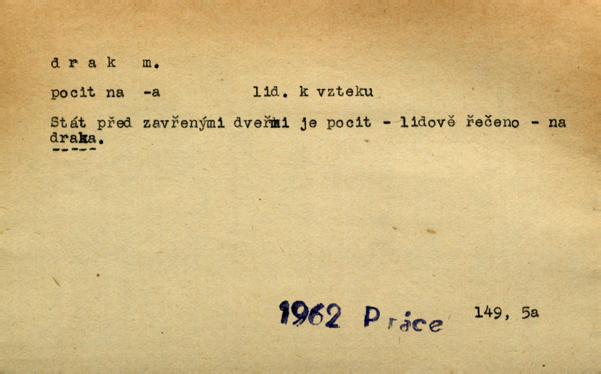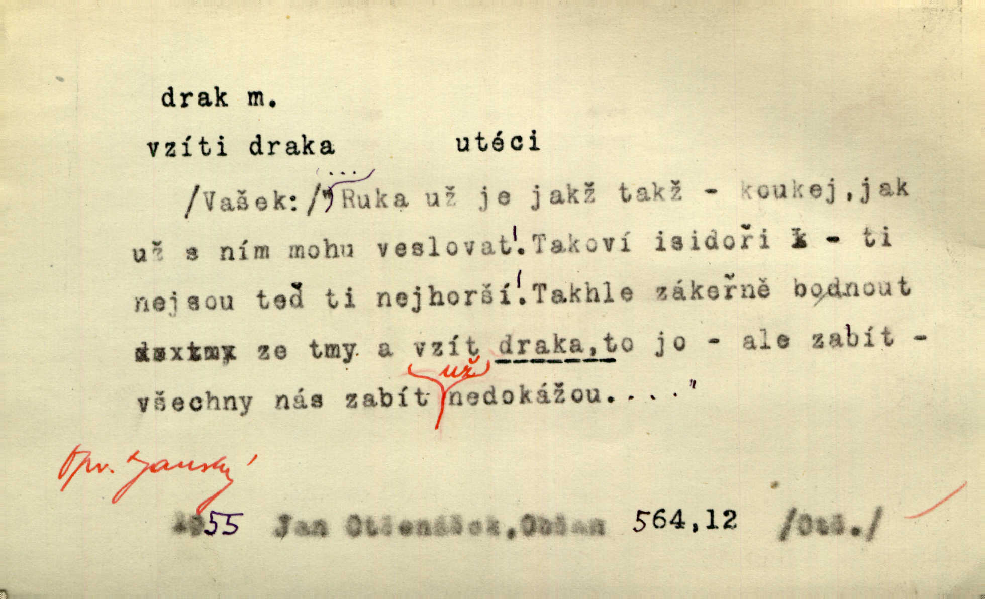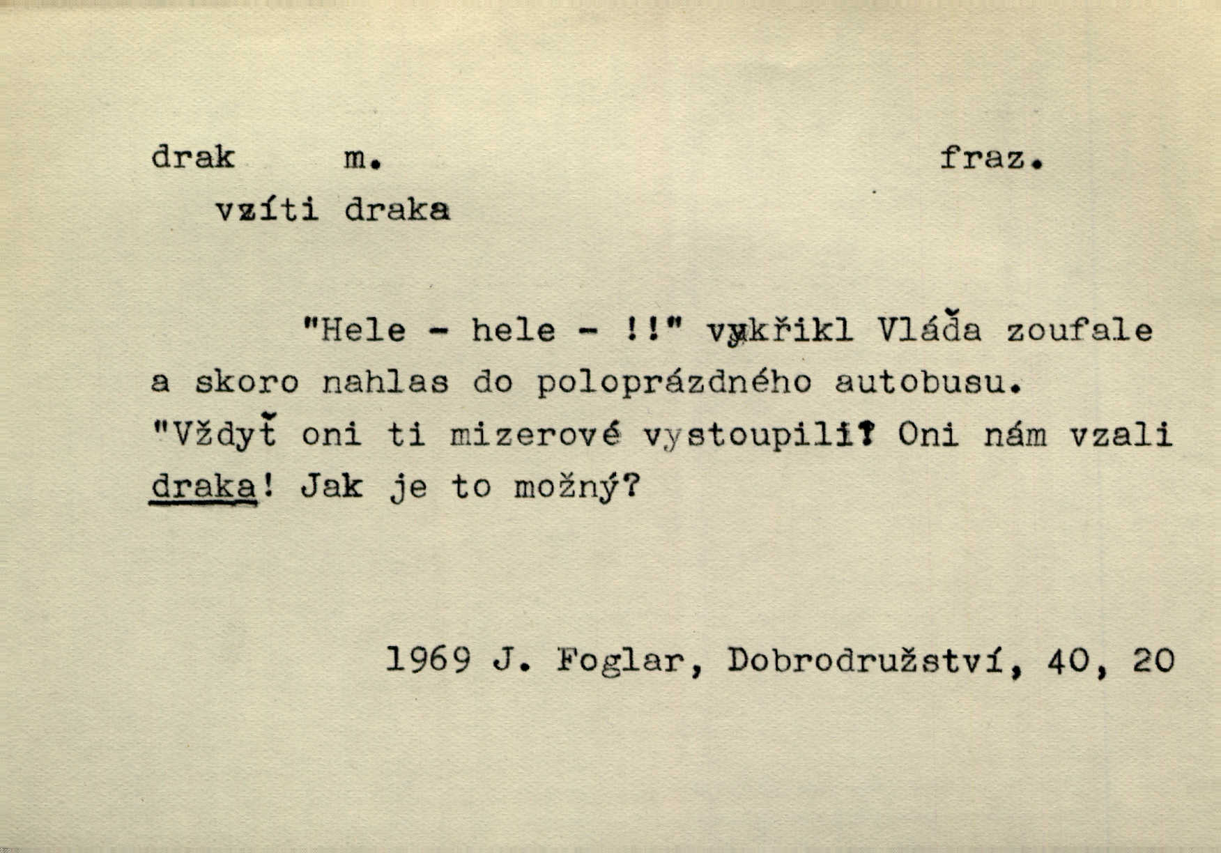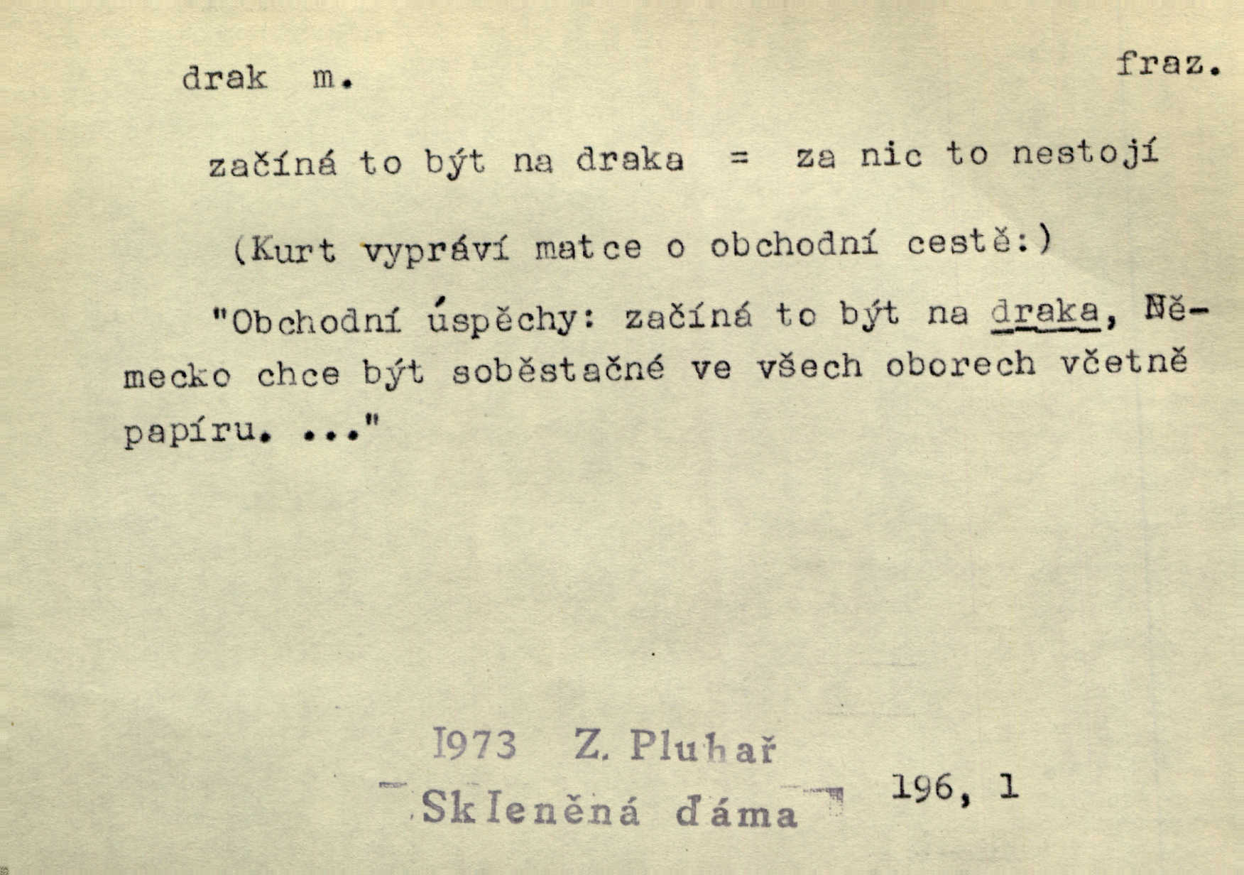 - drak, -a m. pohádková obluda mající podobu okřídleného ještěra, saň. Když přišla až na vykázané místo, spatřila jeskyni, u jejíhož vchodu dva draci hlídali. Něm. Křídla divá drak stříbrný na obě strany stele. Čech. Jako dva ohromní draci soptící dým a oheň valily se parní stroje. Baar. Nad římsami viděti divné arabesky, lvy, jednorožce, draky a jiná fantastická zvířata. Jir. Profesoři byli tenkráte jako draci, celou hodinu jen zkoušeli byli rozvzteklení. Dibl. Kouká někdy jako drak nenávistně. Svob. My bojovali jako draci zuřivě. Vrch. Je do práce jako drak velmi horlivý, prudký. D Arch. ďábel. Pozbav mysl naši mraků [Bože]‚ nedej škodit zlému draku. Suš. D Arch. v kletbách. Tisíc draků — jáť se neznám sám. Voc. Tys po draku chytrý. Sab. Táhni ke draku. Ehrenb. D Bás. o věcech podobných draku vzhledem n. jinými vlastnostmi. Dlouhý železný drak vypletl se supě a syče spoustou vagonů ze začouzené síně římského nádraží vlak. Mach. Jen čistota oběti něžné může zápasit se drakem pýchy. Svob. Drak germanismu dosud úplně poražen není. Hol. D zlý člověk, zvl. zlá žena. Matka je drak. Hál. Ti mají babičku — no pravý drak to je. Přít. Hum. Zapomněl, že už je čas, aby šel domů, že musí odpoledne „vyvíst draka“ [manželku]. Jir. Pravý talent má samé draky proti sobě. Svob. D Hum. neposedné, rozpustilé dítě. Ale tatínku, s radostí vám tu Honzíka necháme, máme doma ještě tři takové draky. Baar. D o bdělém, přísném strážci. Doma střehl ji jako největší poklad starý domácí drak, věrná služka Nany. Podl. D dětská hračka k pouštění po větru. Na svahu za hřbitovem pouštěli dva chlapci papírového draka. Šrám. D Vulg. vzíti draka utéci. U Kazaně se vysadilo asi třicet námořníků, před nimiž kazaňská ochrana „vzala draka“. Lang. D Vulg. Mít draka, koupit si draka opíti se. D Astron. jm. souhvězdí. D Zool. drak mořský ryba z čeledi Pegassidae. D Let. obyčejné letadlo s nehybnými nosnými plochami, drakové letadlo. Met. meteorologický drak létací zařízení skříňovitého tvaru, upevněné na drátě a nesoucí meteorologické přístroje. Hosp. druh holubů, dragoun (Columba dimacha).