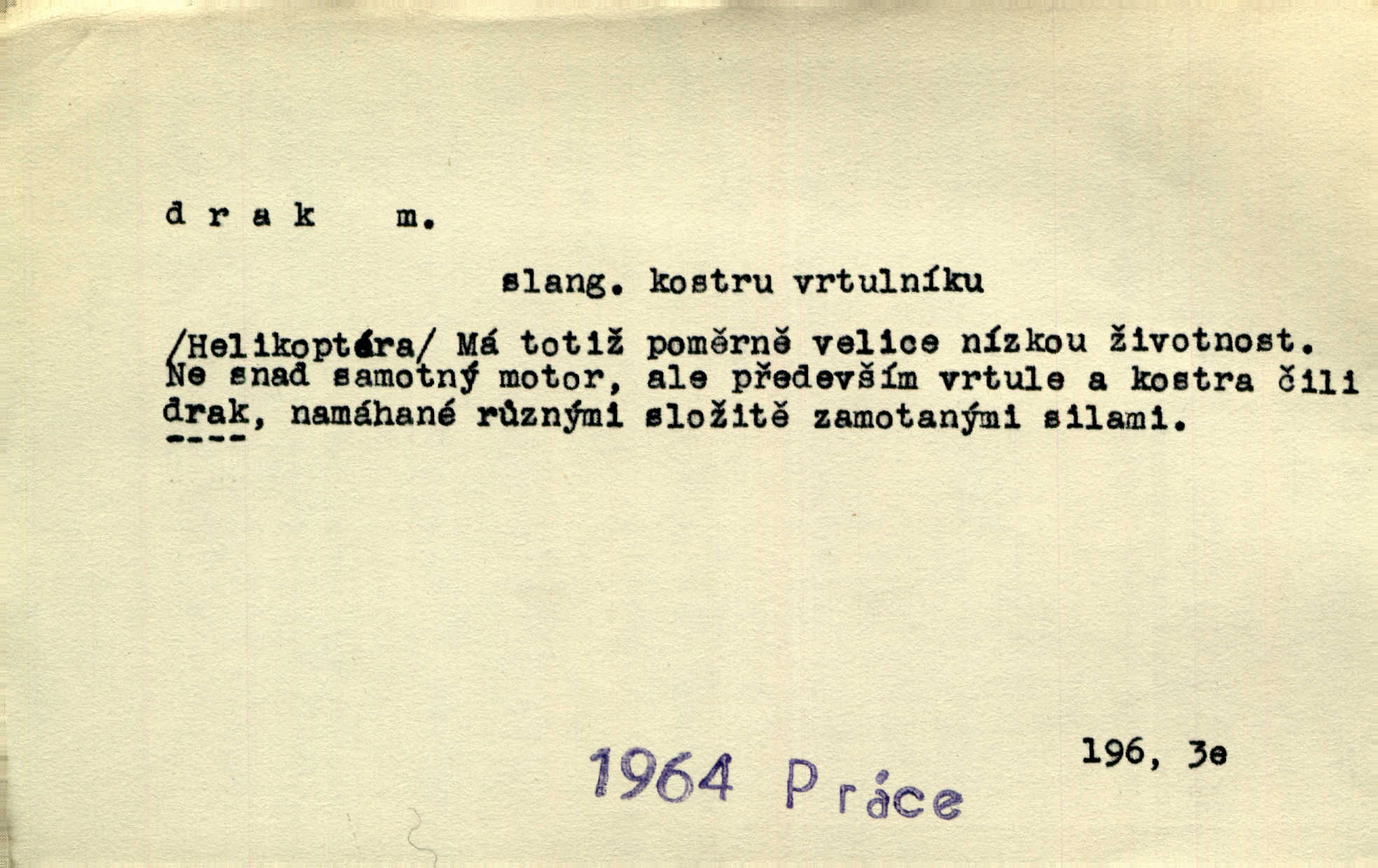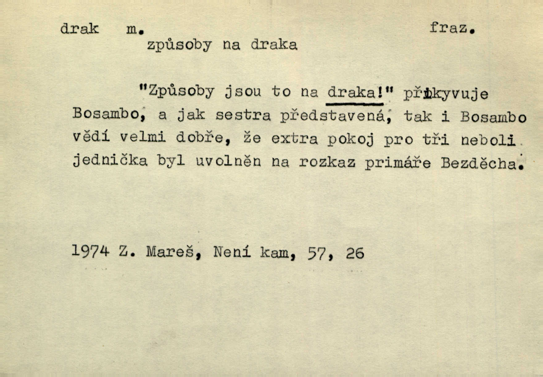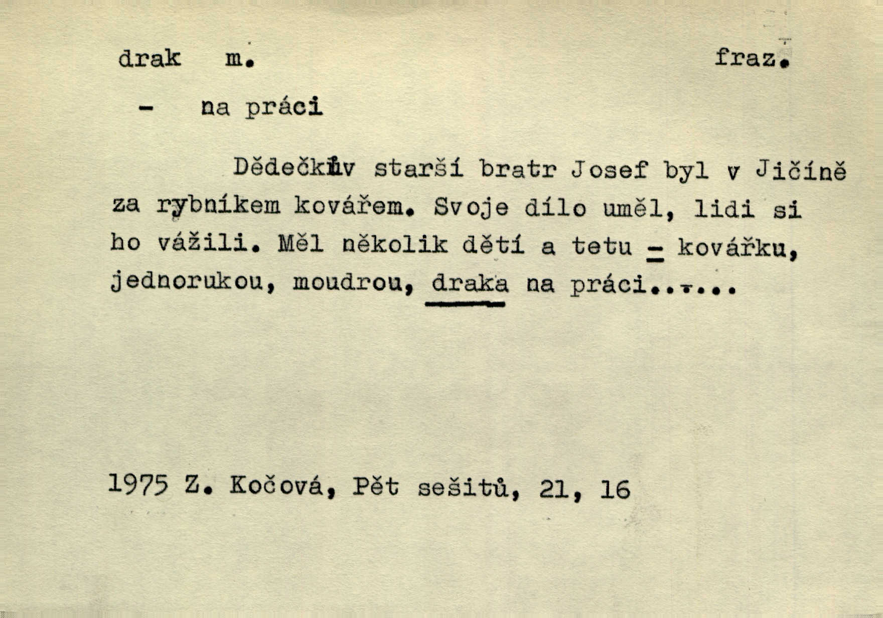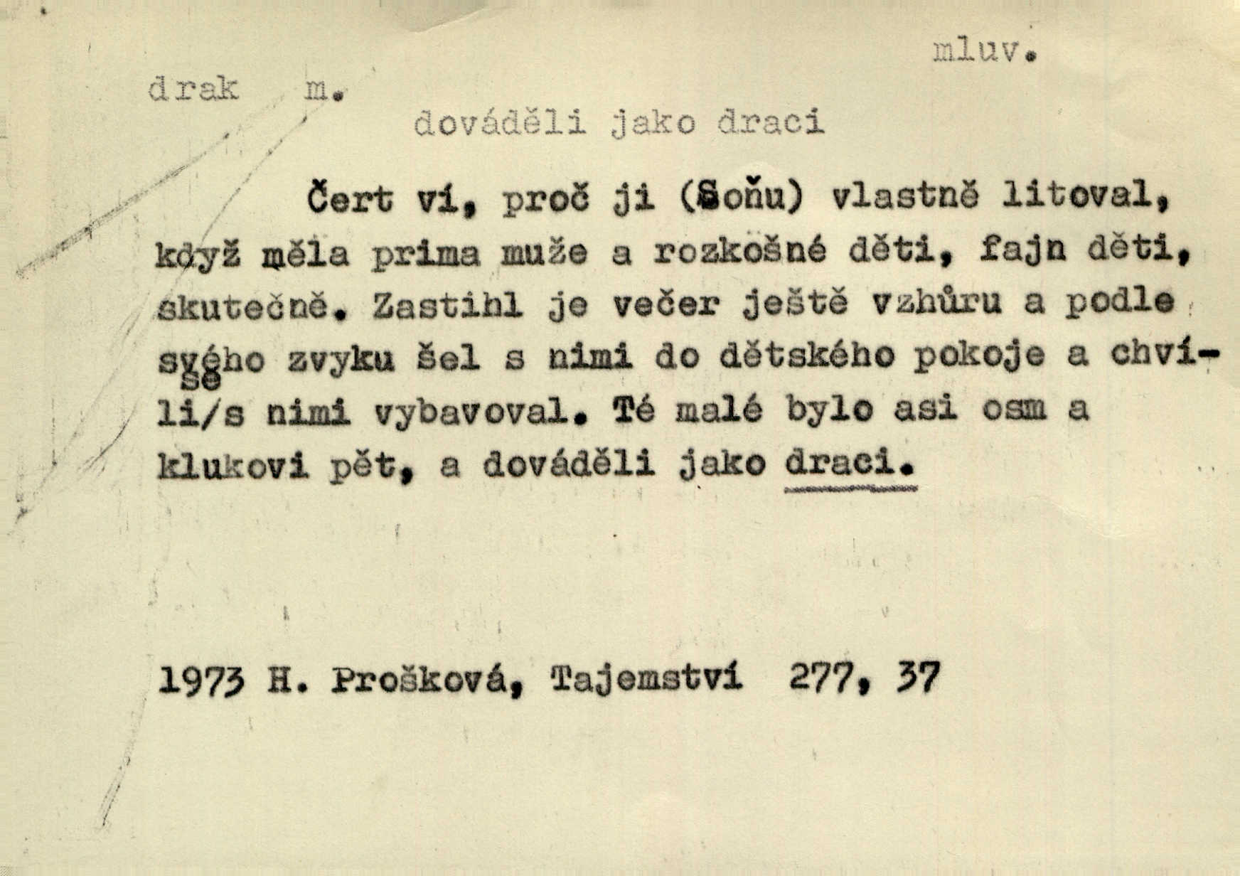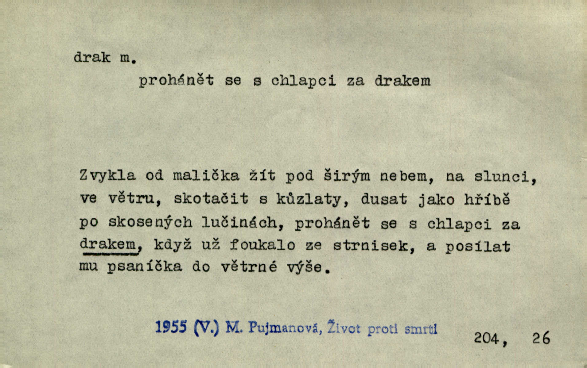 - drak, -a m. pohádková obluda mající podobu okřídleného ještěra, saň. Když přišla až na vykázané místo, spatřila jeskyni, u jejíhož vchodu dva draci hlídali. Něm. Křídla divá drak stříbrný na obě strany stele. Čech. Jako dva ohromní draci soptící dým a oheň valily se parní stroje. Baar. Nad římsami viděti divné arabesky, lvy, jednorožce, draky a jiná fantastická zvířata. Jir. Profesoři byli tenkráte jako draci, celou hodinu jen zkoušeli byli rozvzteklení. Dibl. Kouká někdy jako drak nenávistně. Svob. My bojovali jako draci zuřivě. Vrch. Je do práce jako drak velmi horlivý, prudký. D Arch. ďábel. Pozbav mysl naši mraků [Bože]‚ nedej škodit zlému draku. Suš. D Arch. v kletbách. Tisíc draků — jáť se neznám sám. Voc. Tys po draku chytrý. Sab. Táhni ke draku. Ehrenb. D Bás. o věcech podobných draku vzhledem n. jinými vlastnostmi. Dlouhý železný drak vypletl se supě a syče spoustou vagonů ze začouzené síně římského nádraží vlak. Mach. Jen čistota oběti něžné může zápasit se drakem pýchy. Svob. Drak germanismu dosud úplně poražen není. Hol. D zlý člověk, zvl. zlá žena. Matka je drak. Hál. Ti mají babičku — no pravý drak to je. Přít. Hum. Zapomněl, že už je čas, aby šel domů, že musí odpoledne „vyvíst draka“ [manželku]. Jir. Pravý talent má samé draky proti sobě. Svob. D Hum. neposedné, rozpustilé dítě. Ale tatínku, s radostí vám tu Honzíka necháme, máme doma ještě tři takové draky. Baar. D o bdělém, přísném strážci. Doma střehl ji jako největší poklad starý domácí drak, věrná služka Nany. Podl. D dětská hračka k pouštění po větru. Na svahu za hřbitovem pouštěli dva chlapci papírového draka. Šrám. D Vulg. vzíti draka utéci. U Kazaně se vysadilo asi třicet námořníků, před nimiž kazaňská ochrana „vzala draka“. Lang. D Vulg. Mít draka, koupit si draka opíti se. D Astron. jm. souhvězdí. D Zool. drak mořský ryba z čeledi Pegassidae. D Let. obyčejné letadlo s nehybnými nosnými plochami, drakové letadlo. Met. meteorologický drak létací zařízení skříňovitého tvaru, upevněné na drátě a nesoucí meteorologické přístroje. Hosp. druh holubů, dragoun (Columba dimacha).