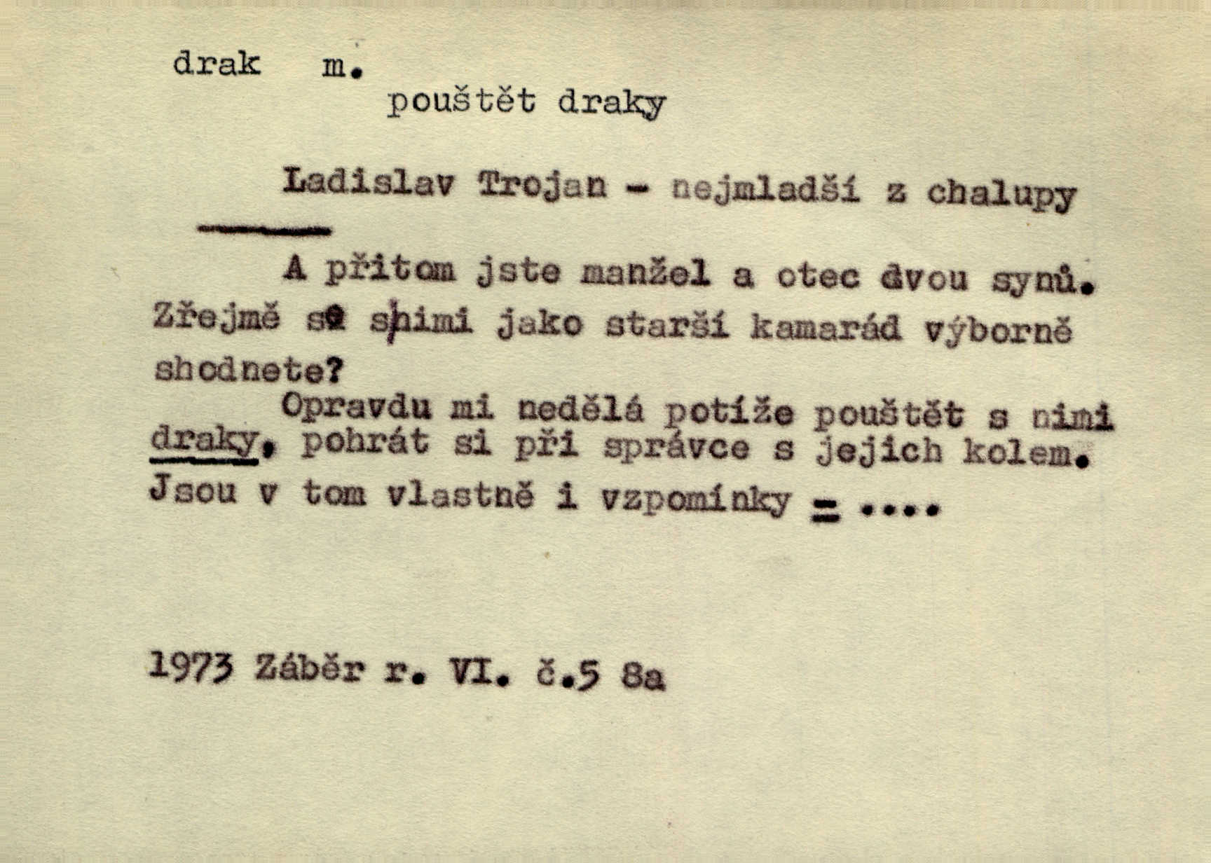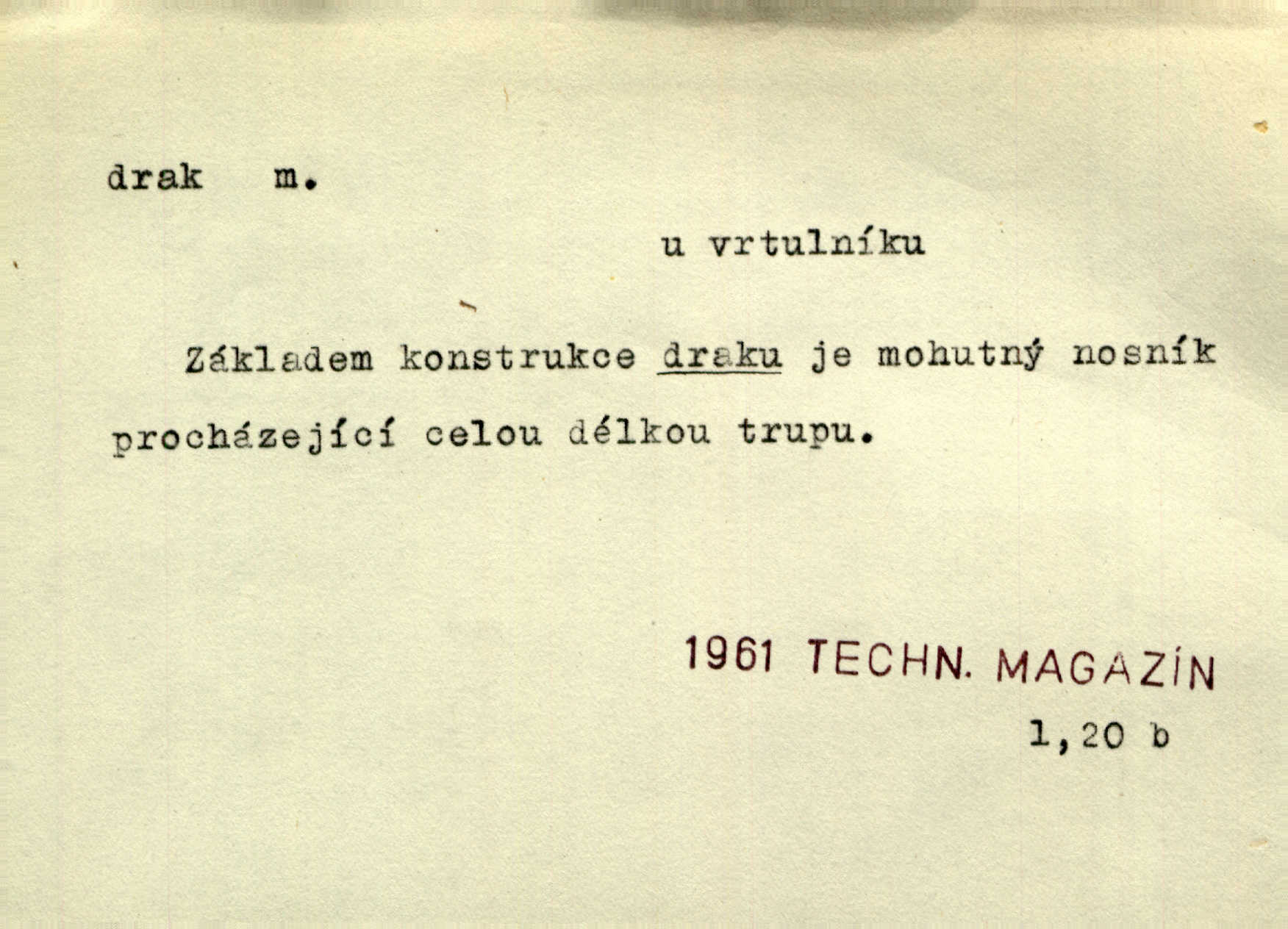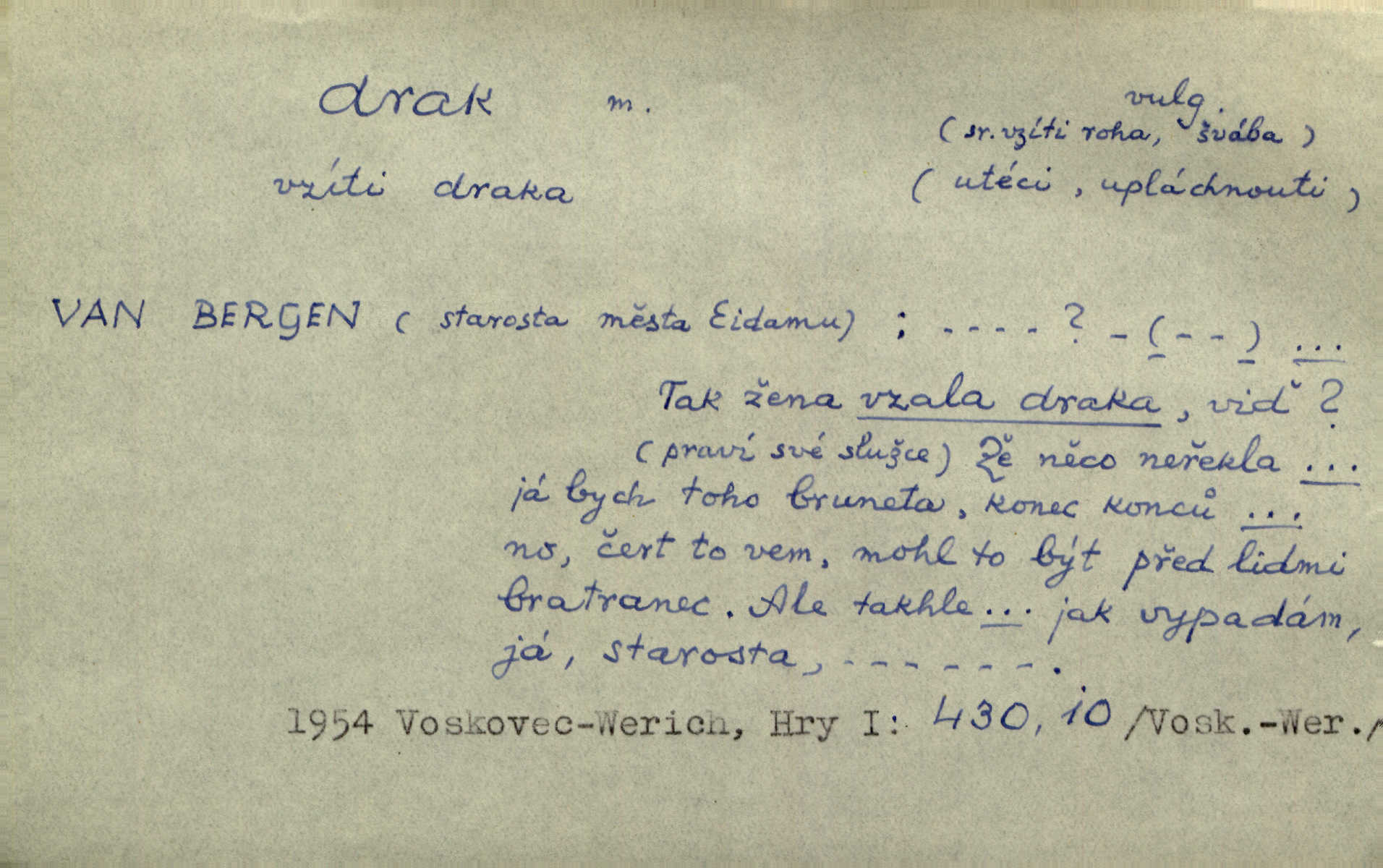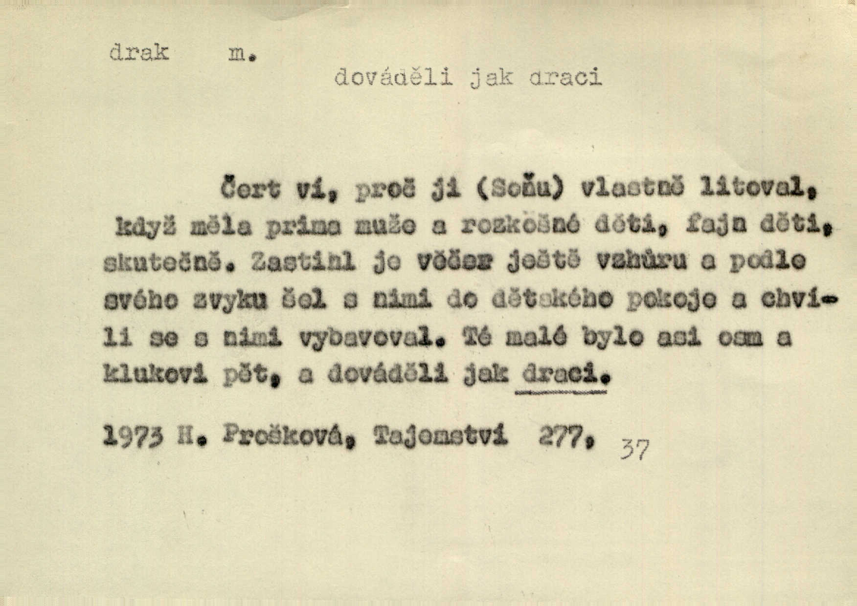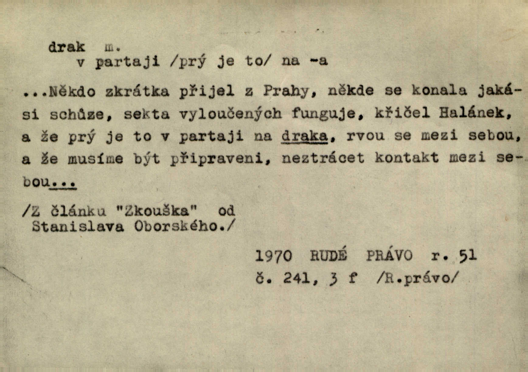 - drak, -a m. pohádková obluda mající podobu okřídleného ještěra, saň. Když přišla až na vykázané místo, spatřila jeskyni, u jejíhož vchodu dva draci hlídali. Něm. Křídla divá drak stříbrný na obě strany stele. Čech. Jako dva ohromní draci soptící dým a oheň valily se parní stroje. Baar. Nad římsami viděti divné arabesky, lvy, jednorožce, draky a jiná fantastická zvířata. Jir. Profesoři byli tenkráte jako draci, celou hodinu jen zkoušeli byli rozvzteklení. Dibl. Kouká někdy jako drak nenávistně. Svob. My bojovali jako draci zuřivě. Vrch. Je do práce jako drak velmi horlivý, prudký. D Arch. ďábel. Pozbav mysl naši mraků [Bože]‚ nedej škodit zlému draku. Suš. D Arch. v kletbách. Tisíc draků — jáť se neznám sám. Voc. Tys po draku chytrý. Sab. Táhni ke draku. Ehrenb. D Bás. o věcech podobných draku vzhledem n. jinými vlastnostmi. Dlouhý železný drak vypletl se supě a syče spoustou vagonů ze začouzené síně římského nádraží vlak. Mach. Jen čistota oběti něžné může zápasit se drakem pýchy. Svob. Drak germanismu dosud úplně poražen není. Hol. D zlý člověk, zvl. zlá žena. Matka je drak. Hál. Ti mají babičku — no pravý drak to je. Přít. Hum. Zapomněl, že už je čas, aby šel domů, že musí odpoledne „vyvíst draka“ [manželku]. Jir. Pravý talent má samé draky proti sobě. Svob. D Hum. neposedné, rozpustilé dítě. Ale tatínku, s radostí vám tu Honzíka necháme, máme doma ještě tři takové draky. Baar. D o bdělém, přísném strážci. Doma střehl ji jako největší poklad starý domácí drak, věrná služka Nany. Podl. D dětská hračka k pouštění po větru. Na svahu za hřbitovem pouštěli dva chlapci papírového draka. Šrám. D Vulg. vzíti draka utéci. U Kazaně se vysadilo asi třicet námořníků, před nimiž kazaňská ochrana „vzala draka“. Lang. D Vulg. Mít draka, koupit si draka opíti se. D Astron. jm. souhvězdí. D Zool. drak mořský ryba z čeledi Pegassidae. D Let. obyčejné letadlo s nehybnými nosnými plochami, drakové letadlo. Met. meteorologický drak létací zařízení skříňovitého tvaru, upevněné na drátě a nesoucí meteorologické přístroje. Hosp. druh holubů, dragoun (Columba dimacha).