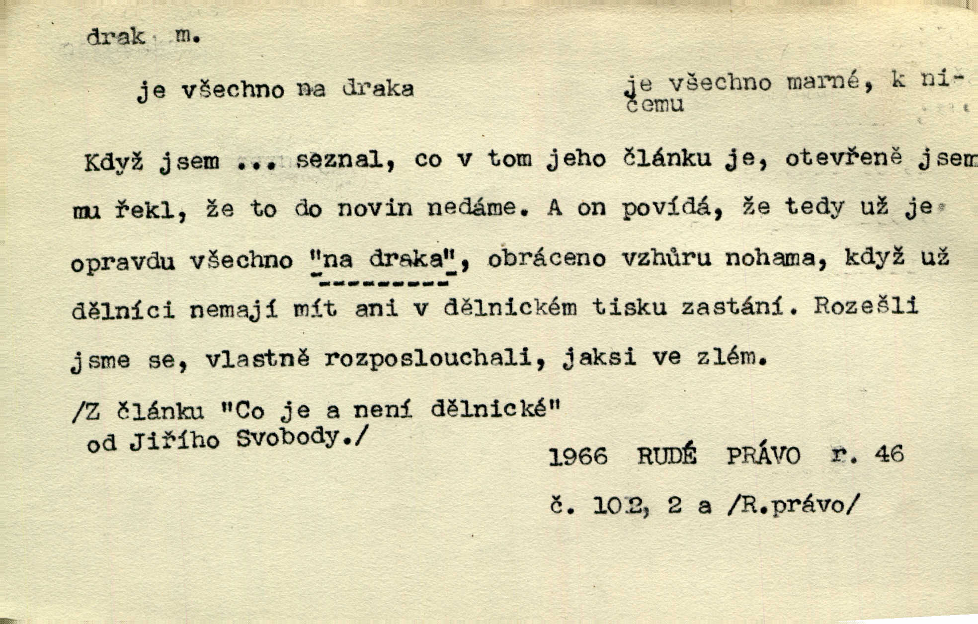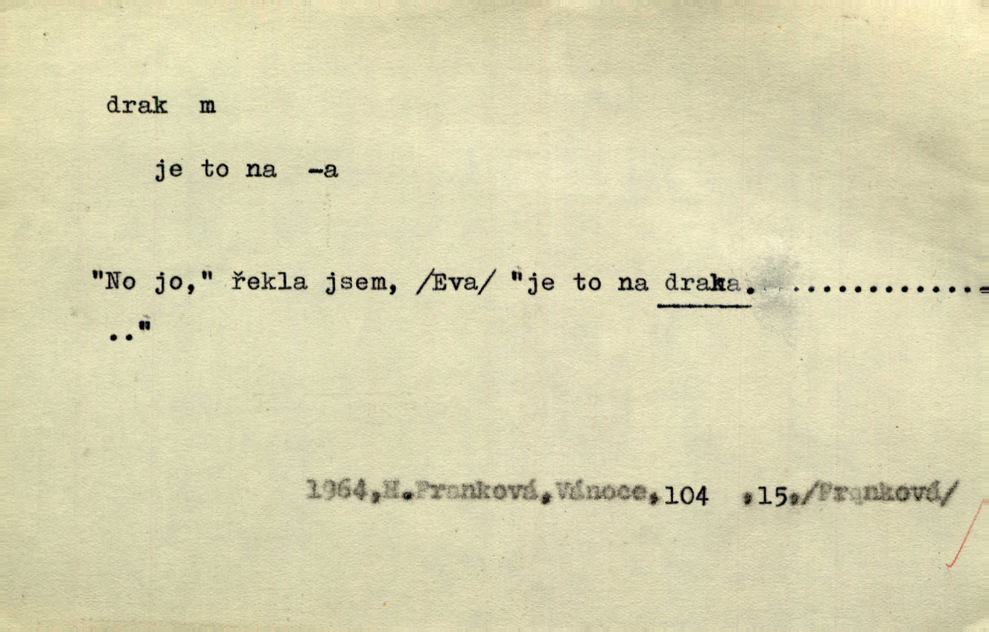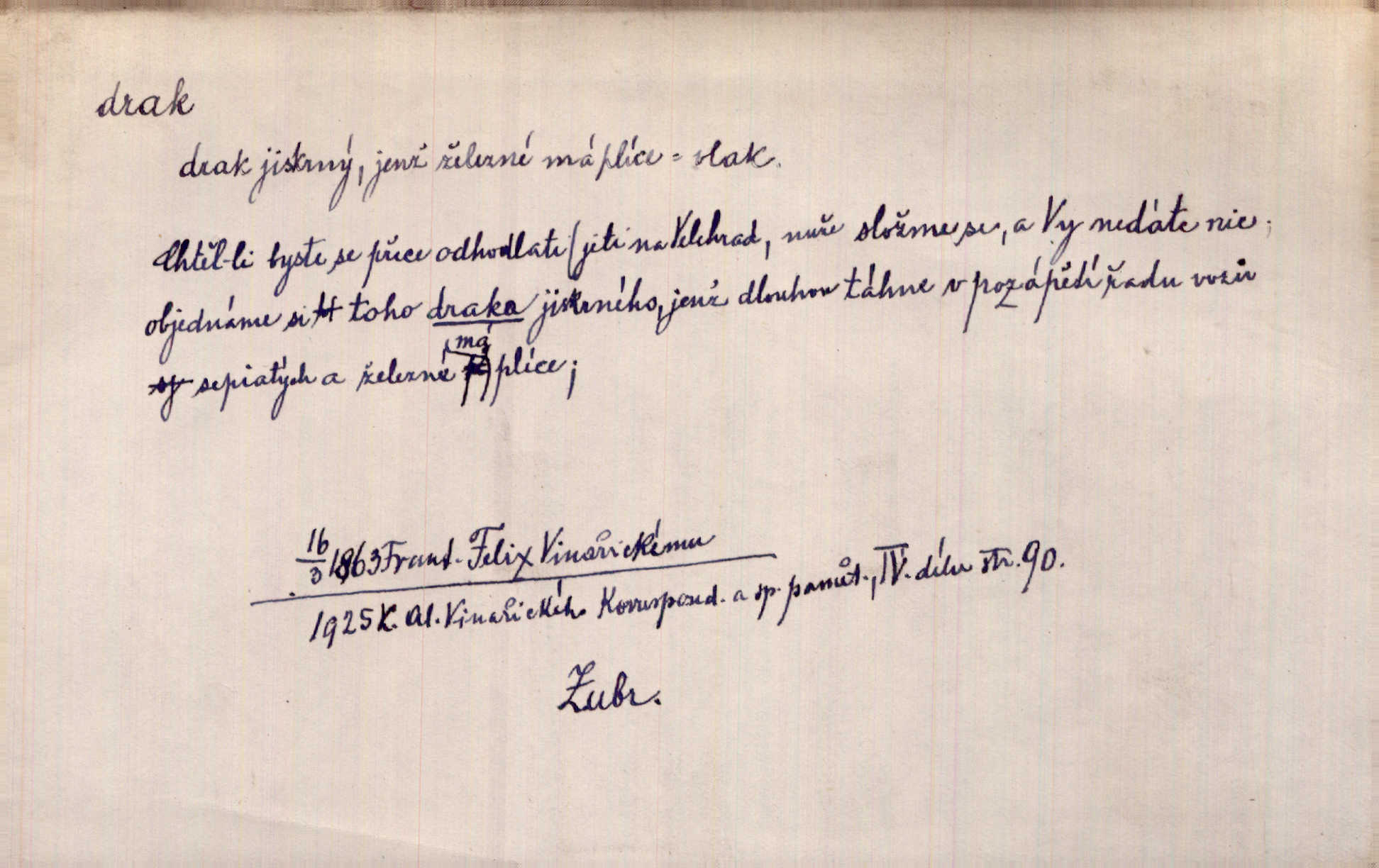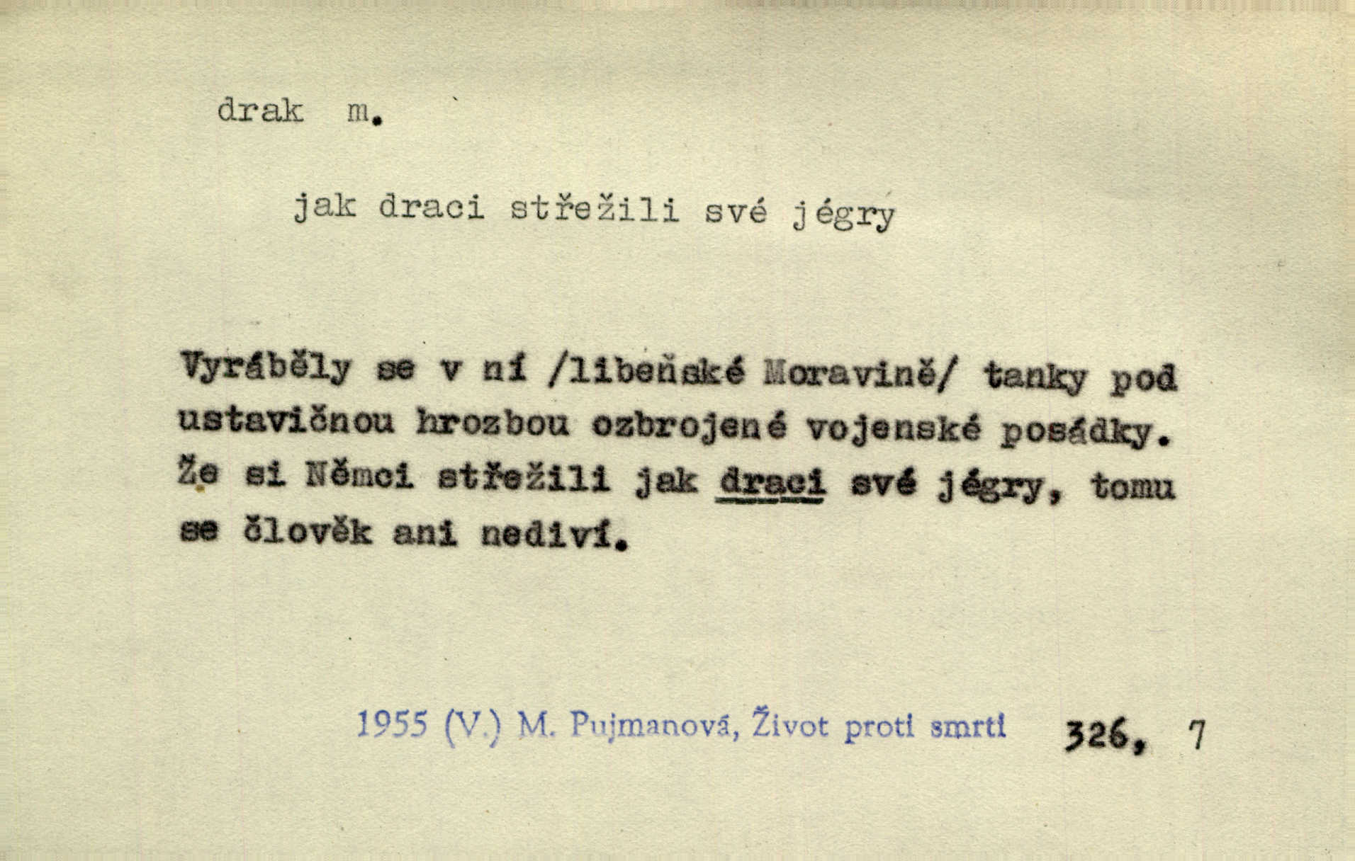 - drak, -a m. pohádková obluda mající podobu okřídleného ještěra, saň. Když přišla až na vykázané místo, spatřila jeskyni, u jejíhož vchodu dva draci hlídali. Něm. Křídla divá drak stříbrný na obě strany stele. Čech. Jako dva ohromní draci soptící dým a oheň valily se parní stroje. Baar. Nad římsami viděti divné arabesky, lvy, jednorožce, draky a jiná fantastická zvířata. Jir. Profesoři byli tenkráte jako draci, celou hodinu jen zkoušeli byli rozvzteklení. Dibl. Kouká někdy jako drak nenávistně. Svob. My bojovali jako draci zuřivě. Vrch. Je do práce jako drak velmi horlivý, prudký. D Arch. ďábel. Pozbav mysl naši mraků [Bože]‚ nedej škodit zlému draku. Suš. D Arch. v kletbách. Tisíc draků — jáť se neznám sám. Voc. Tys po draku chytrý. Sab. Táhni ke draku. Ehrenb. D Bás. o věcech podobných draku vzhledem n. jinými vlastnostmi. Dlouhý železný drak vypletl se supě a syče spoustou vagonů ze začouzené síně římského nádraží vlak. Mach. Jen čistota oběti něžné může zápasit se drakem pýchy. Svob. Drak germanismu dosud úplně poražen není. Hol. D zlý člověk, zvl. zlá žena. Matka je drak. Hál. Ti mají babičku — no pravý drak to je. Přít. Hum. Zapomněl, že už je čas, aby šel domů, že musí odpoledne „vyvíst draka“ [manželku]. Jir. Pravý talent má samé draky proti sobě. Svob. D Hum. neposedné, rozpustilé dítě. Ale tatínku, s radostí vám tu Honzíka necháme, máme doma ještě tři takové draky. Baar. D o bdělém, přísném strážci. Doma střehl ji jako největší poklad starý domácí drak, věrná služka Nany. Podl. D dětská hračka k pouštění po větru. Na svahu za hřbitovem pouštěli dva chlapci papírového draka. Šrám. D Vulg. vzíti draka utéci. U Kazaně se vysadilo asi třicet námořníků, před nimiž kazaňská ochrana „vzala draka“. Lang. D Vulg. Mít draka, koupit si draka opíti se. D Astron. jm. souhvězdí. D Zool. drak mořský ryba z čeledi Pegassidae. D Let. obyčejné letadlo s nehybnými nosnými plochami, drakové letadlo. Met. meteorologický drak létací zařízení skříňovitého tvaru, upevněné na drátě a nesoucí meteorologické přístroje. Hosp. druh holubů, dragoun (Columba dimacha).