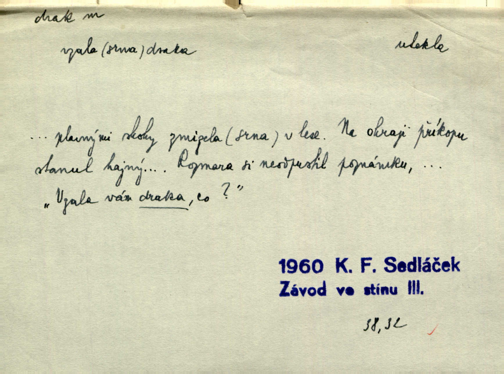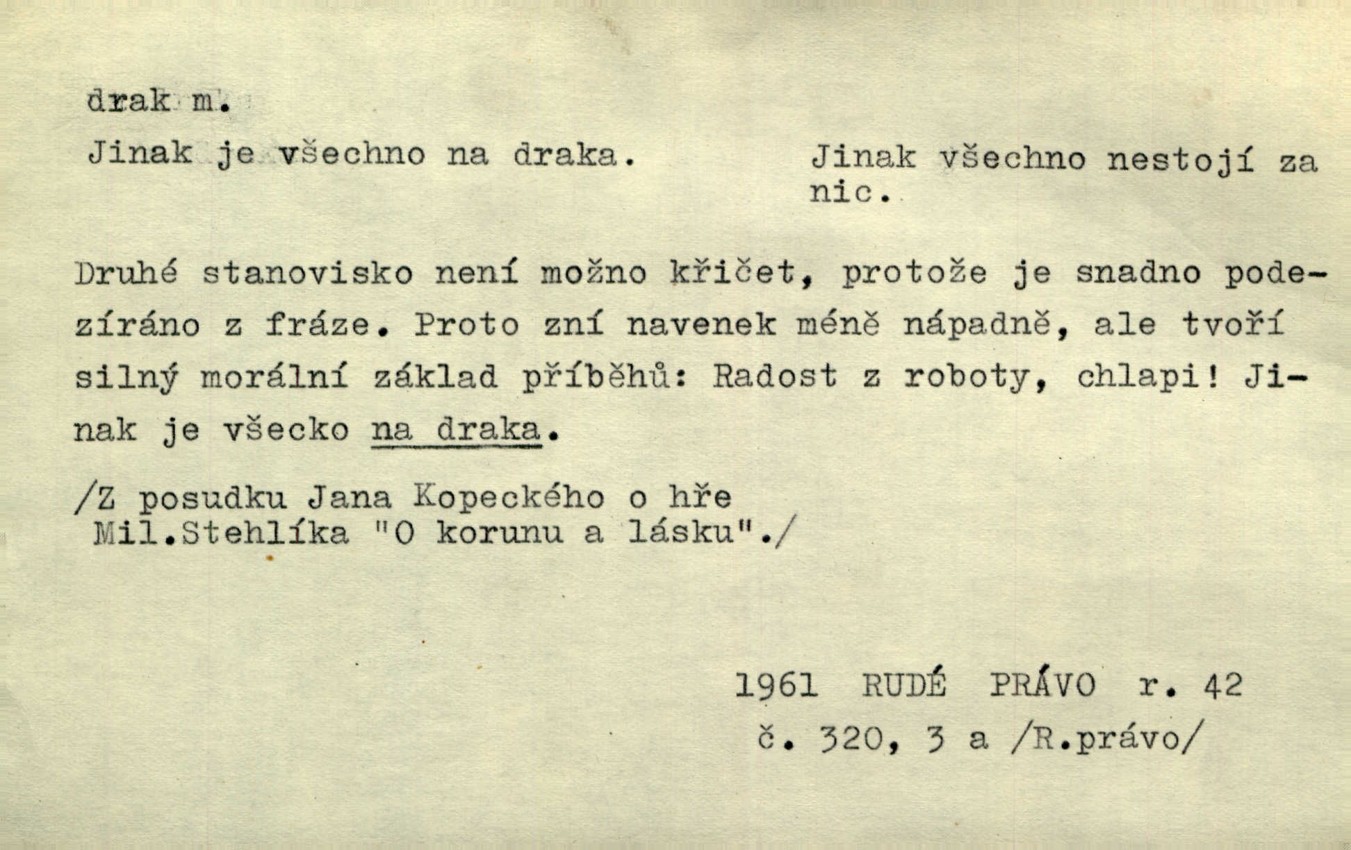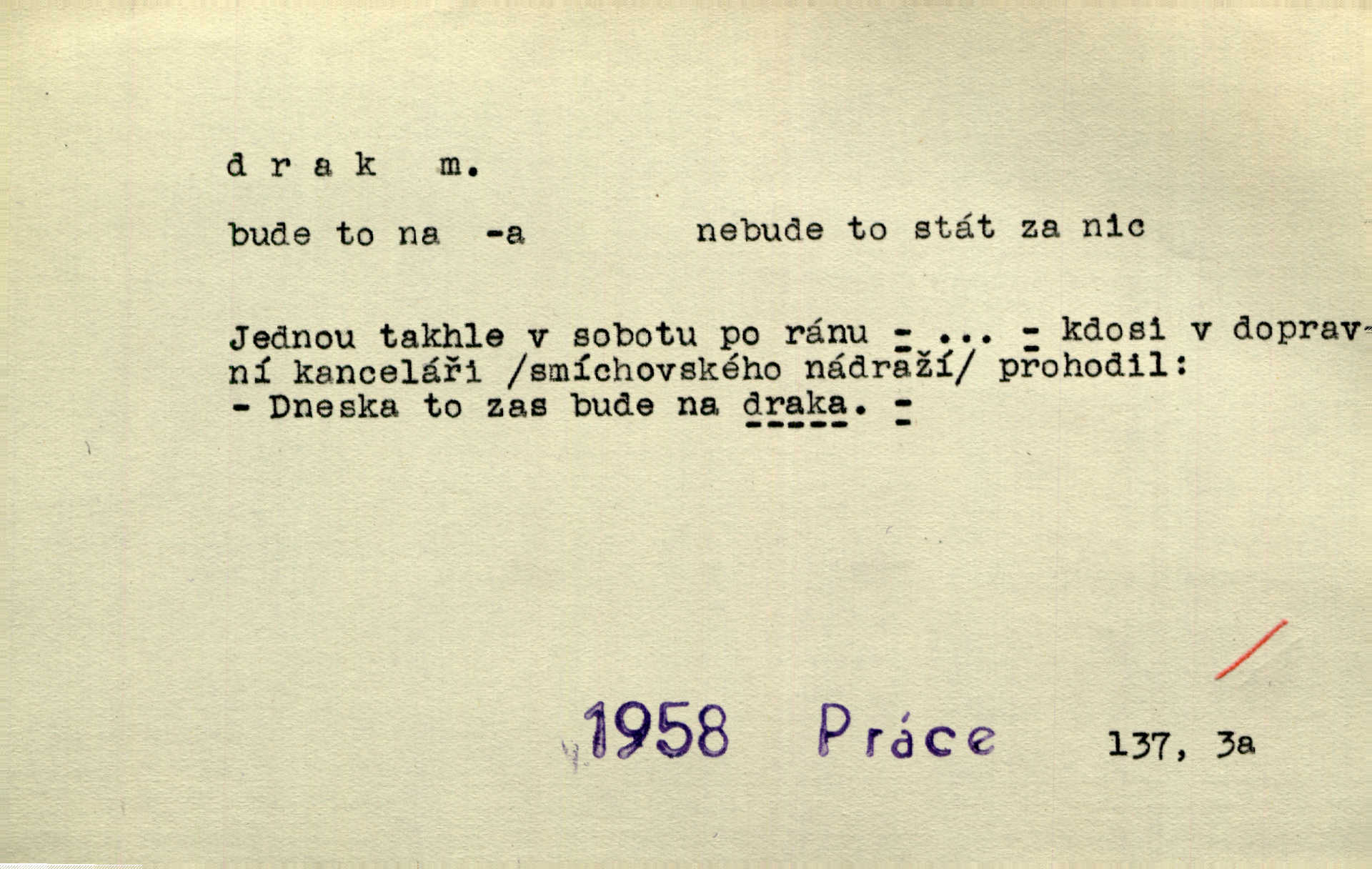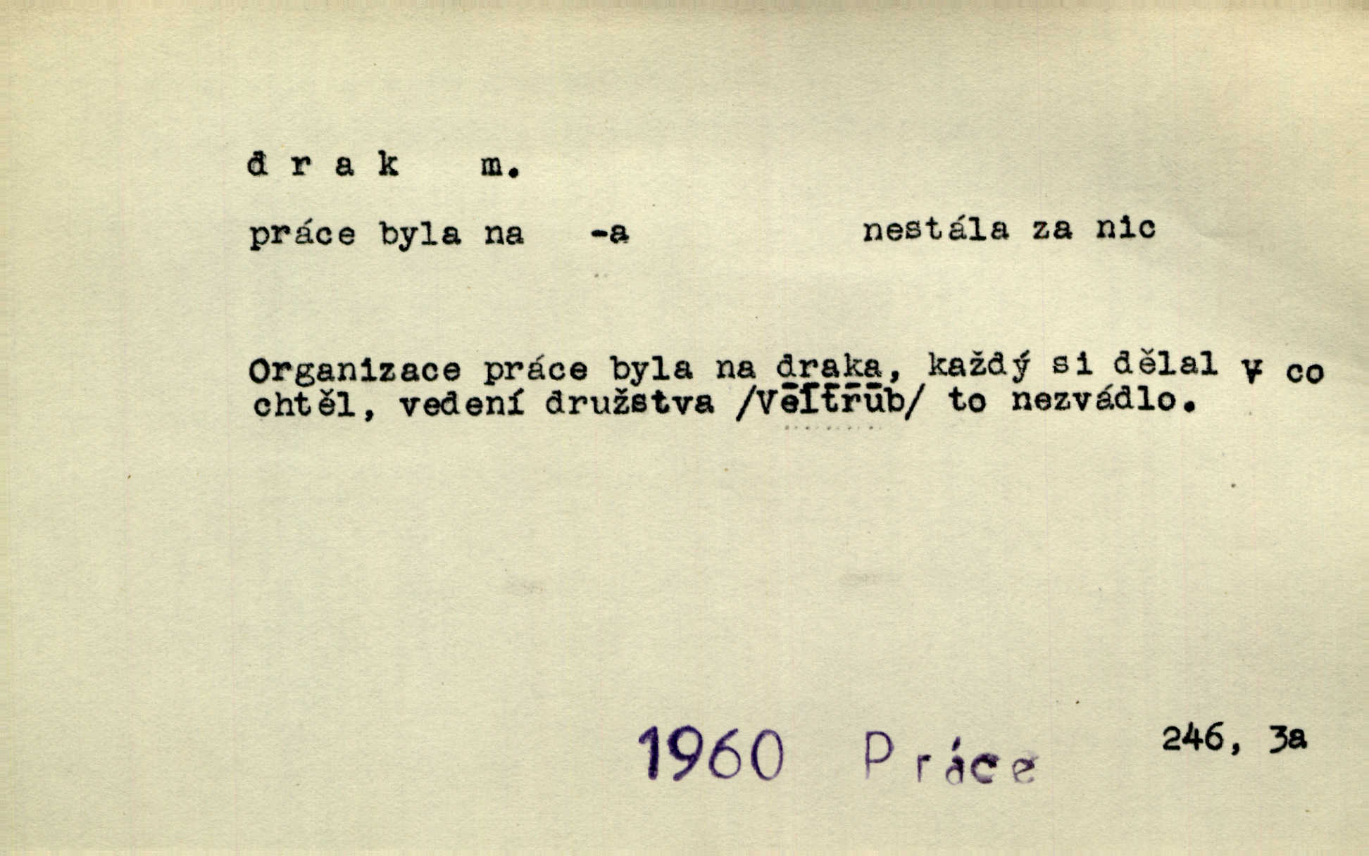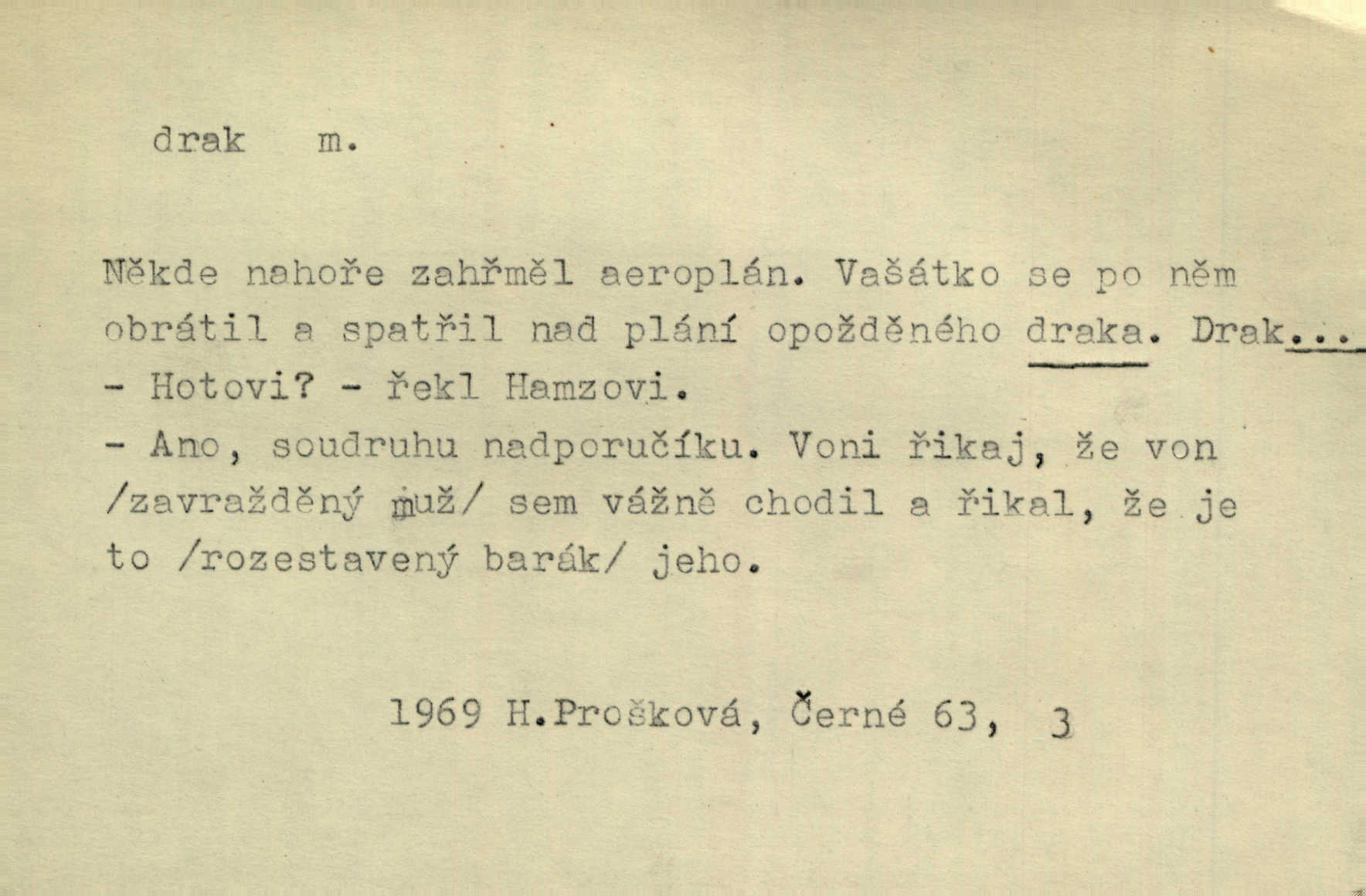 - drak, -a m. pohádková obluda mající podobu okřídleného ještěra, saň. Když přišla až na vykázané místo, spatřila jeskyni, u jejíhož vchodu dva draci hlídali. Něm. Křídla divá drak stříbrný na obě strany stele. Čech. Jako dva ohromní draci soptící dým a oheň valily se parní stroje. Baar. Nad římsami viděti divné arabesky, lvy, jednorožce, draky a jiná fantastická zvířata. Jir. Profesoři byli tenkráte jako draci, celou hodinu jen zkoušeli byli rozvzteklení. Dibl. Kouká někdy jako drak nenávistně. Svob. My bojovali jako draci zuřivě. Vrch. Je do práce jako drak velmi horlivý, prudký. D Arch. ďábel. Pozbav mysl naši mraků [Bože]‚ nedej škodit zlému draku. Suš. D Arch. v kletbách. Tisíc draků — jáť se neznám sám. Voc. Tys po draku chytrý. Sab. Táhni ke draku. Ehrenb. D Bás. o věcech podobných draku vzhledem n. jinými vlastnostmi. Dlouhý železný drak vypletl se supě a syče spoustou vagonů ze začouzené síně římského nádraží vlak. Mach. Jen čistota oběti něžné může zápasit se drakem pýchy. Svob. Drak germanismu dosud úplně poražen není. Hol. D zlý člověk, zvl. zlá žena. Matka je drak. Hál. Ti mají babičku — no pravý drak to je. Přít. Hum. Zapomněl, že už je čas, aby šel domů, že musí odpoledne „vyvíst draka“ [manželku]. Jir. Pravý talent má samé draky proti sobě. Svob. D Hum. neposedné, rozpustilé dítě. Ale tatínku, s radostí vám tu Honzíka necháme, máme doma ještě tři takové draky. Baar. D o bdělém, přísném strážci. Doma střehl ji jako největší poklad starý domácí drak, věrná služka Nany. Podl. D dětská hračka k pouštění po větru. Na svahu za hřbitovem pouštěli dva chlapci papírového draka. Šrám. D Vulg. vzíti draka utéci. U Kazaně se vysadilo asi třicet námořníků, před nimiž kazaňská ochrana „vzala draka“. Lang. D Vulg. Mít draka, koupit si draka opíti se. D Astron. jm. souhvězdí. D Zool. drak mořský ryba z čeledi Pegassidae. D Let. obyčejné letadlo s nehybnými nosnými plochami, drakové letadlo. Met. meteorologický drak létací zařízení skříňovitého tvaru, upevněné na drátě a nesoucí meteorologické přístroje. Hosp. druh holubů, dragoun (Columba dimacha).