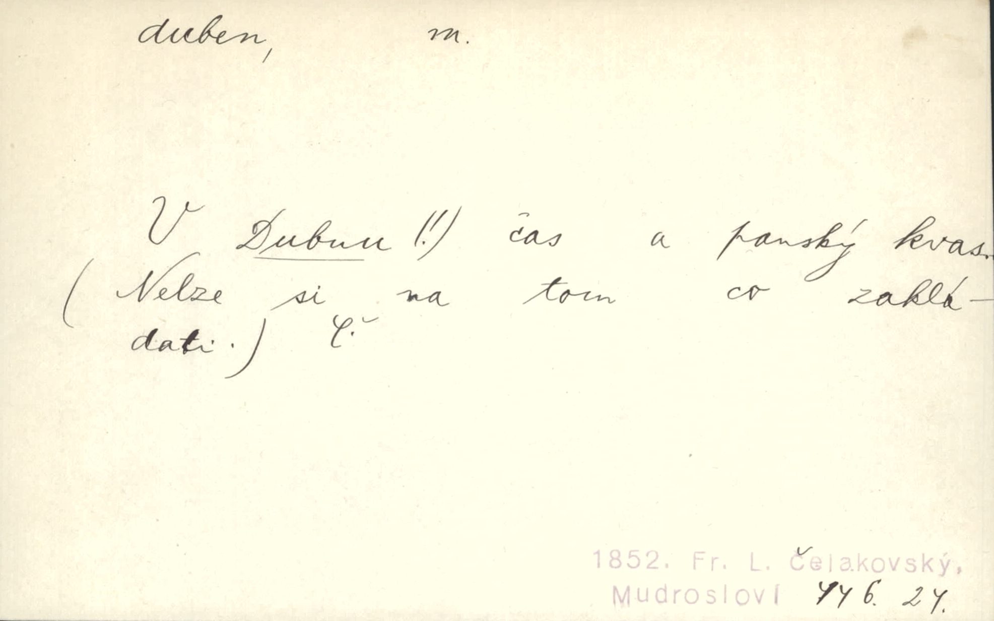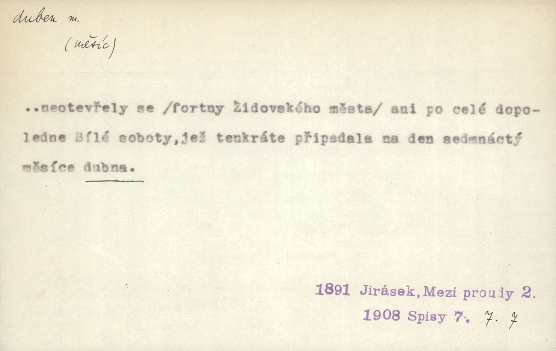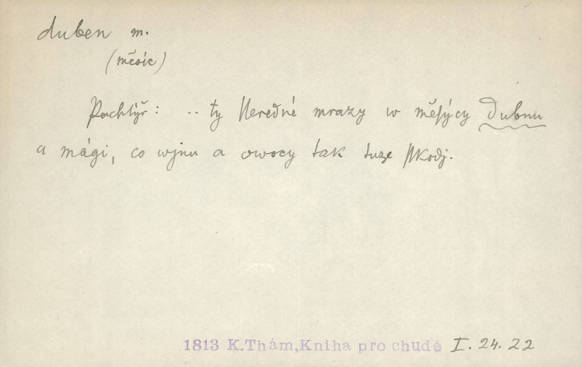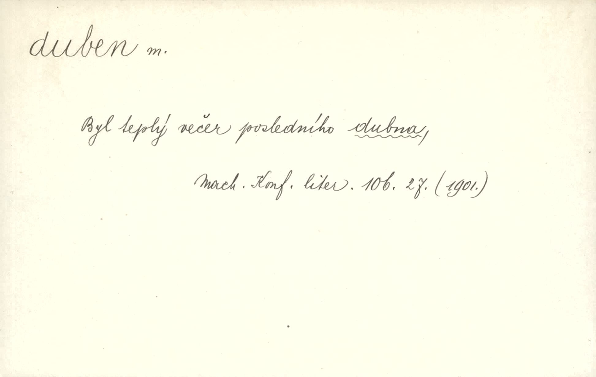 - duben, -bna m. čtvrtý měsíc v roce. Říkávají: březen suchý, duben mokrý, máj studený, to rok bude vydařený. Hol. Duben chladný a deštivý, úroda nás navštíví. A. Mrš. Duben, ještě tam [za kamny] budem. Pořek.